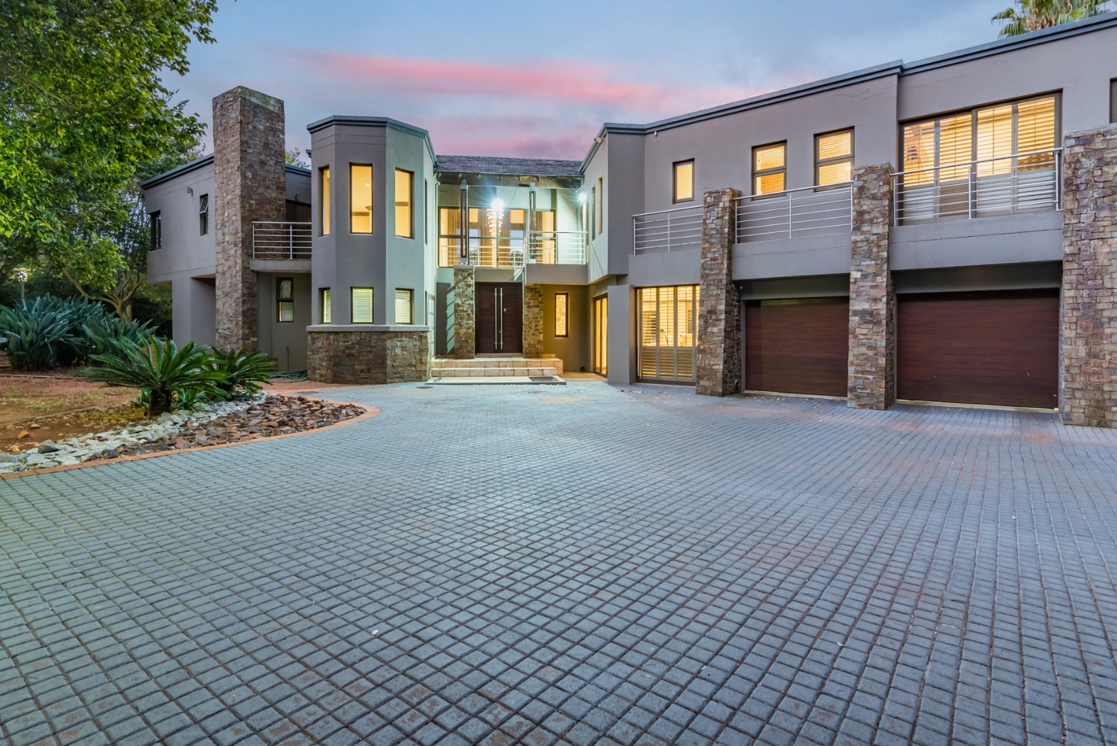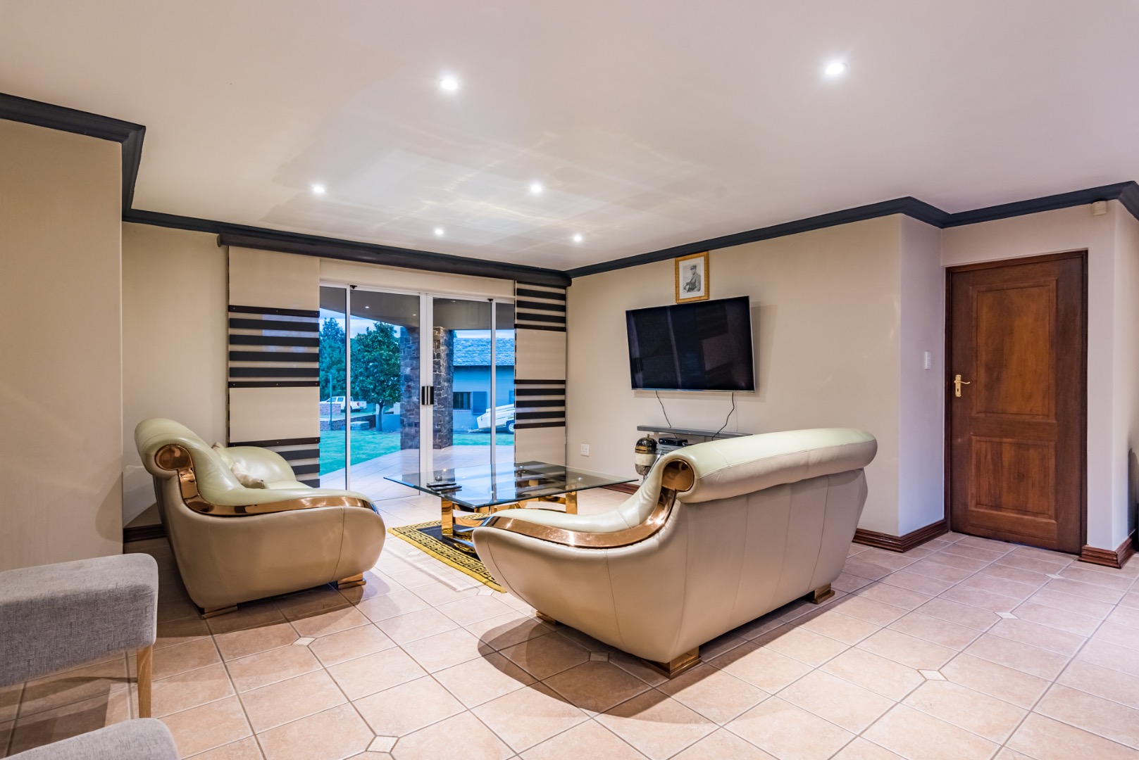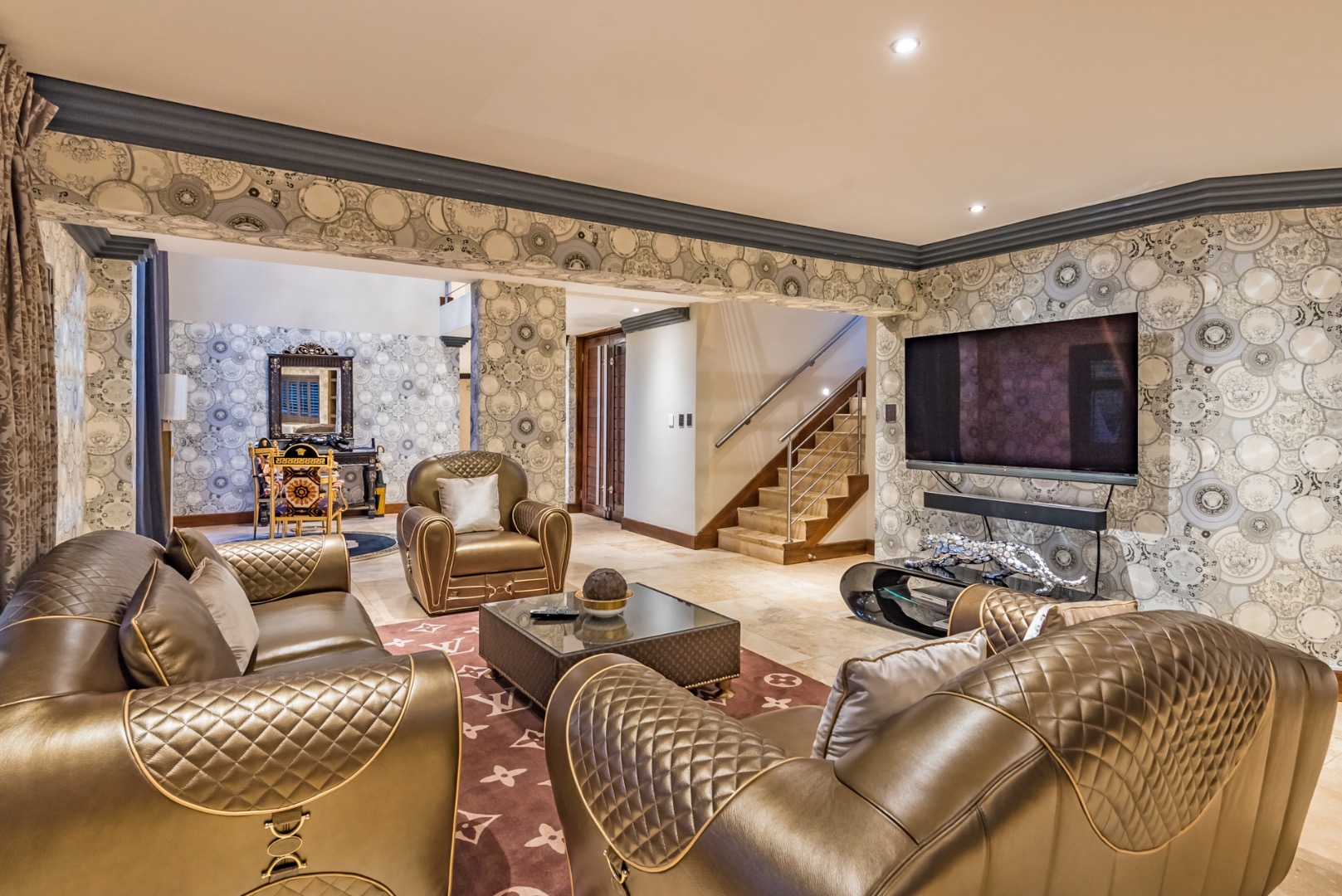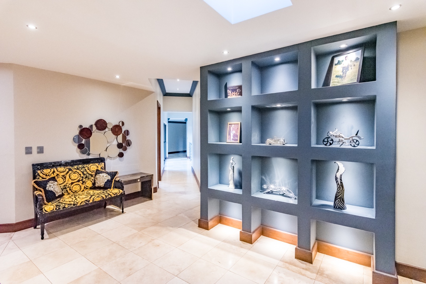 Furthermore the house offers: 5 bedrooms all with en-suite bathrooms; 5 living rooms; gym, flat with 2 en suite bedrooms, 2 living rooms and fully equipped kitchen with it’s own garden; 4 store rooms, 6 garages, 3 carports, 2 servants’ quarters. Extra features include: 3-phase electricity, air-conditioning, generator. Huge laundry and separate scullery. The garden all around the house is complementing this amazing, contemporary special home – a home that only could be appreciated by viewing it.