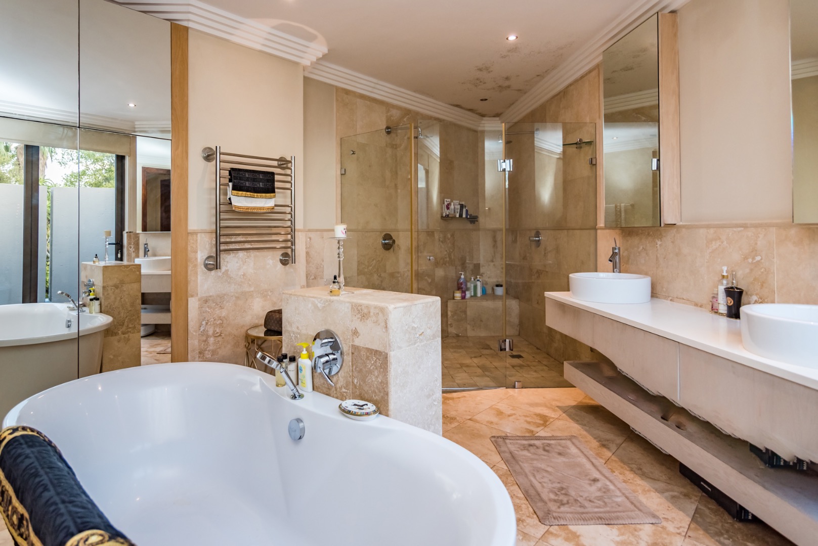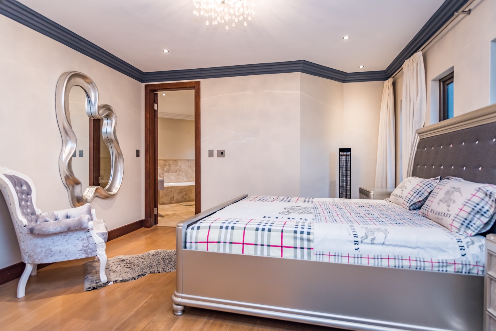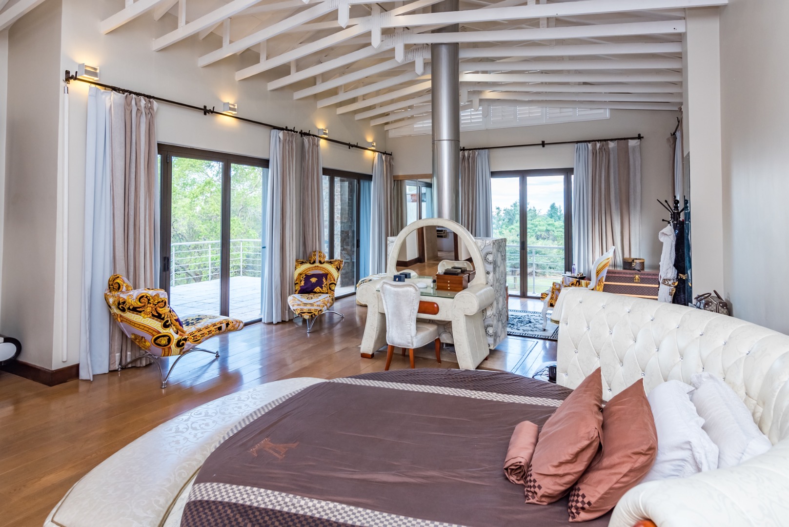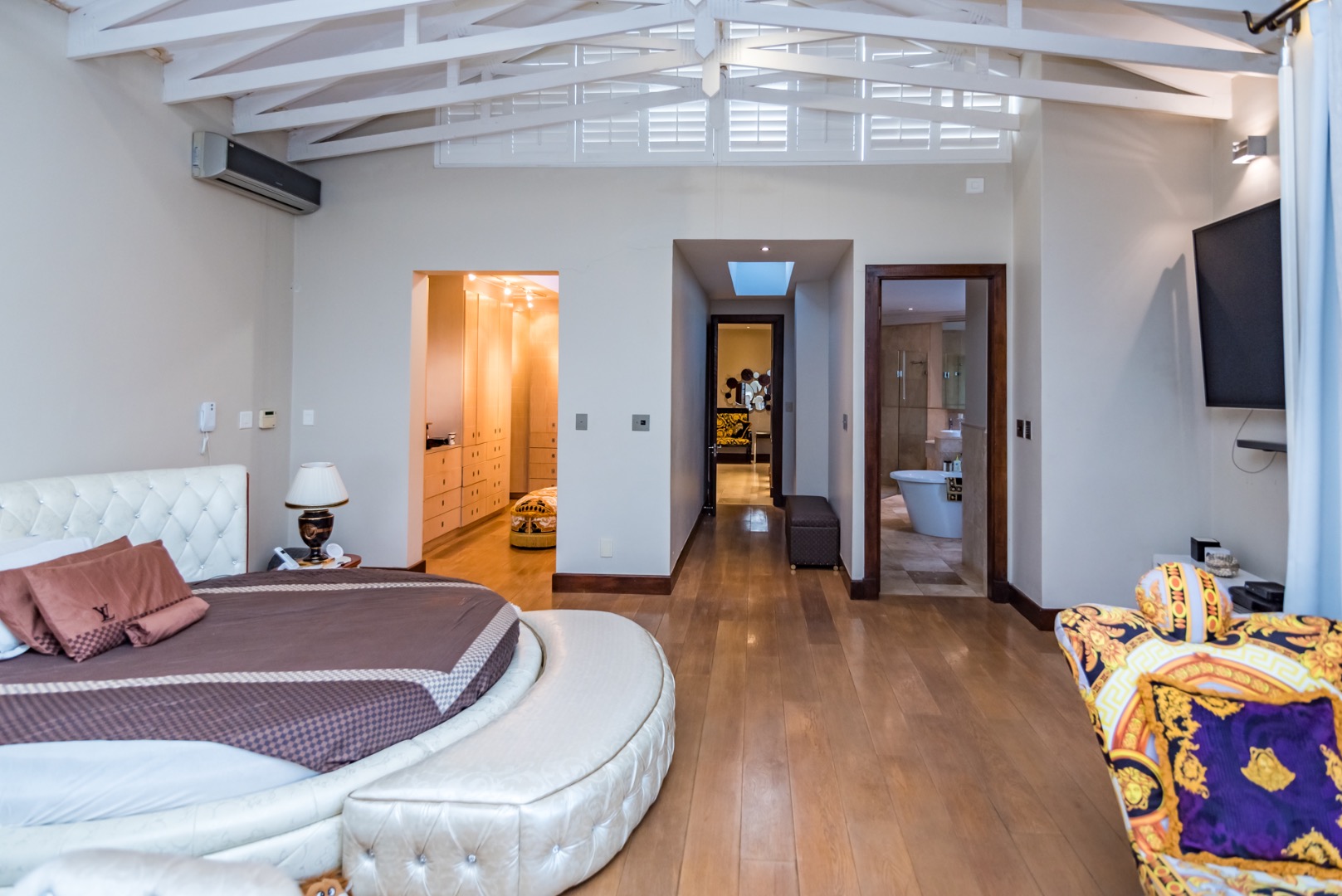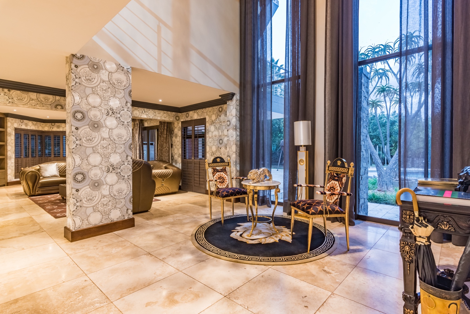 Furthermore the house offers: 5 bedrooms all with en-suite bathrooms; 5 living rooms; gym, flat with 2 en suite bedrooms, 2 living rooms and fully equipped kitchen with it’s own garden; 4 store rooms, 6 garages, 3 carports, 2 servants’ quarters. Extra features include: 3-phase electricity, air-conditioning, generator. Huge laundry and separate scullery. The garden all around the house is complementing this amazing, contemporary special home – a home that only could be appreciated by viewing it.