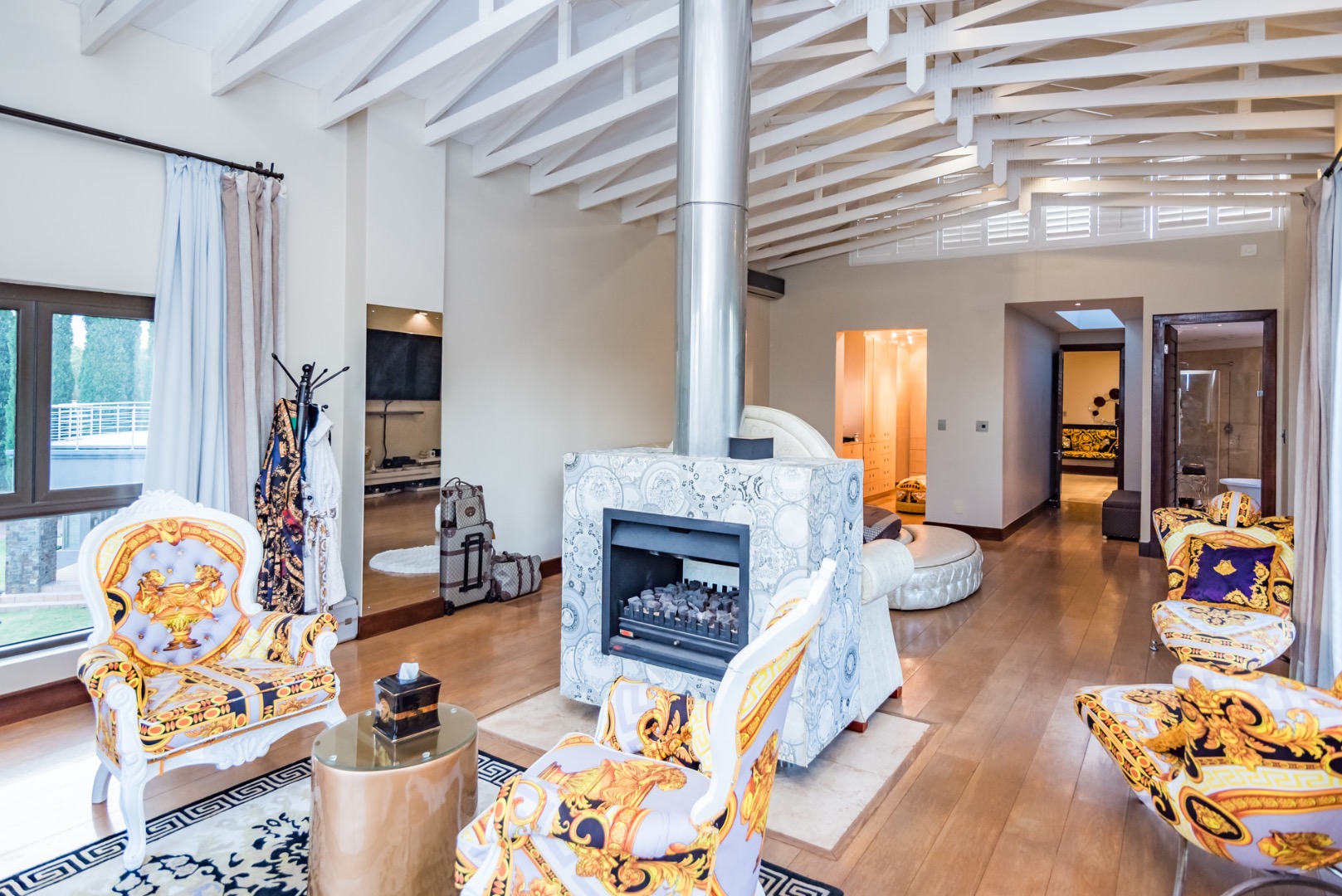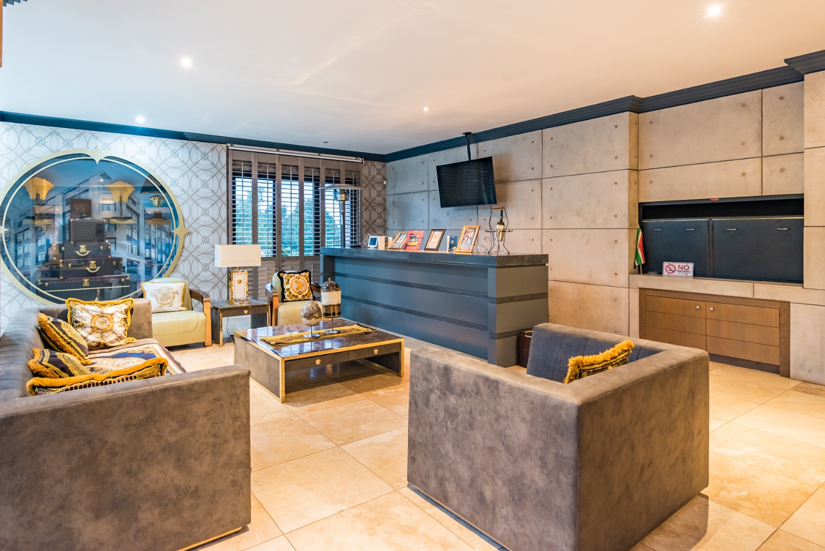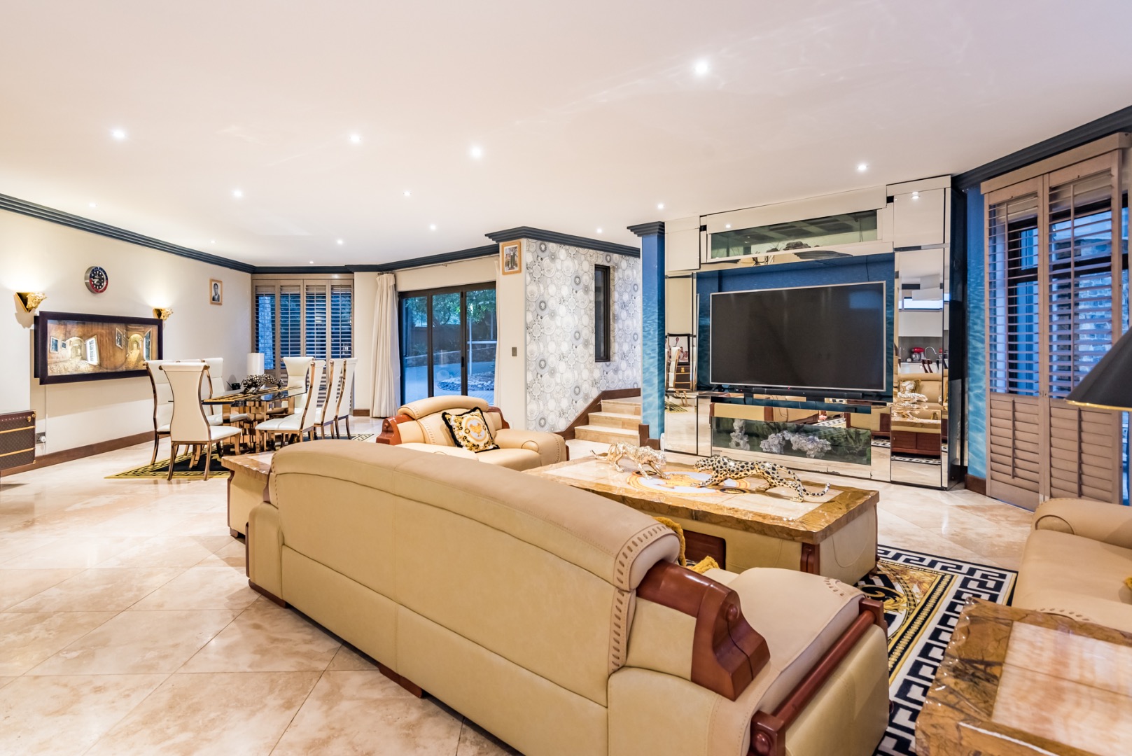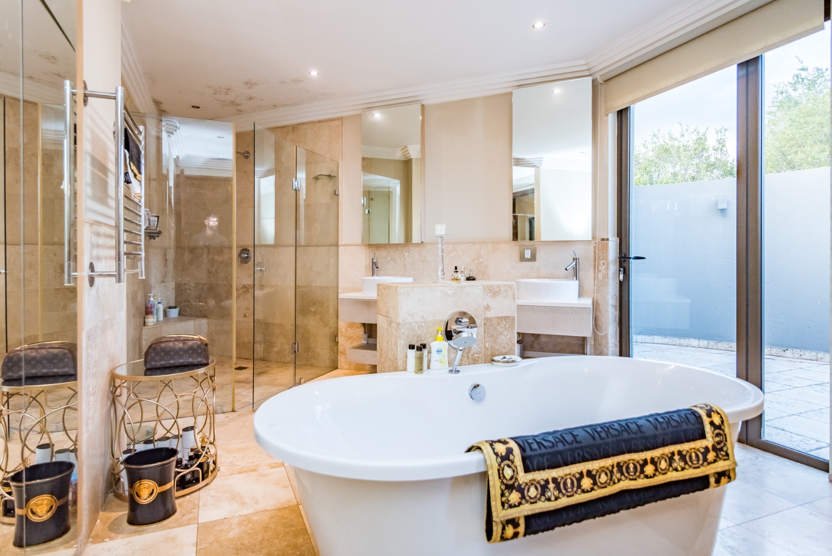 Furthermore the house offers: 5 bedrooms all with en-suite bathrooms; 5 living rooms; gym, flat with 2 en suite bedrooms, 2 living rooms and fully equipped kitchen with it’s own garden; 4 store rooms, 6 garages, 3 carports, 2 servants’ quarters. Extra features include: 3-phase electricity, air-conditioning, generator. Huge laundry and separate scullery. The garden all around the house is complementing this amazing, contemporary special home – a home that only could be appreciated by viewing it.