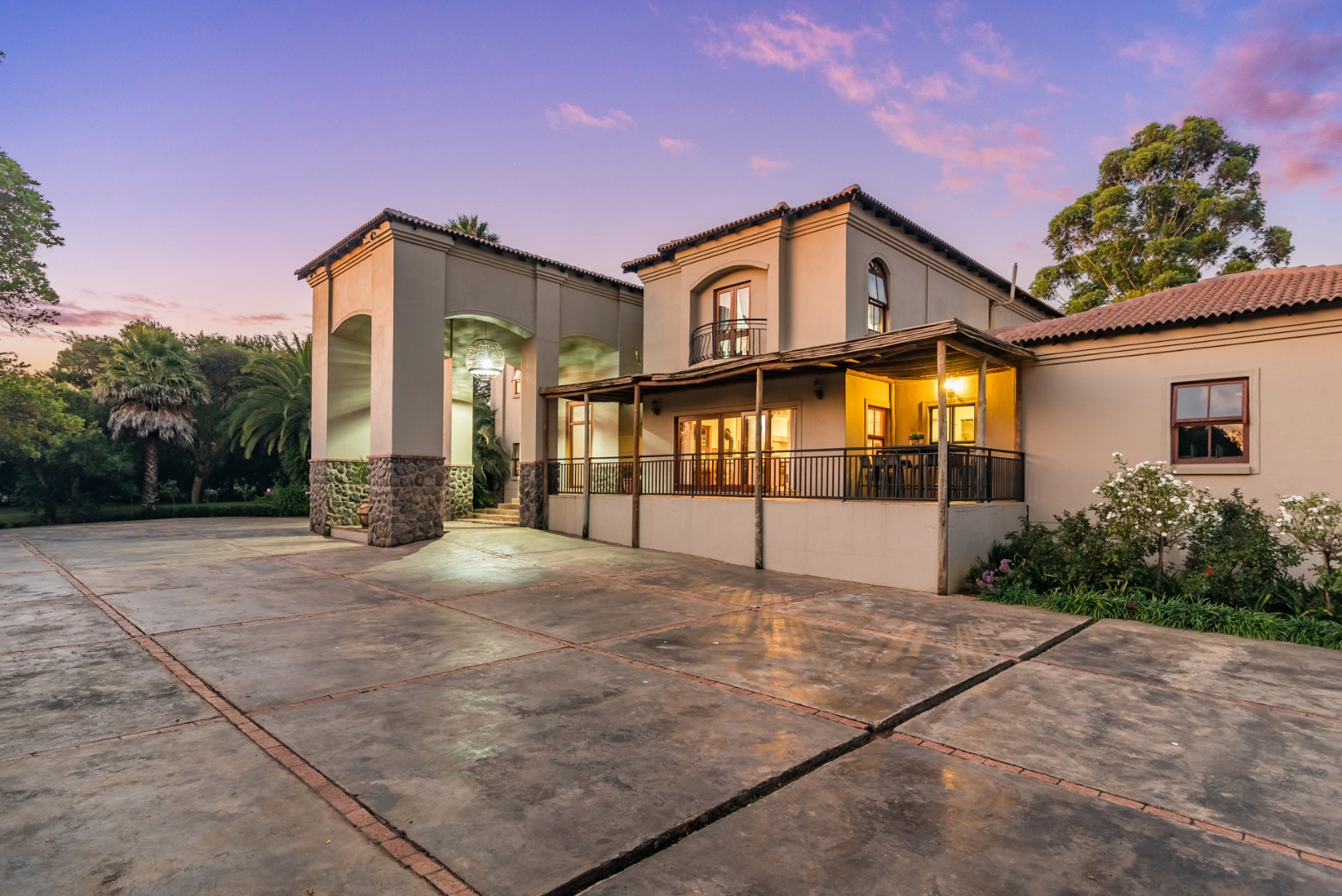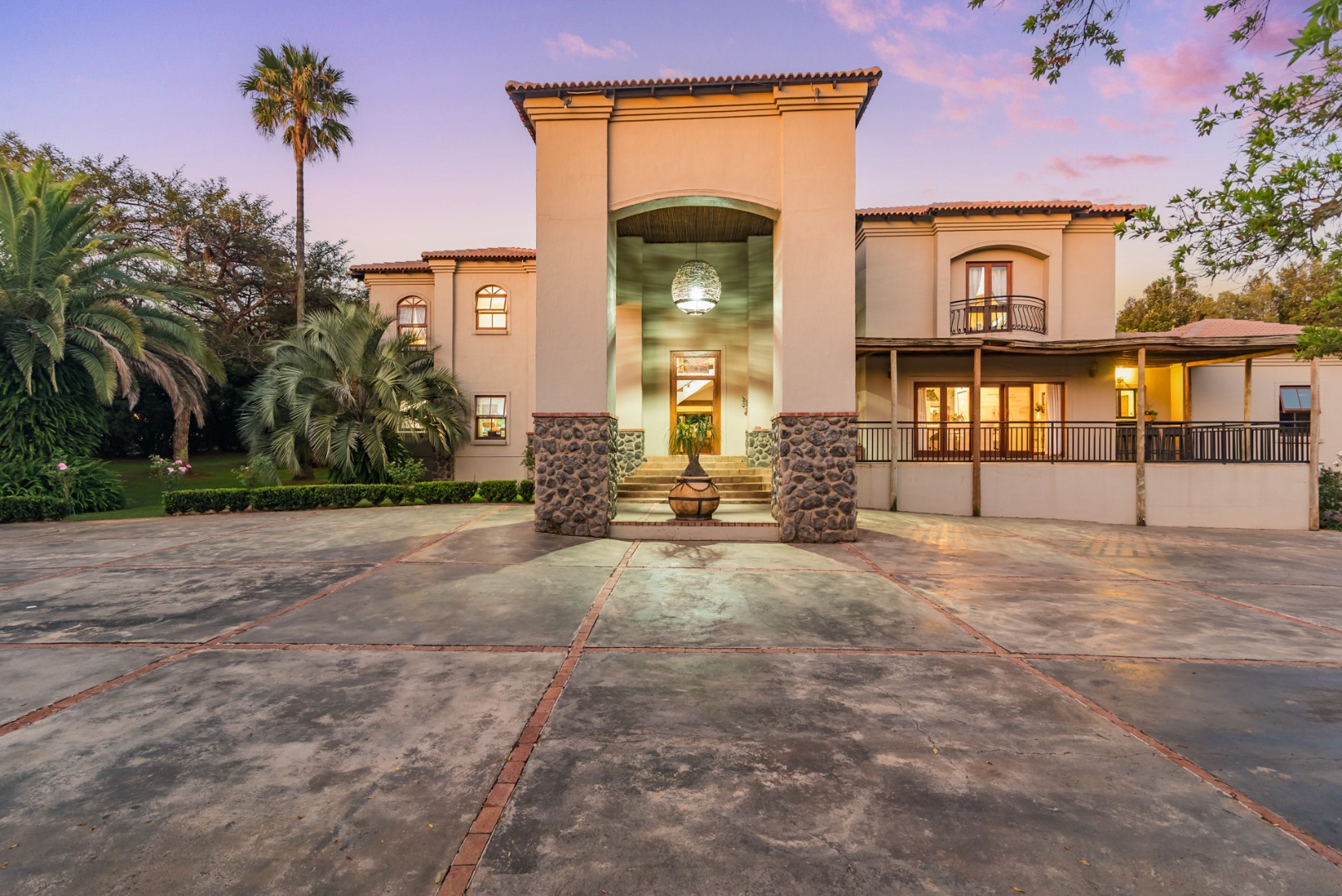 rustic villa with a porte cochere and an impressive steeping staircase in the