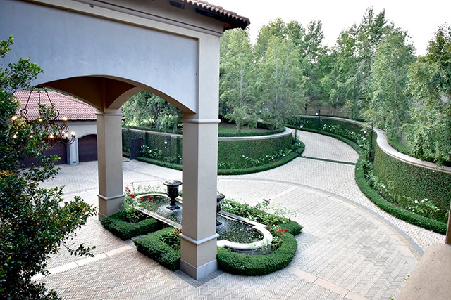 beautiful white iceberg roses leading to a port cochere with impressive water