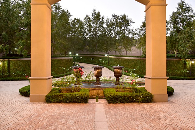 teeming with a variety of plants, trees, manicured hedges, and water features.