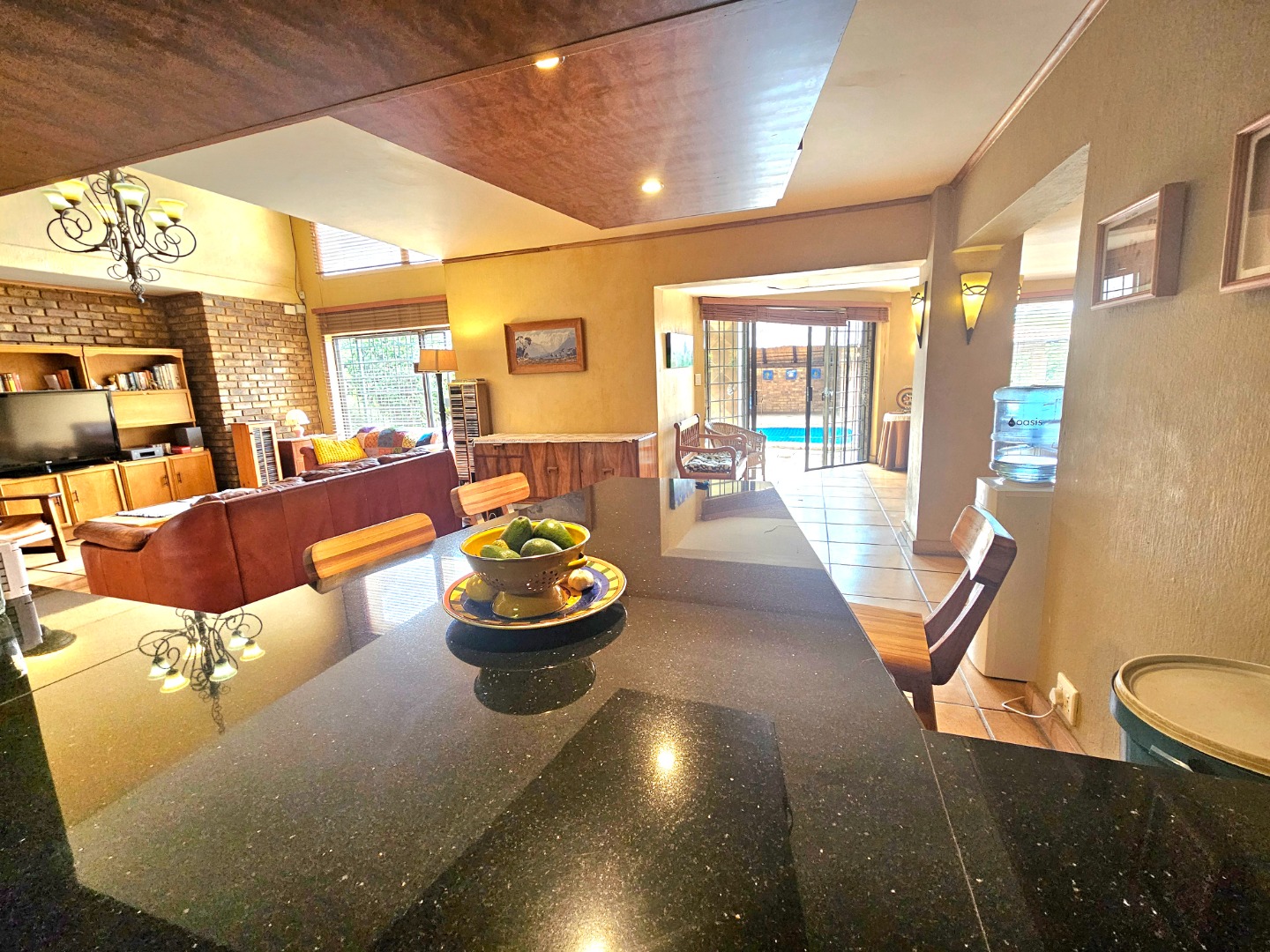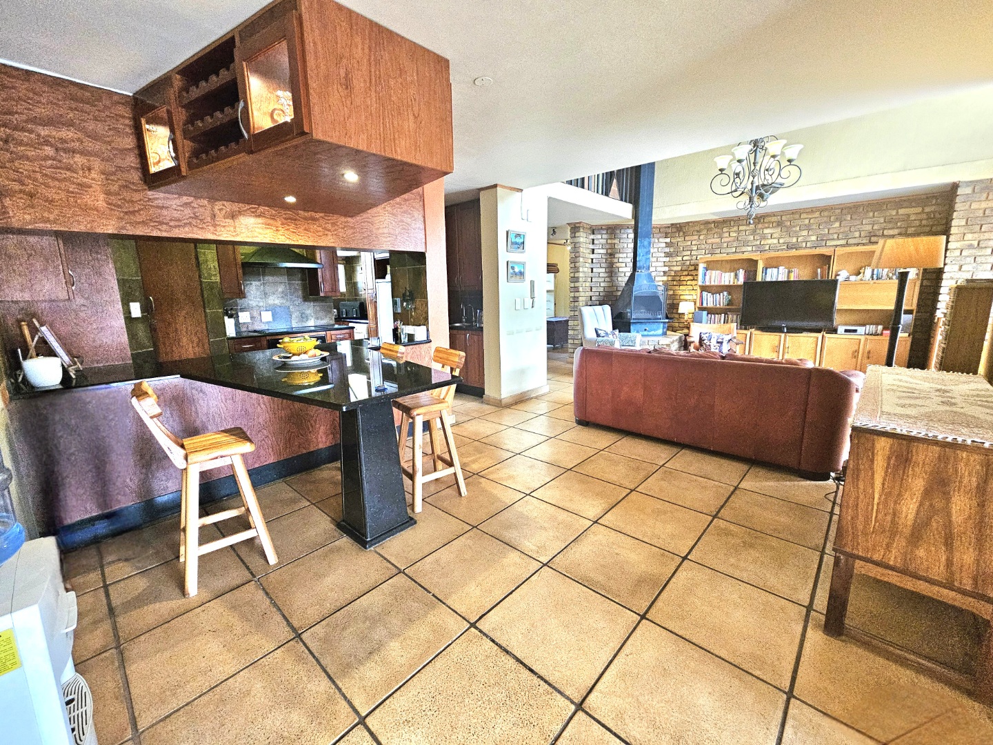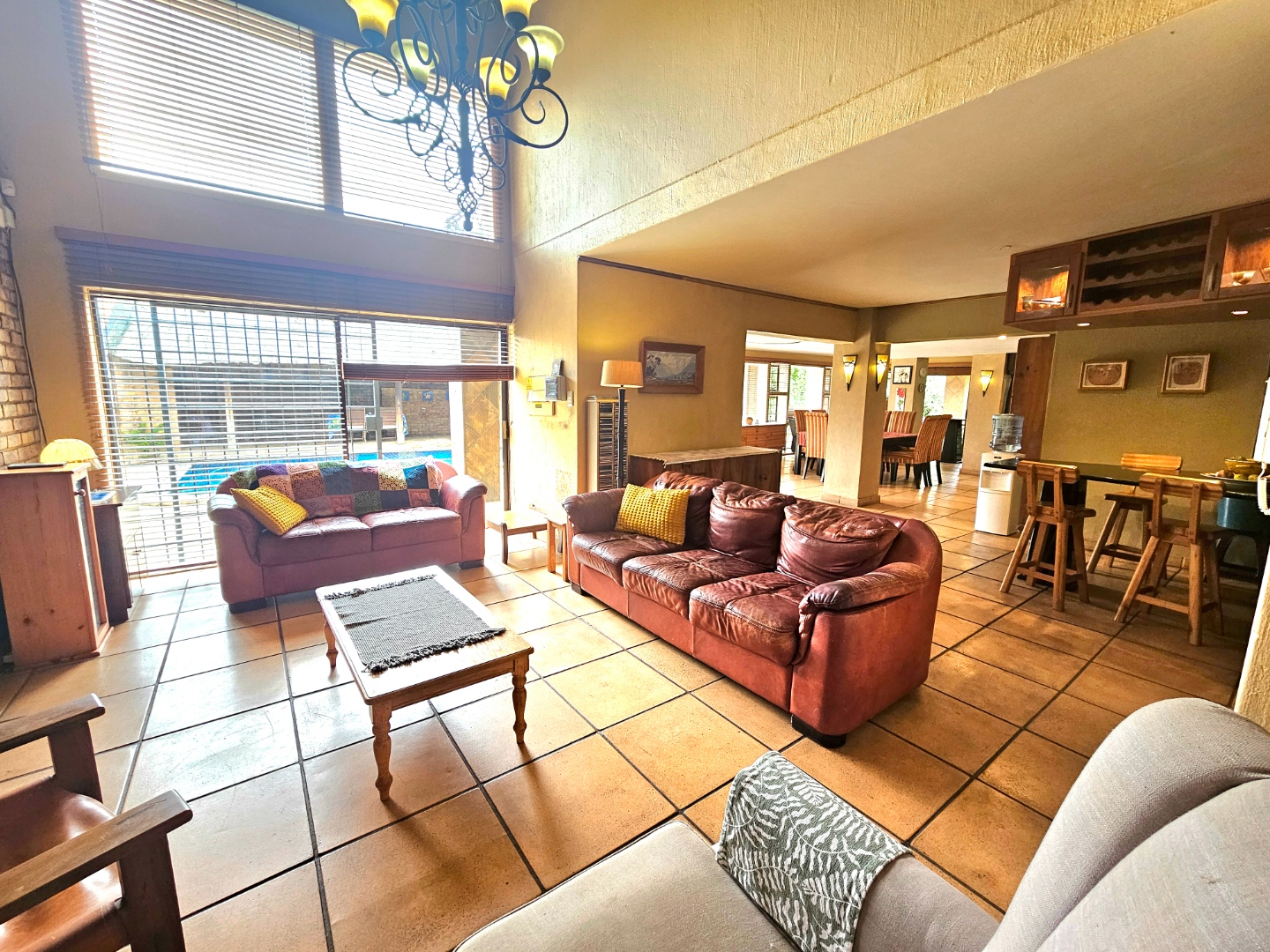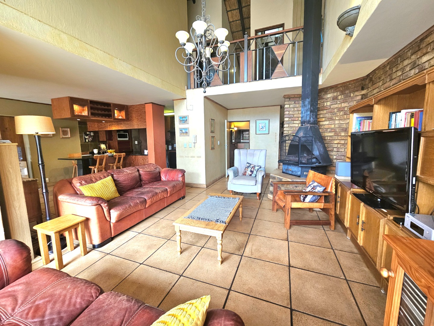 Upon entry, the interior reveals a thoughtfully designed layout featuring three spacious living areas and a well-appointed kitchen complete with a pantry and a scullery with space for three appliances. The open-plan indoor design, complemented by a double-volume living space, fosters an atmosphere of grandeur and comfort. The living area features a built-in braai, bar counter, and a cosy fireplace, creating an inviting atmosphere for relaxed gatherings throughout the year. Downstairs includes a sound proof room, a guest toilet, the two additional large rooms and a walk-in safe.