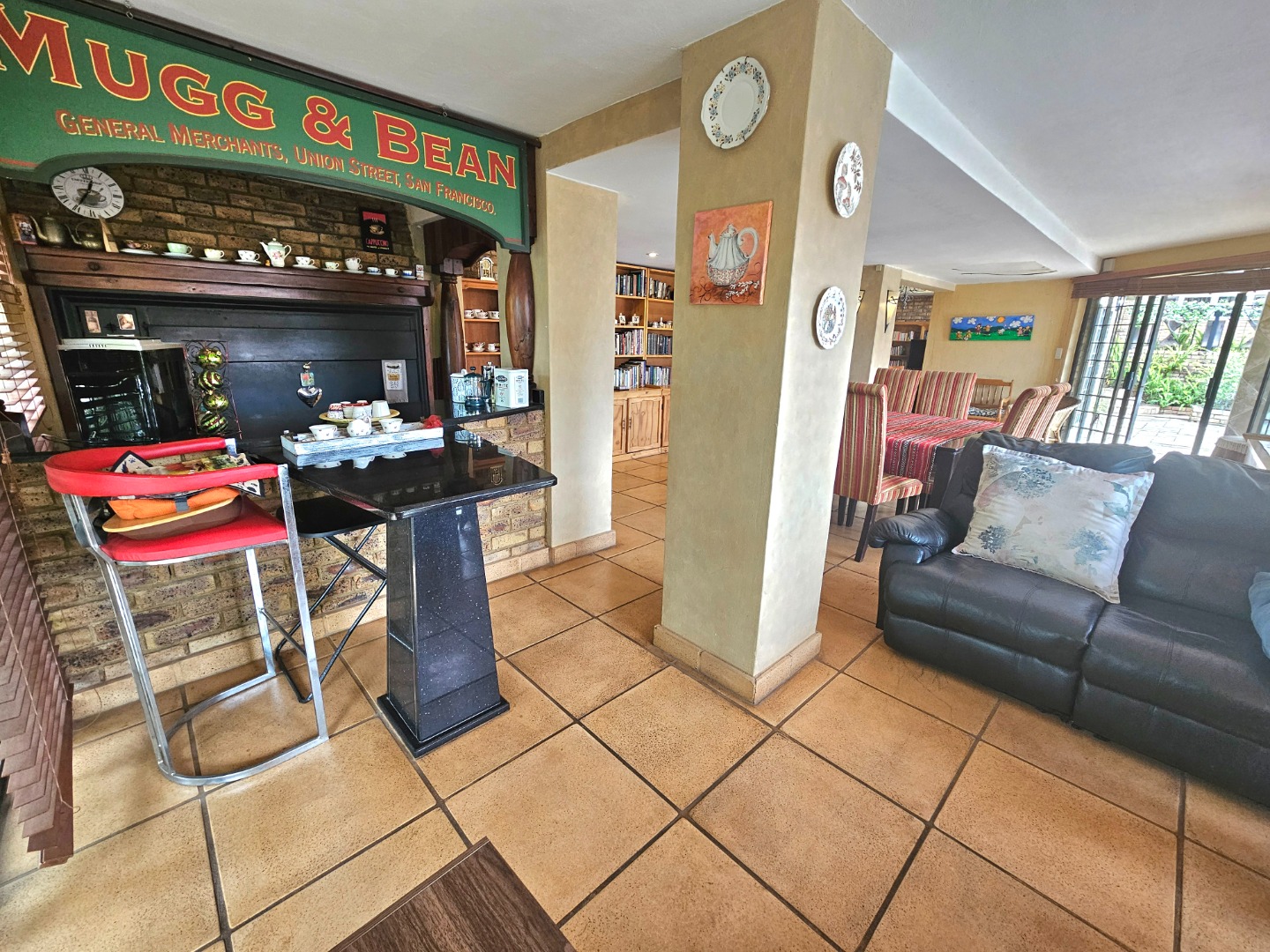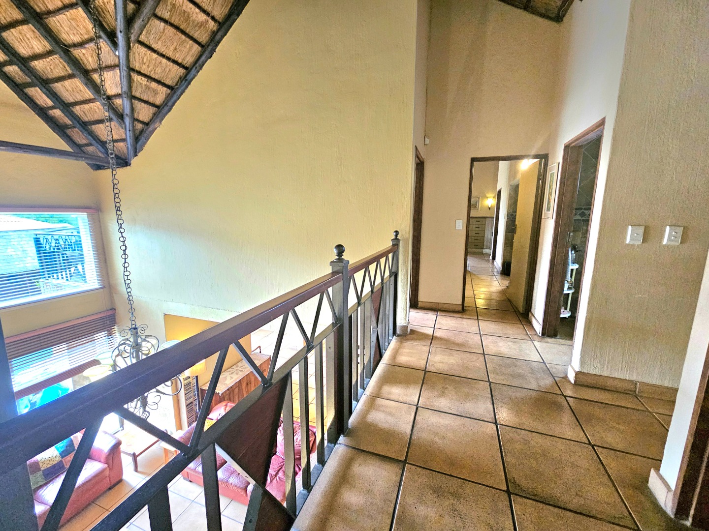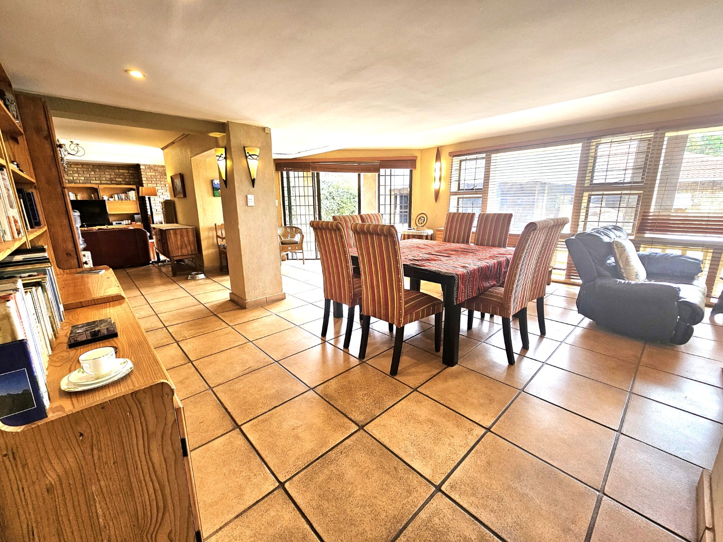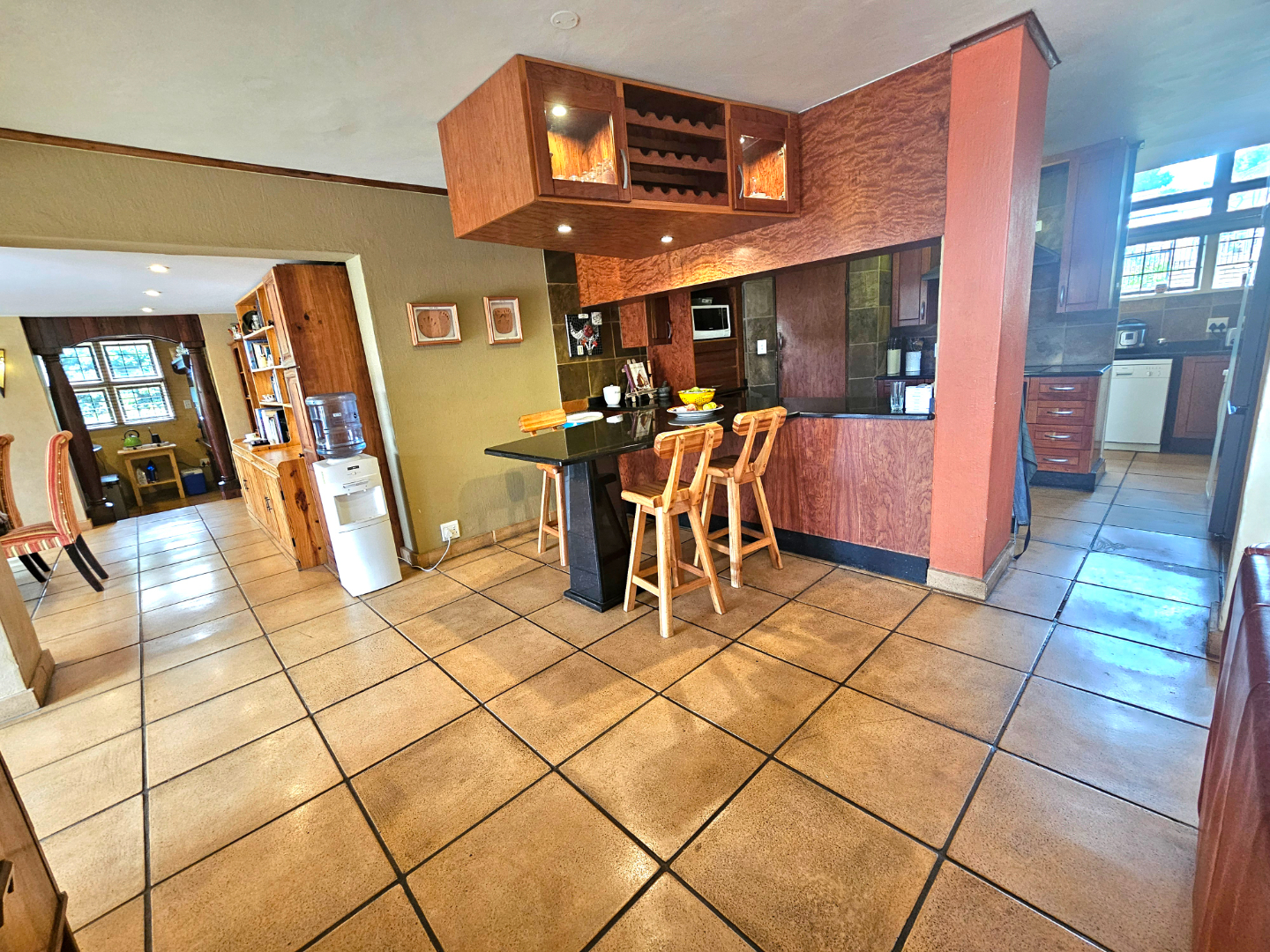 Upon entry, the interior reveals a thoughtfully designed layout featuring three spacious living areas and a well-appointed kitchen complete with a pantry and a scullery with space for three appliances. The open-plan indoor design, complemented by a double-volume living space, fosters an atmosphere of grandeur and comfort. The living area features a built-in braai, bar counter, and a cosy fireplace, creating an inviting atmosphere for relaxed gatherings throughout the year. Downstairs includes a sound proof room, a guest toilet, the two additional large rooms and a walk-in safe.