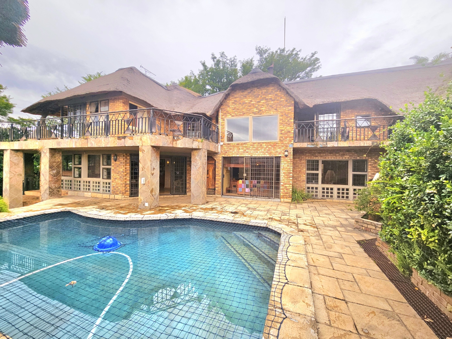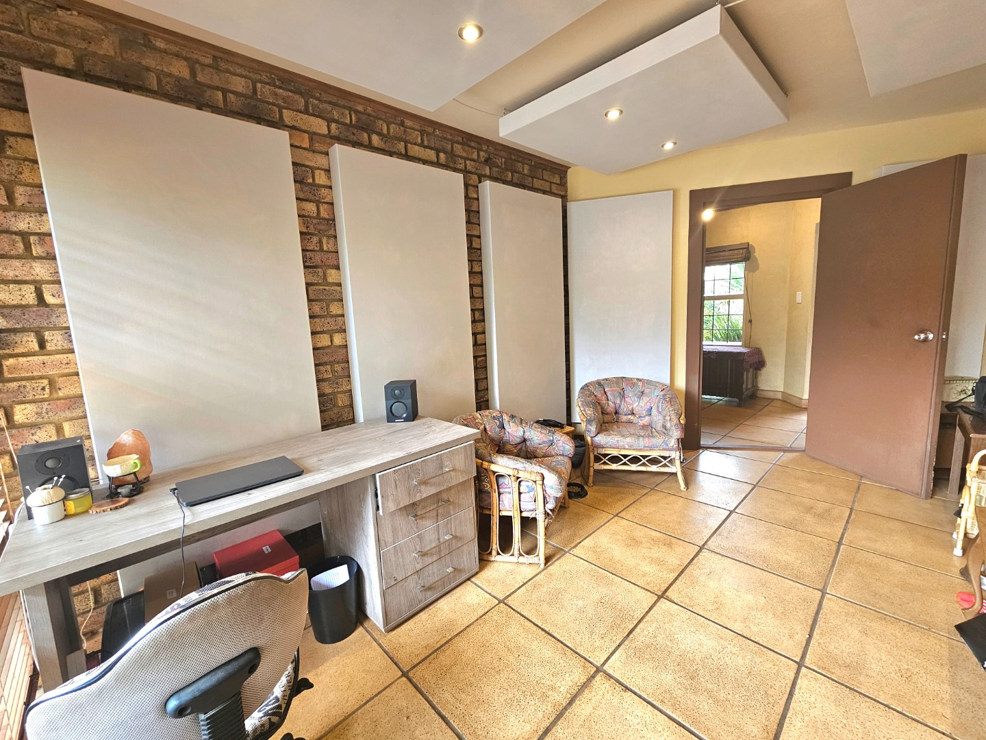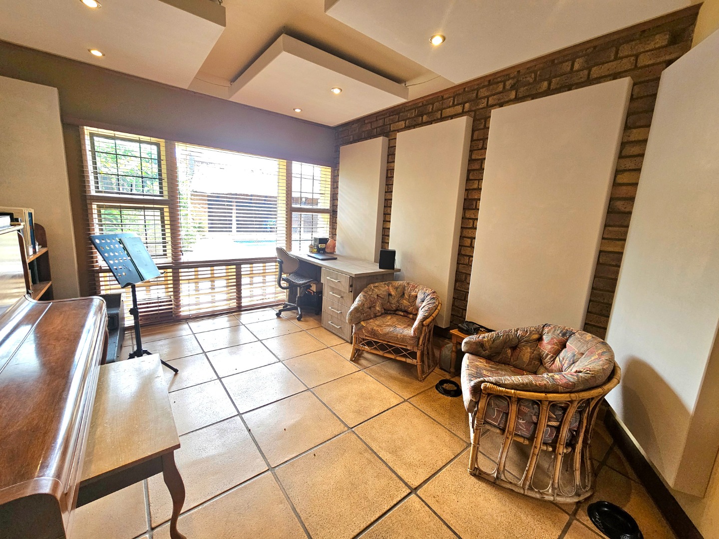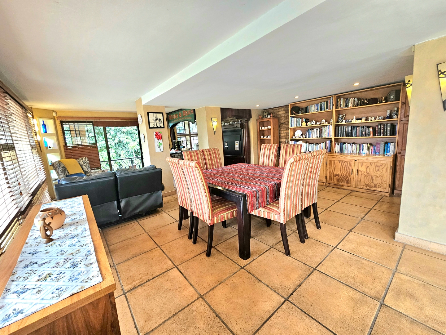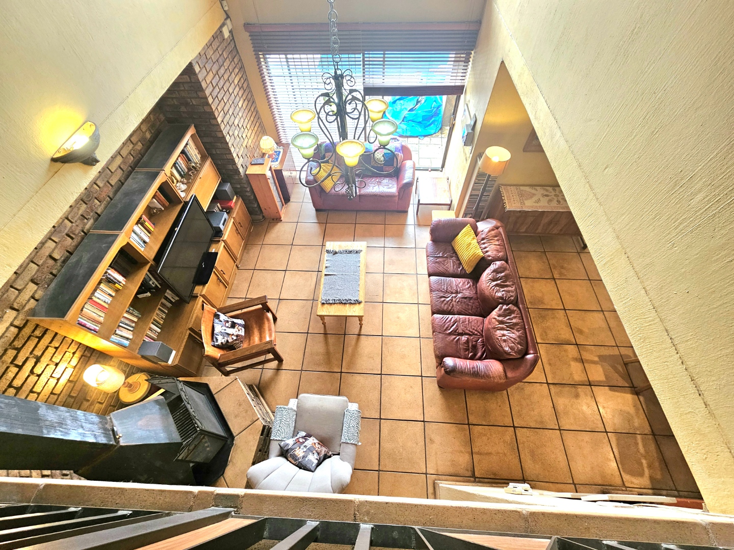 Upon entry, the interior reveals a thoughtfully designed layout featuring three spacious living areas and a well-appointed kitchen complete with a pantry and a scullery with space for three appliances. The open-plan indoor design, complemented by a double-volume living space, fosters an atmosphere of grandeur and comfort. The living area features a built-in braai, bar counter, and a cosy fireplace, creating an inviting atmosphere for relaxed gatherings throughout the year. Downstairs includes a sound proof room, a guest toilet, the two additional large rooms and a walk-in safe.