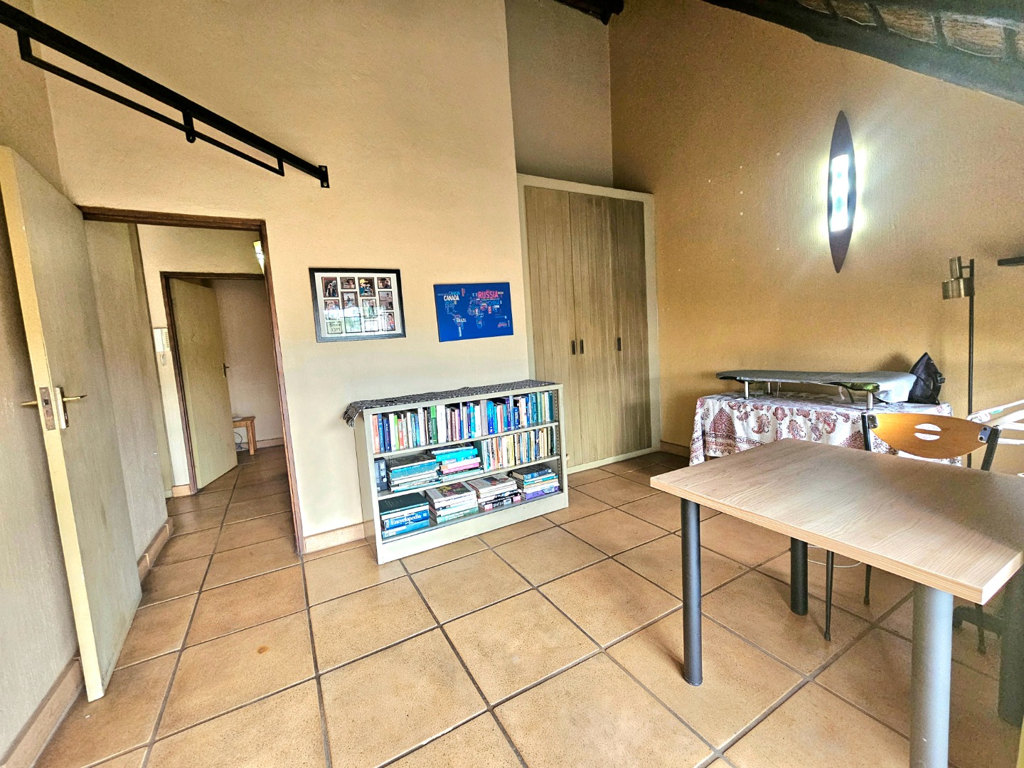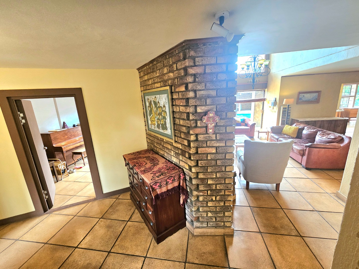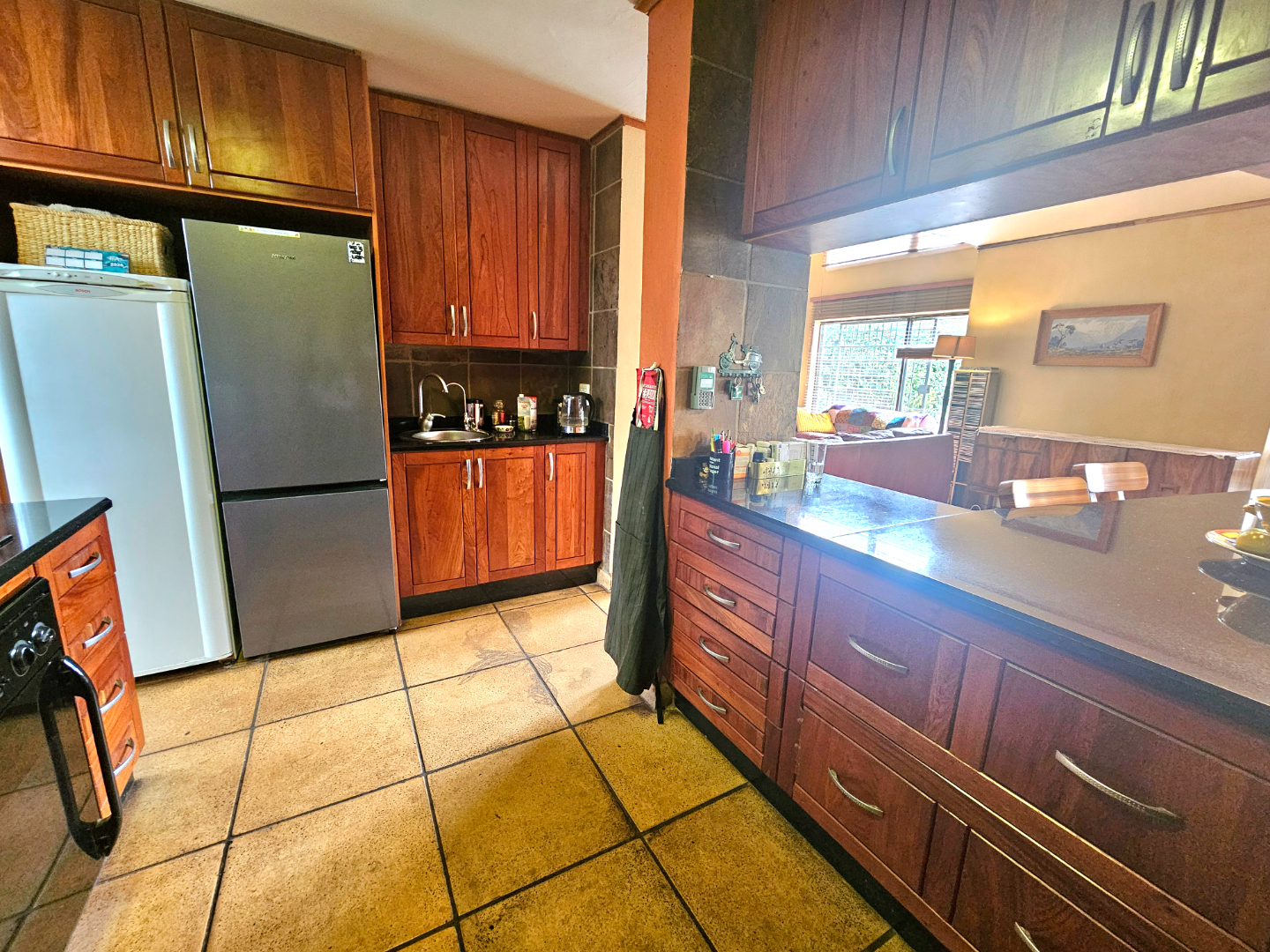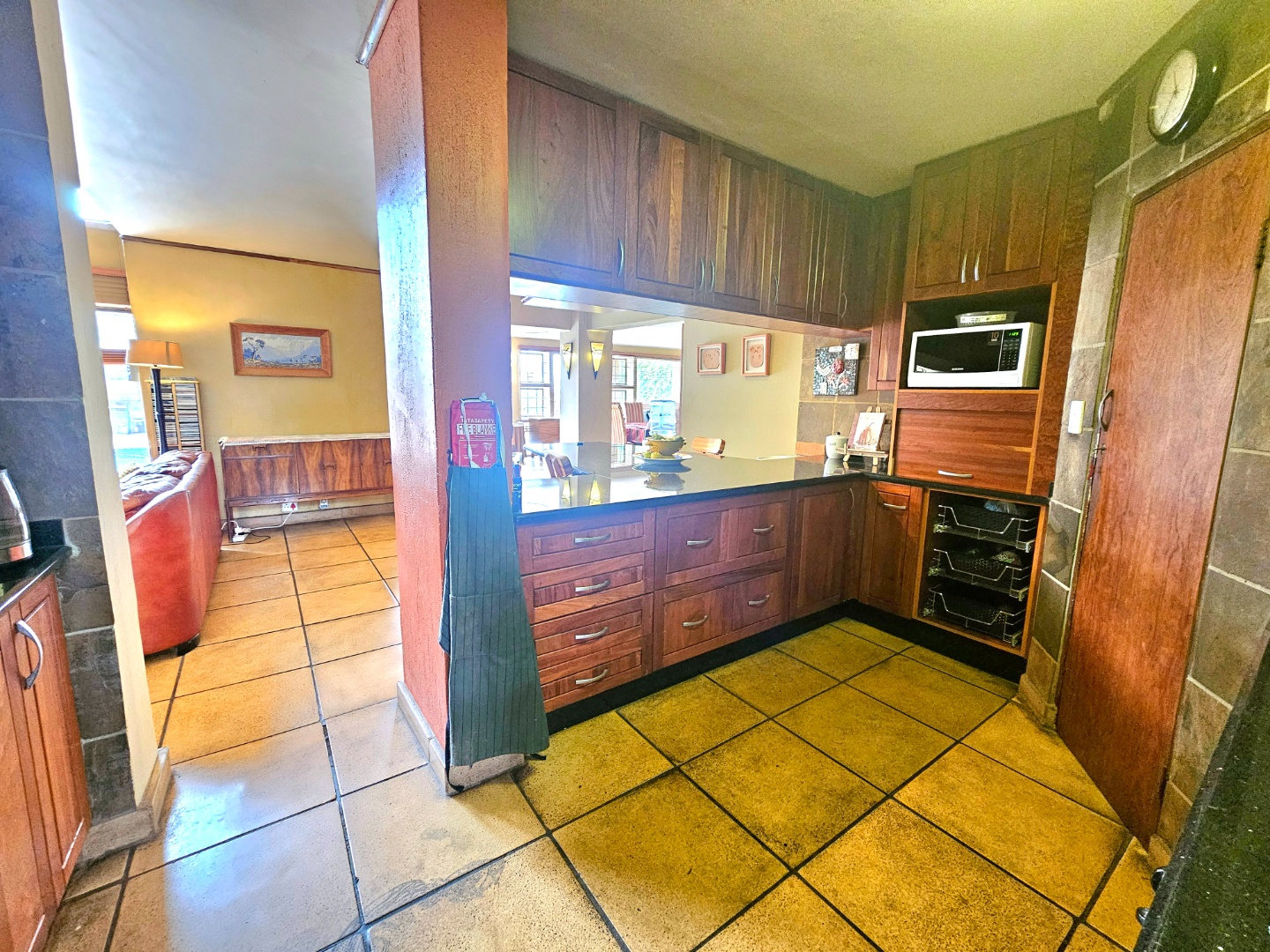 Upon entry, the interior reveals a thoughtfully designed layout featuring three spacious living areas and a well-appointed kitchen complete with a pantry and a scullery with space for three appliances. The open-plan indoor design, complemented by a double-volume living space, fosters an atmosphere of grandeur and comfort. The living area features a built-in braai, bar counter, and a cosy fireplace, creating an inviting atmosphere for relaxed gatherings throughout the year. Downstairs includes a sound proof room, a guest toilet, the two additional large rooms and a walk-in safe.