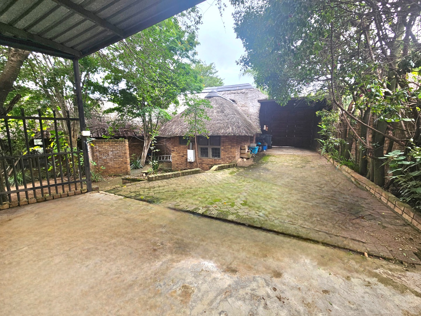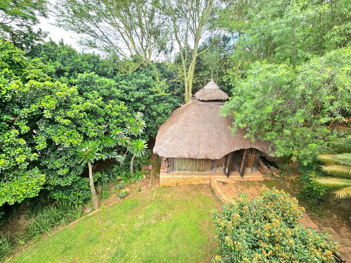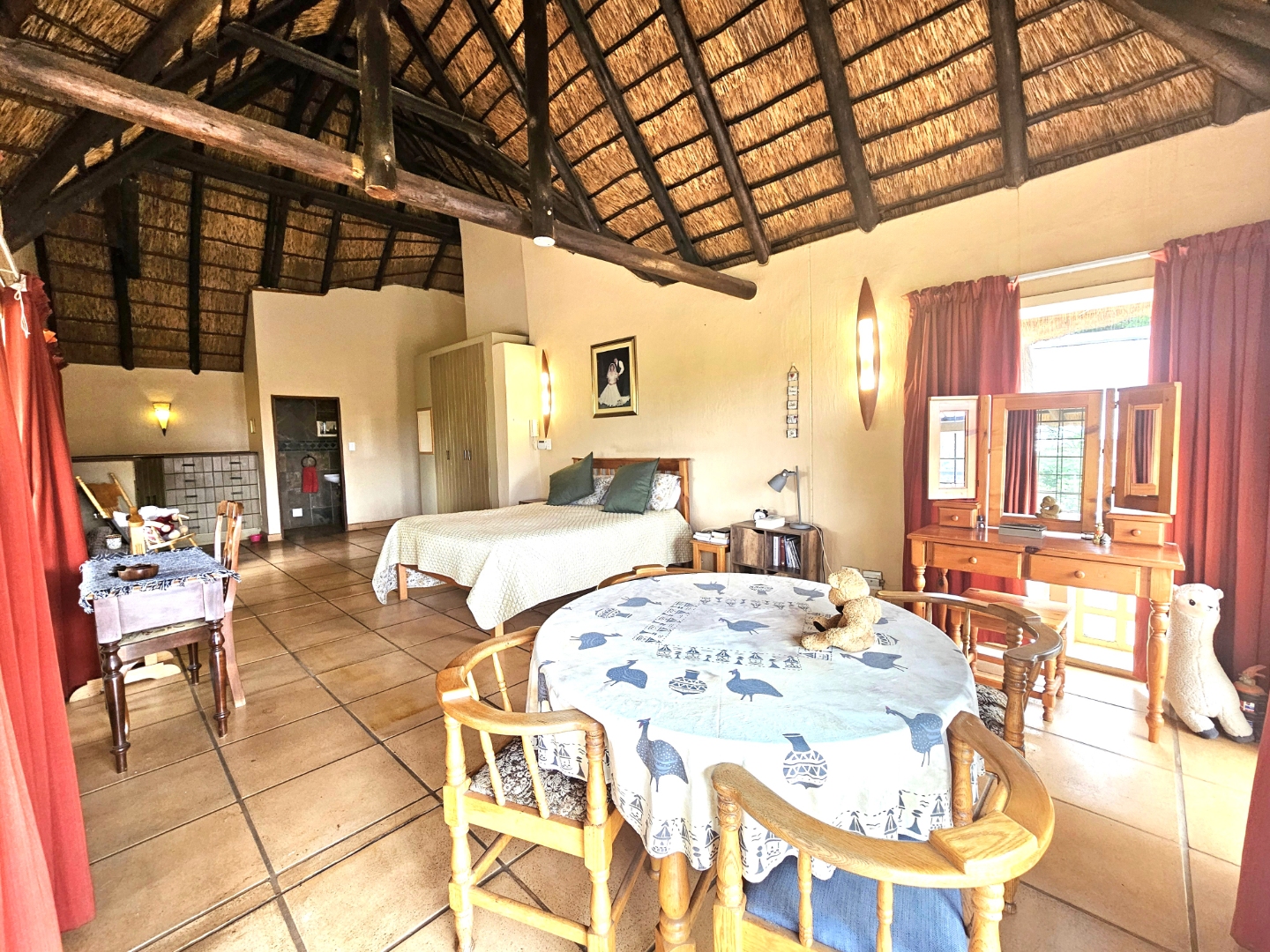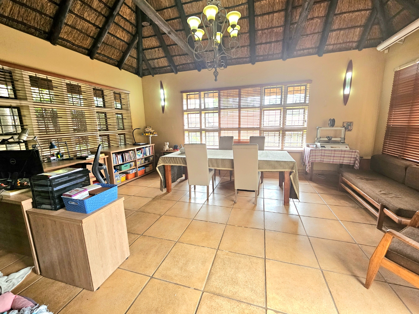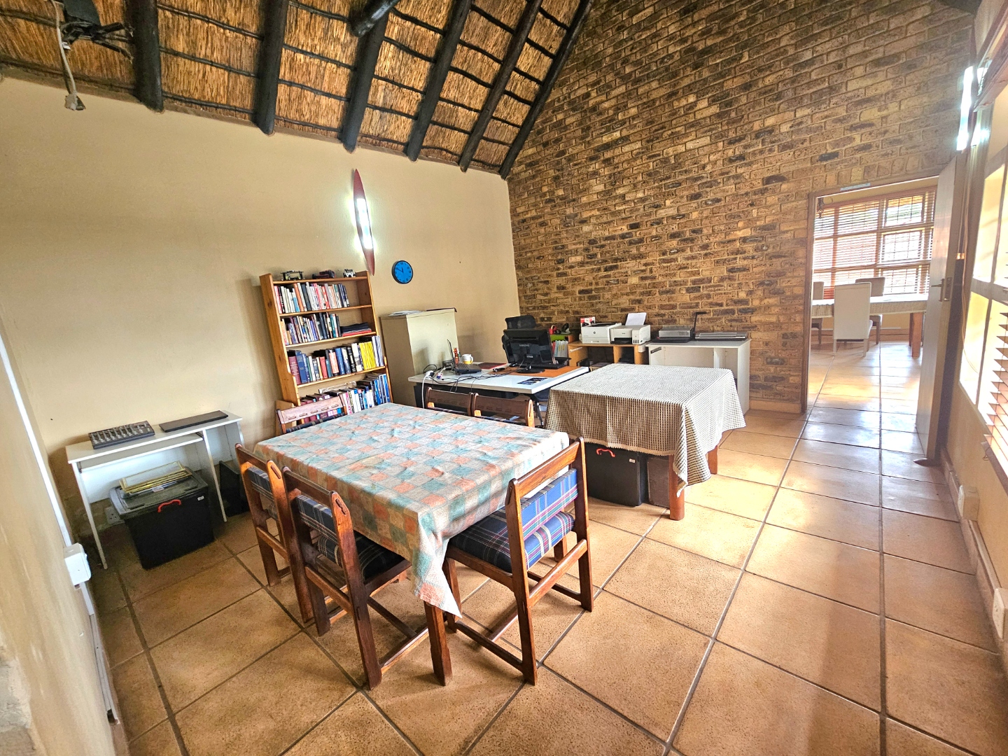 Embrace a holiday-style lifestyle in this charming thatched-roof home, offering a harmonious blend of rustic charm and contemporary living perfectly suited for entertaining family and friends. The property also offers two large additional rooms, ideal for use as home offices, studios, or versatile workspaces. A large carport further enhances the practicality of the home and can easily serve as a workshop or additional covered workspace for about six cars.