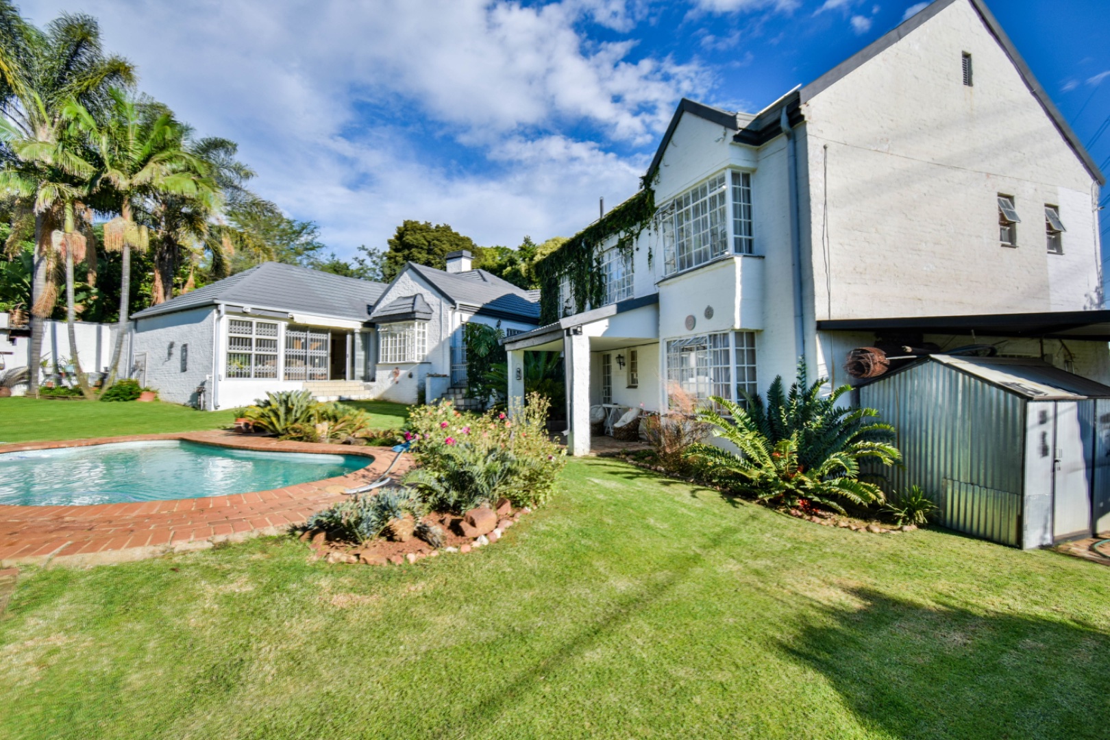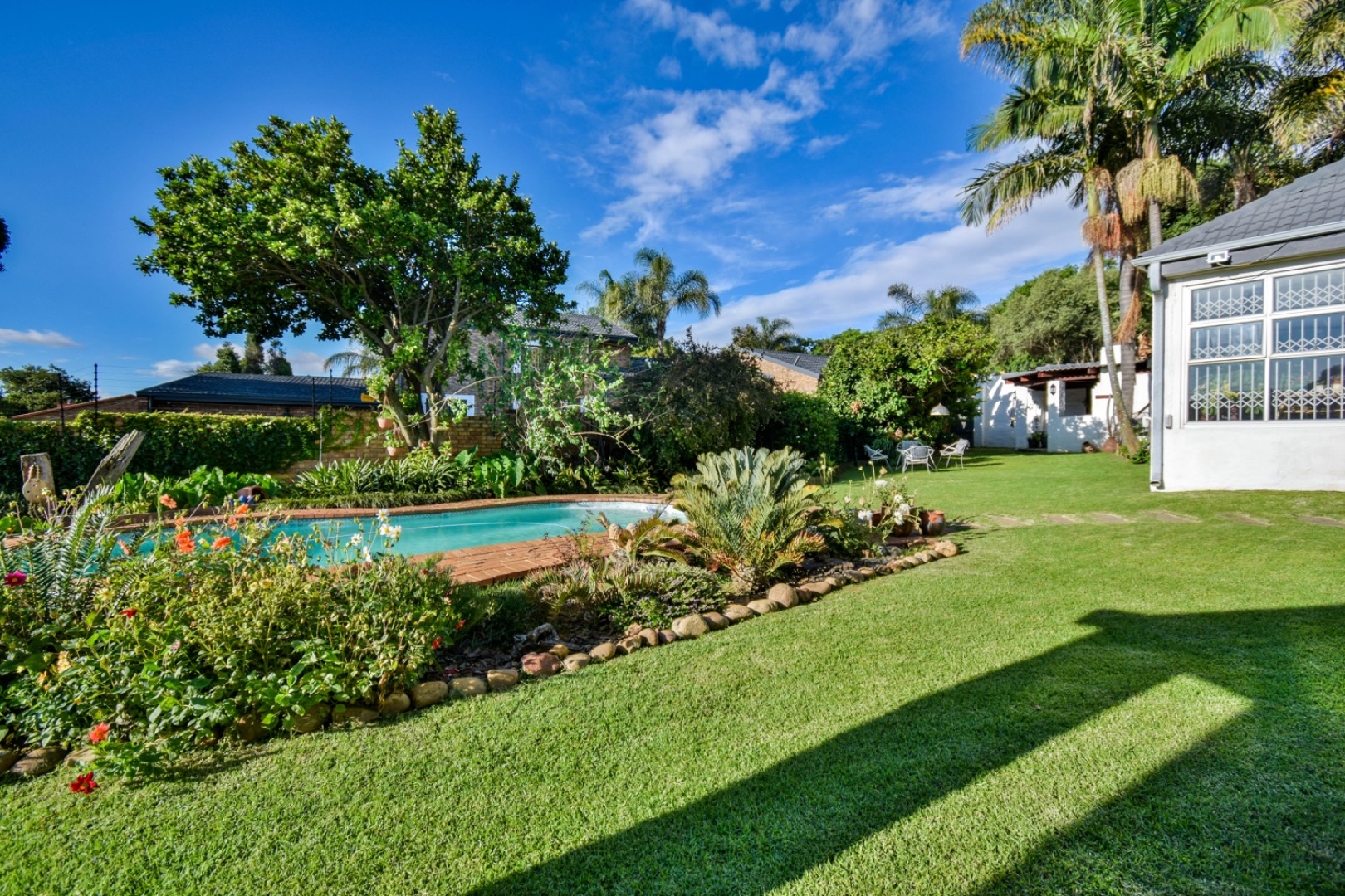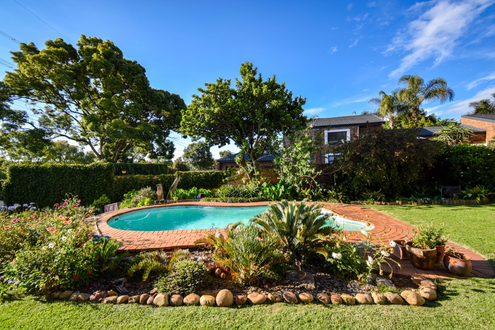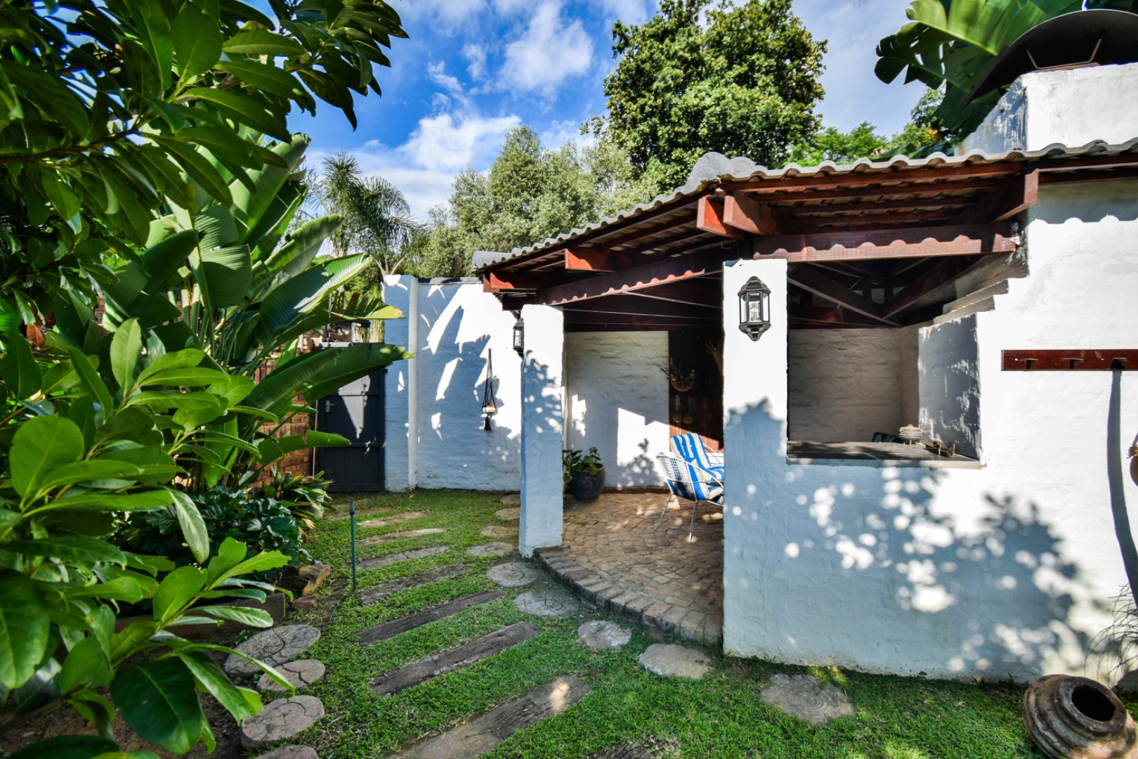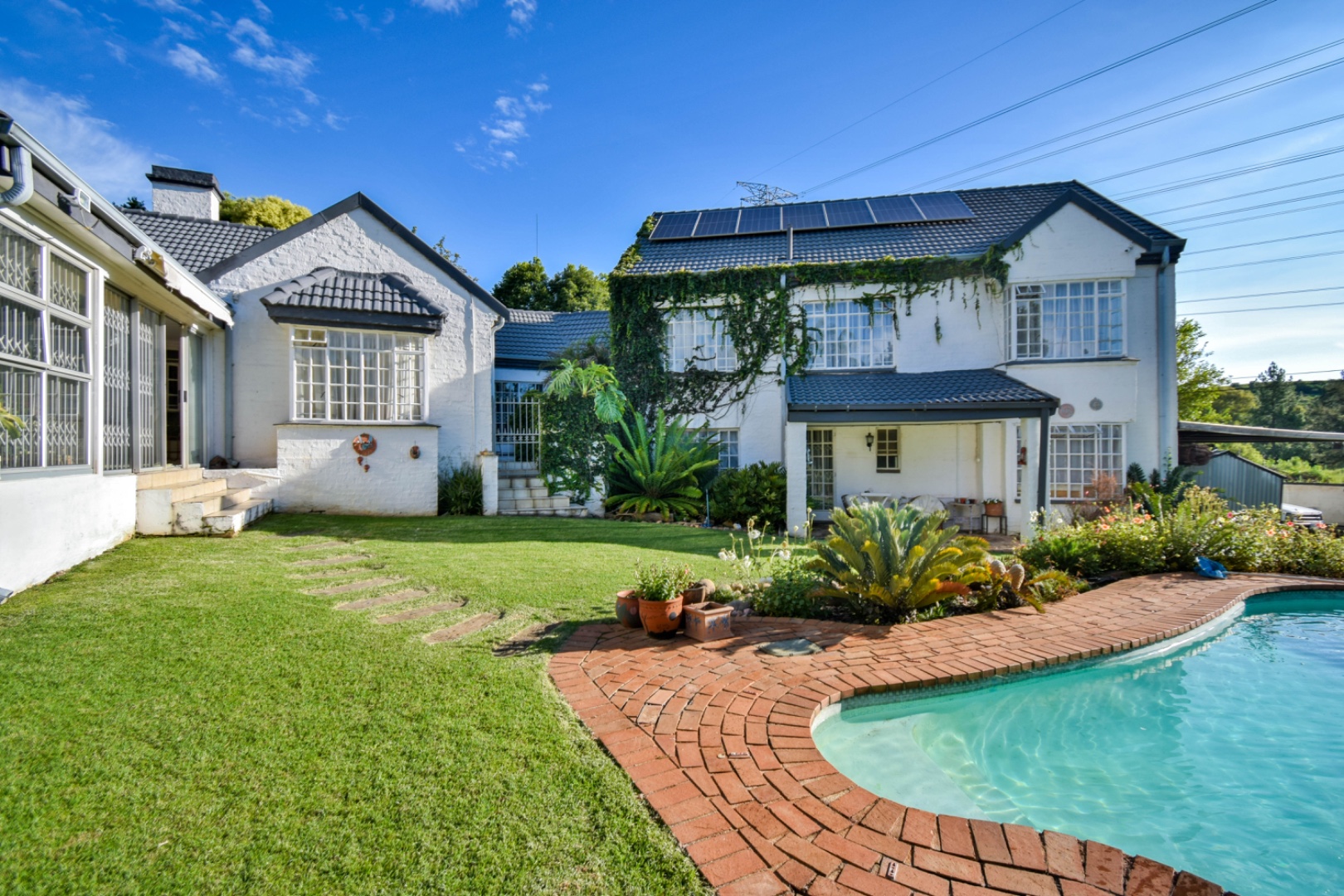 Outdoor living is a delight with a refreshing swimming pool, a private patio, and a built-in braai room for al fresco dining. The property offers ample parking with six dedicated spaces, a convenient laundry room, and generous storage. Practical amenities include staff quarters, domestic rooms, outside toilets, and an irrigation system to maintain the beautiful garden. Pets are welcome, making this an ideal family home.