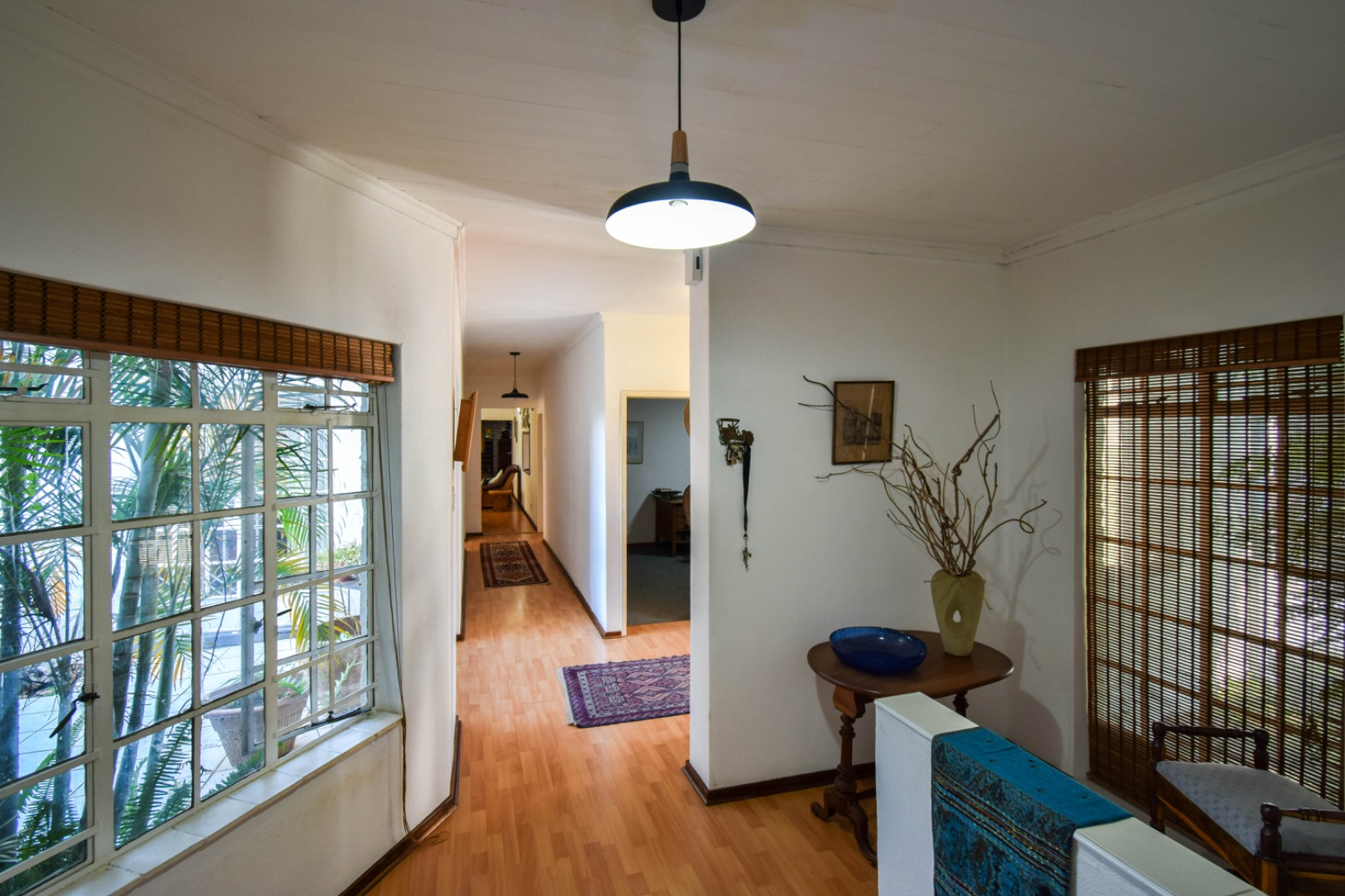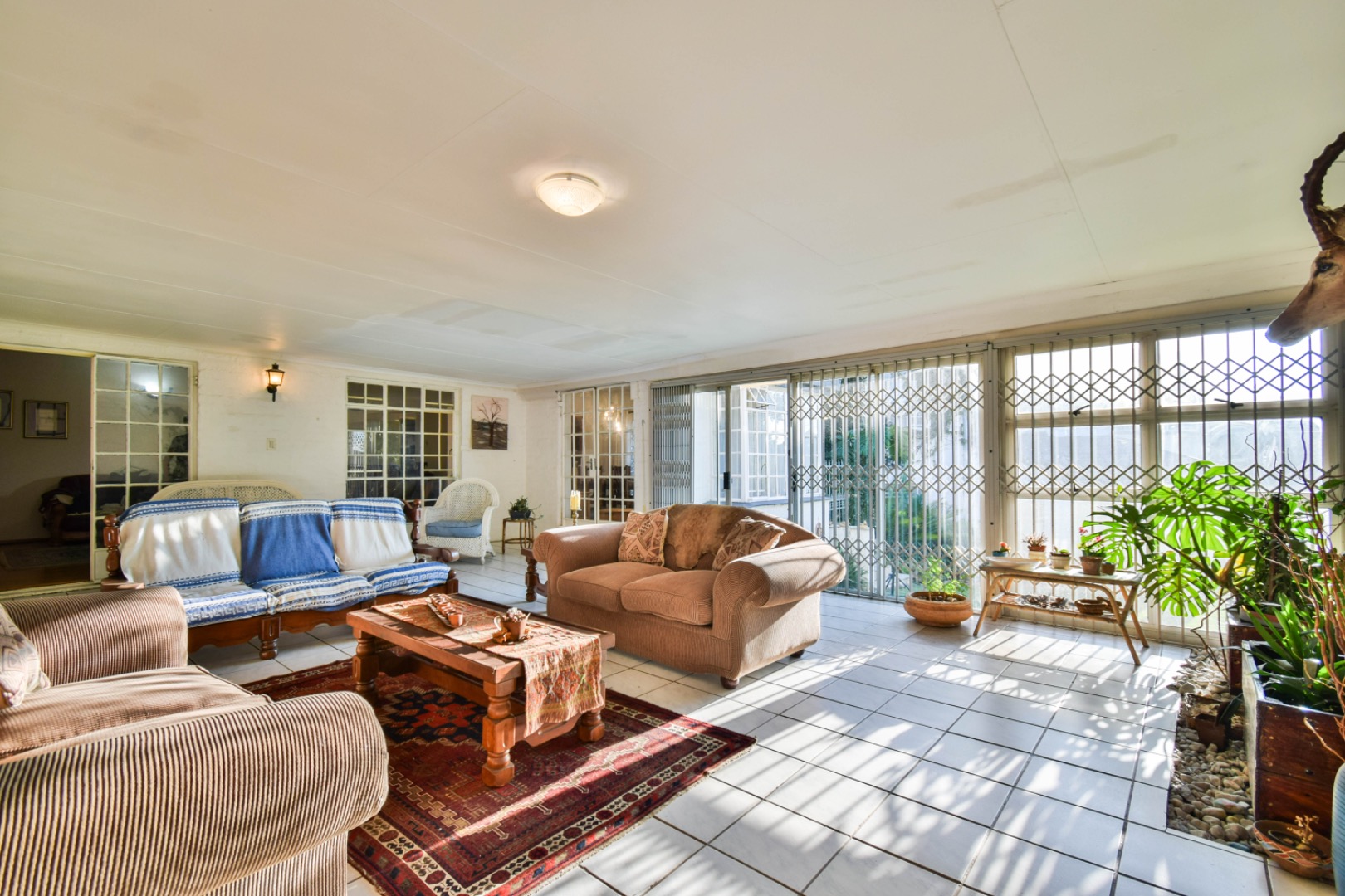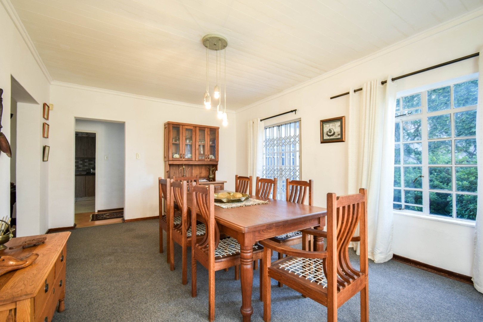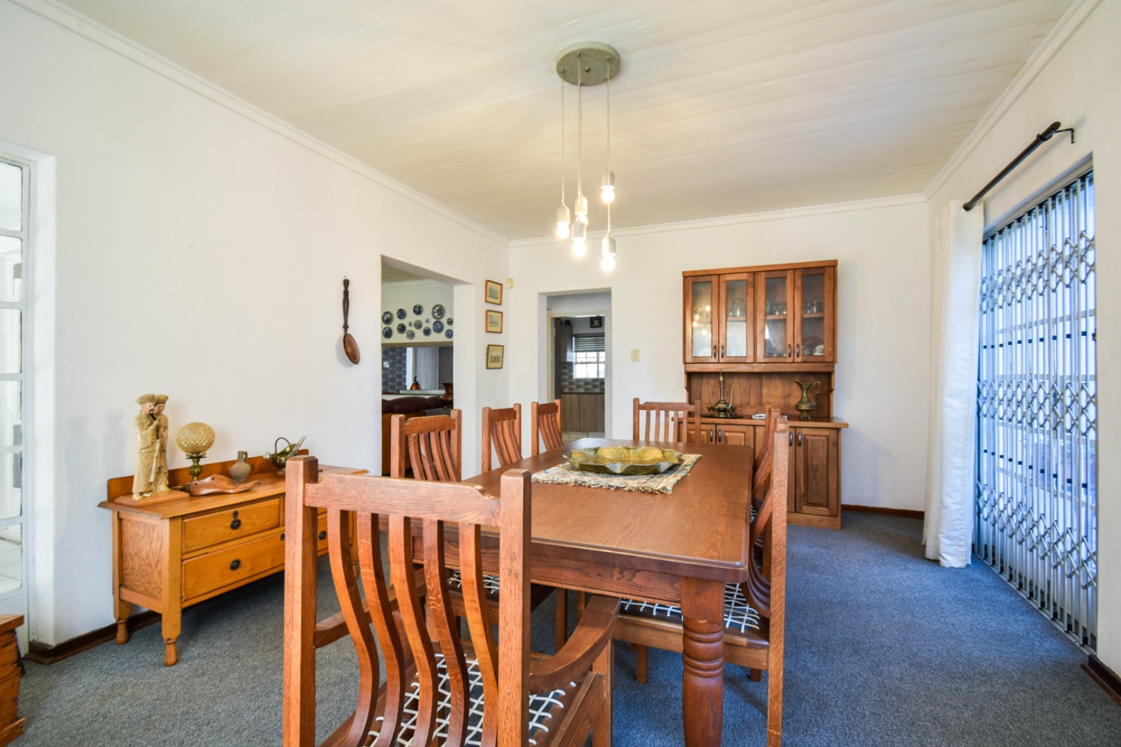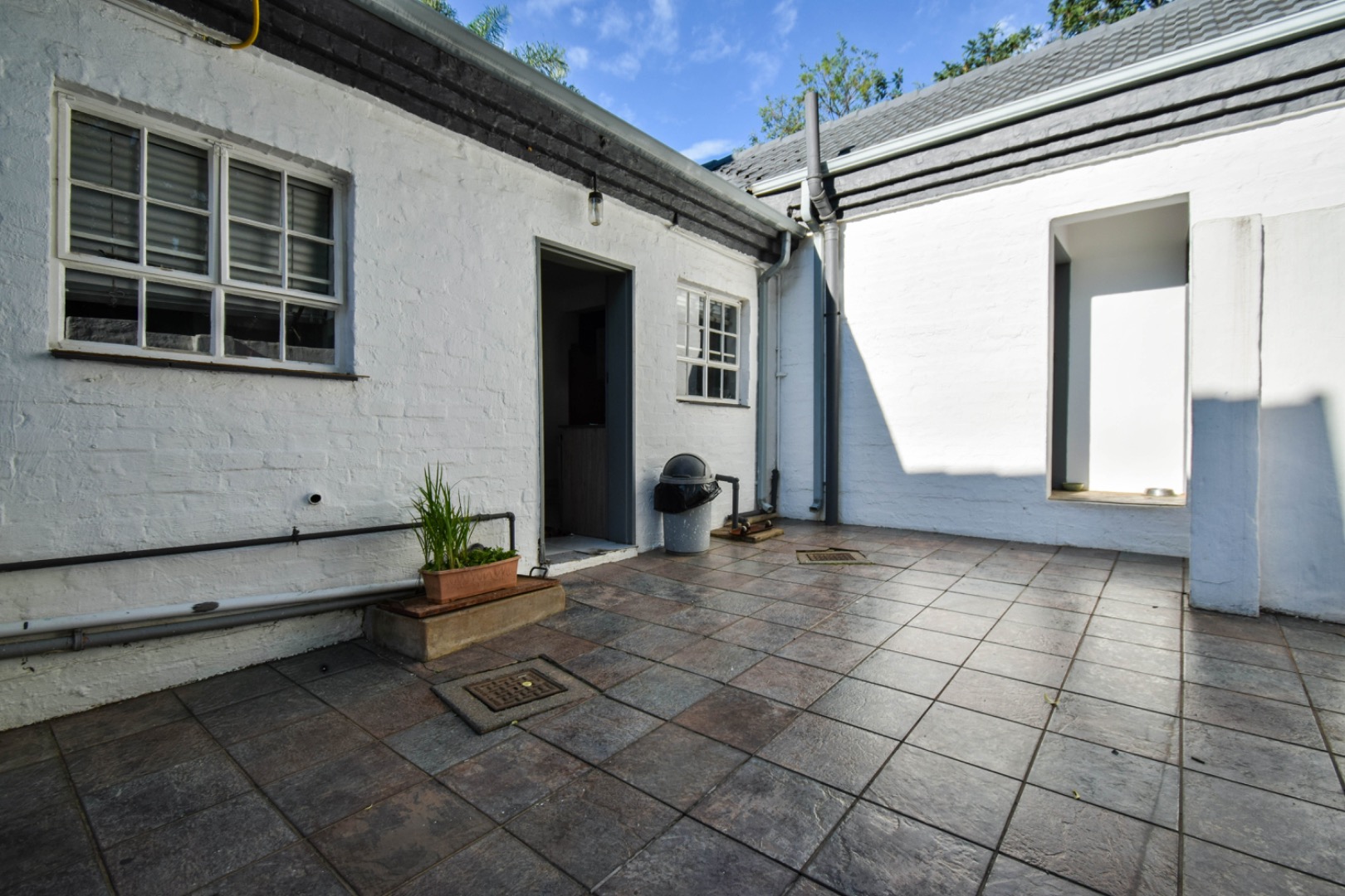 Outdoor living is a delight with a refreshing swimming pool, a private patio, and a built-in braai room for al fresco dining. The property offers ample parking with six dedicated spaces, a convenient laundry room, and generous storage. Practical amenities include staff quarters, domestic rooms, outside toilets, and an irrigation system to maintain the beautiful garden. Pets are welcome, making this an ideal family home.