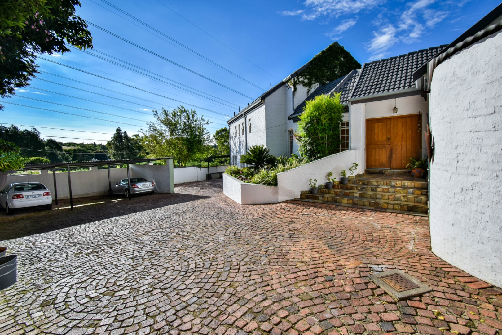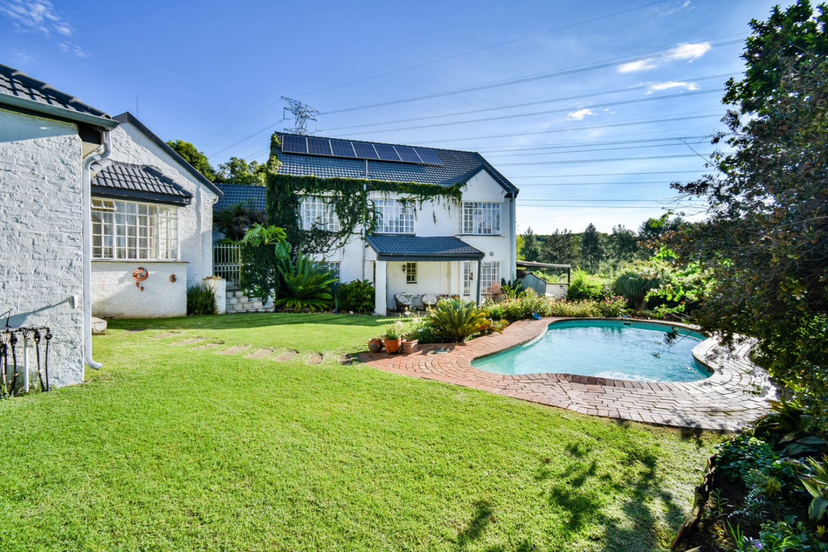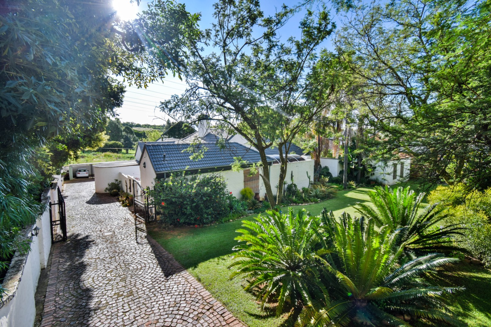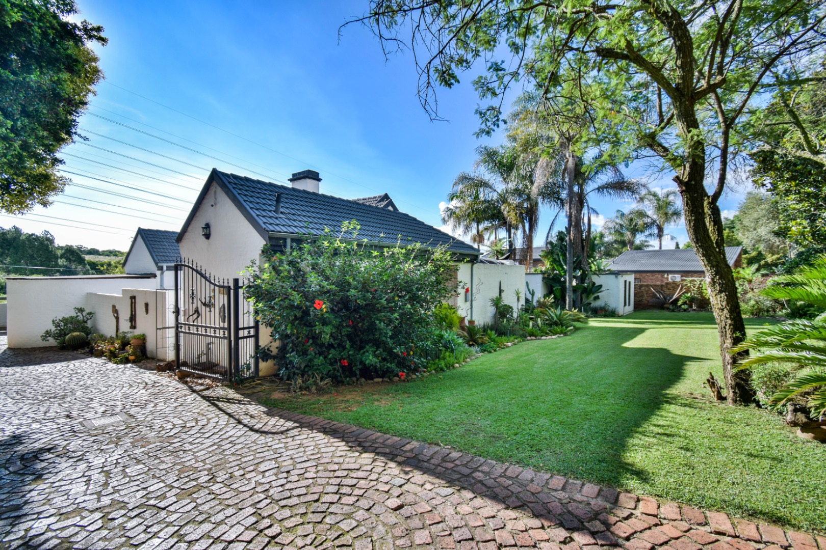 Discover this exceptional family residence nestled in the desirable suburban area of Moreleta Park, Pretoria. The property immediately impresses with its charming cobbled driveway, leading to a meticulously maintained white exterior and a distinctive dark tiled roof, all set within a lush, established garden featuring mature trees and expansive green lawns.
