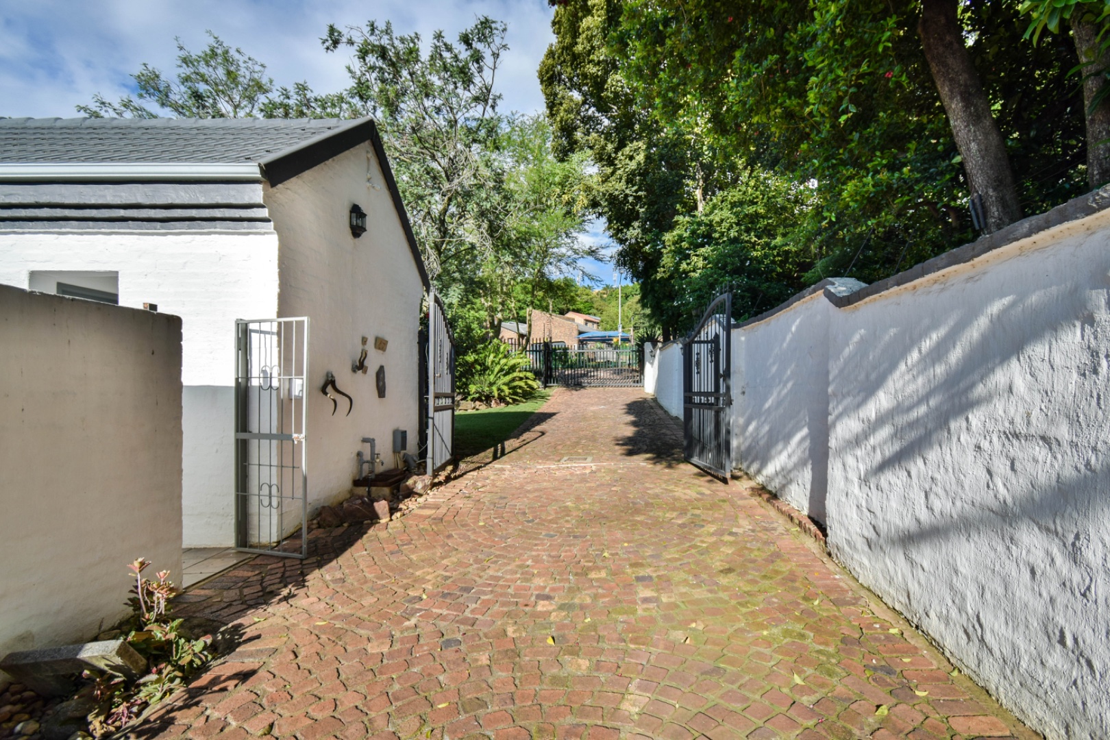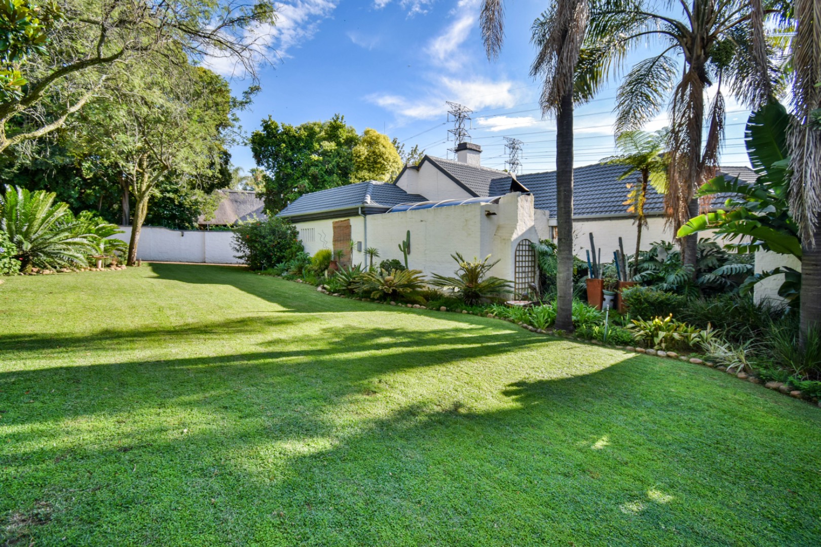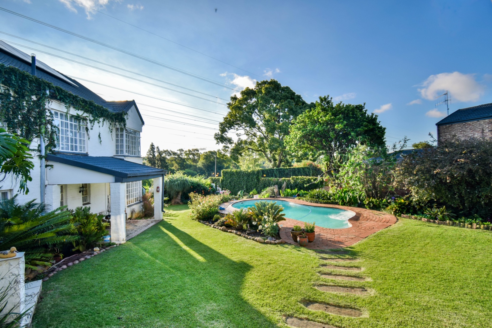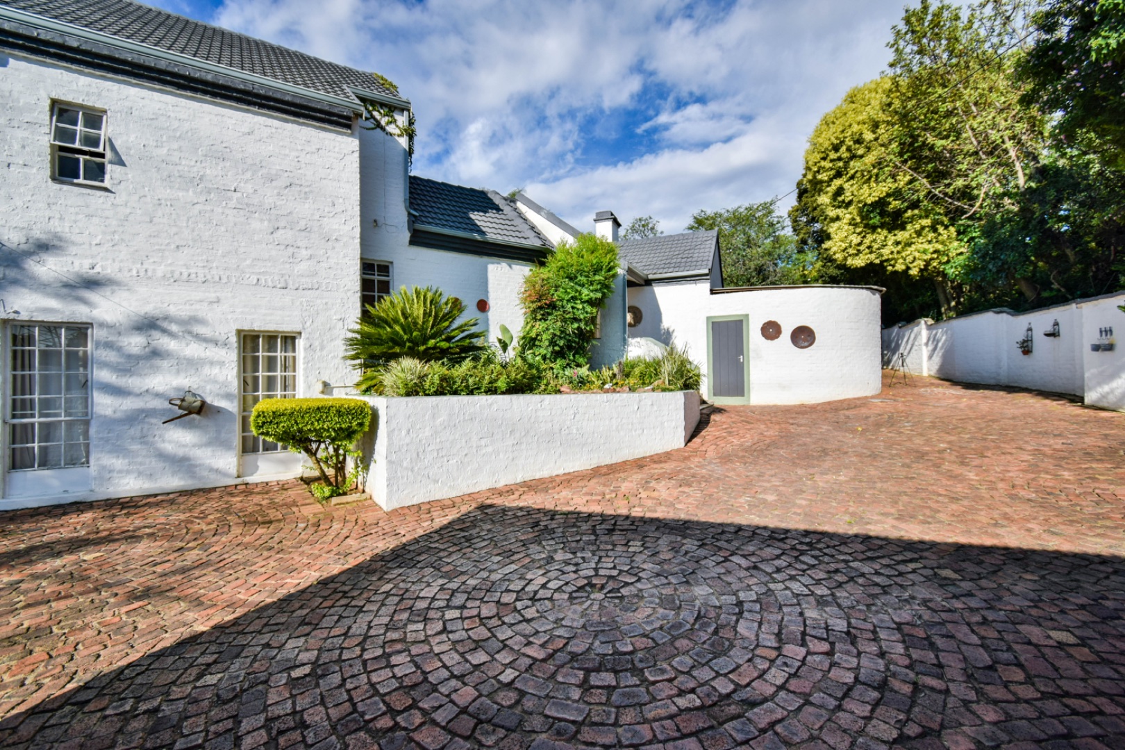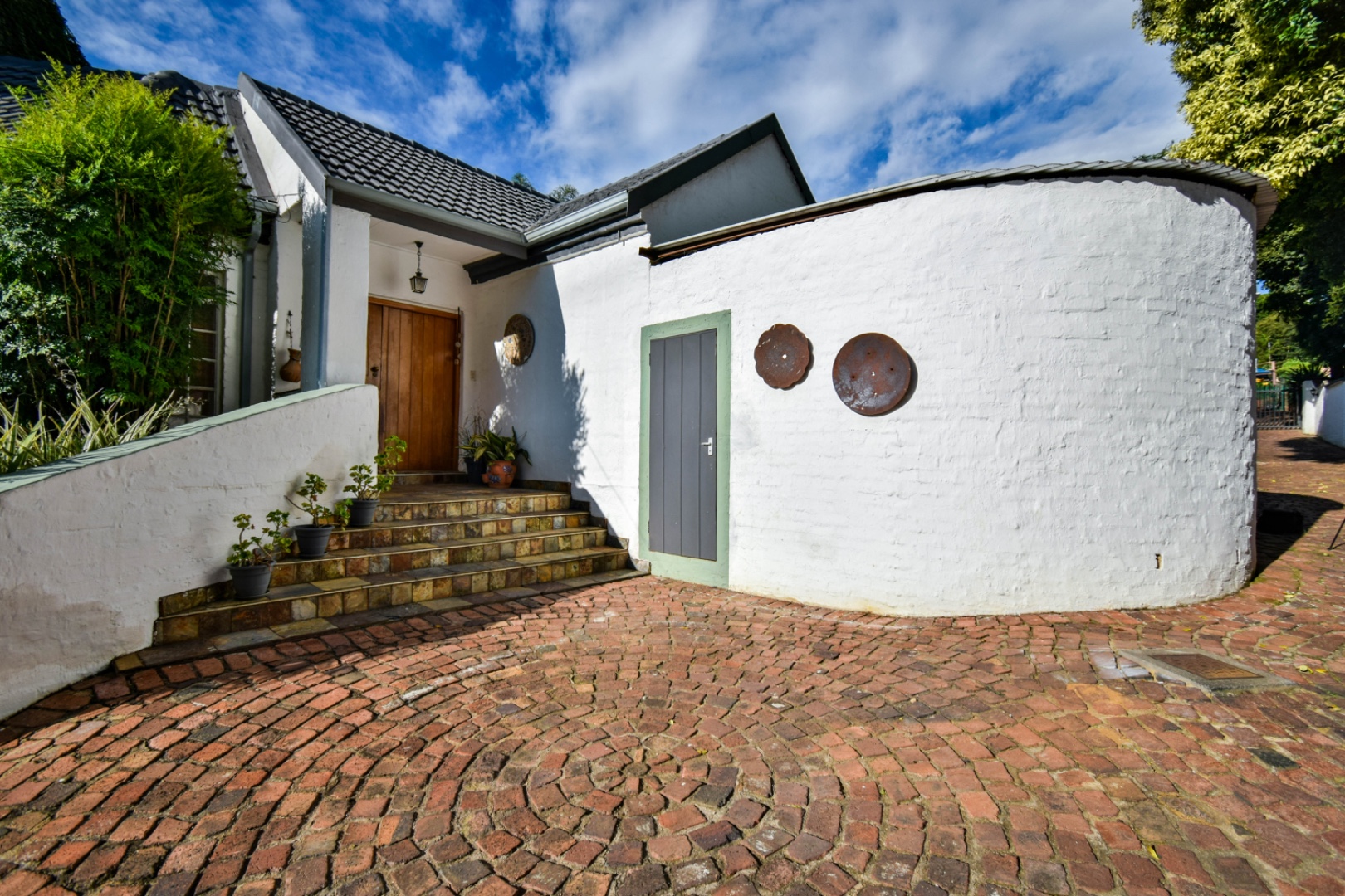 Discover this exceptional family residence nestled in the desirable suburban area of Moreleta Park, Pretoria. The property immediately impresses with its charming cobbled driveway, leading to a meticulously maintained white exterior and a distinctive dark tiled roof, all set within a lush, established garden featuring mature trees and expansive green lawns.