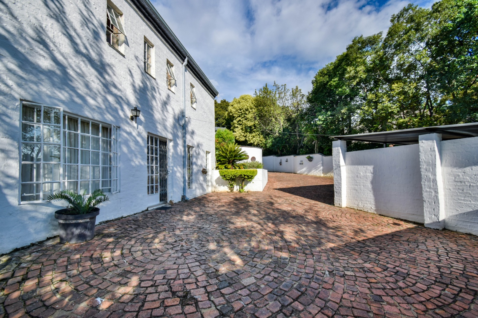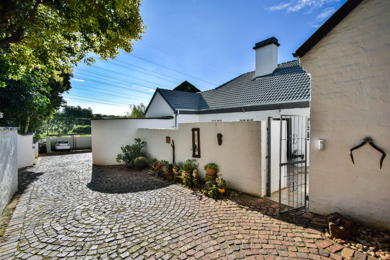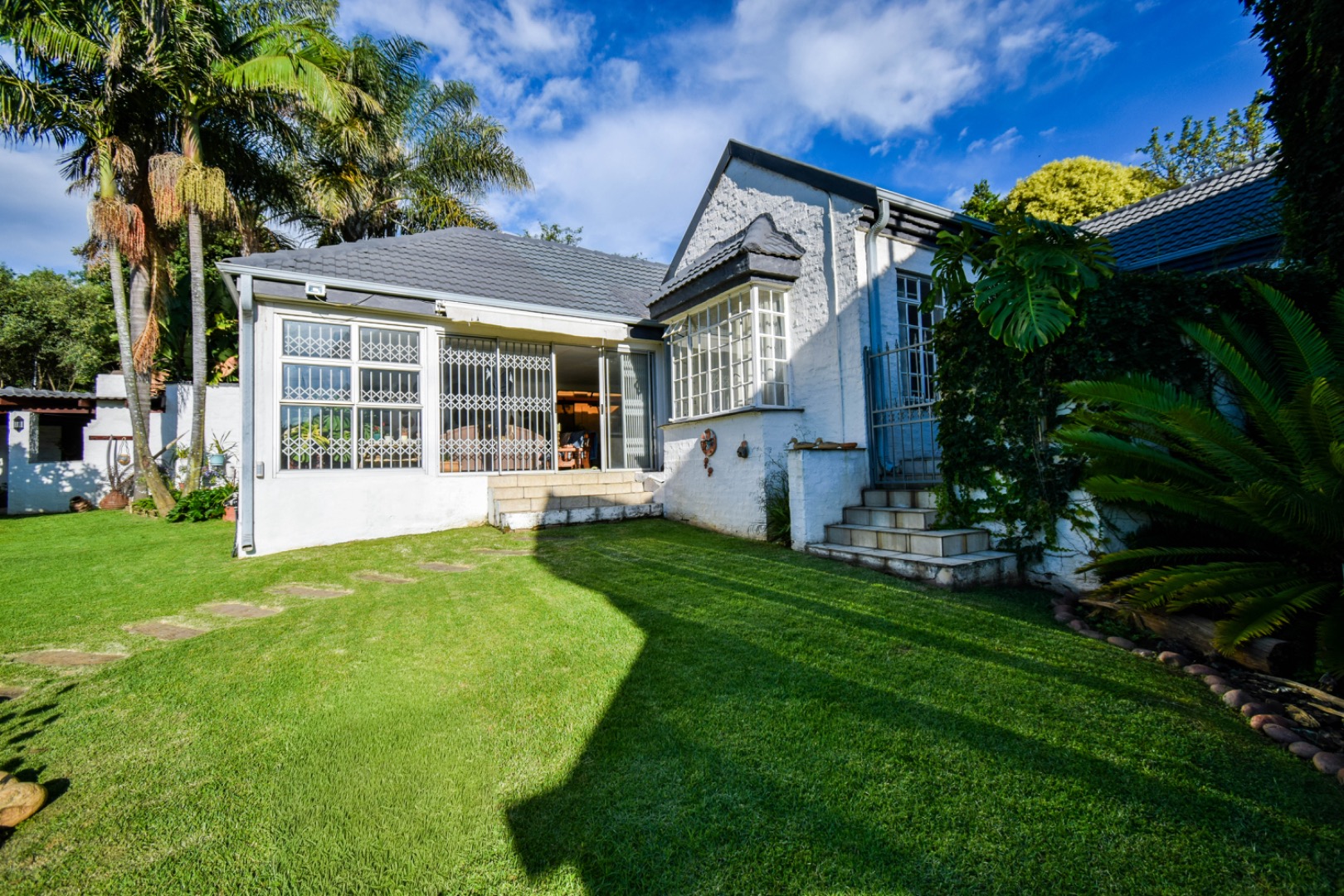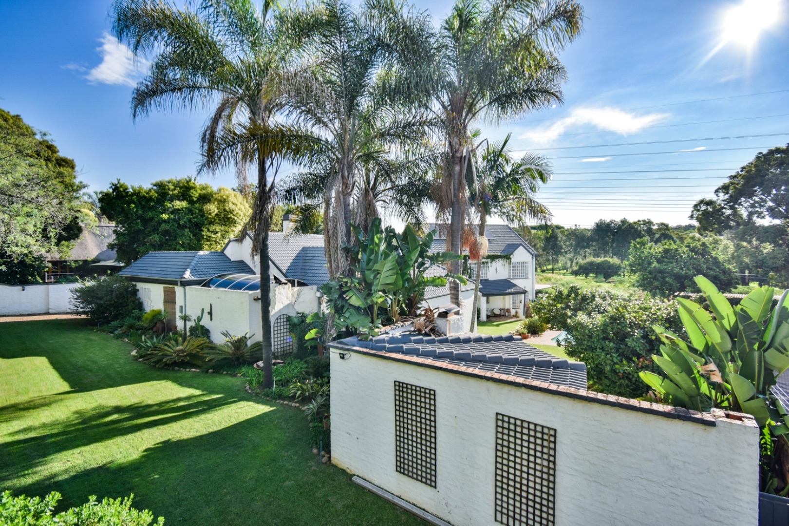 Discover this exceptional family residence nestled in the desirable suburban area of Moreleta Park, Pretoria. The property immediately impresses with its charming cobbled driveway, leading to a meticulously maintained white exterior and a distinctive dark tiled roof, all set within a lush, established garden featuring mature trees and expansive green lawns.