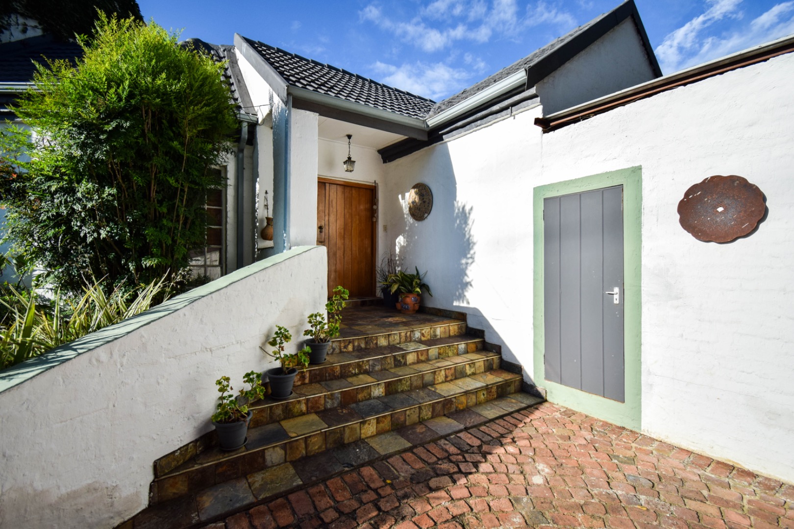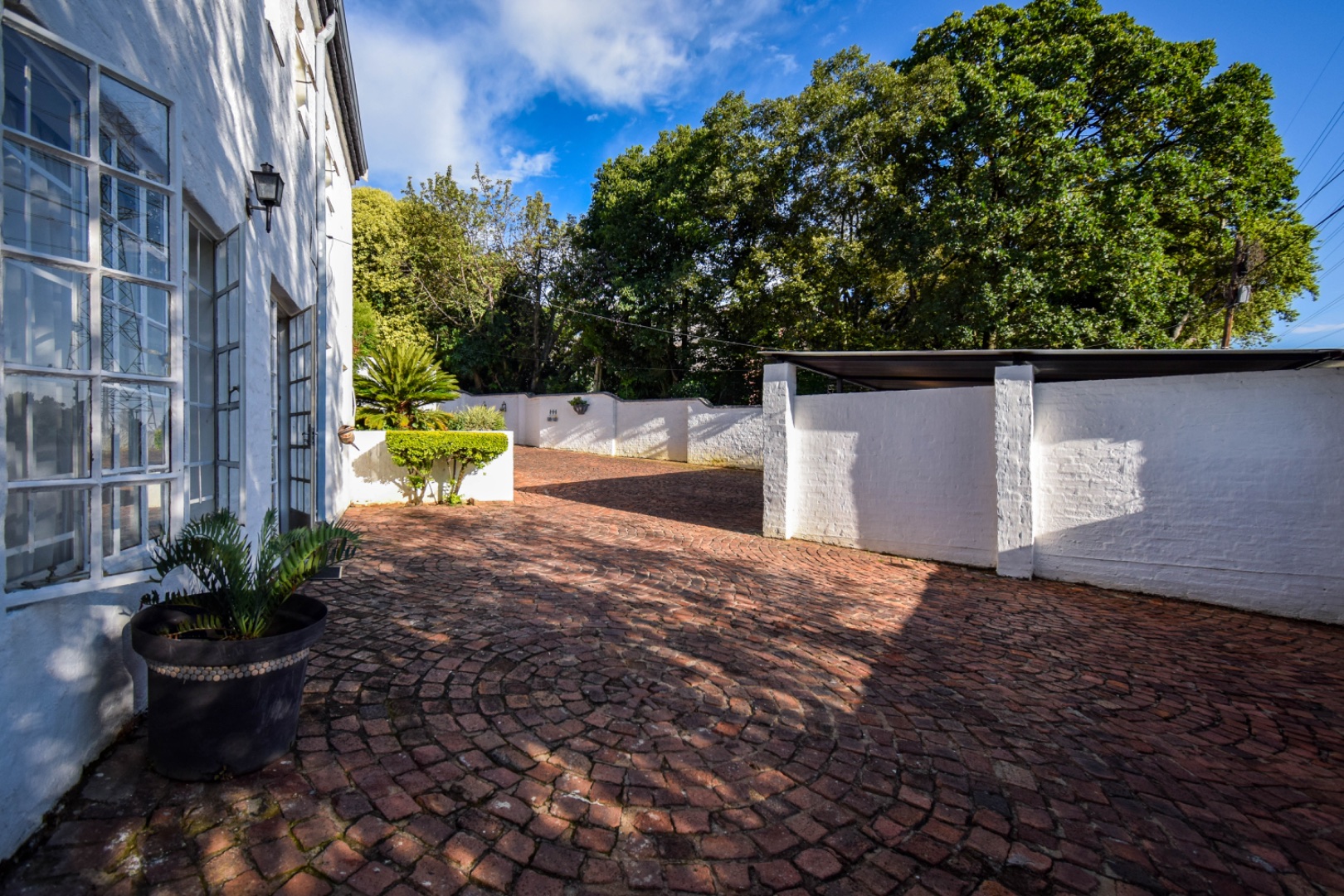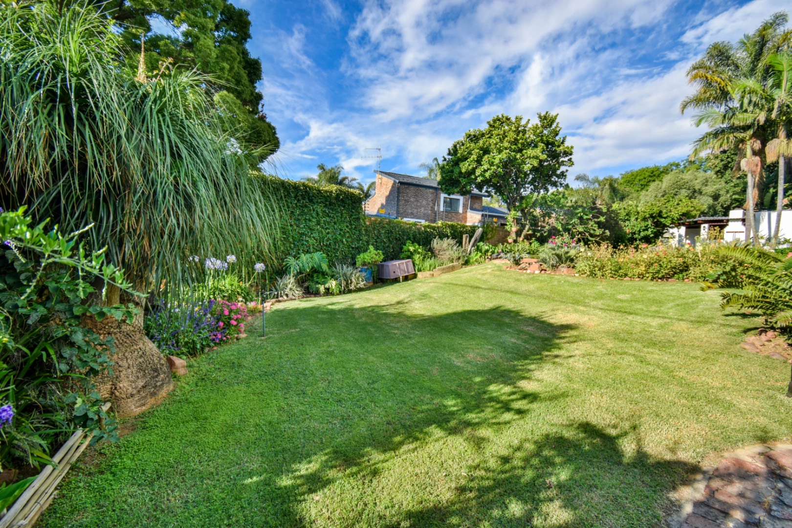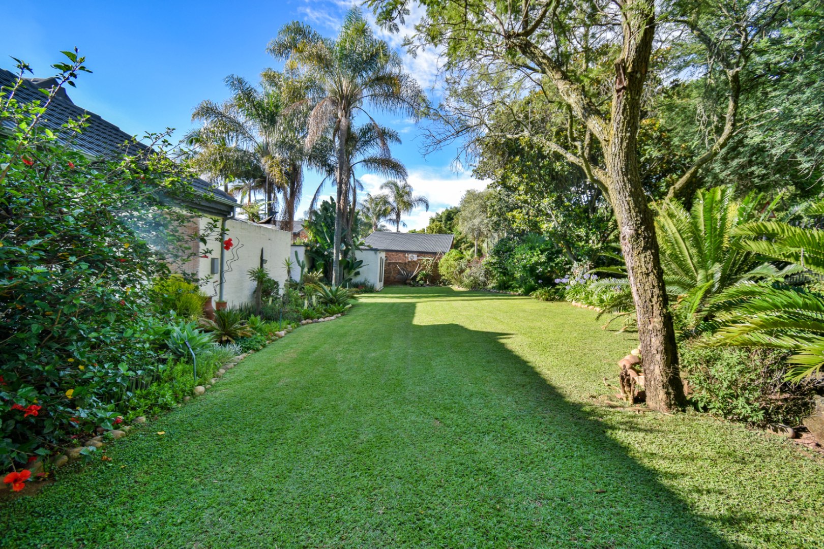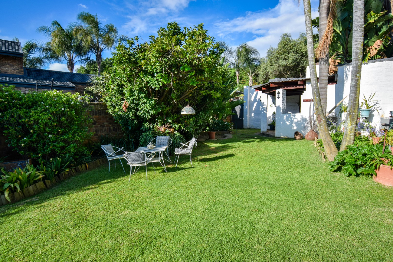 Discover this exceptional family residence nestled in the desirable suburban area of Moreleta Park, Pretoria. The property immediately impresses with its charming cobbled driveway, leading to a meticulously maintained white exterior and a distinctive dark tiled roof, all set within a lush, established garden featuring mature trees and expansive green lawns.