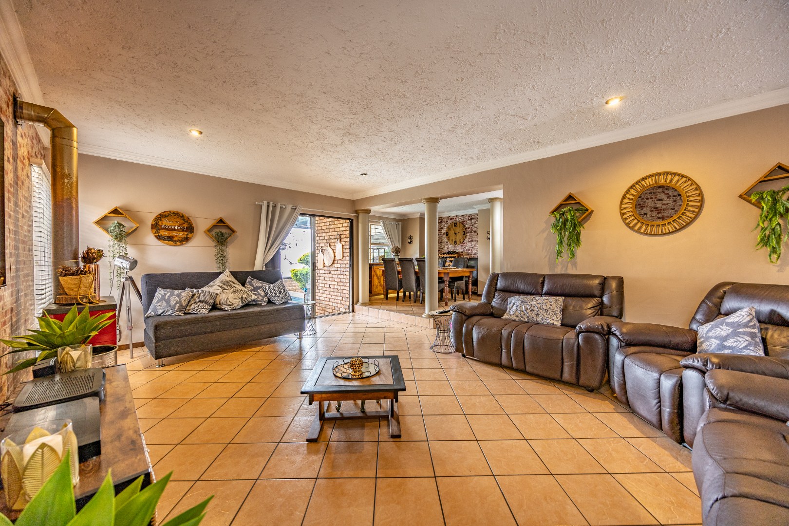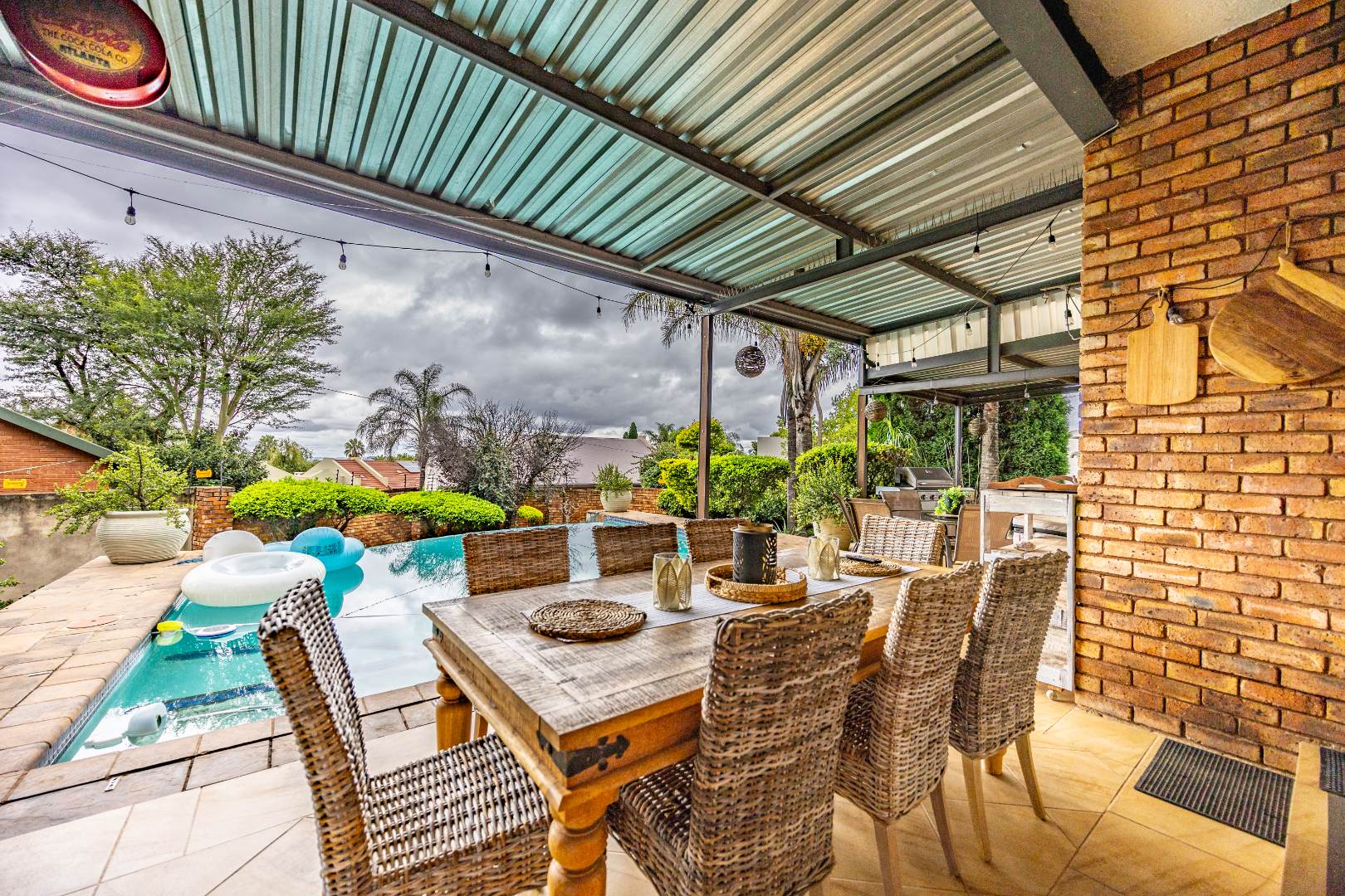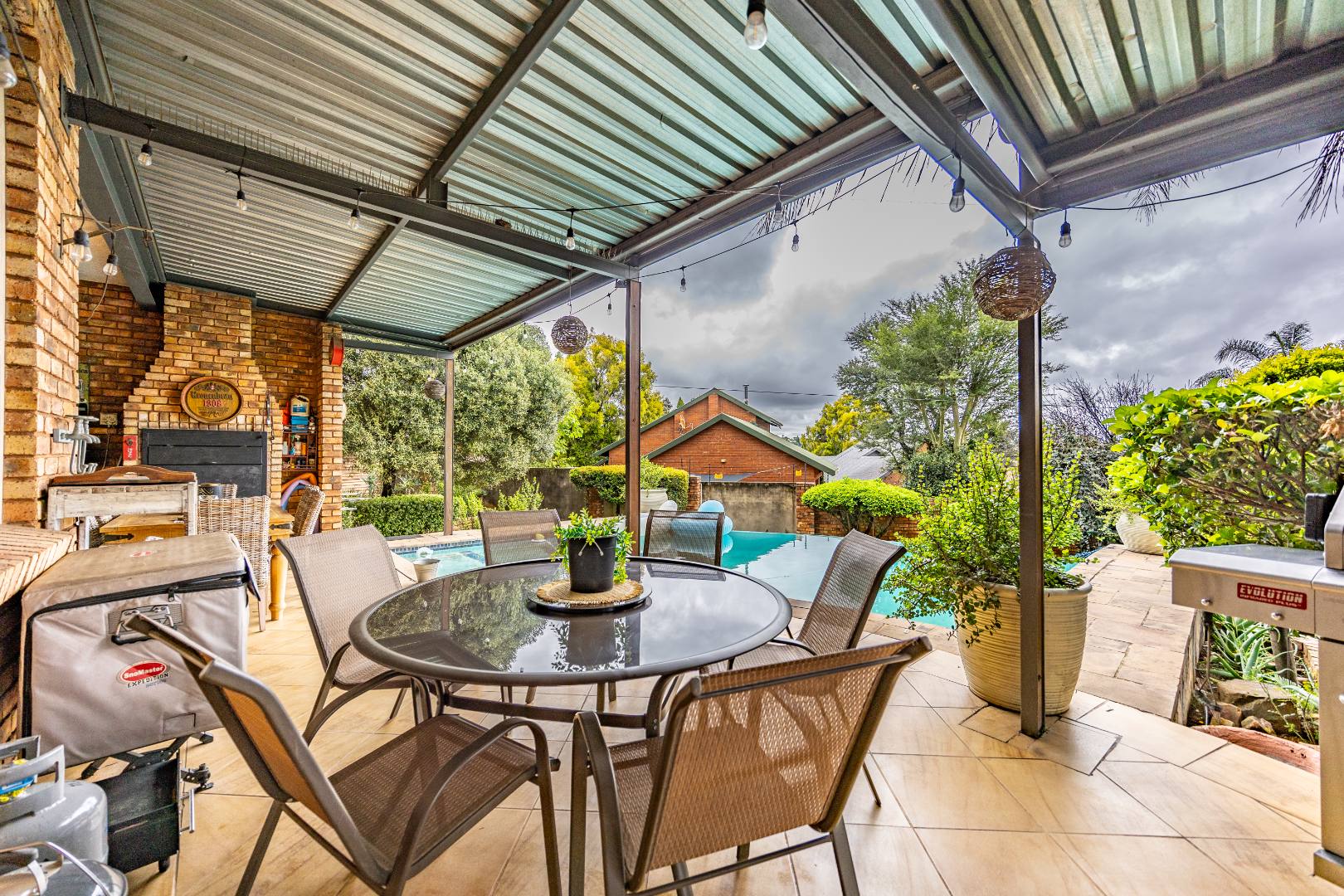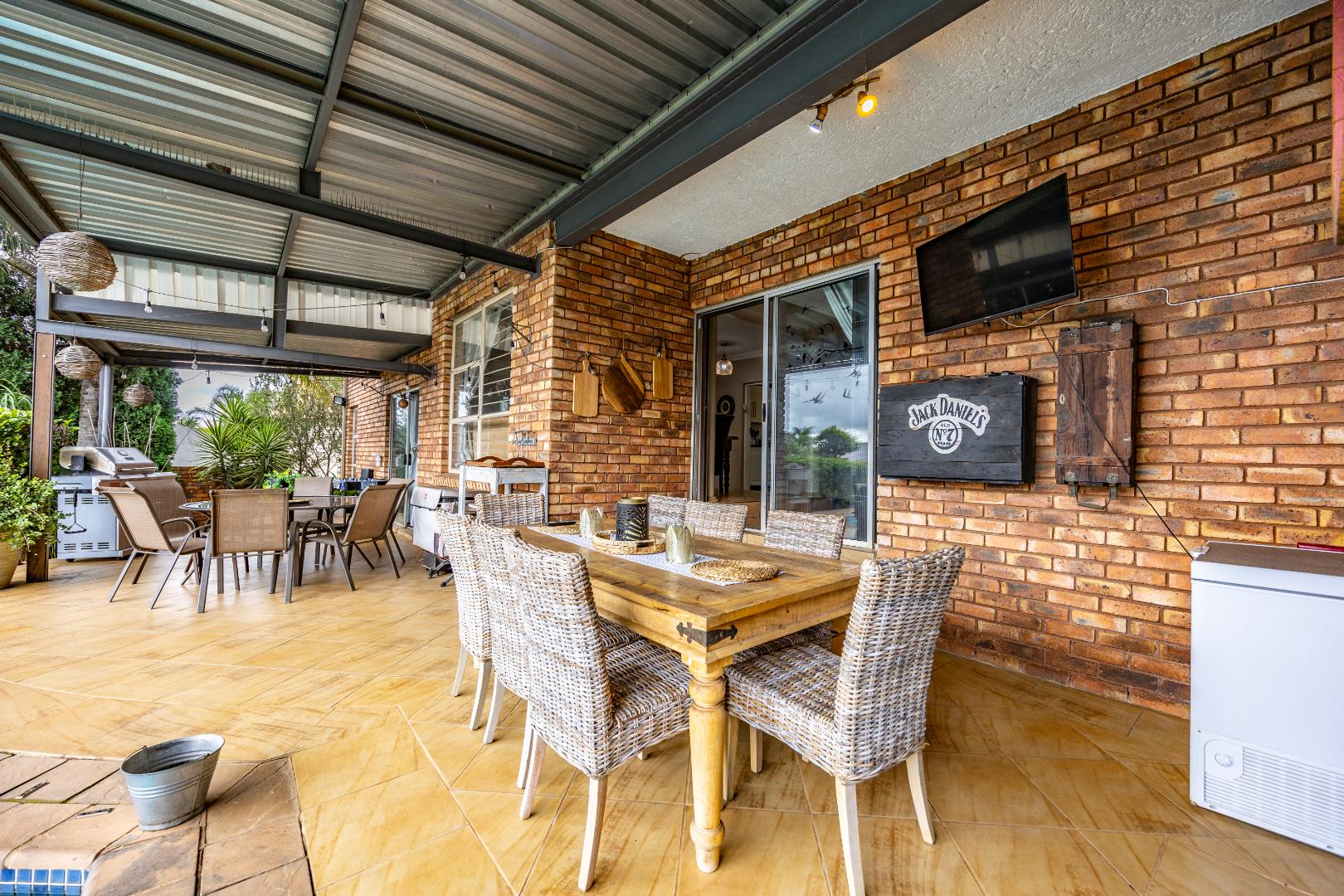 Inside, the home invites connection and effortless entertaining. Multiple open-plan living areas flow beautifully from the formal lounge with its inviting built-in fireplace to the TV lounge and dining room, all leading out to a generous covered patio with a built-in braai. Here, entertaining becomes second nature with friends gathered on the patio, the heated spill-over pool shimmering nearby, and conversations continuing around the outdoor firepit as the evening settles in. The kitchen sits at the heart of the home with a gas hobs, walk-in pantry, and separate scullery, creating a practical yet welcoming space where family life and entertaining come together naturally.