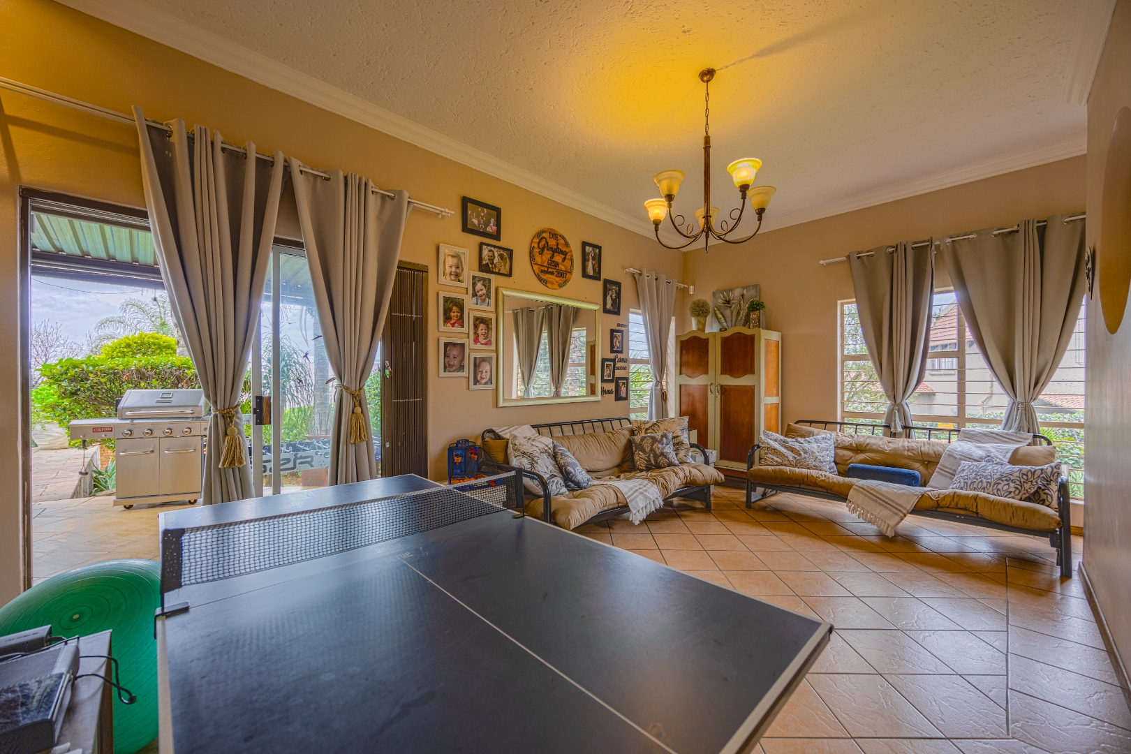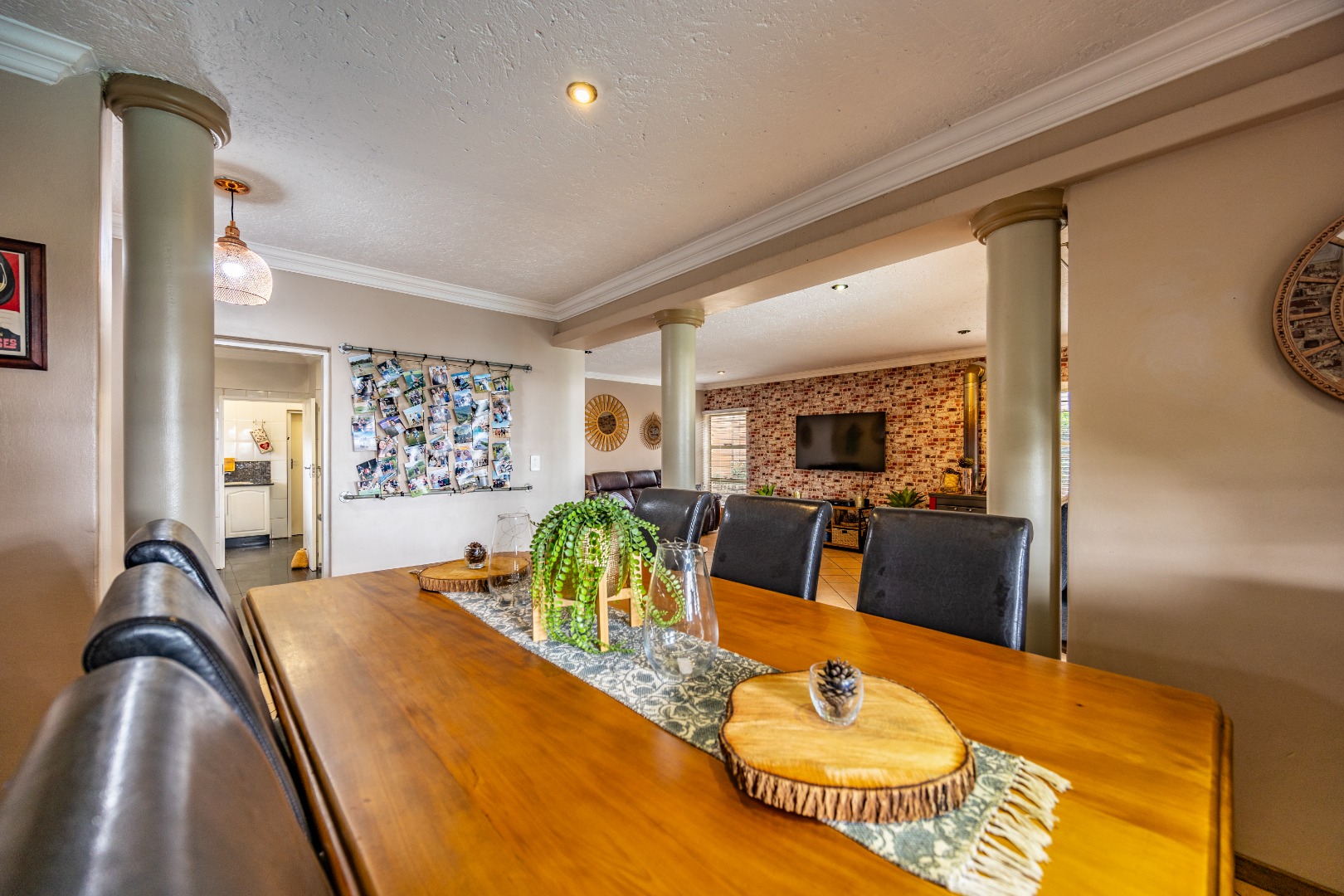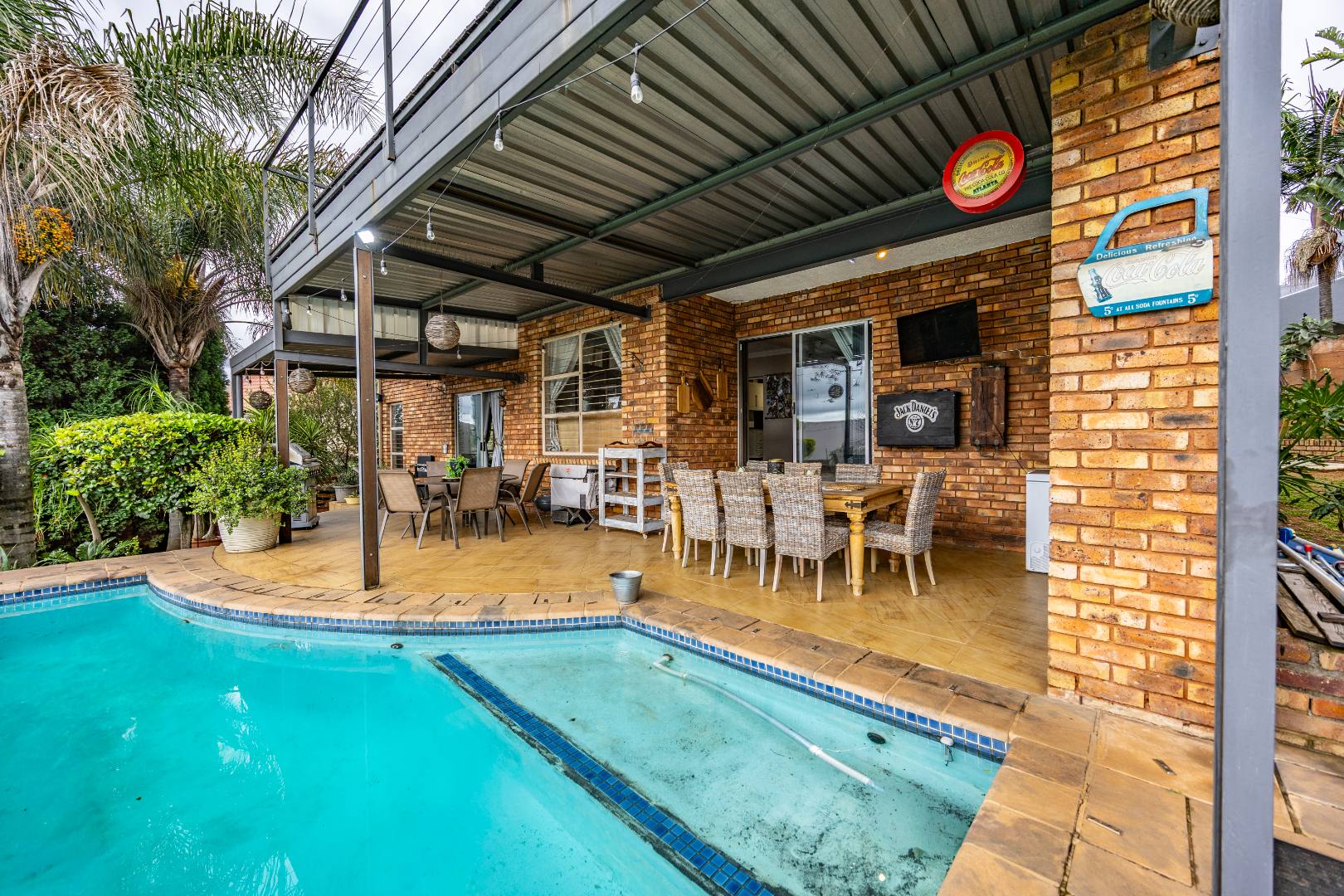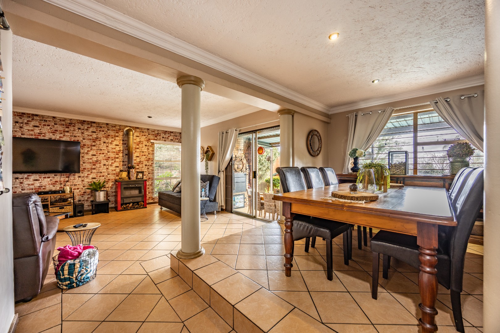 Inside, the home invites connection and effortless entertaining. Multiple open-plan living areas flow beautifully from the formal lounge with its inviting built-in fireplace to the TV lounge and dining room, all leading out to a generous covered patio with a built-in braai. Here, entertaining becomes second nature with friends gathered on the patio, the heated spill-over pool shimmering nearby, and conversations continuing around the outdoor firepit as the evening settles in. The kitchen sits at the heart of the home with a gas hobs, walk-in pantry, and separate scullery, creating a practical yet welcoming space where family life and entertaining come together naturally.