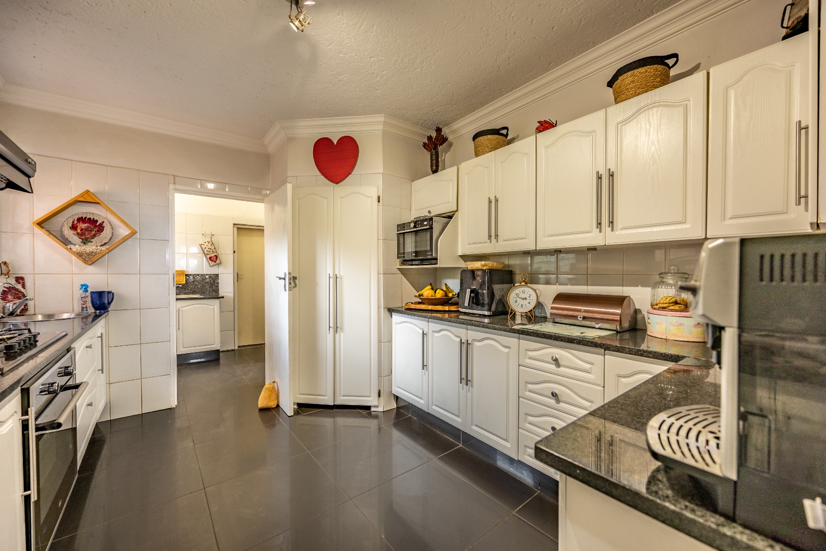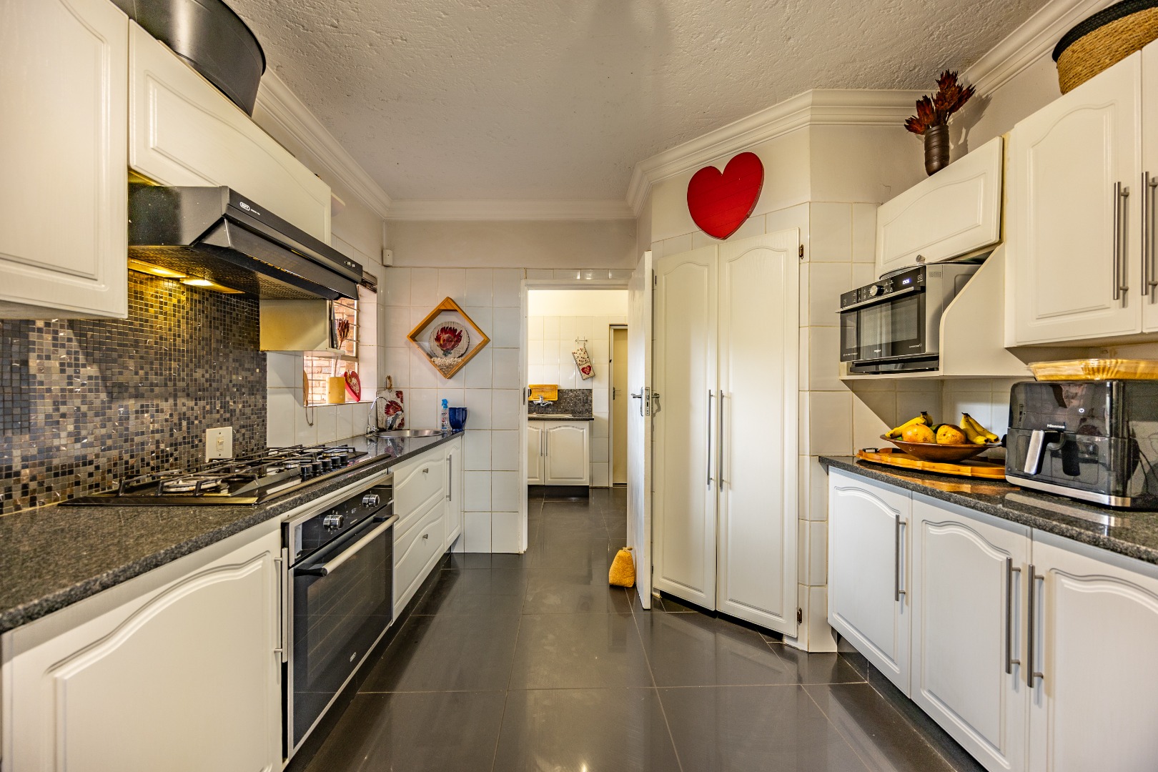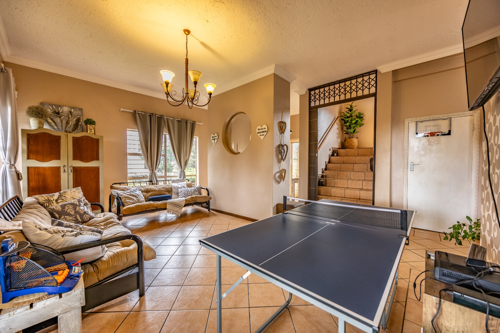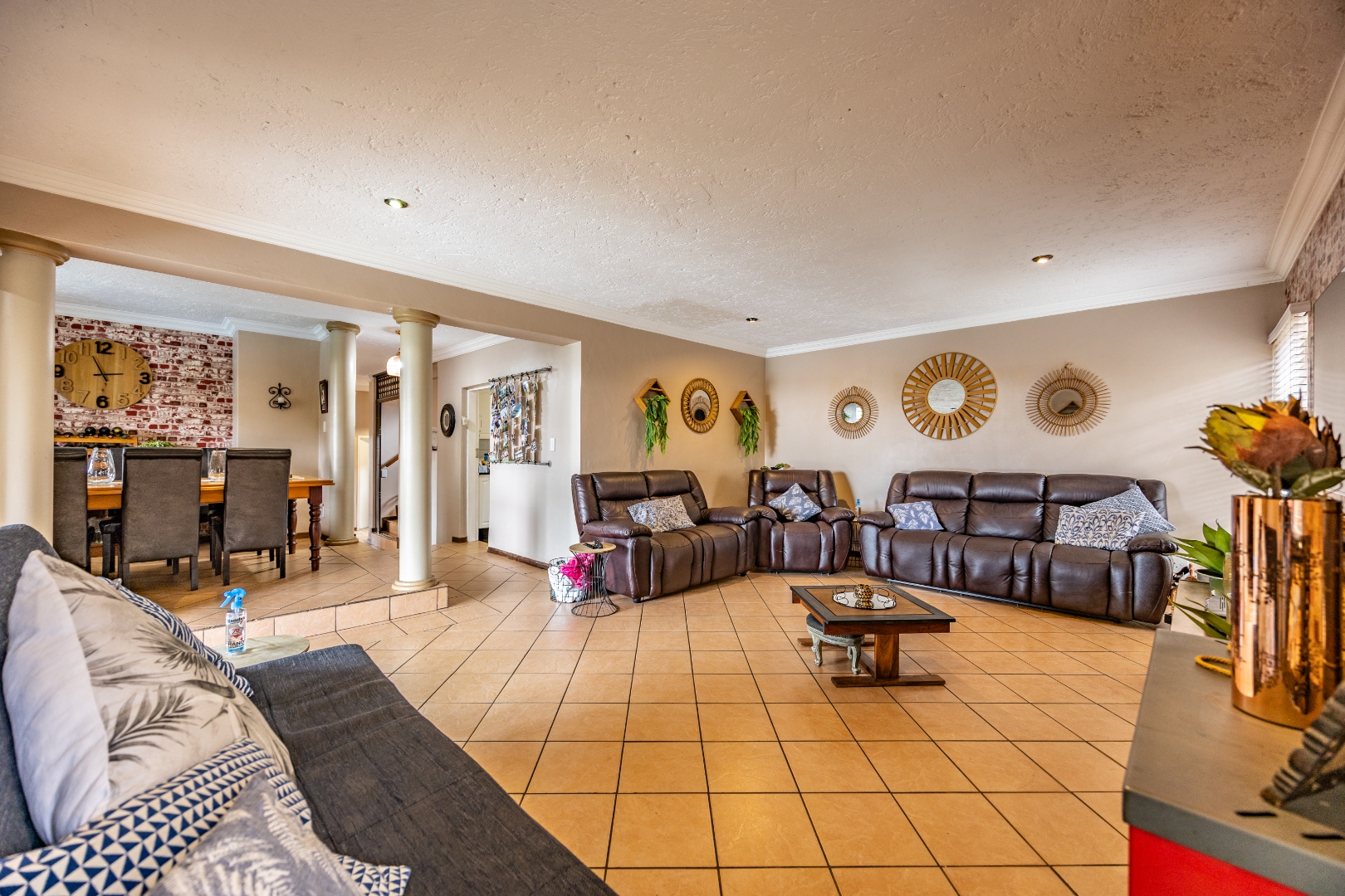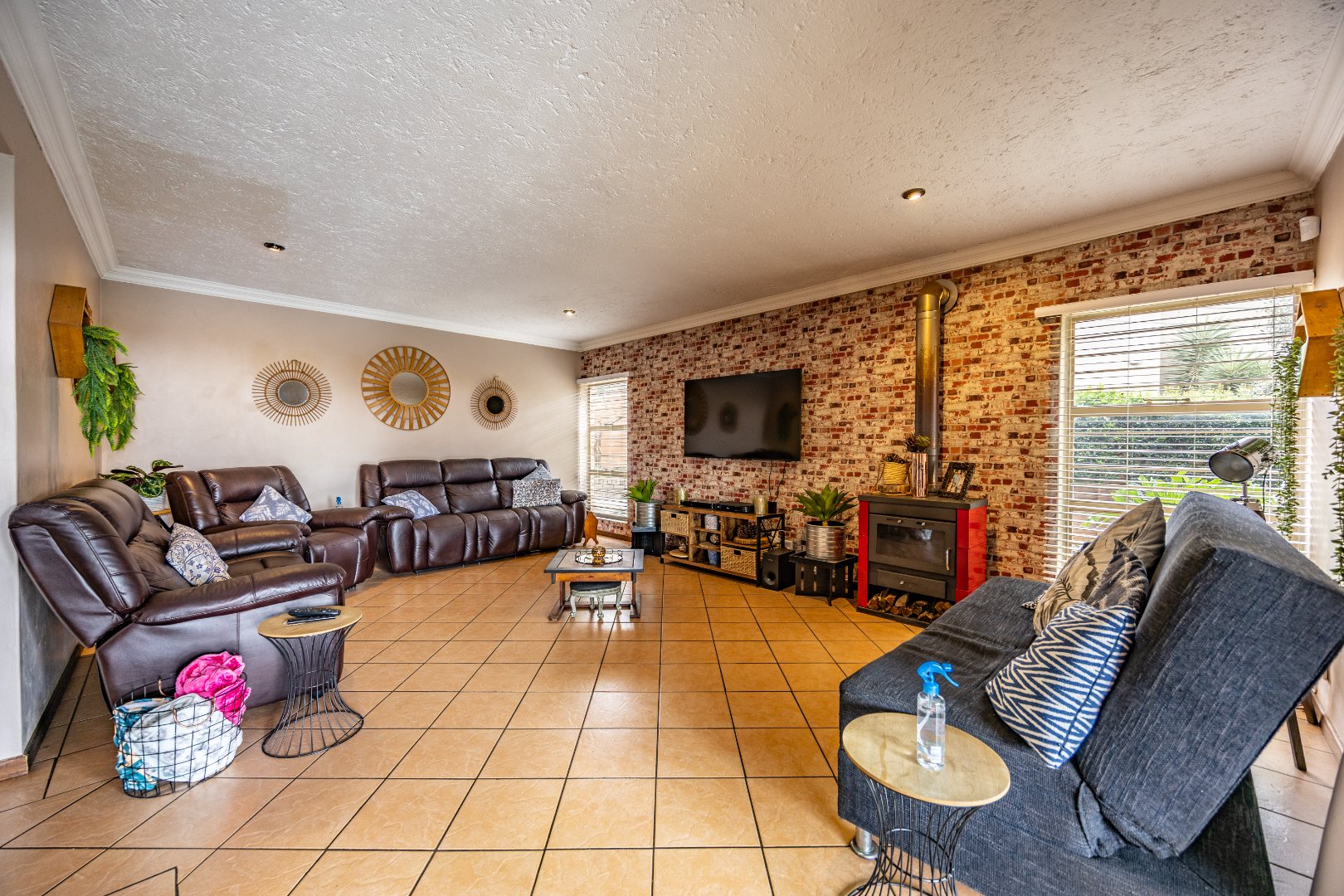 Inside, the home invites connection and effortless entertaining. Multiple open-plan living areas flow beautifully from the formal lounge with its inviting built-in fireplace to the TV lounge and dining room, all leading out to a generous covered patio with a built-in braai. Here, entertaining becomes second nature with friends gathered on the patio, the heated spill-over pool shimmering nearby, and conversations continuing around the outdoor firepit as the evening settles in. The kitchen sits at the heart of the home with a gas hobs, walk-in pantry, and separate scullery, creating a practical yet welcoming space where family life and entertaining come together naturally.