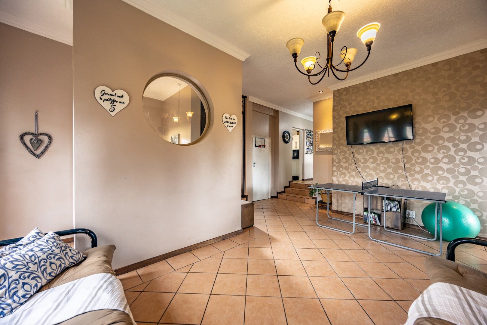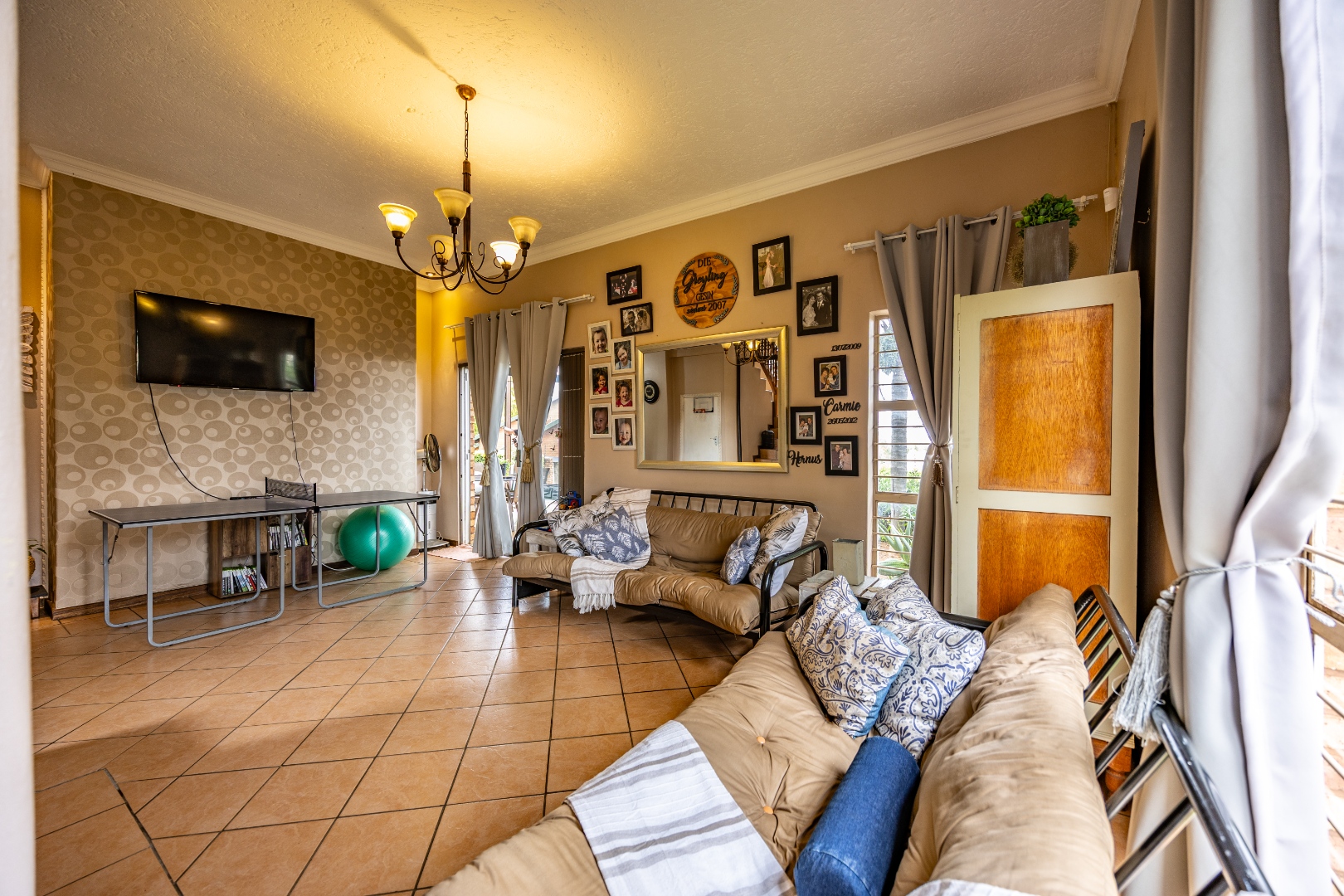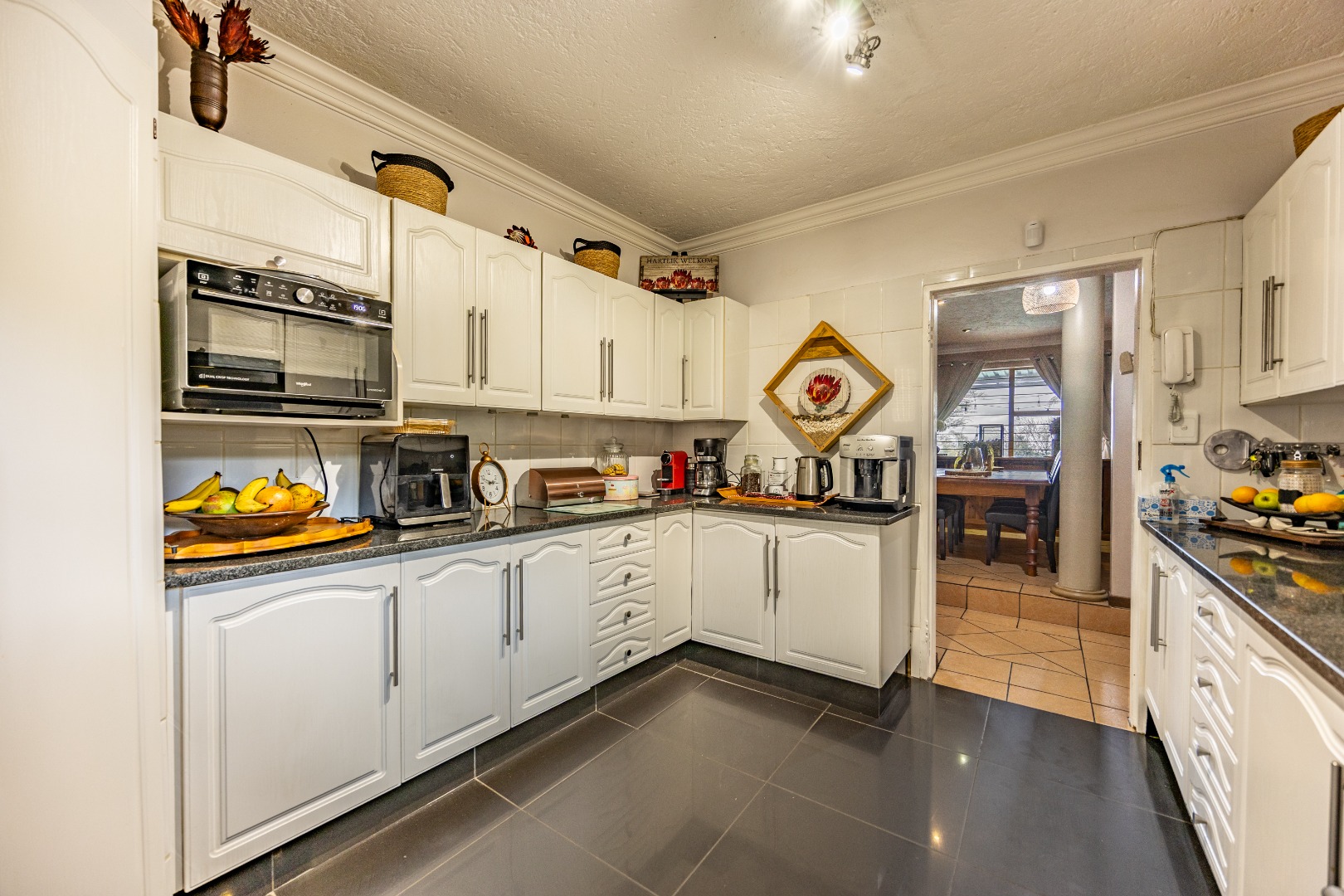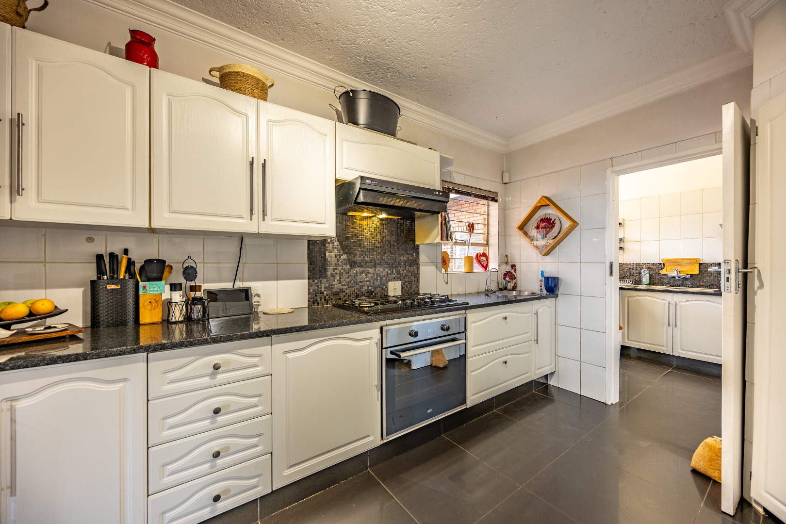 Inside, the home invites connection and effortless entertaining. Multiple open-plan living areas flow beautifully from the formal lounge with its inviting built-in fireplace to the TV lounge and dining room, all leading out to a generous covered patio with a built-in braai. Here, entertaining becomes second nature with friends gathered on the patio, the heated spill-over pool shimmering nearby, and conversations continuing around the outdoor firepit as the evening settles in. The kitchen sits at the heart of the home with a gas hobs, walk-in pantry, and separate scullery, creating a practical yet welcoming space where family life and entertaining come together naturally.