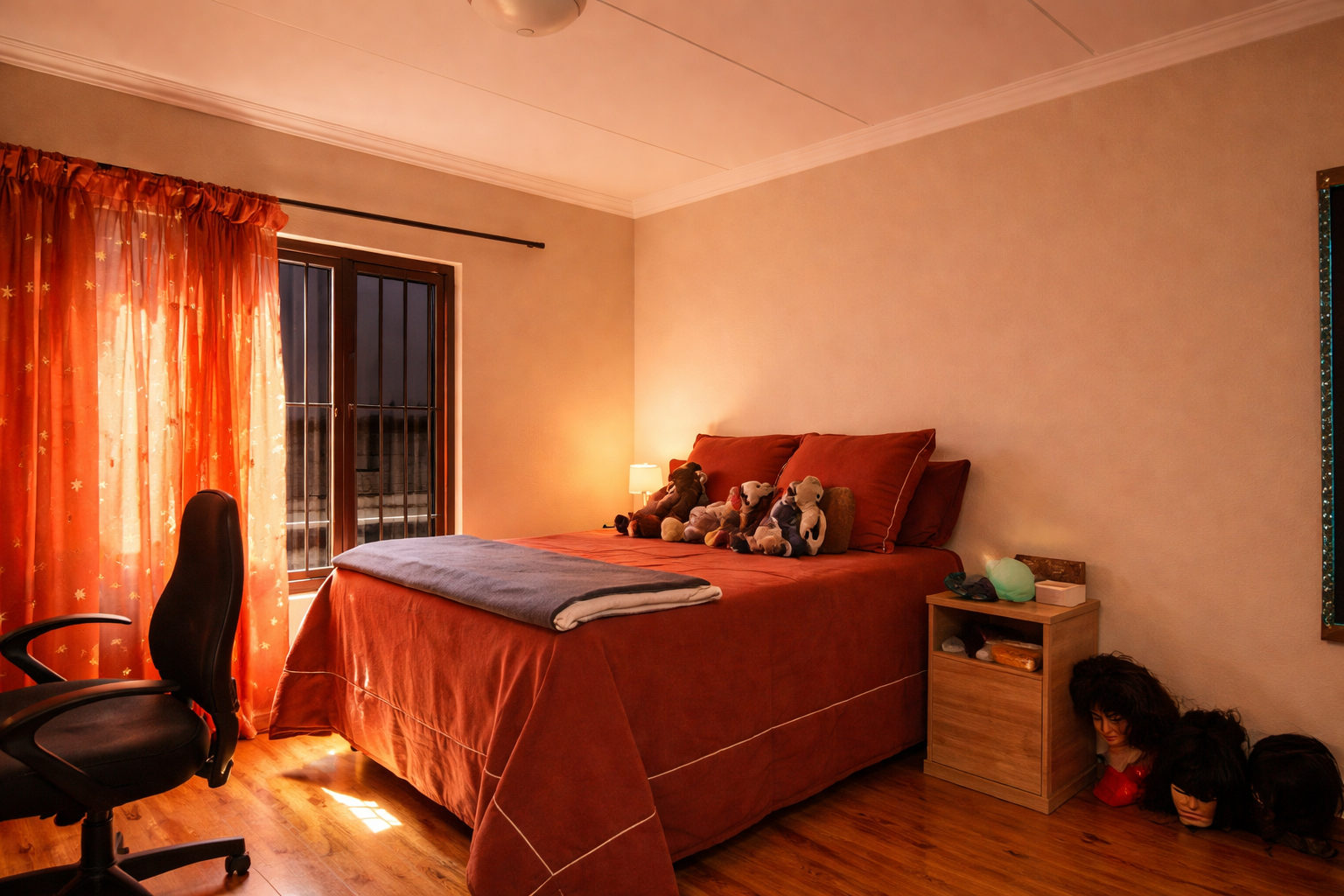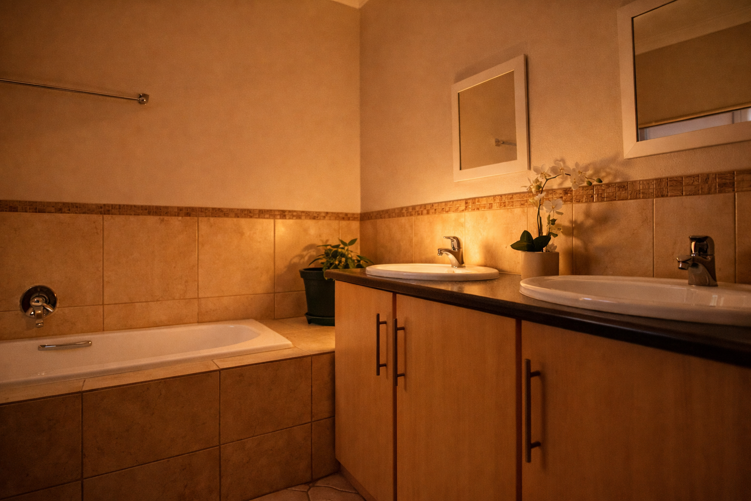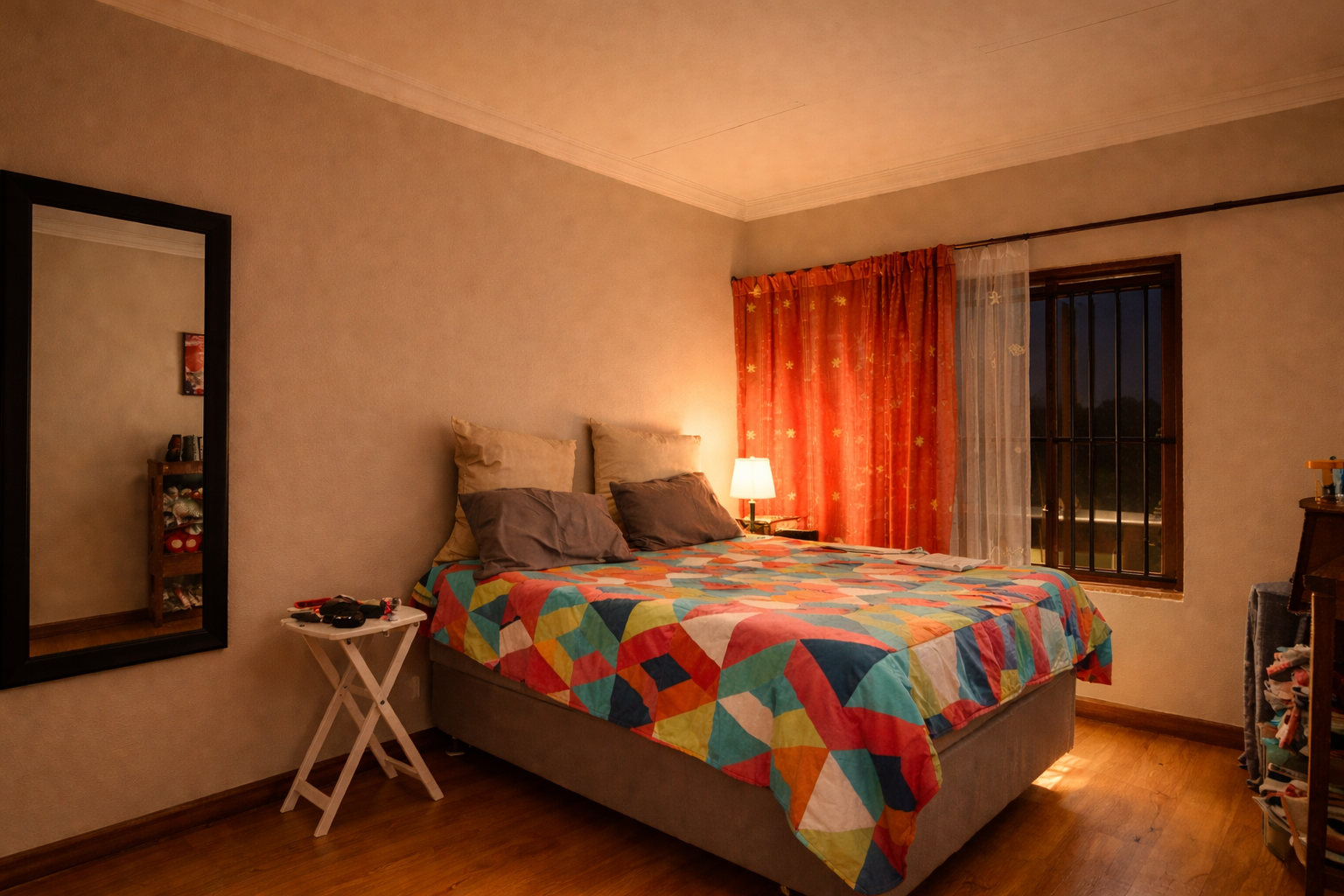 Upstairs, a comfortable pyjama lounge leads to two more bedrooms—both with laminated flooring and built-in cupboards. The main bedroom is generously sized, offering plenty of cupboard space and a full en-suite bathroom featuring a double basin, shower, bath, and toilet.