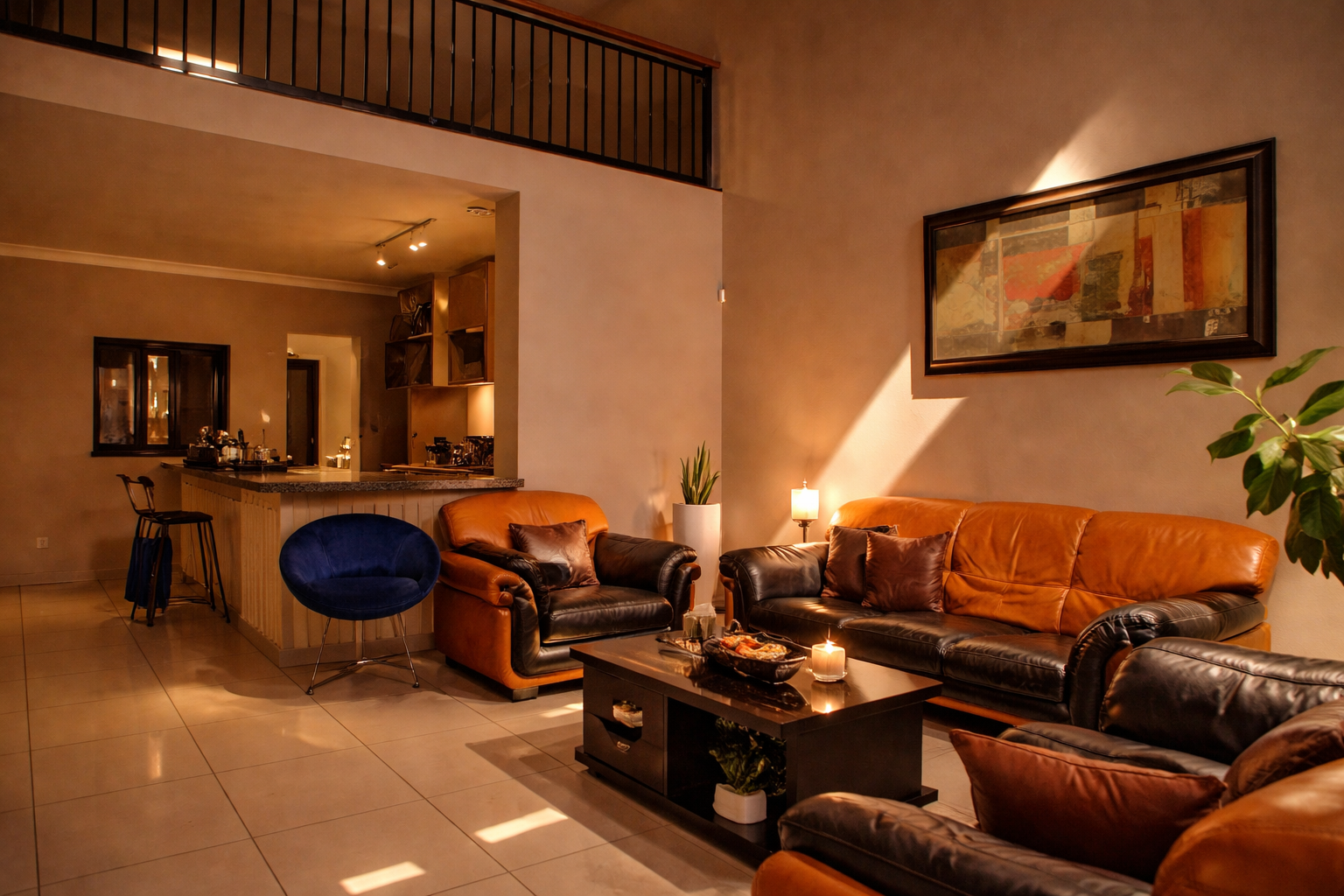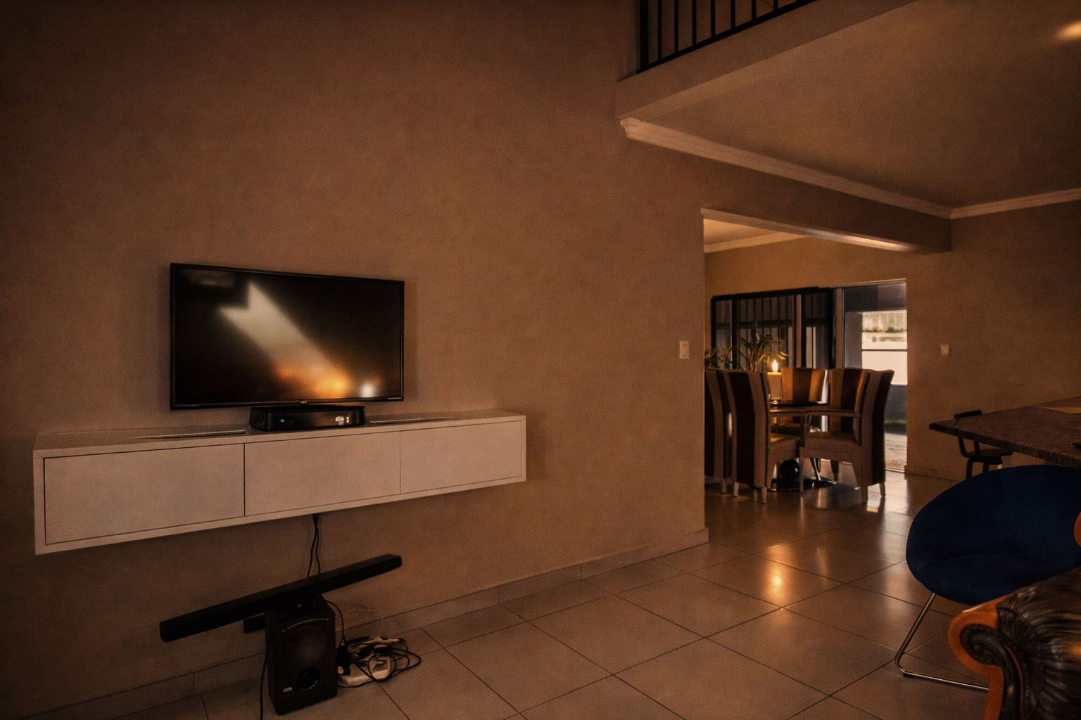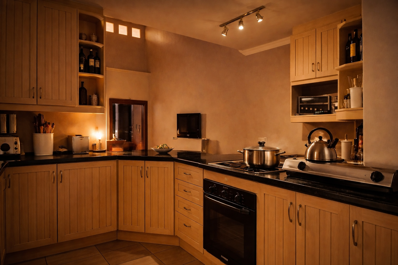 Inside, the open-plan kitchen flows to the dining area and out to the garden via sliding doors. There's a separate scullery with space for appliances, a welcoming TV lounge, and a ground-floor bedroom with built-in cupboards, serviced by a full bathroom with shower, basin, and toilet. Domestic quarters with their own shower and toilet can be accessed from both inside the garage and outside.