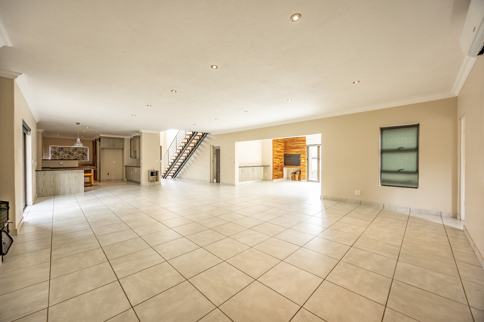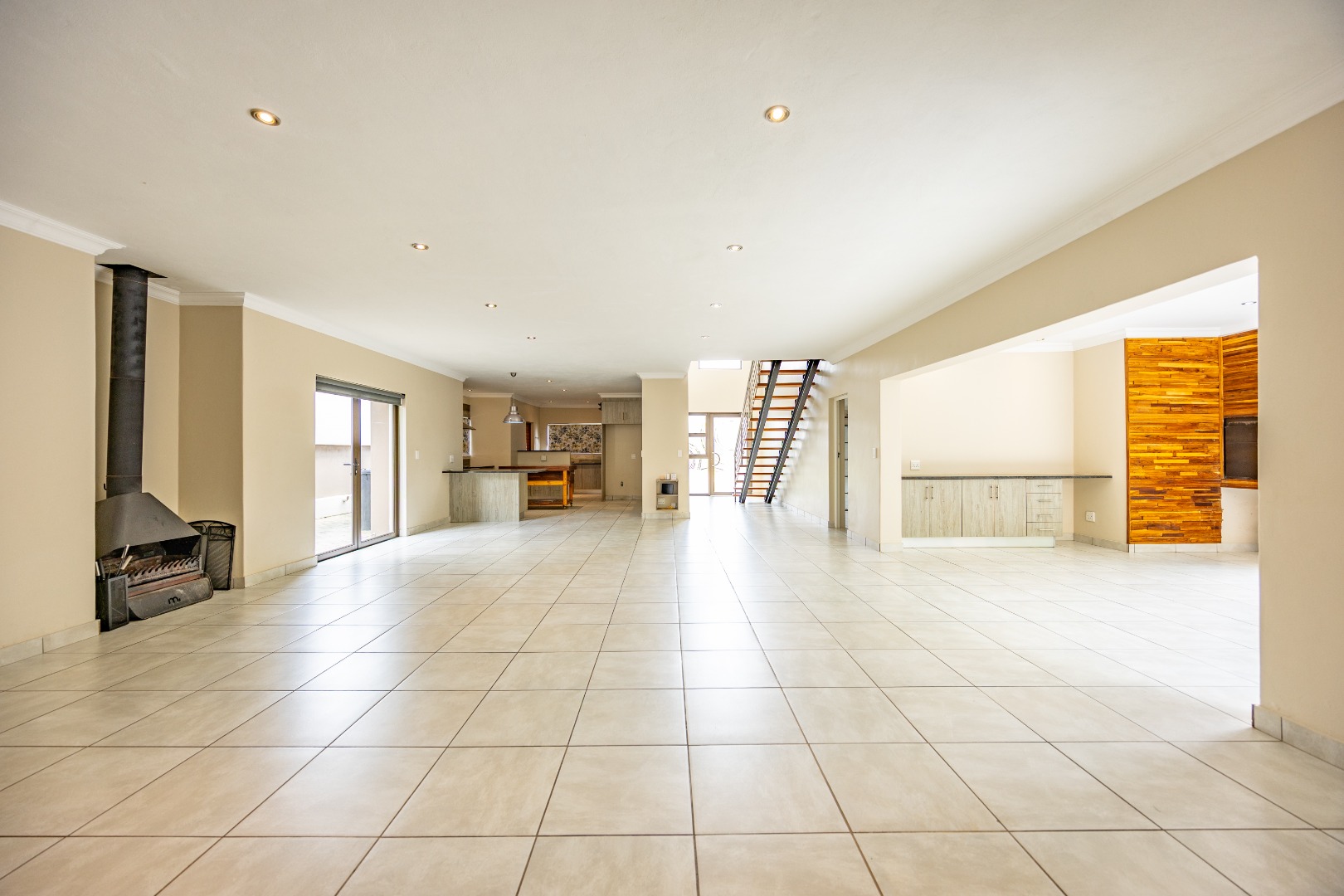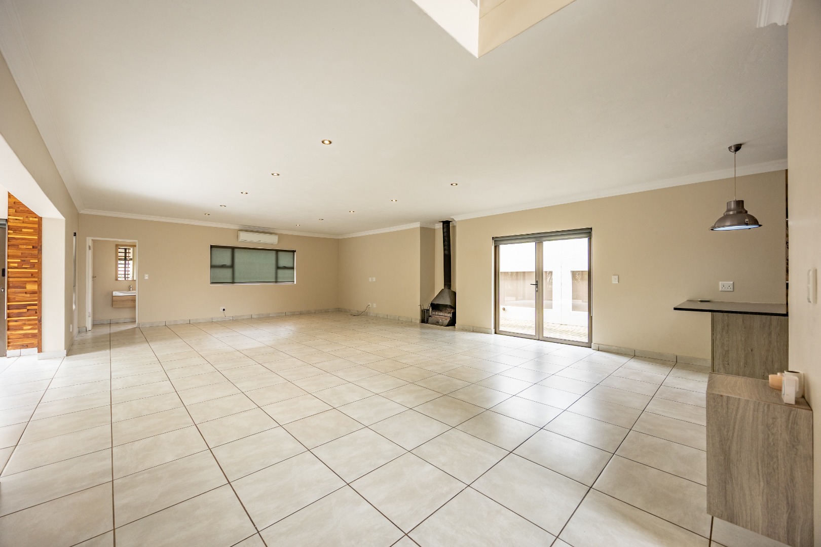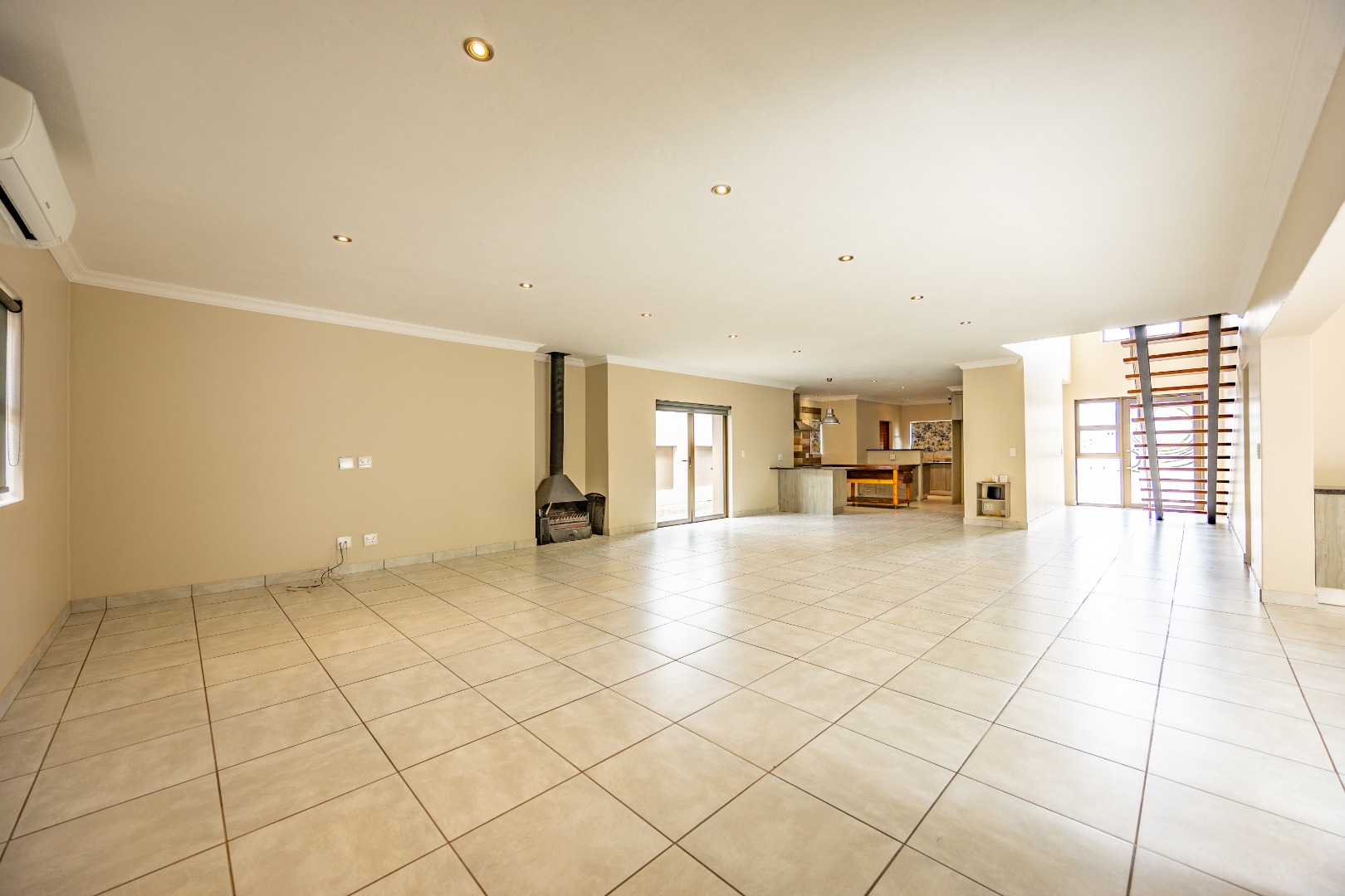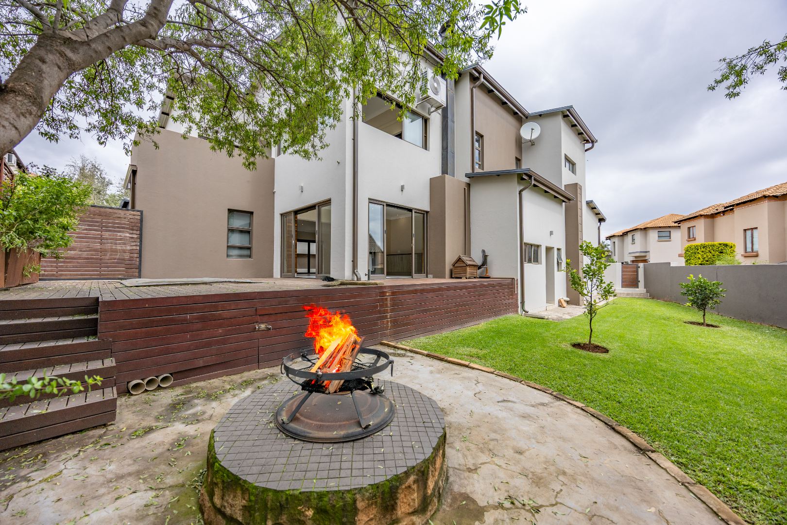 The ground floor showcases a stunning open-plan kitchen with granite countertops, breakfast nook, walk-in pantry and laundry facilities. The expansive dining and lounge area features a cozy fireplace, air conditioning and guest bathroom. The home flows effortlessly to an entertainment area with built-in braai, opening to a sunny patio with jacuzzi, all set within a spacious, private garden perfect for outdoor living.