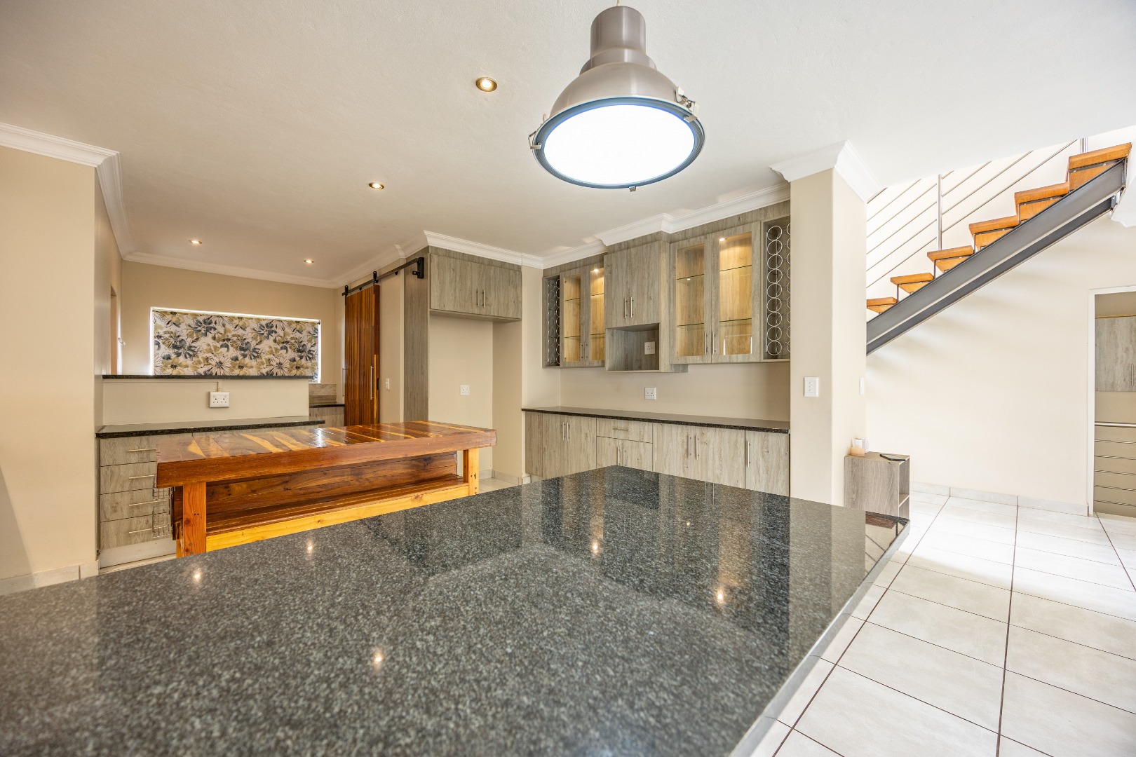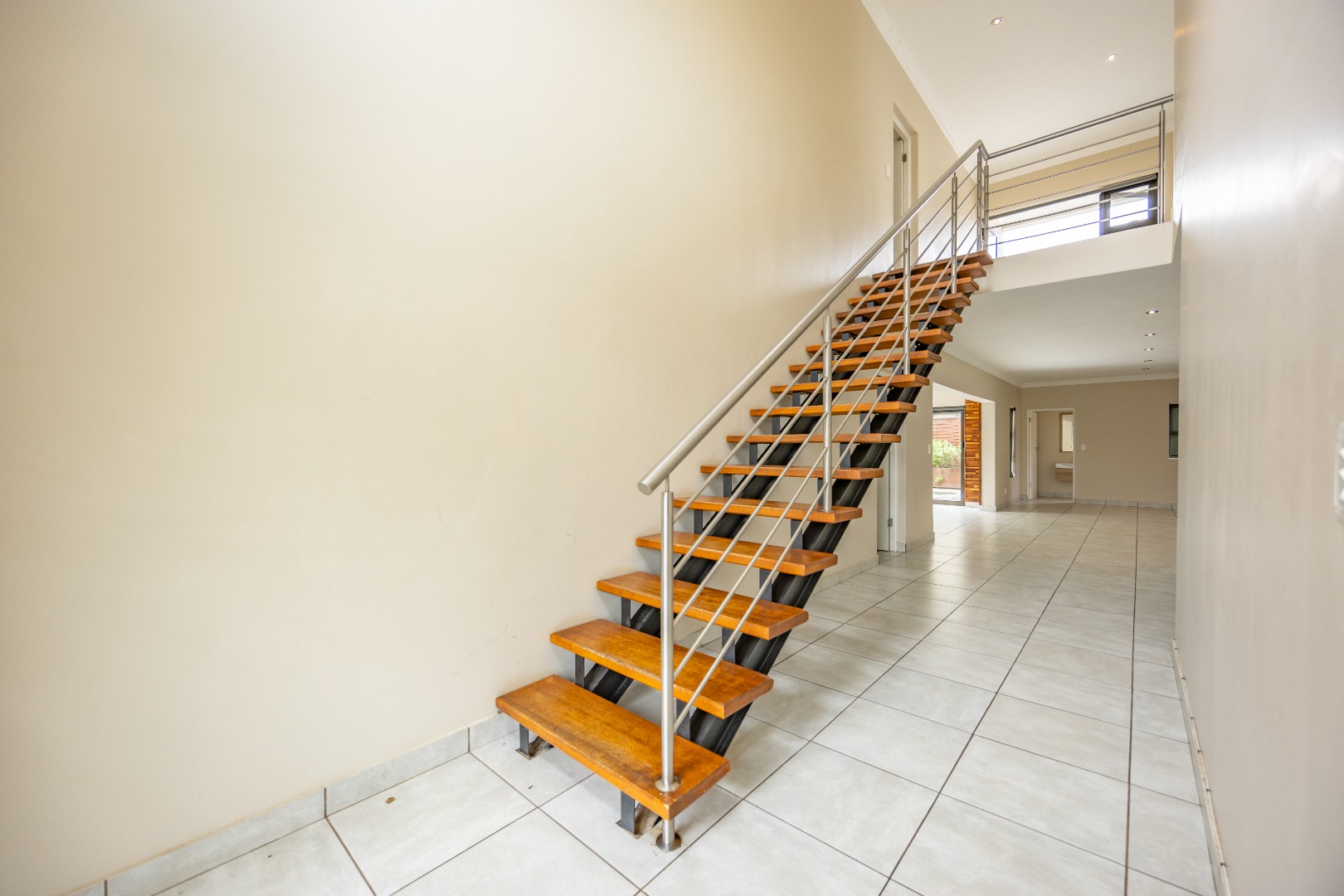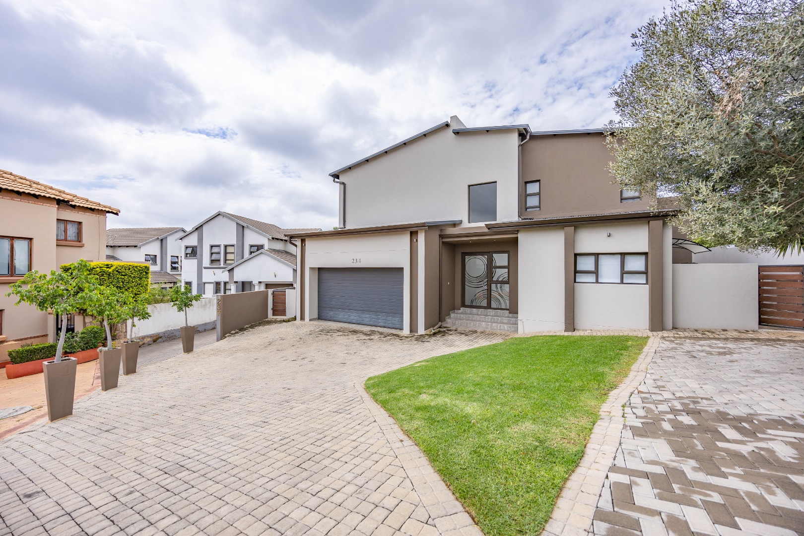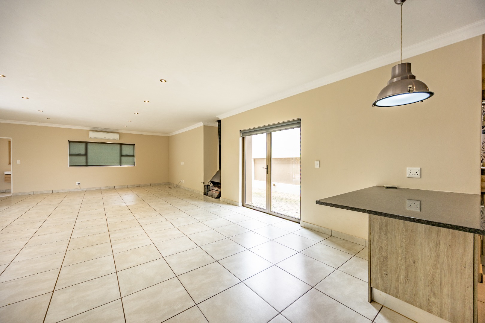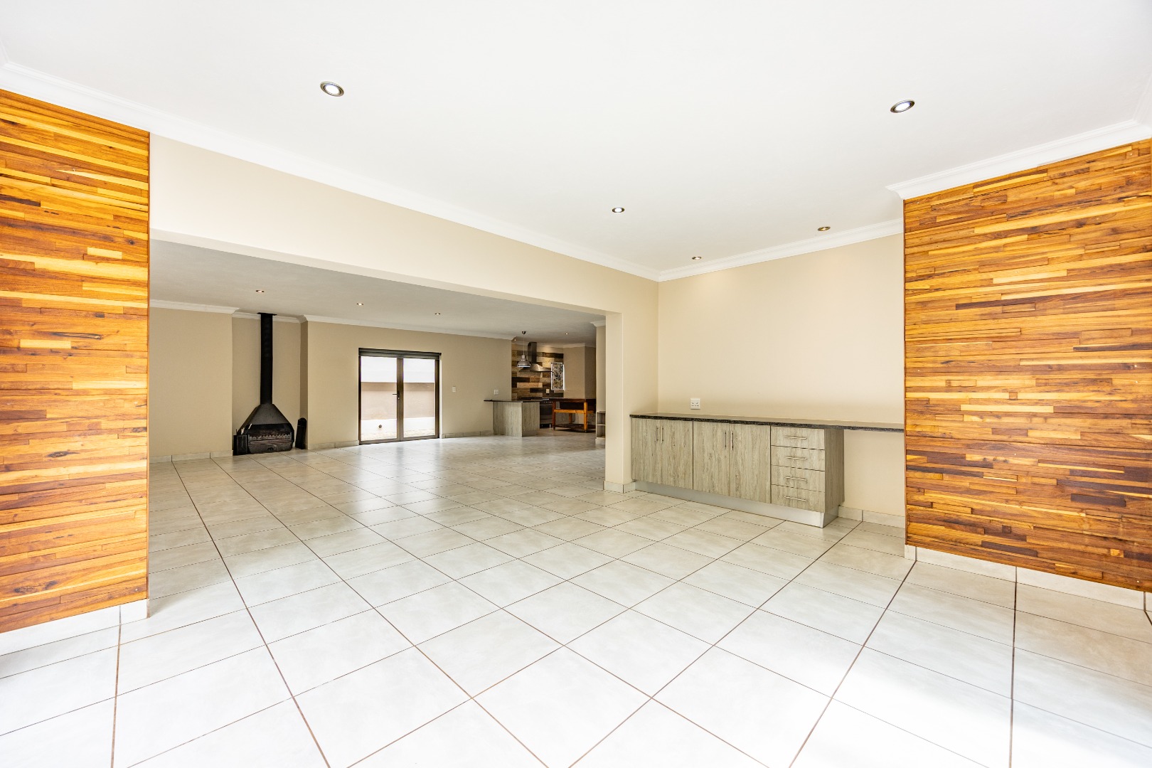 The ground floor showcases a stunning open-plan kitchen with granite countertops, breakfast nook, walk-in pantry and laundry facilities. The expansive dining and lounge area features a cozy fireplace, air conditioning and guest bathroom. The home flows effortlessly to an entertainment area with built-in braai, opening to a sunny patio with jacuzzi, all set within a spacious, private garden perfect for outdoor living.