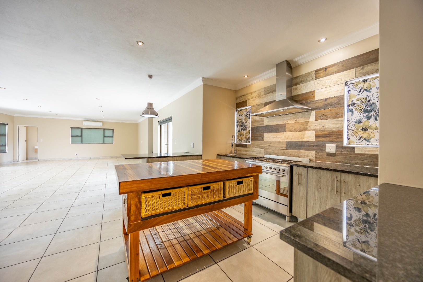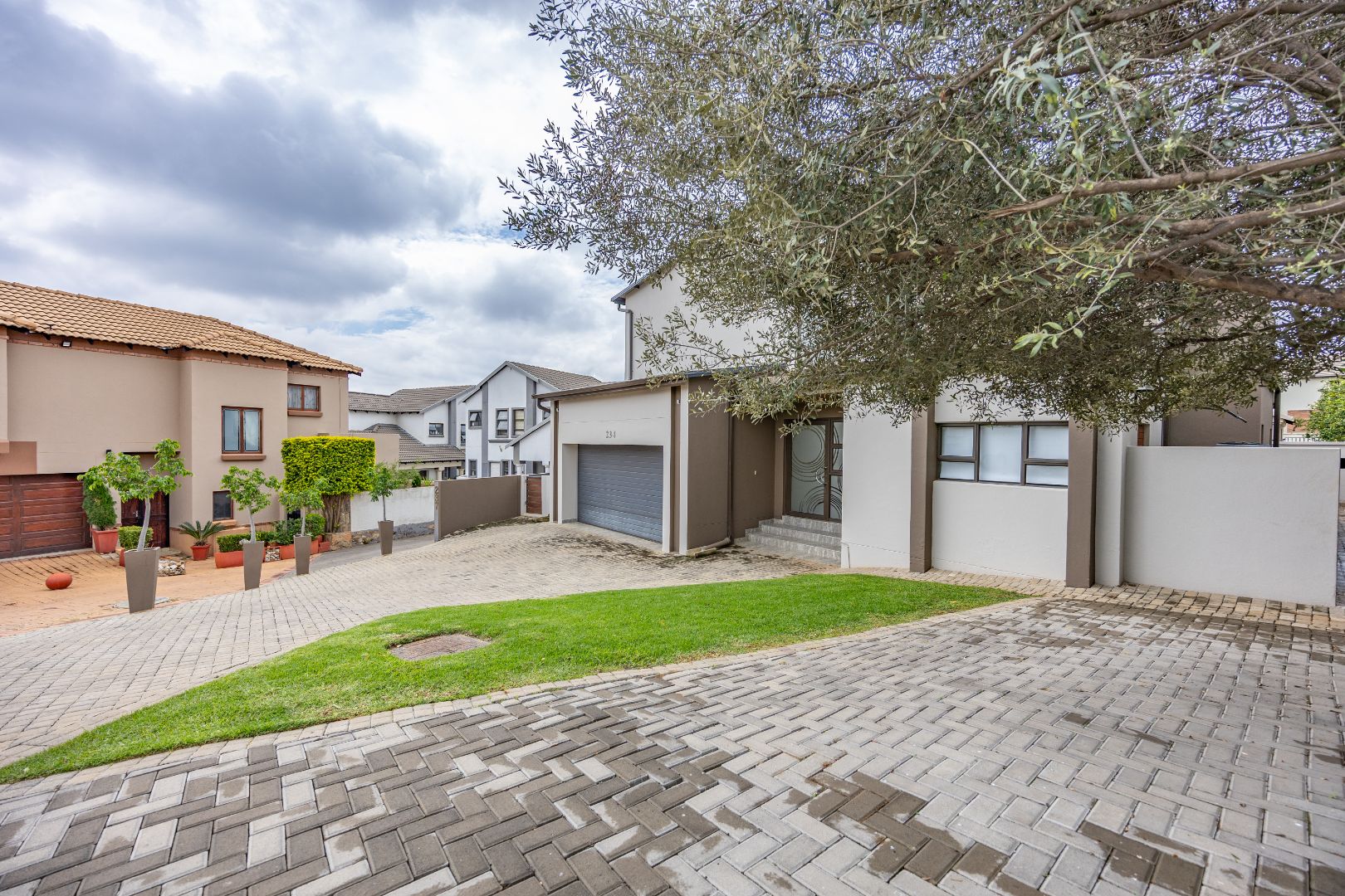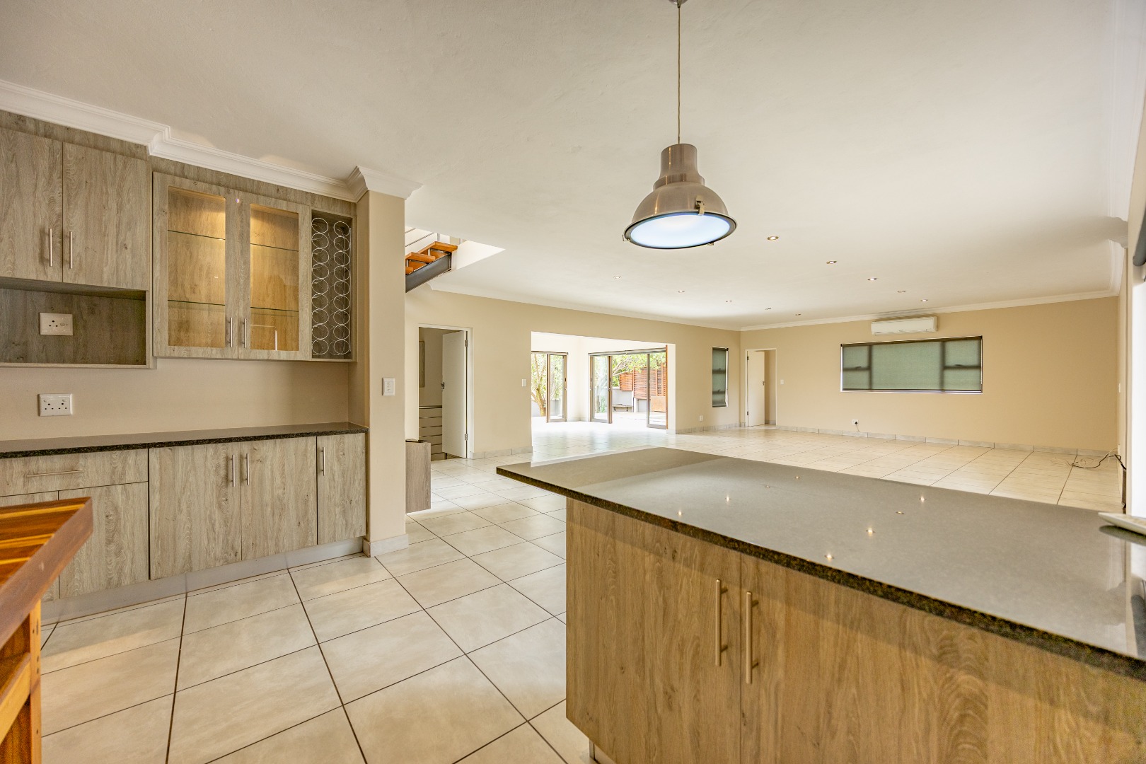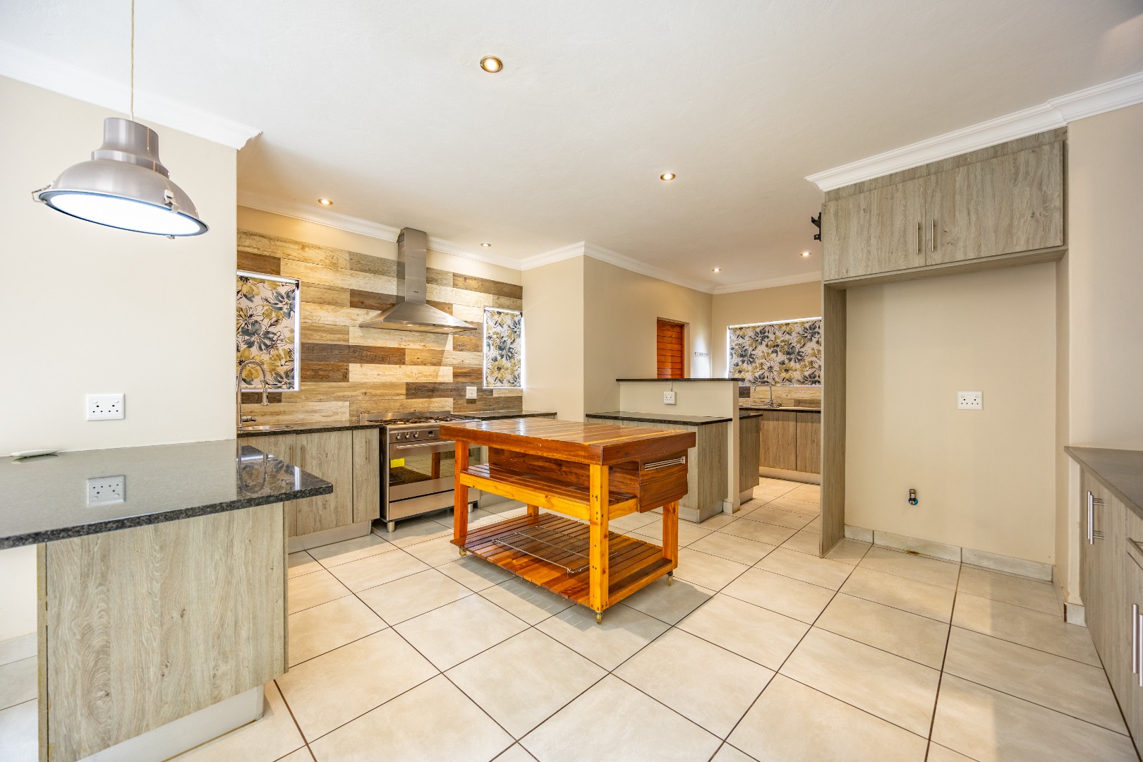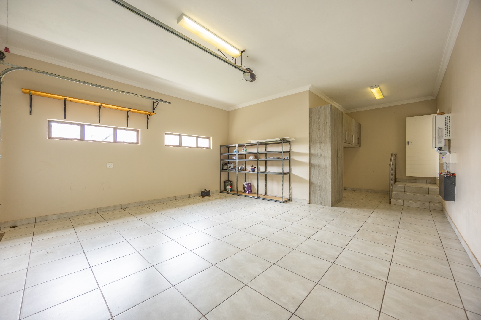 The ground floor showcases a stunning open-plan kitchen with granite countertops, breakfast nook, walk-in pantry and laundry facilities. The expansive dining and lounge area features a cozy fireplace, air conditioning and guest bathroom. The home flows effortlessly to an entertainment area with built-in braai, opening to a sunny patio with jacuzzi, all set within a spacious, private garden perfect for outdoor living.
