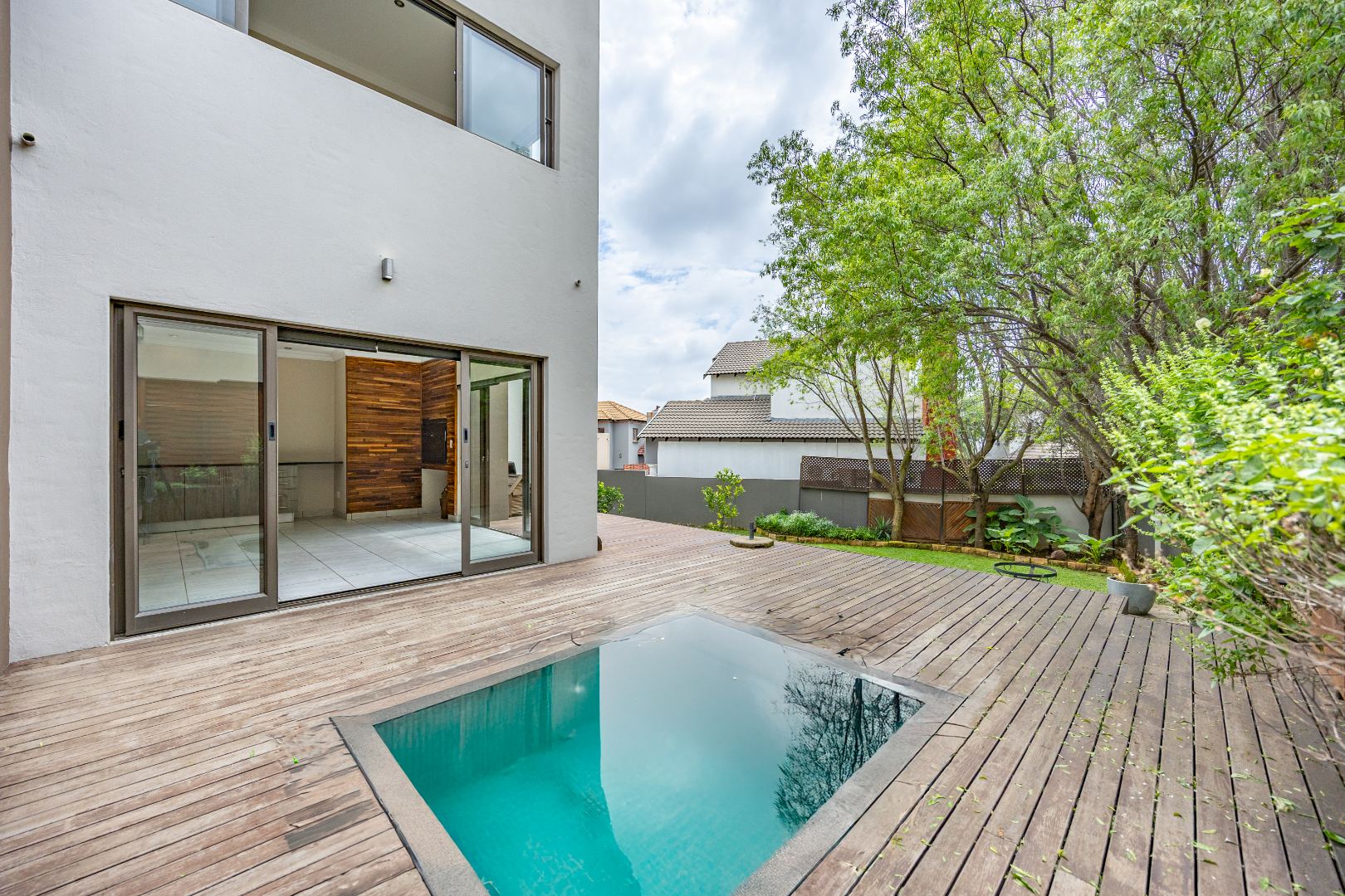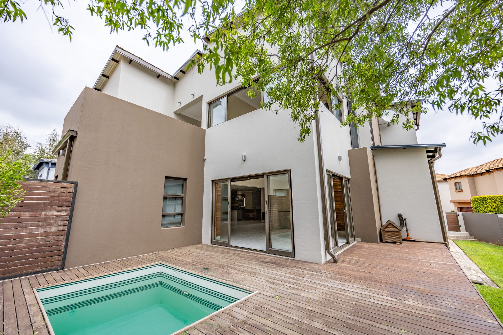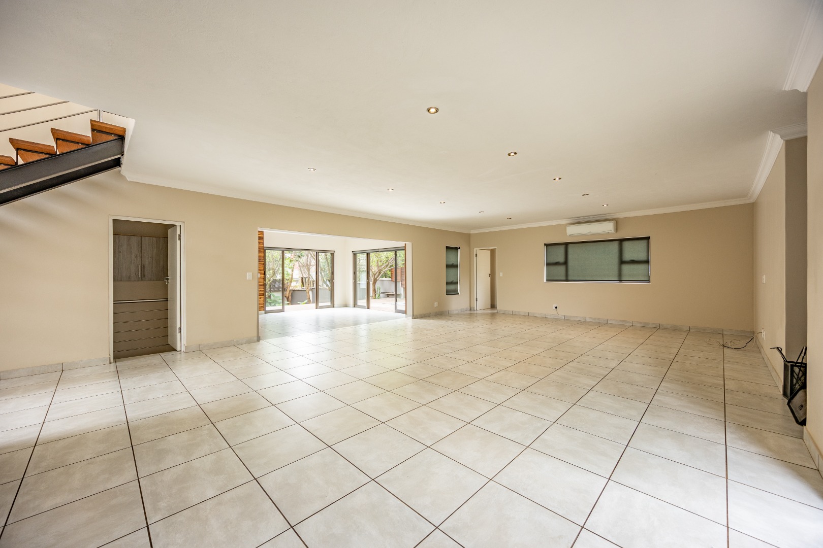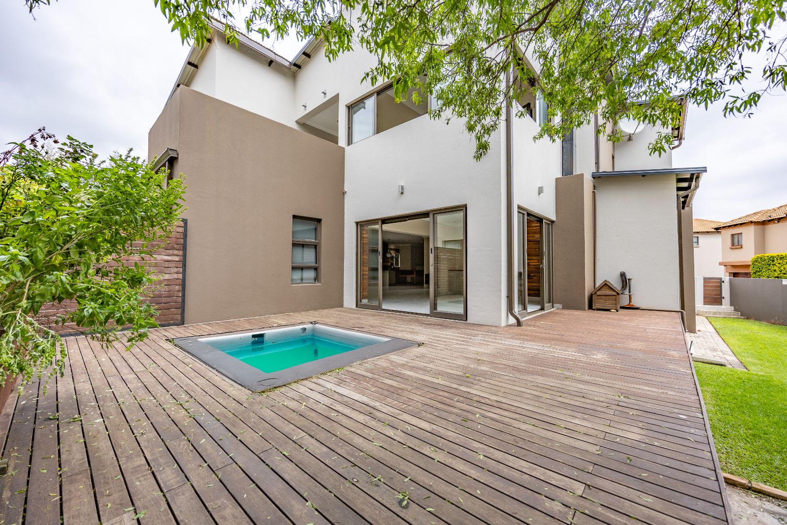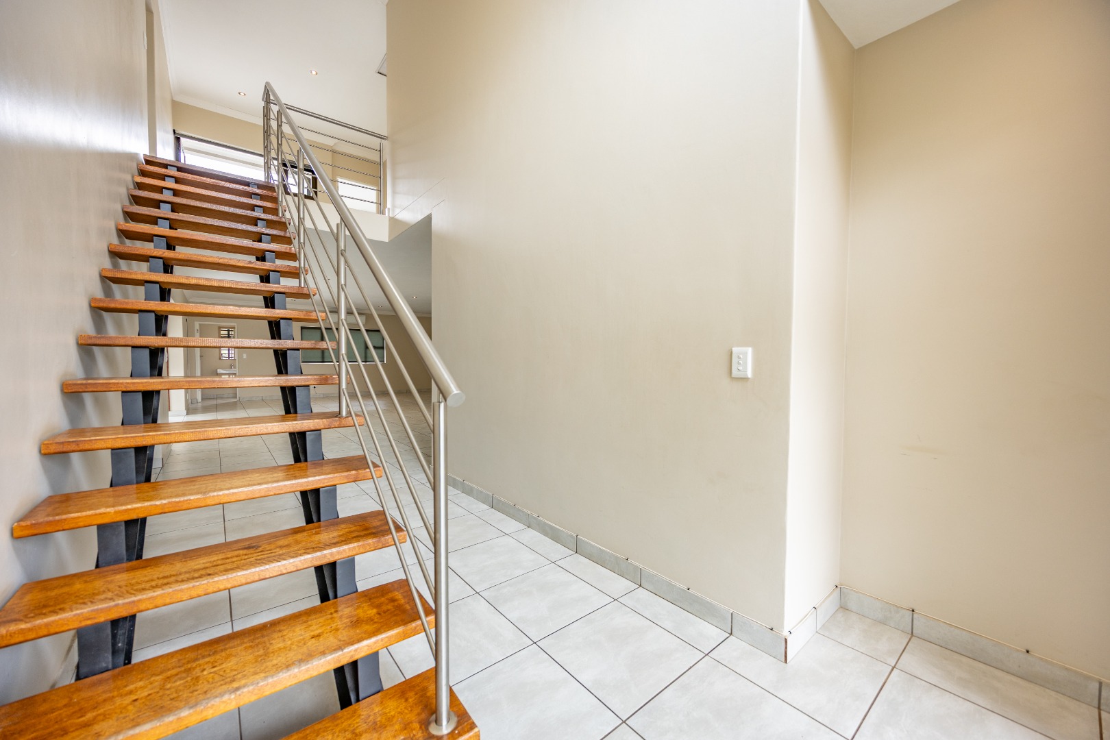 The ground floor showcases a stunning open-plan kitchen with granite countertops, breakfast nook, walk-in pantry and laundry facilities. The expansive dining and lounge area features a cozy fireplace, air conditioning and guest bathroom. The home flows effortlessly to an entertainment area with built-in braai, opening to a sunny patio with jacuzzi, all set within a spacious, private garden perfect for outdoor living.