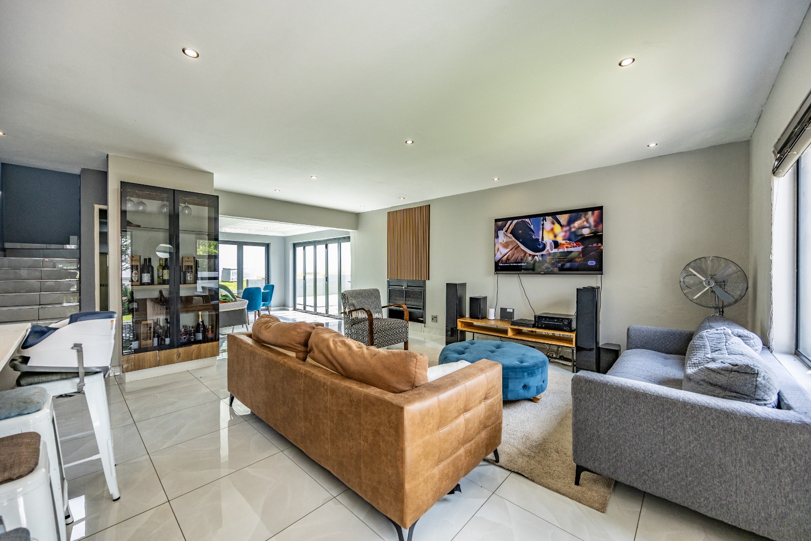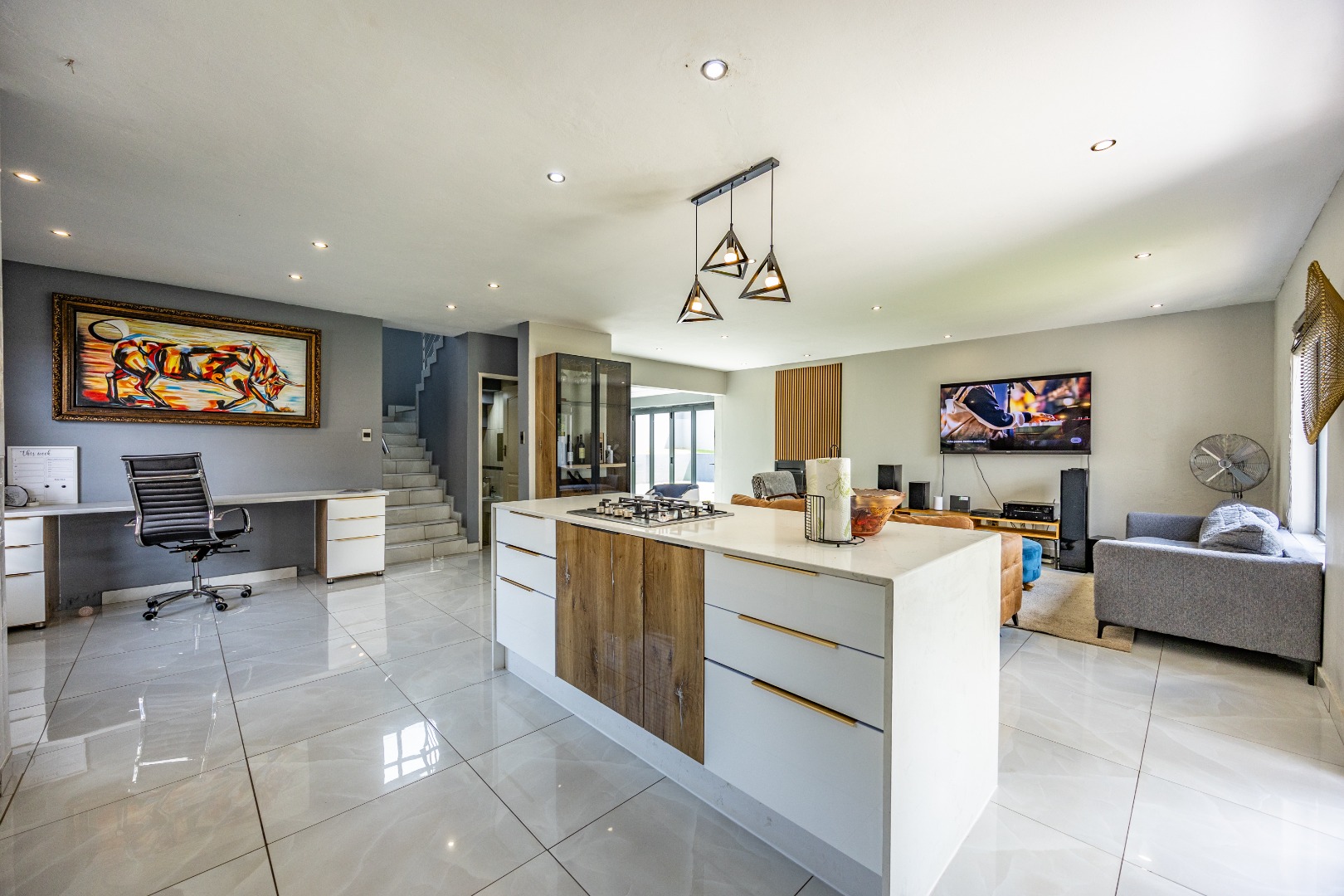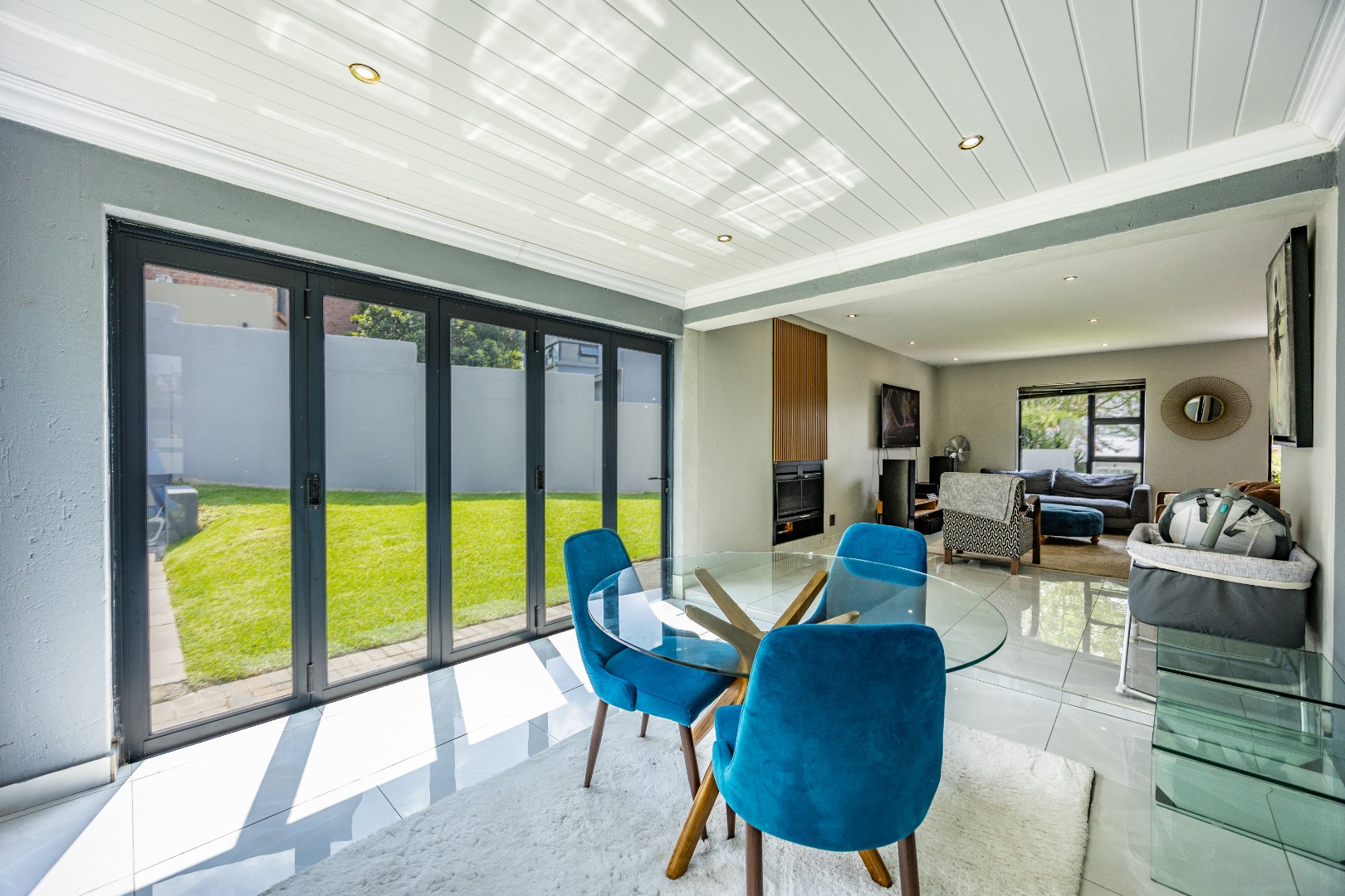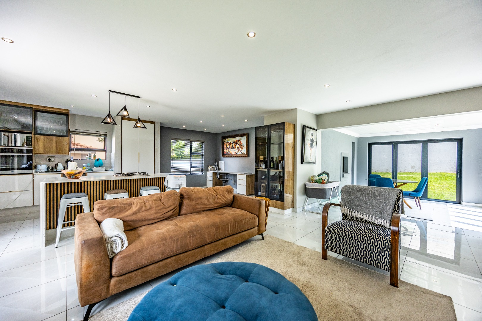 This refined three-bedroom residence delivers modern estate living in one of the most sought-after pockets of Olympus AH, where design, flow, and lifestyle come together effortlessly. From the moment you step through the front door, the home makes a statement. To the right, the main lounge is anchored by a fireplace, setting the tone for warm, inviting living. The space extends seamlessly into an additional lounge—ideal as a dining area—and opens through aluminium folding doors to the outdoors, creating a strong indoor-outdoor connection filled with natural light.