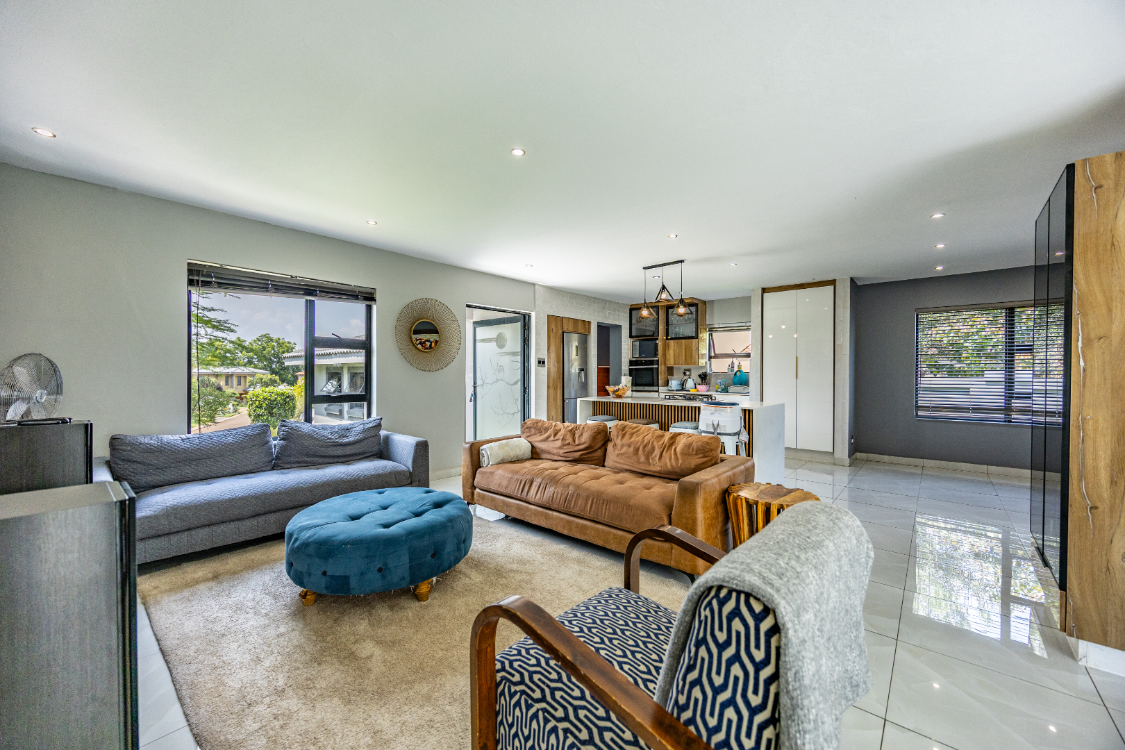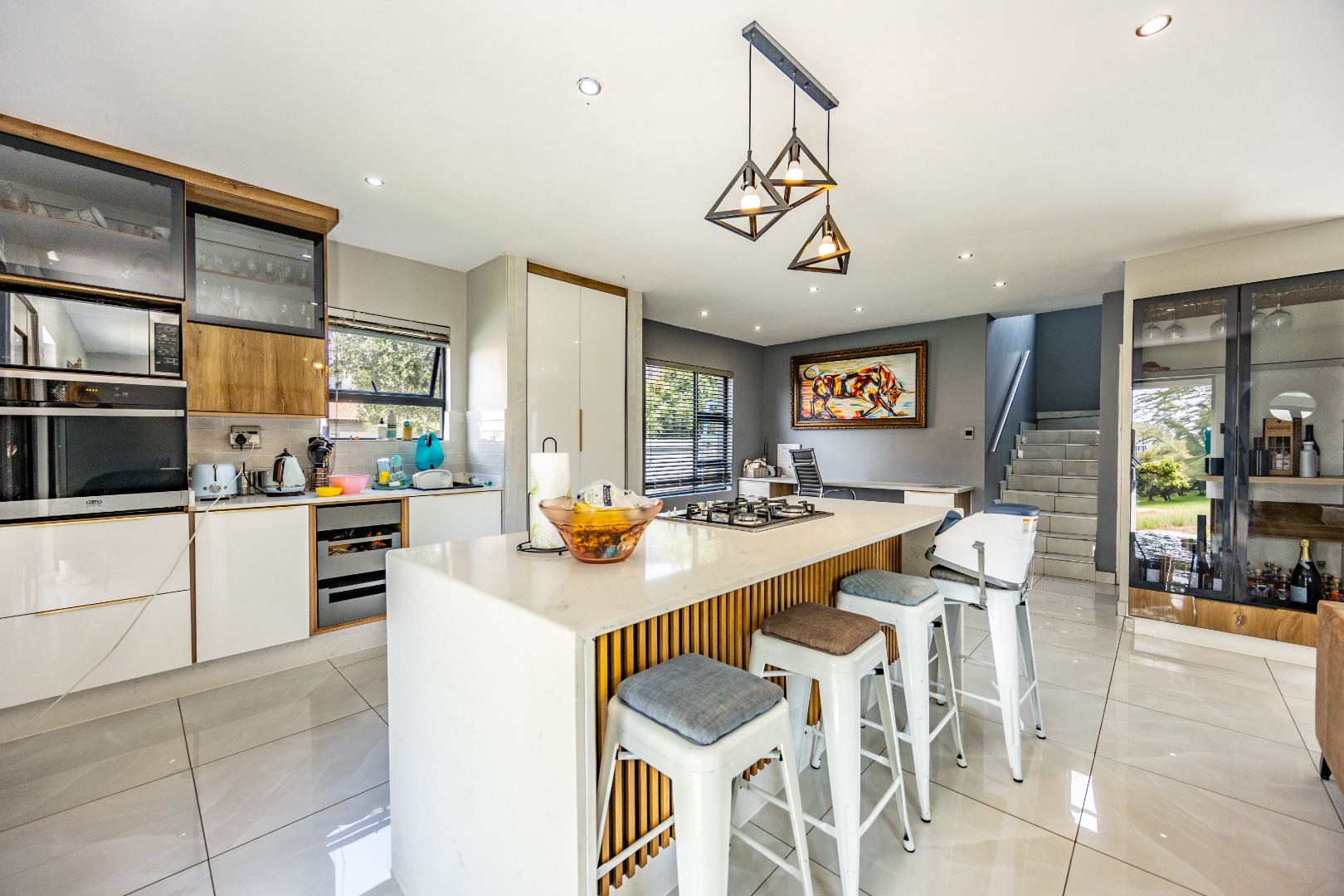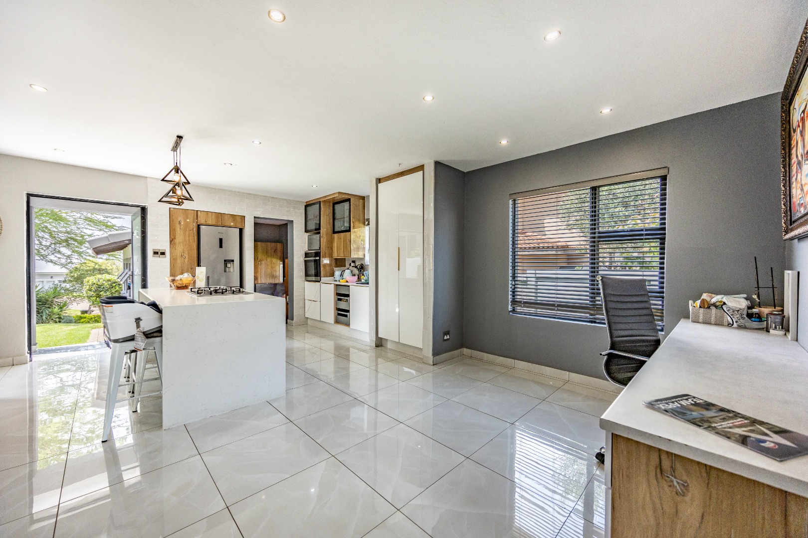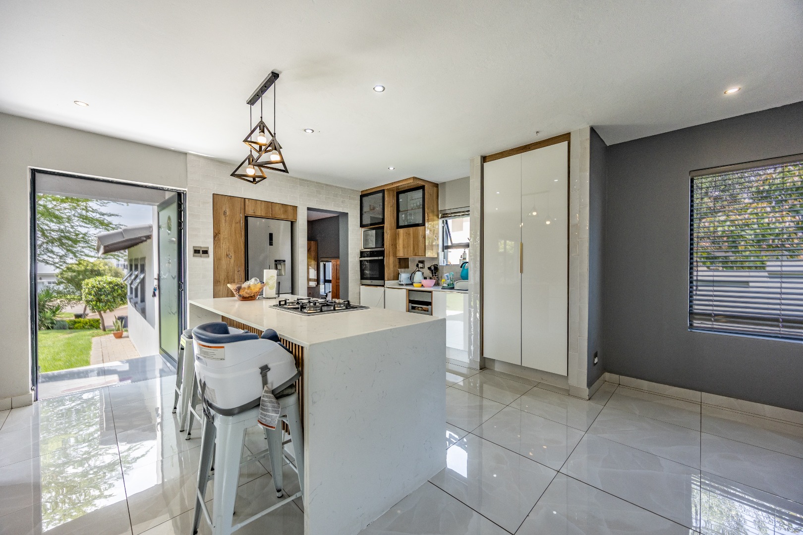 This refined three-bedroom residence delivers modern estate living in one of the most sought-after pockets of Olympus AH, where design, flow, and lifestyle come together effortlessly. From the moment you step through the front door, the home makes a statement. To the right, the main lounge is anchored by a fireplace, setting the tone for warm, inviting living. The space extends seamlessly into an additional lounge—ideal as a dining area—and opens through aluminium folding doors to the outdoors, creating a strong indoor-outdoor connection filled with natural light.