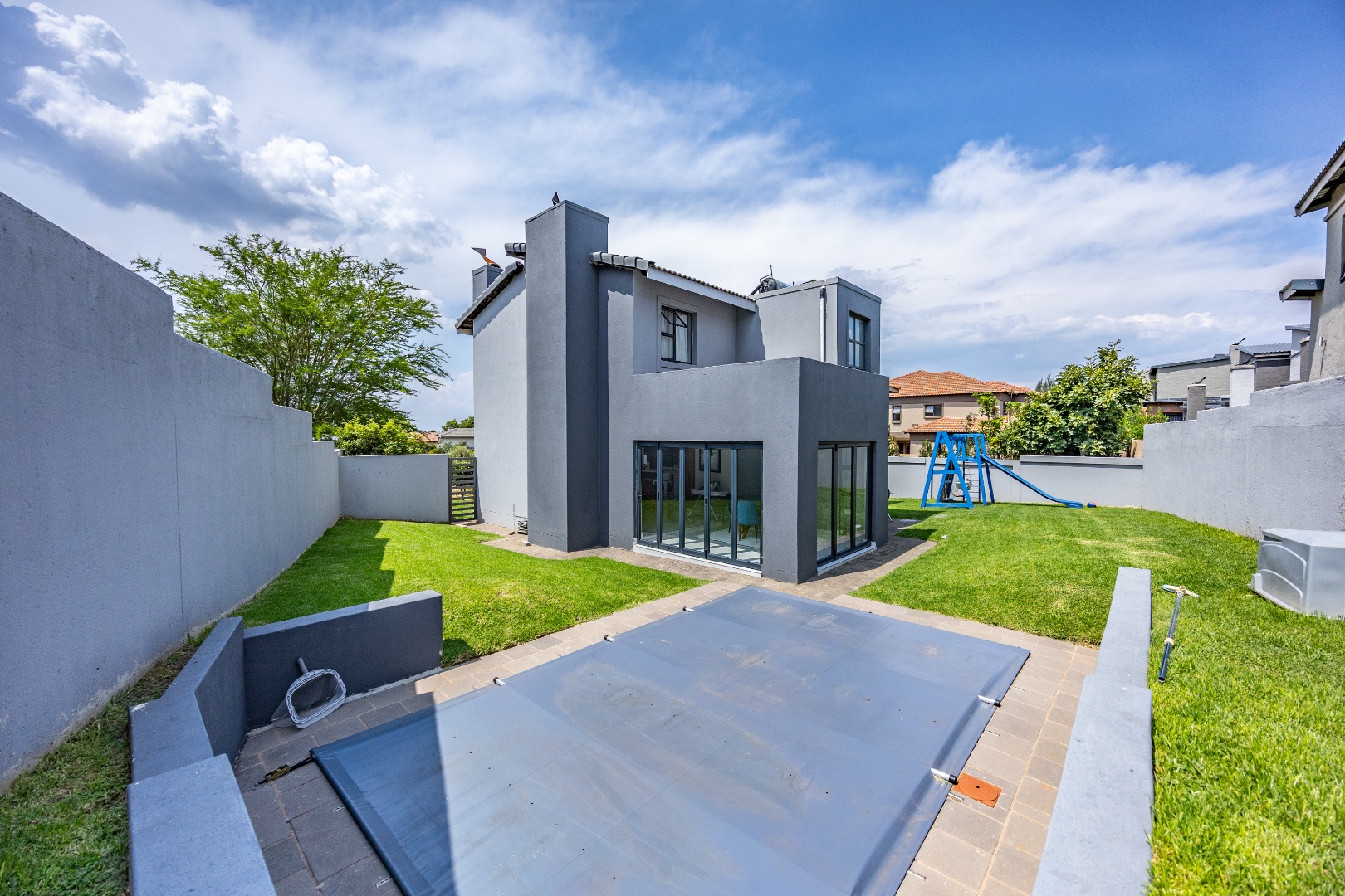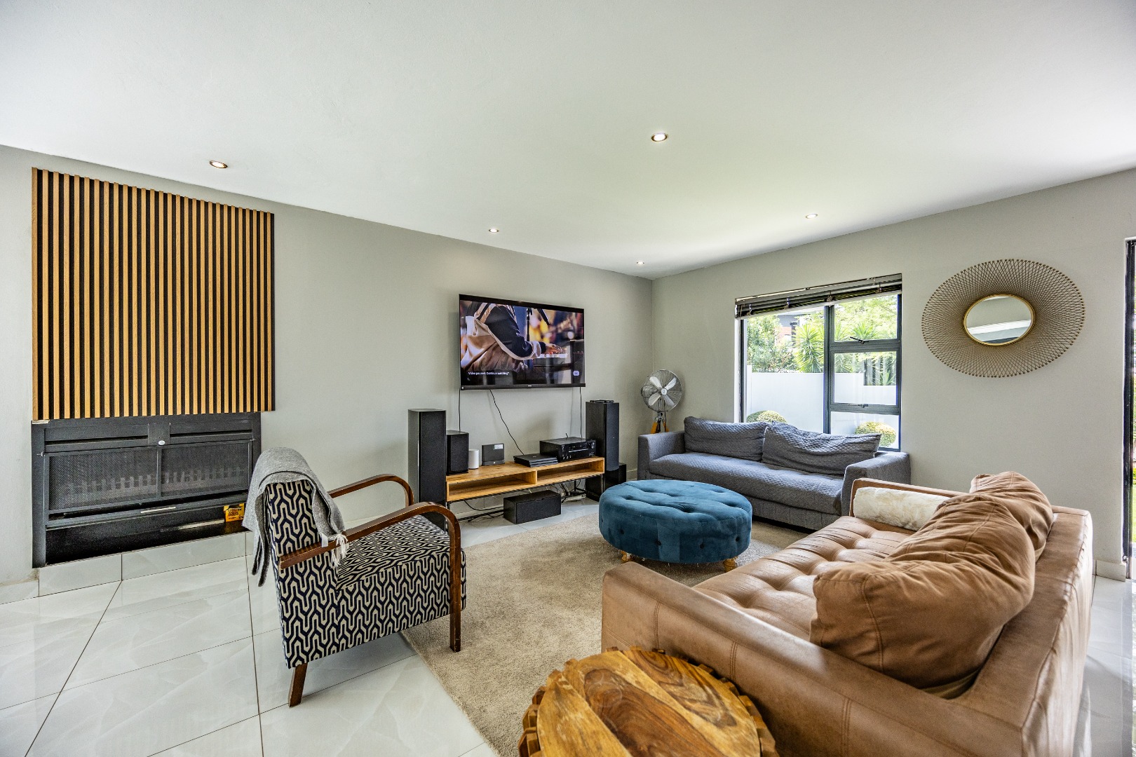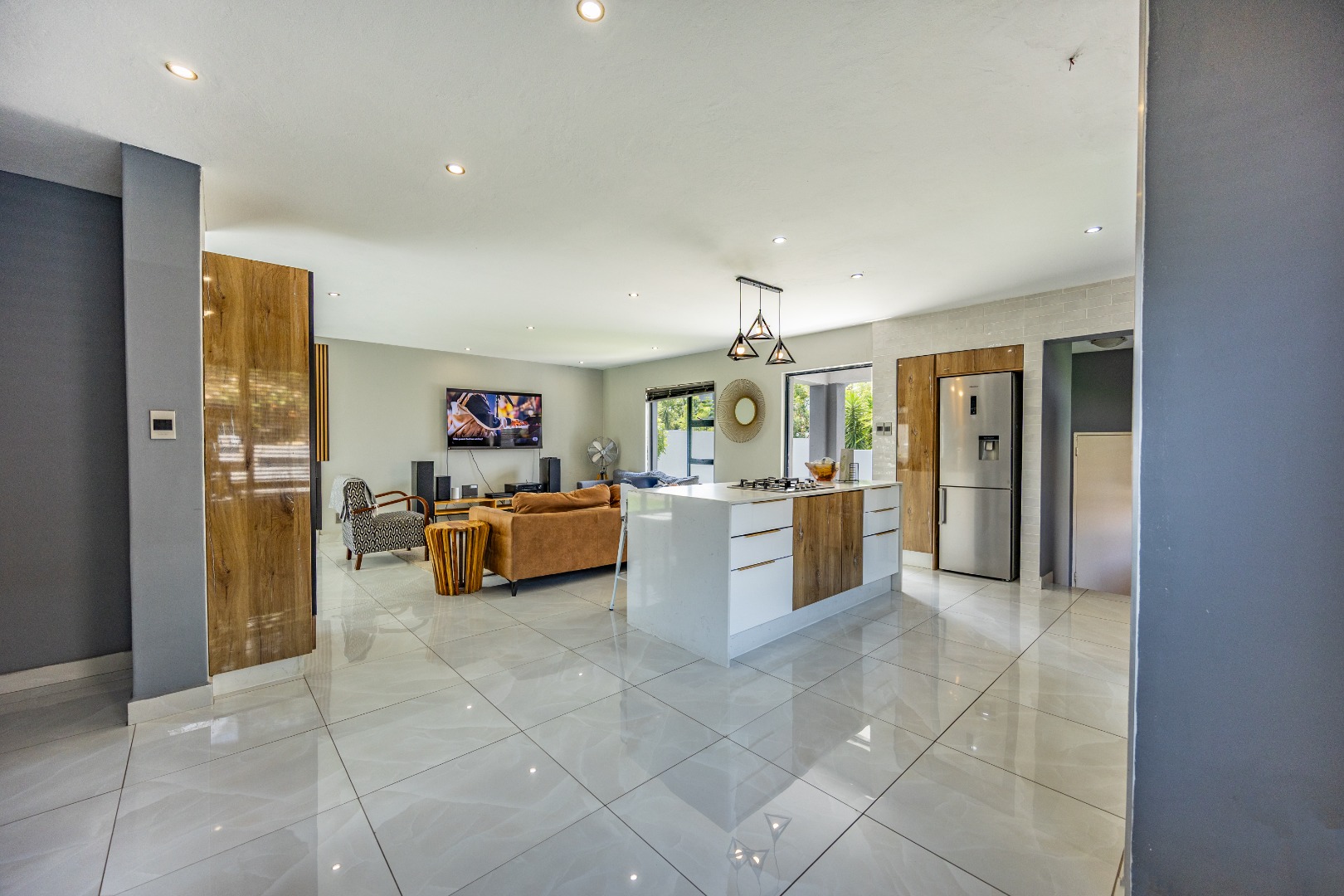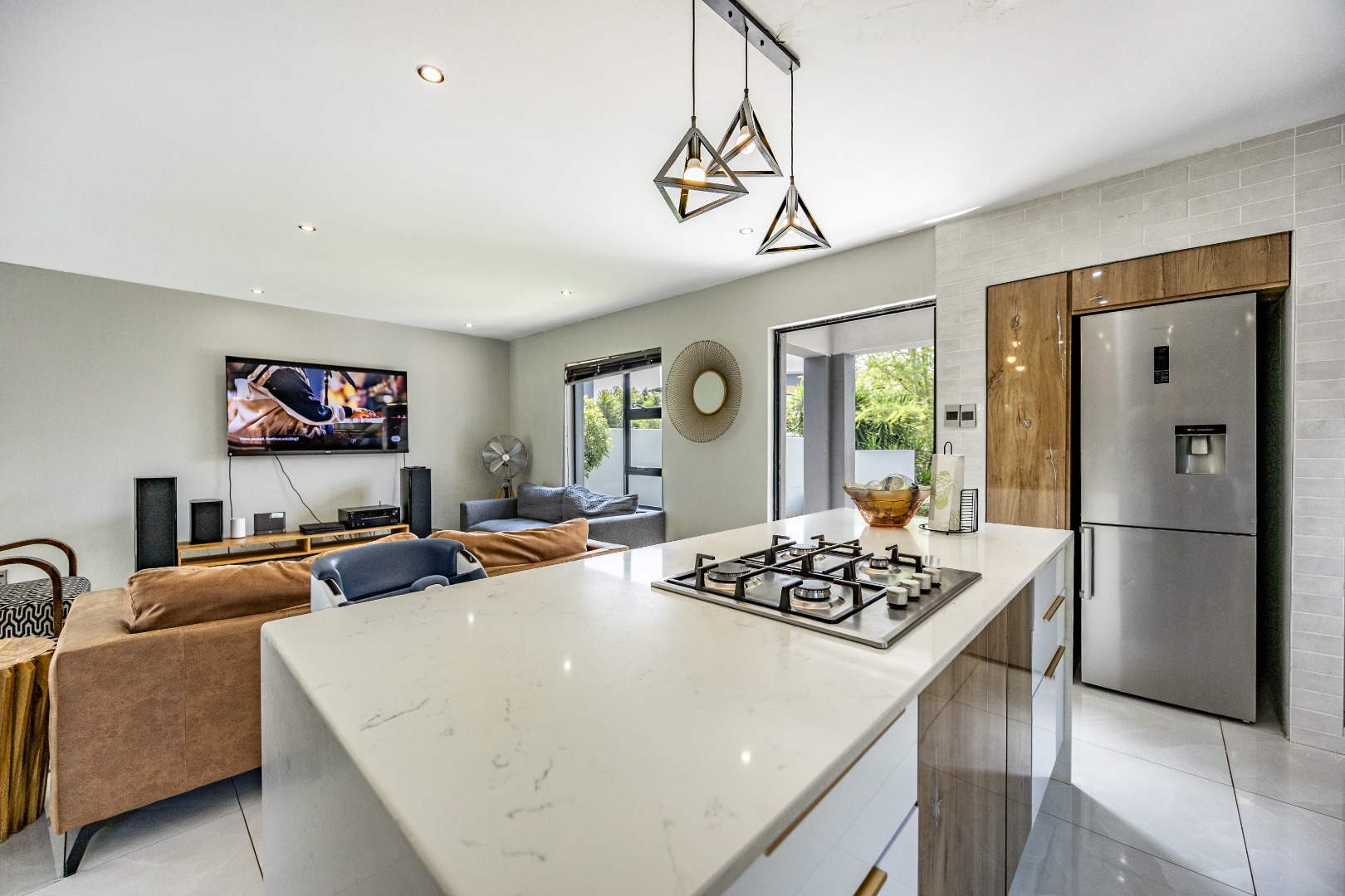 This refined three-bedroom residence delivers modern estate living in one of the most sought-after pockets of Olympus AH, where design, flow, and lifestyle come together effortlessly. From the moment you step through the front door, the home makes a statement. To the right, the main lounge is anchored by a fireplace, setting the tone for warm, inviting living. The space extends seamlessly into an additional lounge—ideal as a dining area—and opens through aluminium folding doors to the outdoors, creating a strong indoor-outdoor connection filled with natural light.
