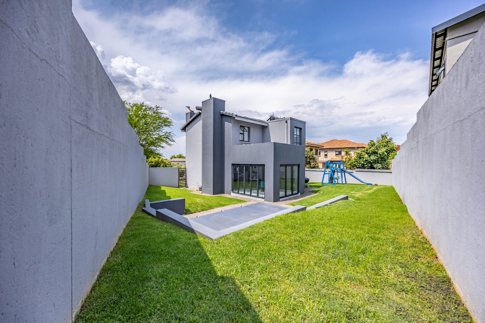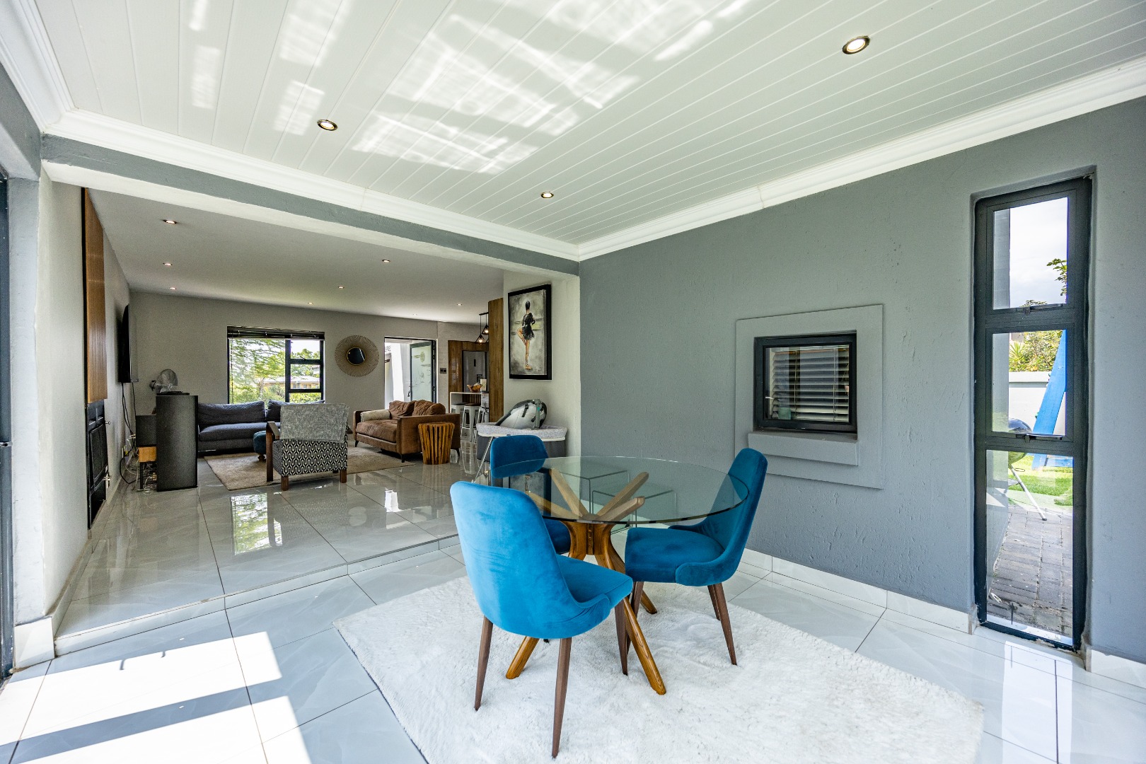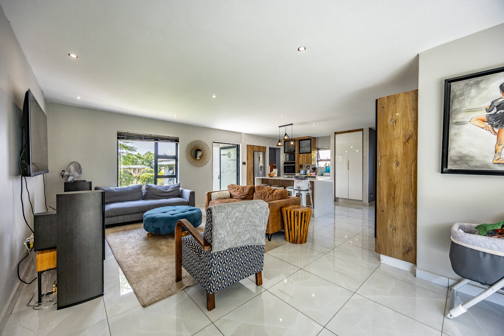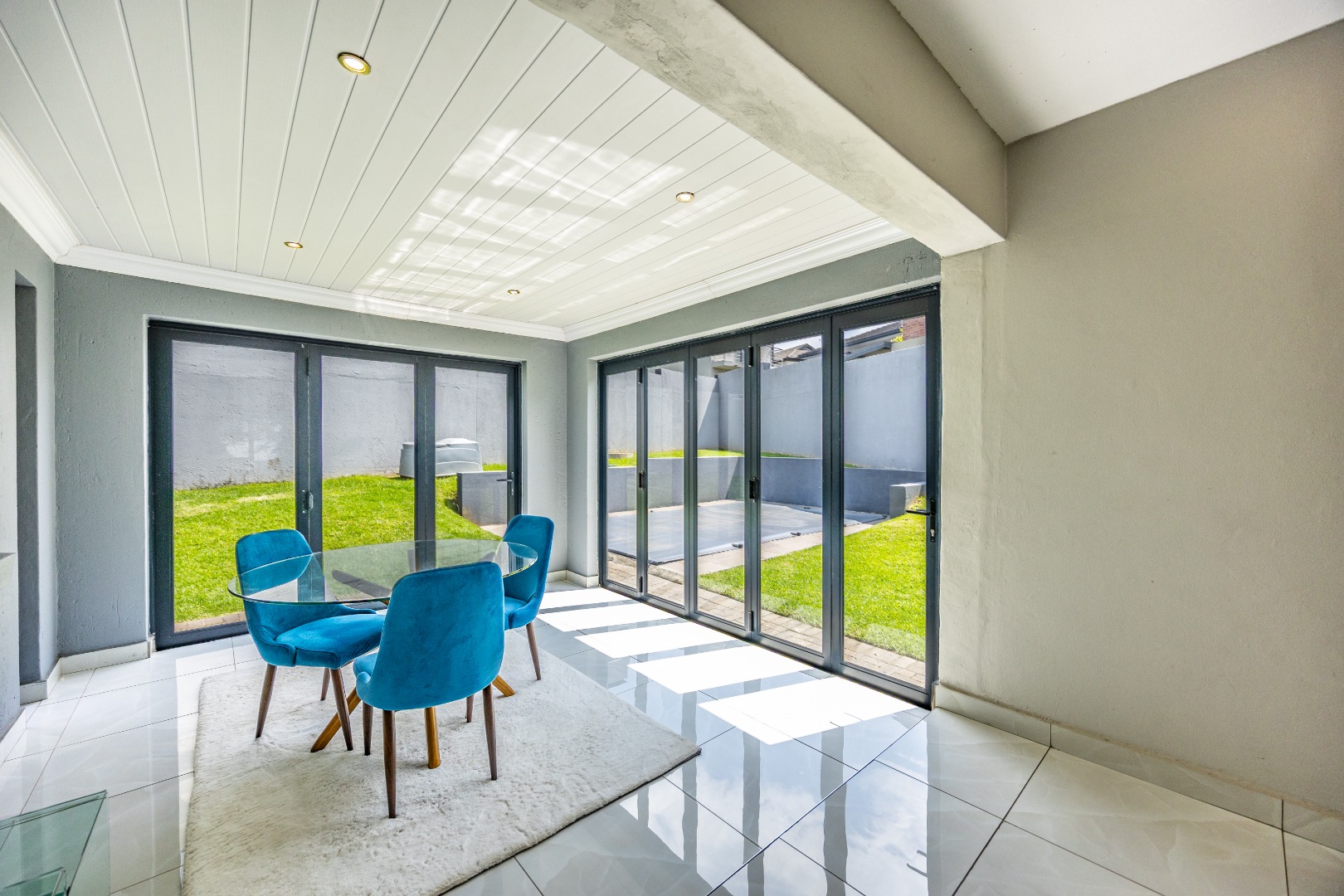 This refined three-bedroom residence delivers modern estate living in one of the most sought-after pockets of Olympus AH, where design, flow, and lifestyle come together effortlessly. From the moment you step through the front door, the home makes a statement. To the right, the main lounge is anchored by a fireplace, setting the tone for warm, inviting living. The space extends seamlessly into an additional lounge—ideal as a dining area—and opens through aluminium folding doors to the outdoors, creating a strong indoor-outdoor connection filled with natural light.