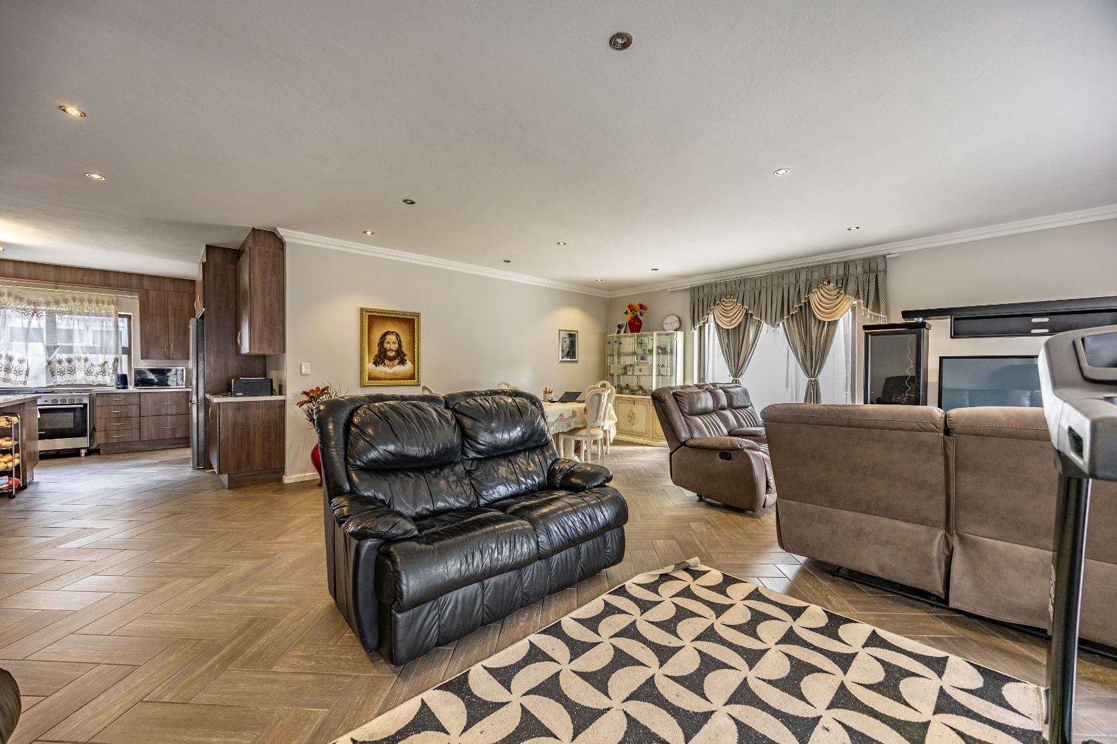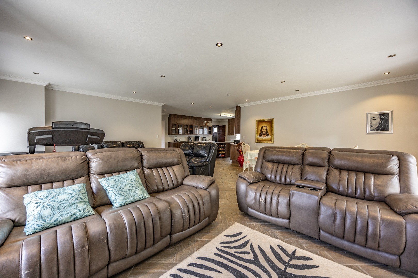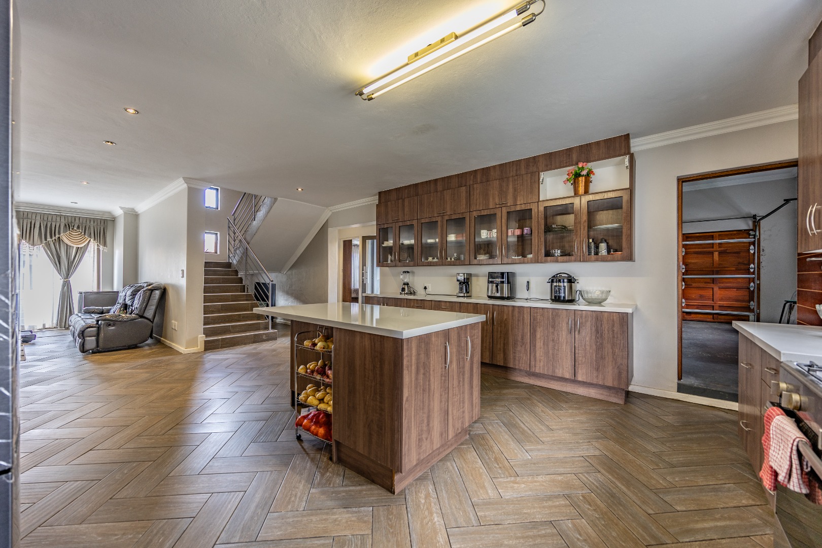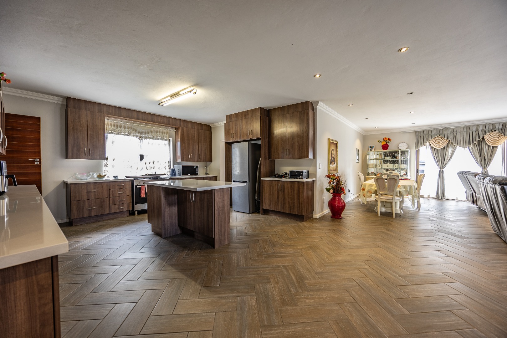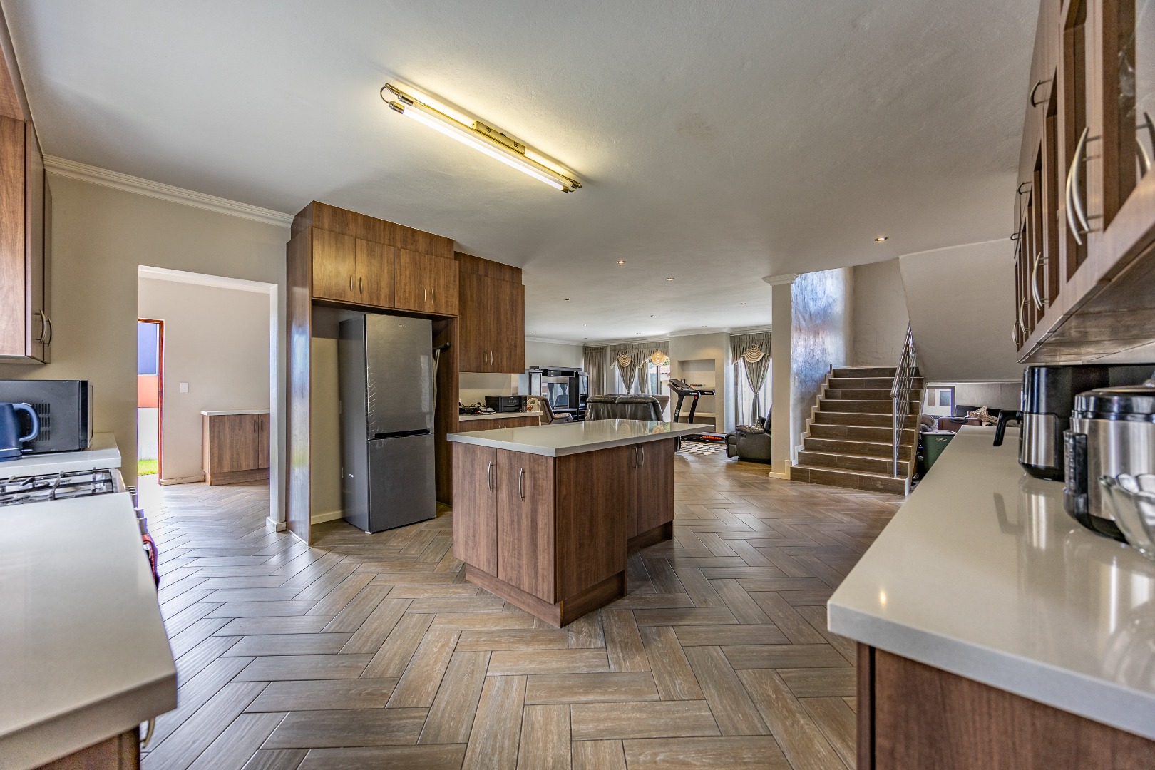 Step through the front door and you’re immediately welcomed into a home designed for both comfort and effortless living. To your right, a well-positioned guest bedroom with its own bathroom offers privacy and convenience for visitors or extended family. The home then opens up into a seamless flow of space — a modern open-plan kitchen anchors the living areas, complemented by a spacious scullery that keeps everything practical and tucked away. The kitchen flows naturally into a generous dining area and a large lounge, creating the perfect setting for both relaxed family time and entertaining. From here, you’re drawn outside to a dedicated braai area with a built-in braai, perfectly positioned alongside the staff quarters with its own bathroom — creating a functional and private outdoor setup that works just as well for entertaining as it does for day-to-day living. The double garage leads directly into the home, adding both convenience and security, with additional storage neatly tucked under the staircase.