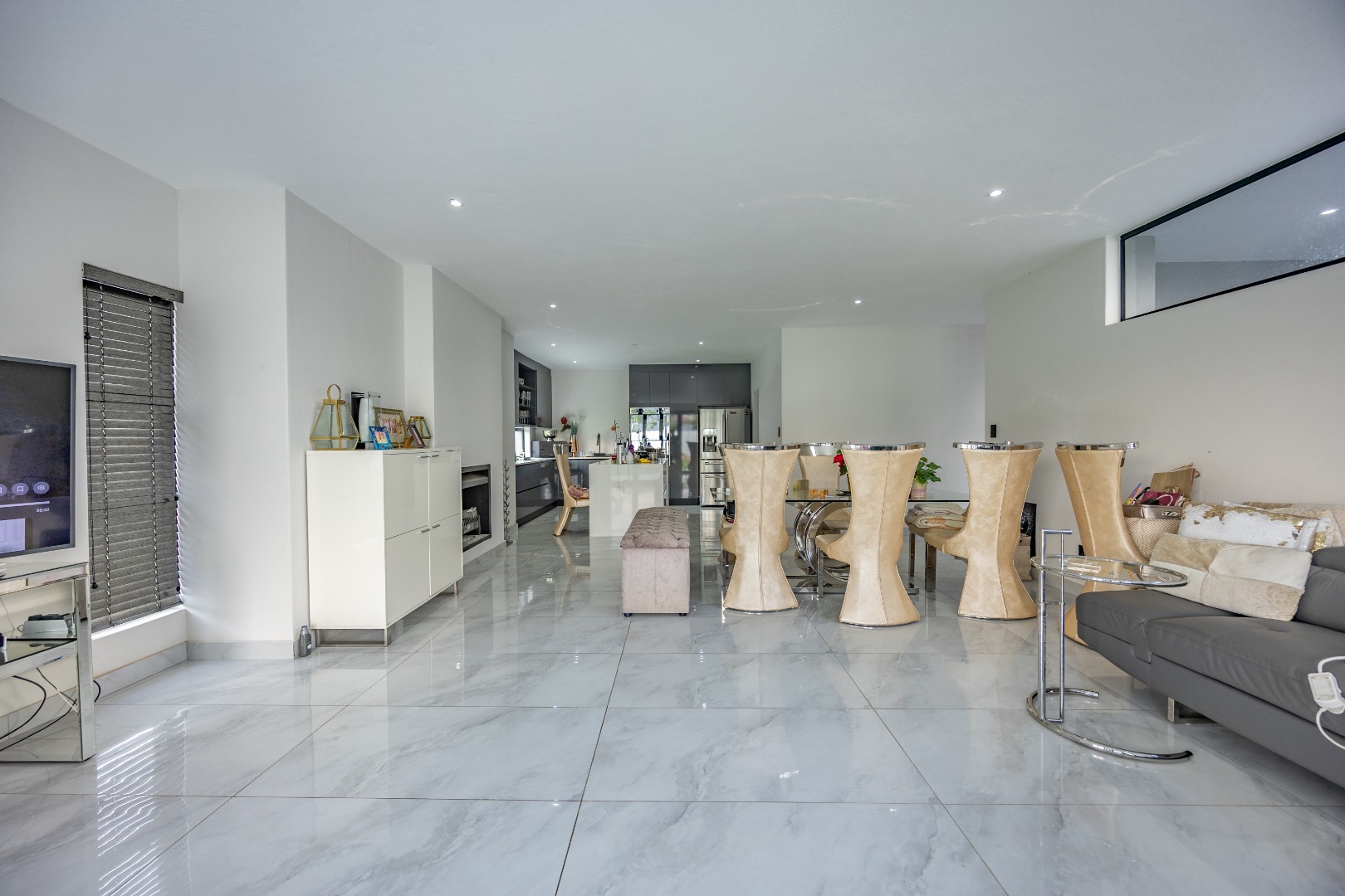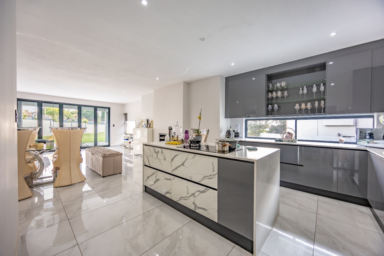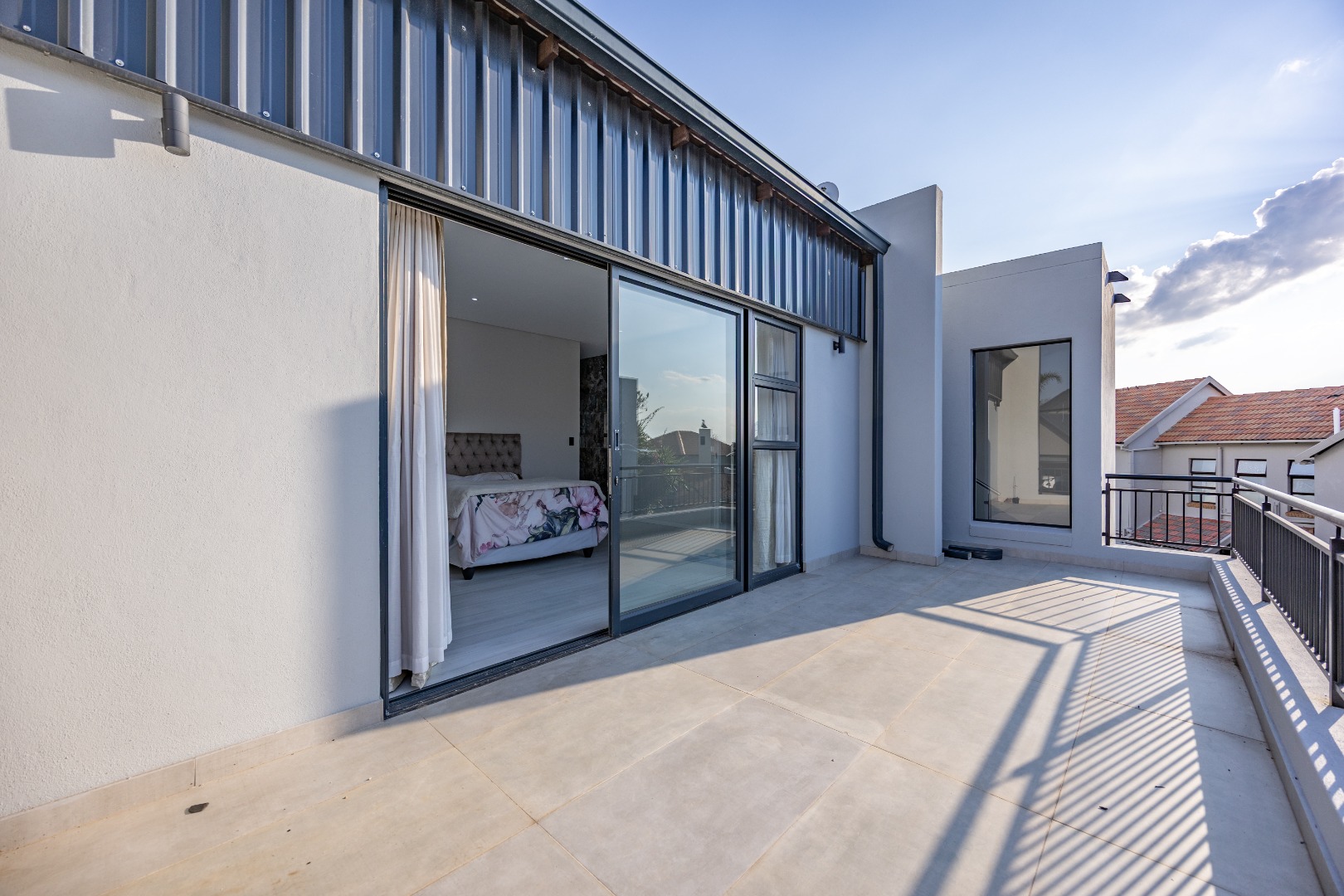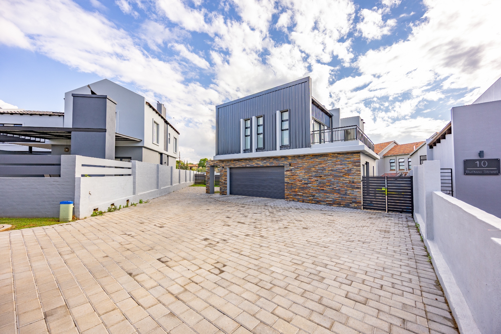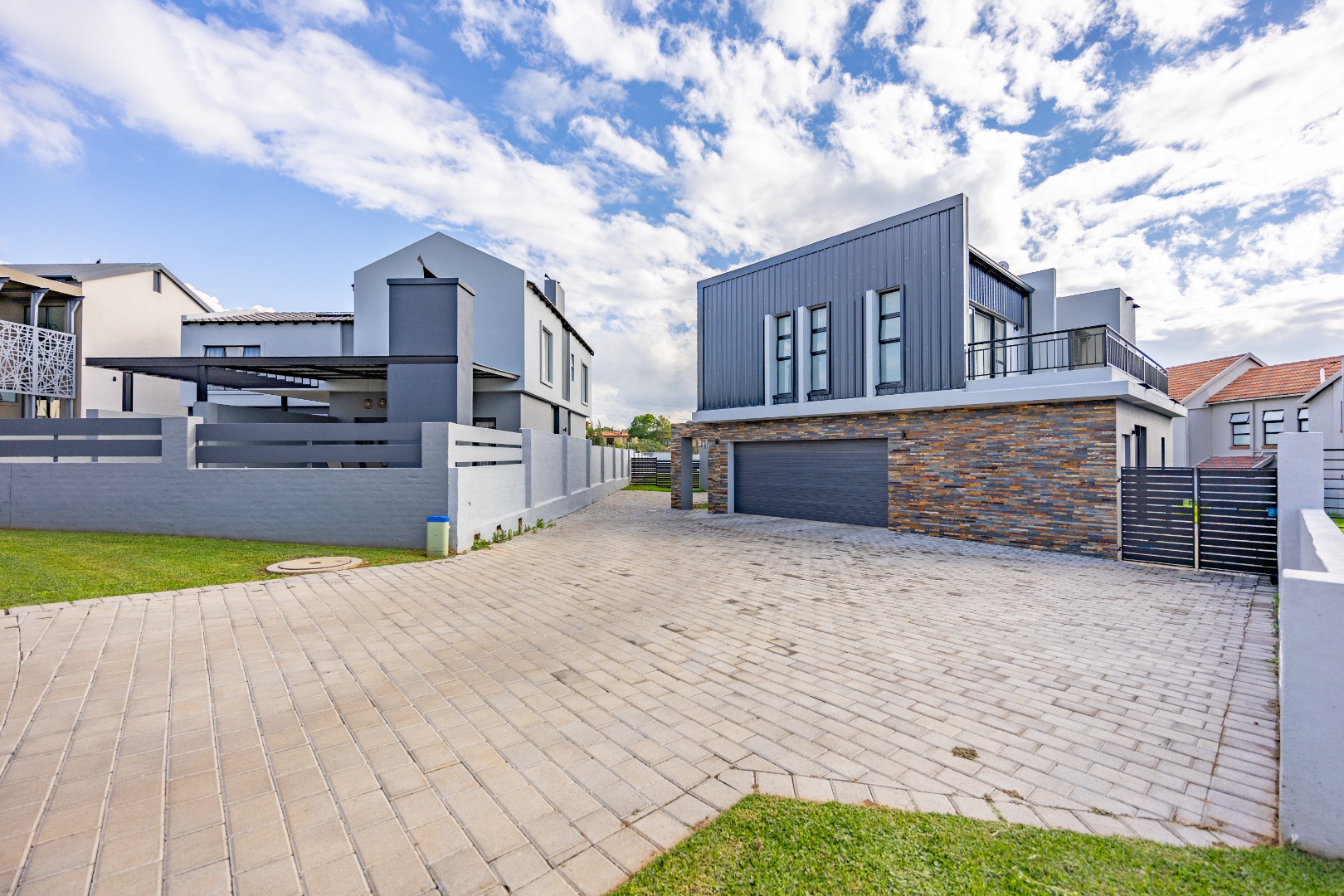 Step into contemporary elegance with this newly built modern-industrial masterpiece in the prestigious Highlands Estate. The exterior boasts striking industrial finishes, including clean lines, mixed materials, and bold architectural details, creating a standout presence. Inside, a grand entrance hall welcomes you to a spacious living area featuring a statement fireplace, a sleek gourmet kitchen with a large scullery, and a seamless flow to the outdoor patio with a built-in braai—perfect for indoor-outdoor living. The home includes four generously sized bedrooms, with the luxurious main suite offering an en-suite bathroom, a walk-in closet, and a private balcony to soak in the serene views.