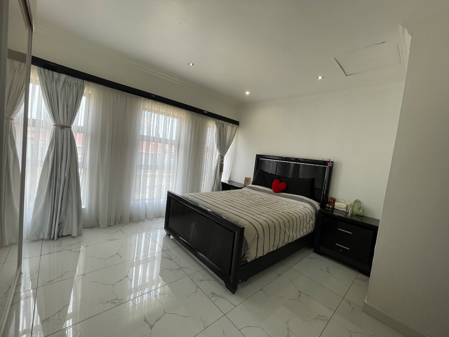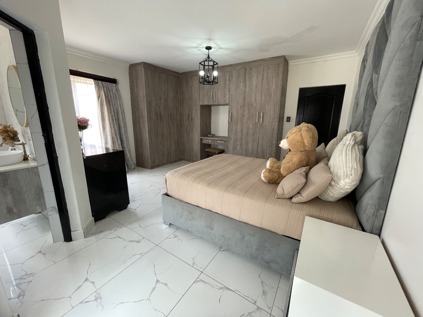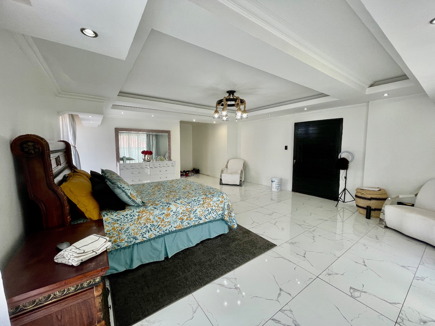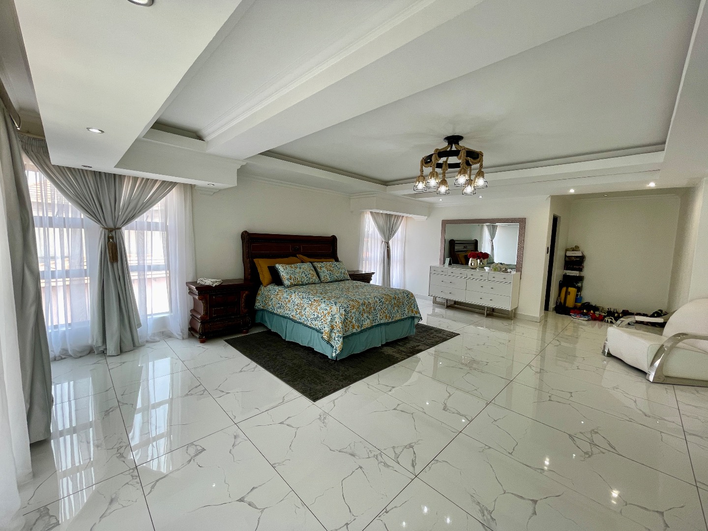 The property features 4 spacious bedrooms, all en suite, including a large bedroom downstairs—ideal for guests or extended family. Upstairs offers 3 bedrooms, with an impressive main bedroom boasting ample space for a walk-in closet, as well as a cozy pyjama lounge.