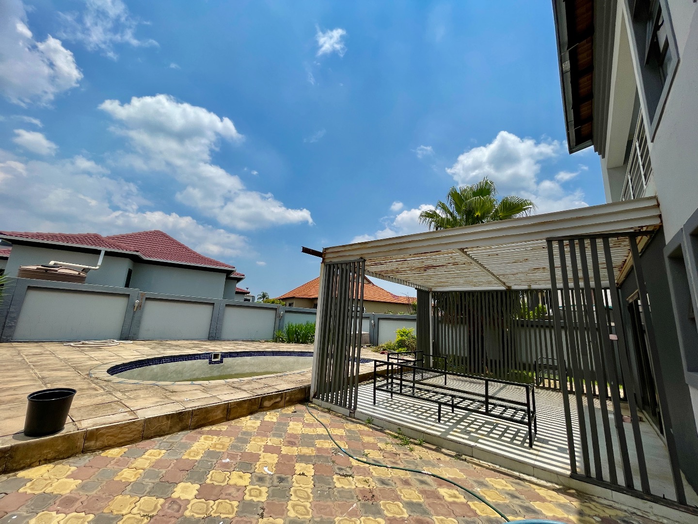 Outdoor living is perfect for entertaining, featuring a large patio entertainment area, big swimming pool, and a spacious yard. The home is completed by a beautiful front garden with palm trees, creating excellent curb appeal.