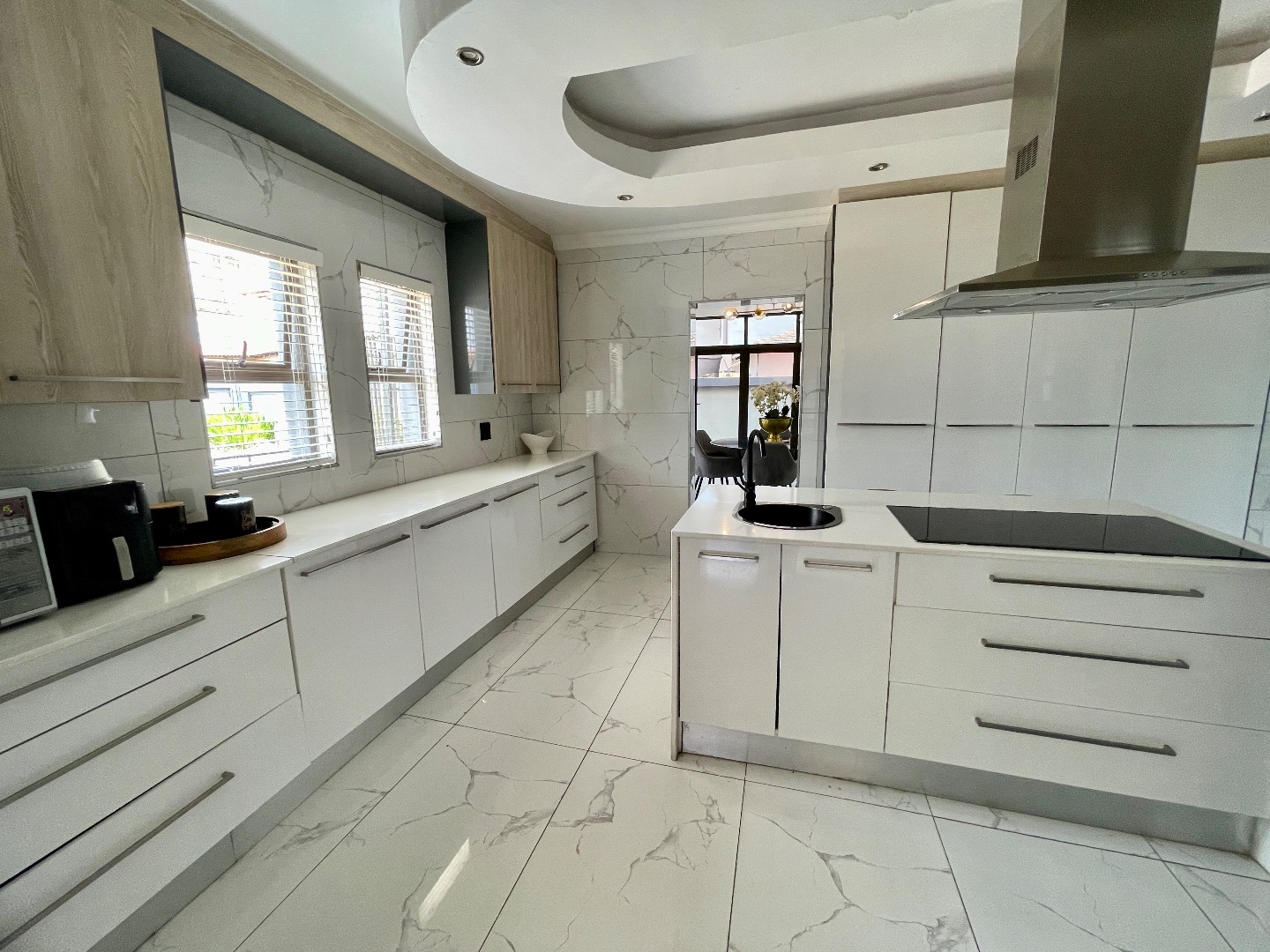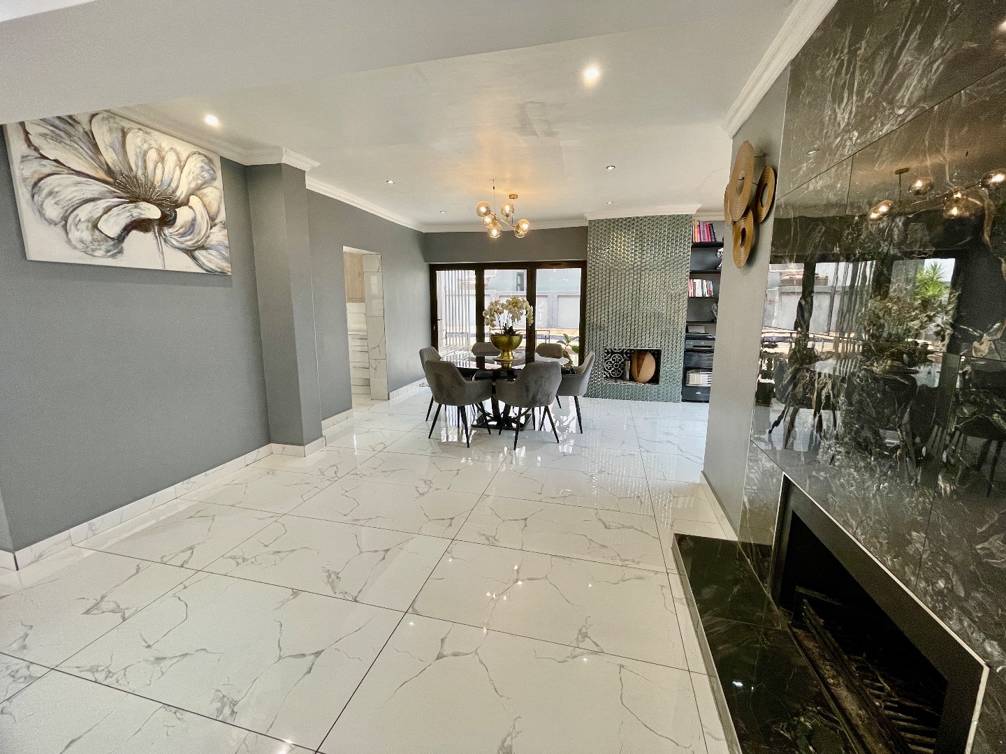 Living areas are generous and well-designed, comprising two dining rooms, a large sitting room, and a beautiful fireplace that adds warmth and character to the home. The modern, spacious kitchen is complemented by a separate scullery with space for three appliances.