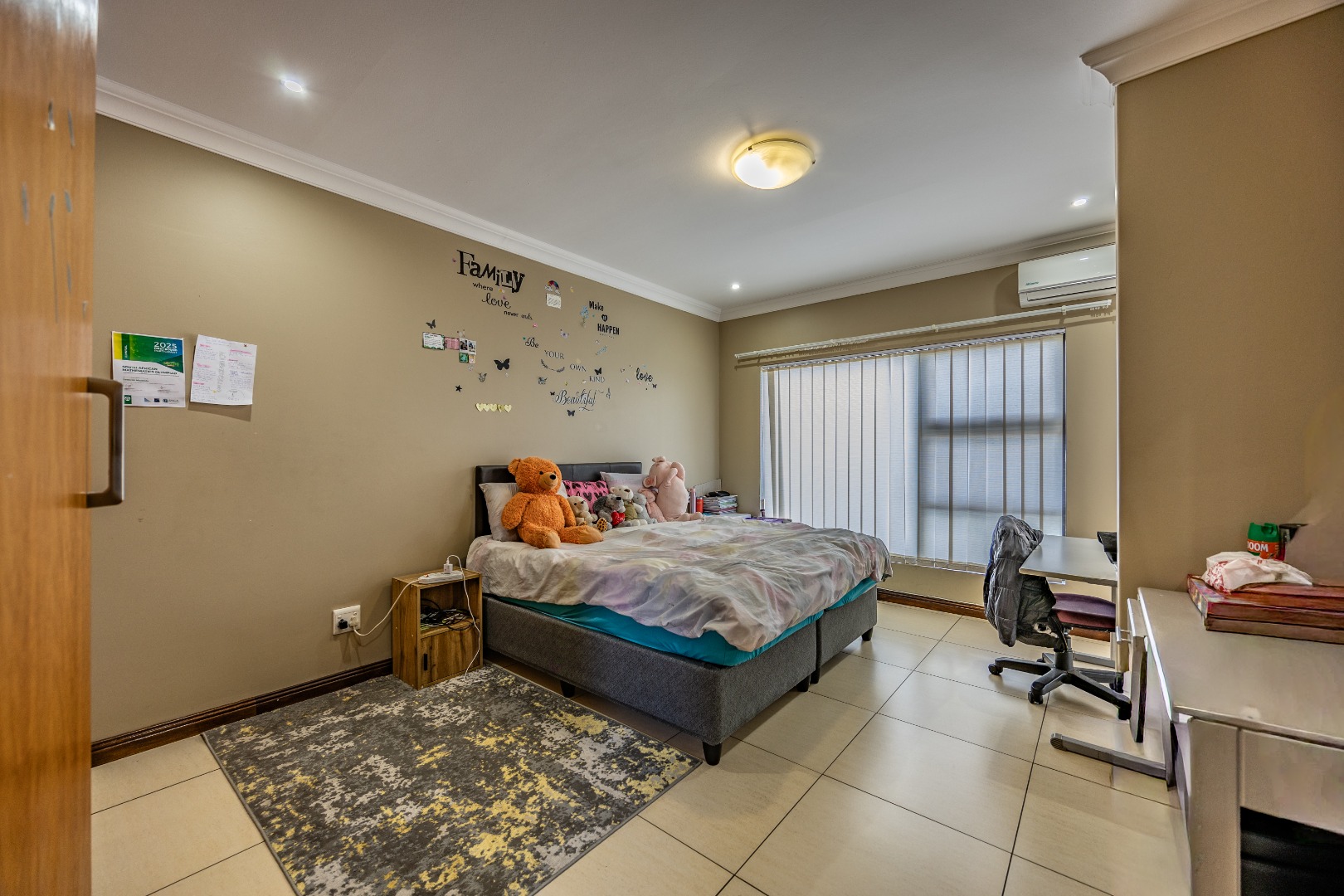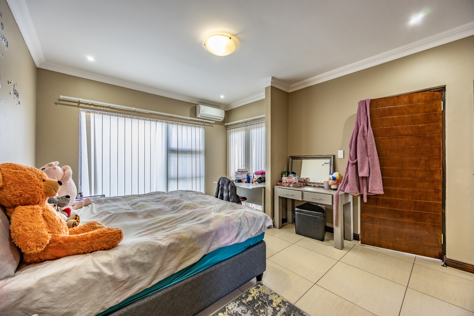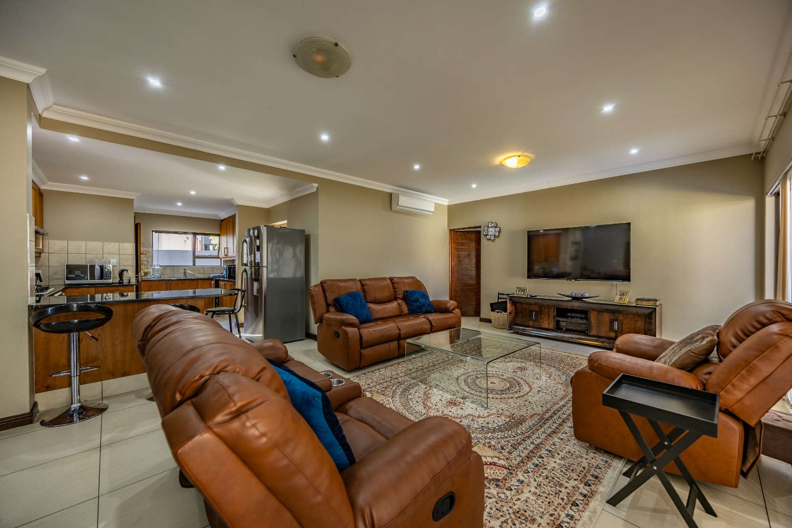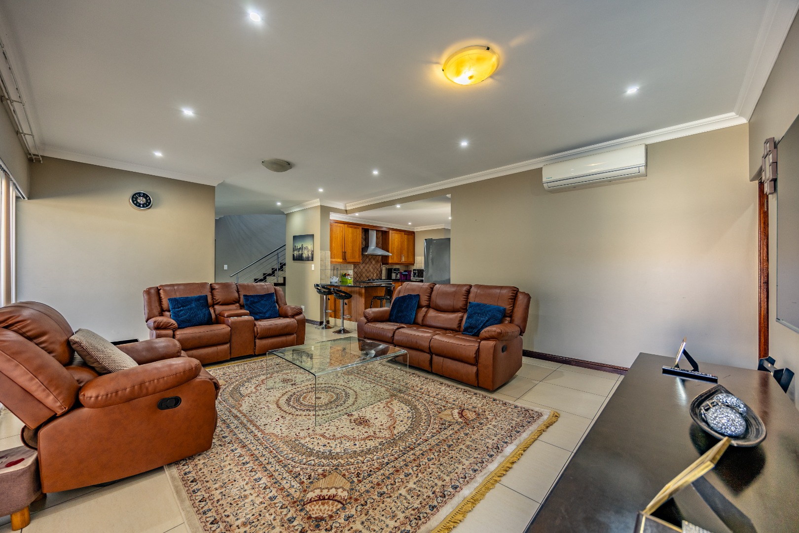 Upstairs, the home continues to impress with a comfortable pajama lounge, ideal for relaxed evenings or a quiet retreat. Three generously sized bedrooms complete the upper level, including two air-conditioned rooms and a luxurious main suite featuring air conditioning, a private balcony, and a full en-suite bathroom with his-and-hers finishes. The second bedroom also enjoys its own en-suite bathroom, air conditioning, and balcony access, creating a sense of space and comfort throughout.