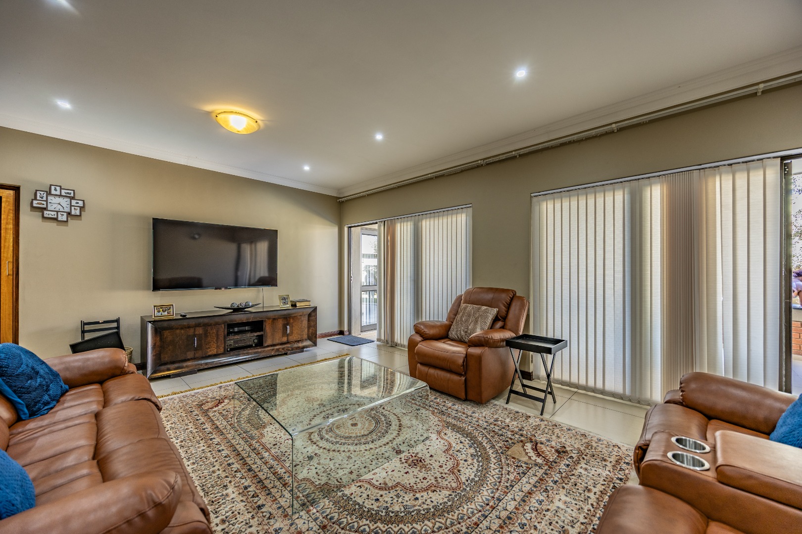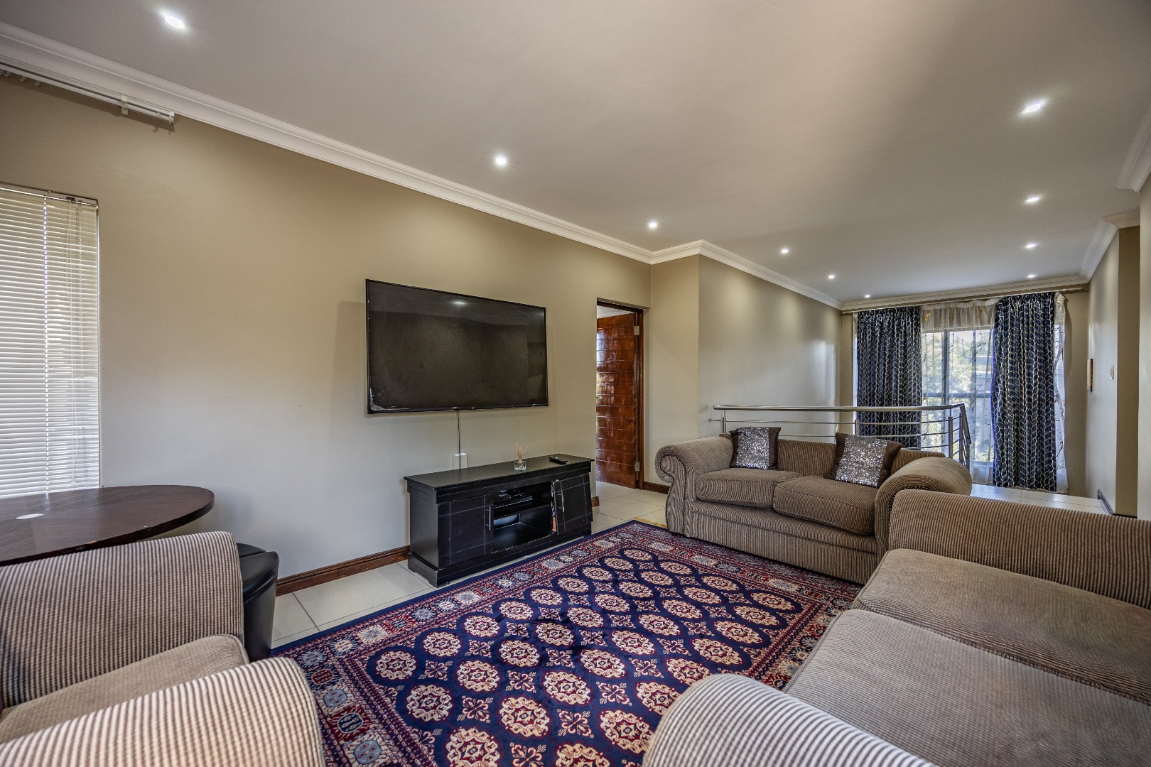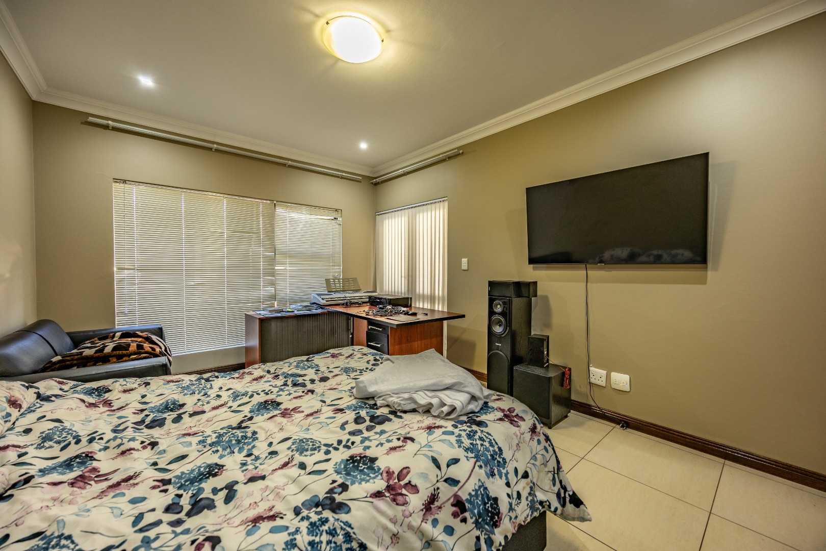 Upstairs, the home continues to impress with a comfortable pajama lounge, ideal for relaxed evenings or a quiet retreat. Three generously sized bedrooms complete the upper level, including two air-conditioned rooms and a luxurious main suite featuring air conditioning, a private balcony, and a full en-suite bathroom with his-and-hers finishes. The second bedroom also enjoys its own en-suite bathroom, air conditioning, and balcony access, creating a sense of space and comfort throughout.