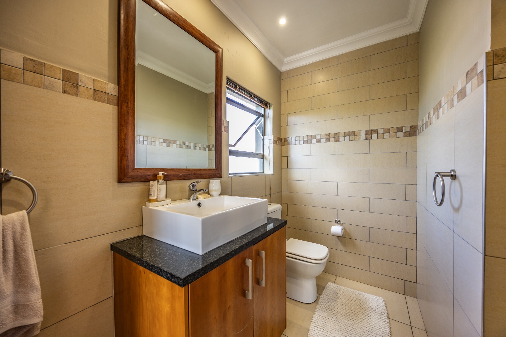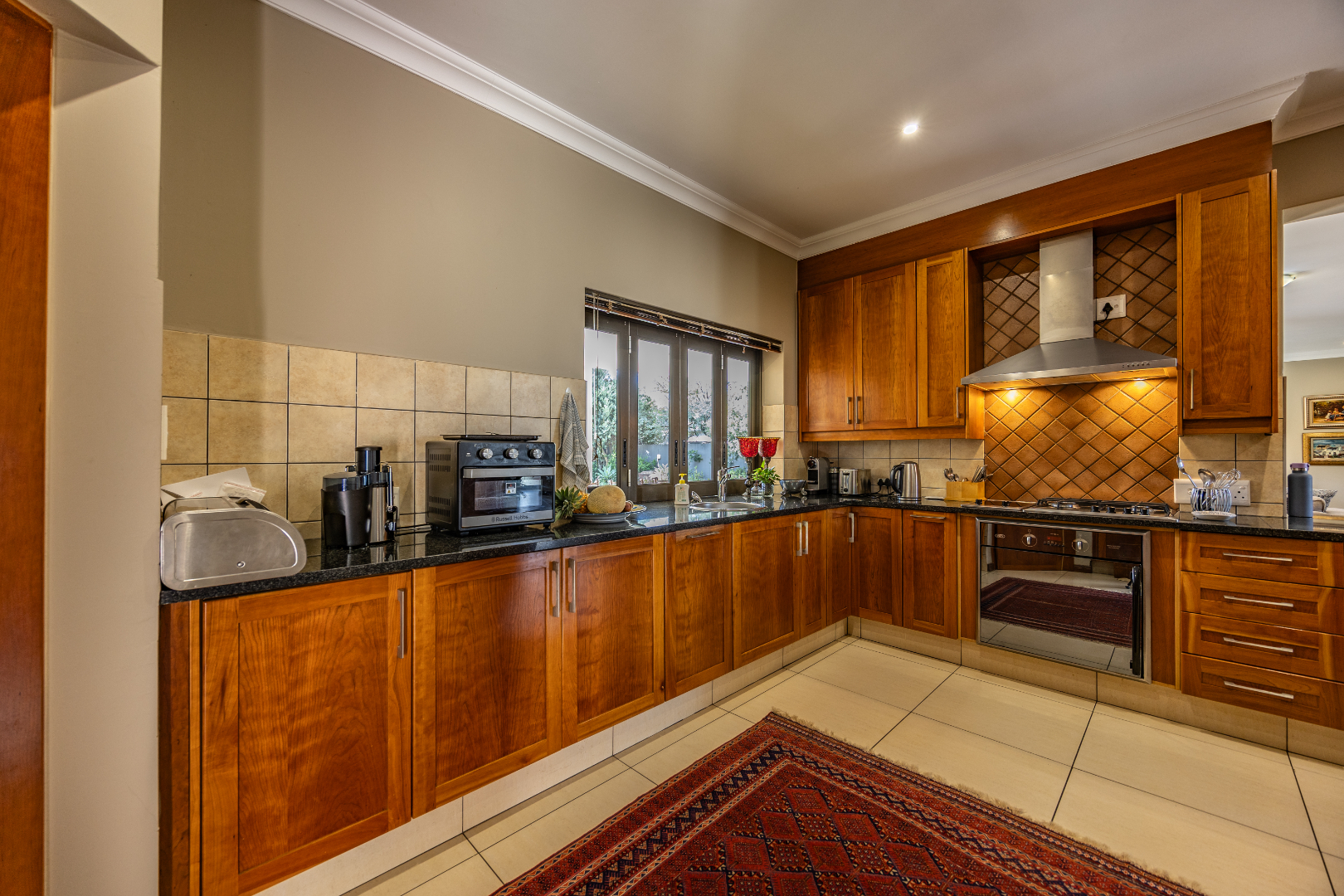Downstairs, the home offers a warm and inviting atmosphere with a spacious living area centred around a gas fireplace, flowing seamlessly into the dining area and modern kitchen. The kitchen is well-equipped with a gas stove, electric oven, and a separate scullery, making it both functional and stylish. A guest bathroom is conveniently located on this level, along with a comfortable guest bedroom featuring a full en-suite bathroom, ideal for visitors or extended family.