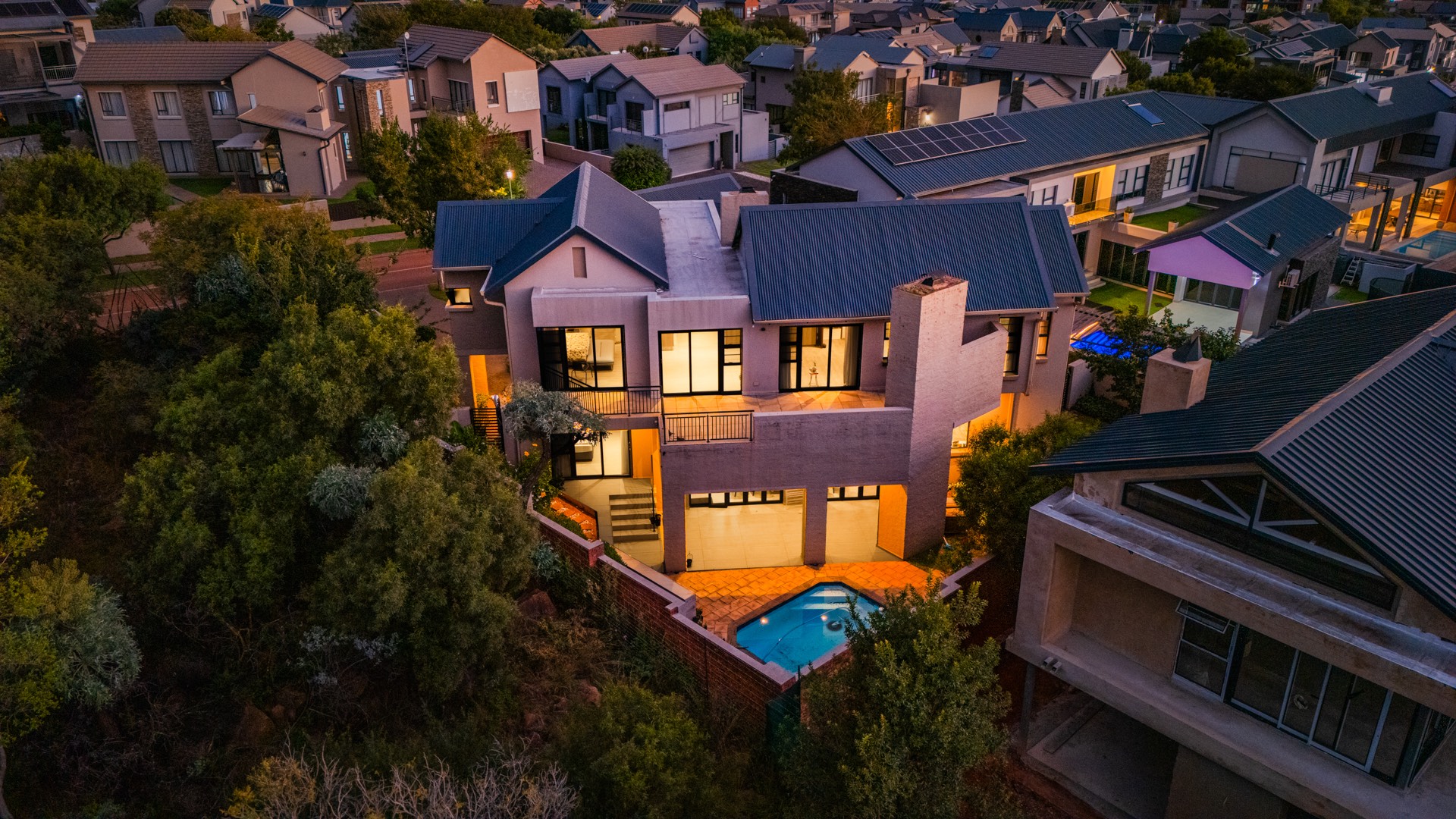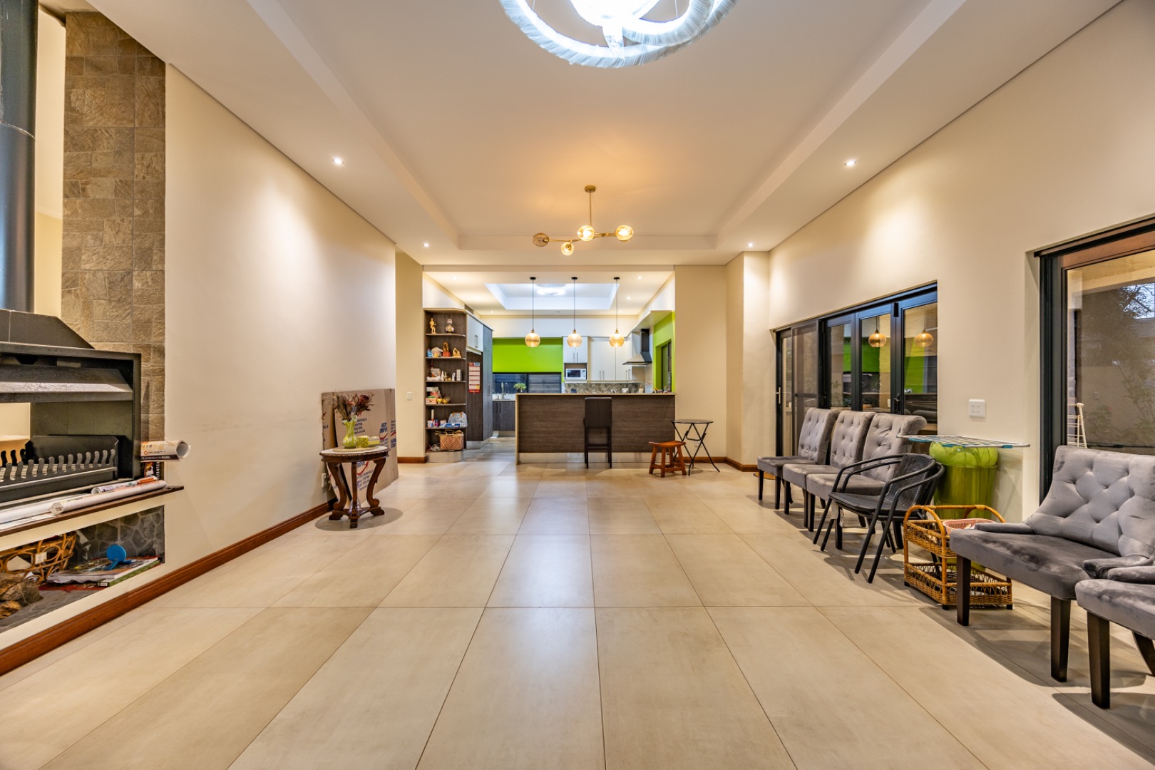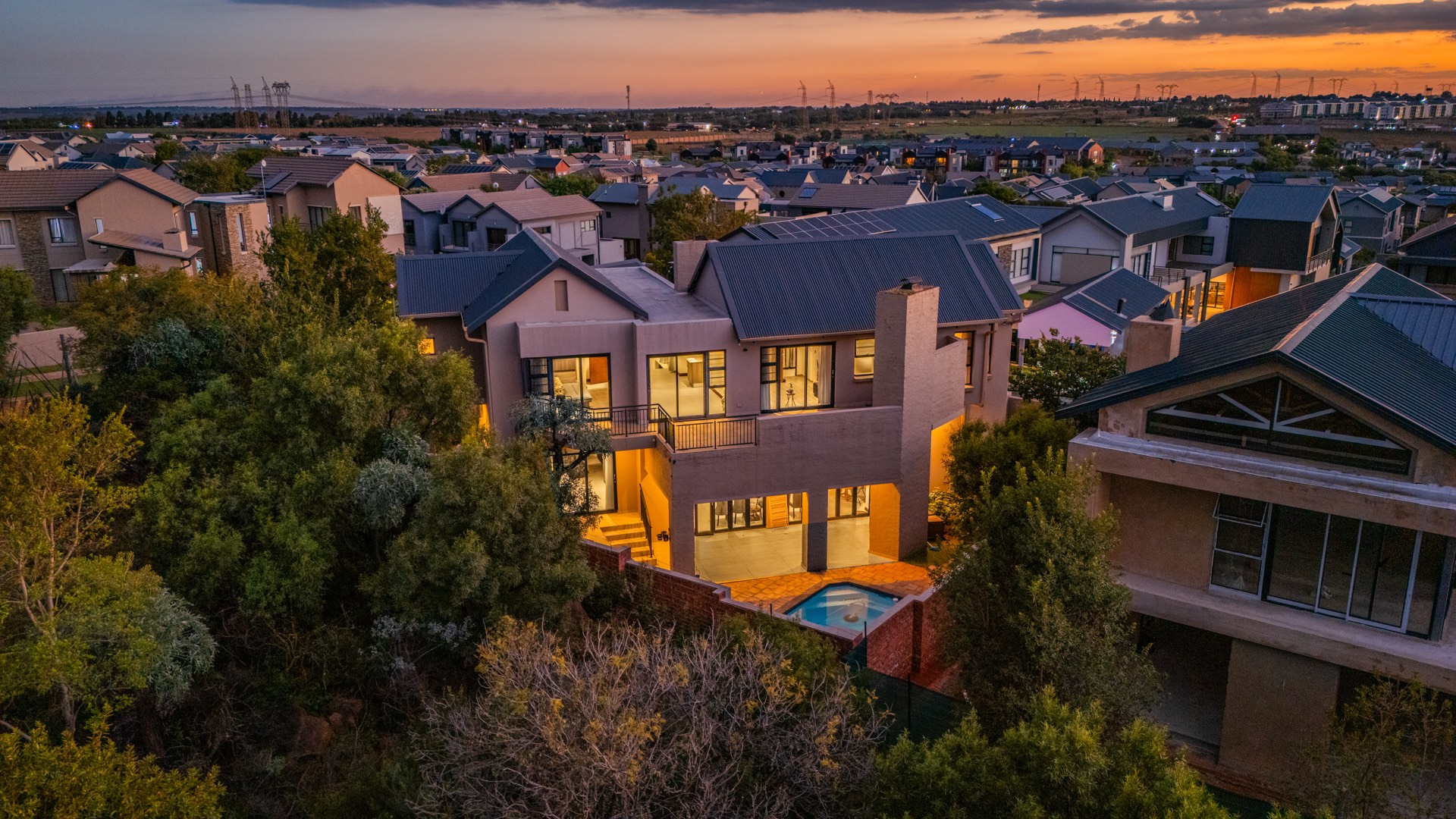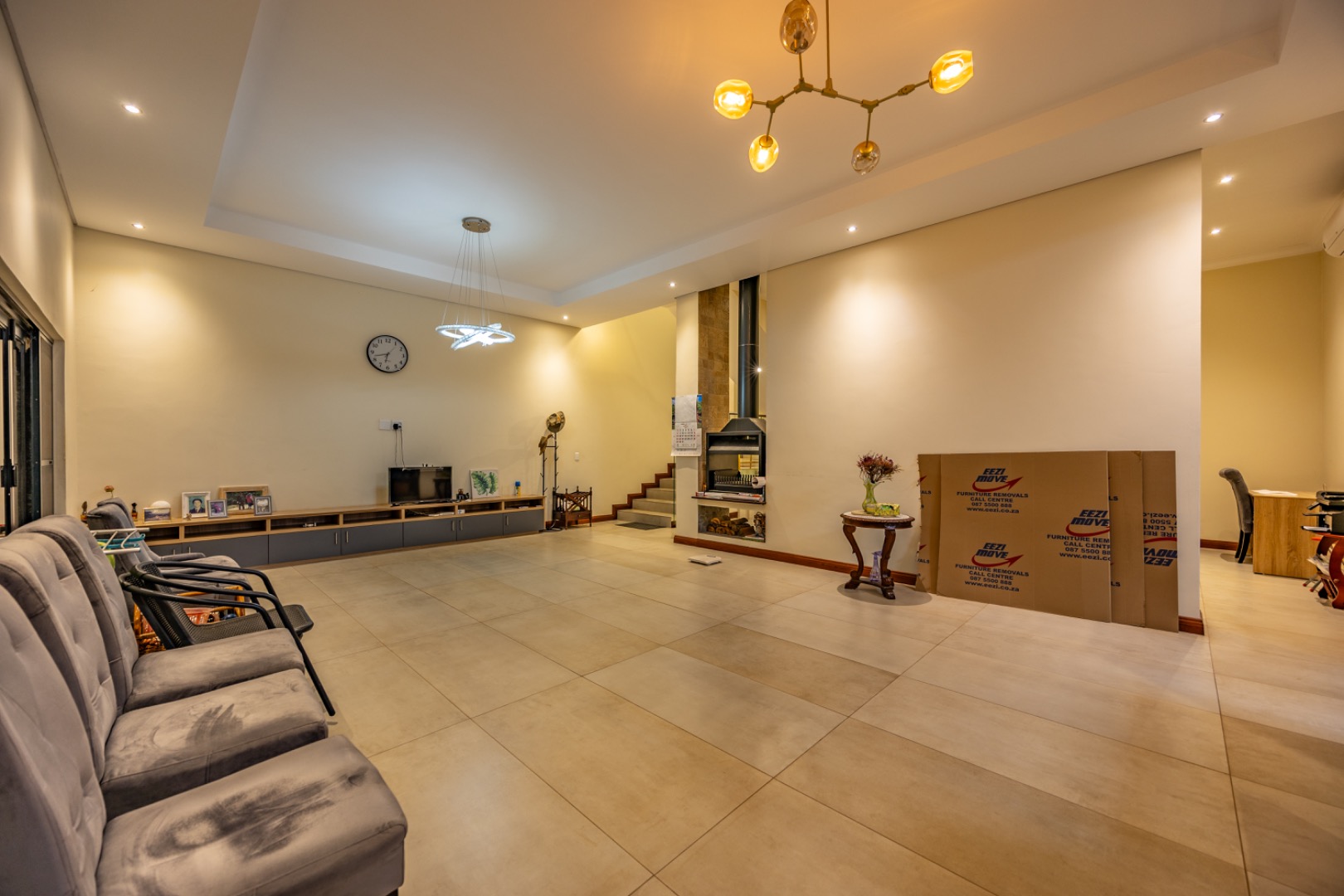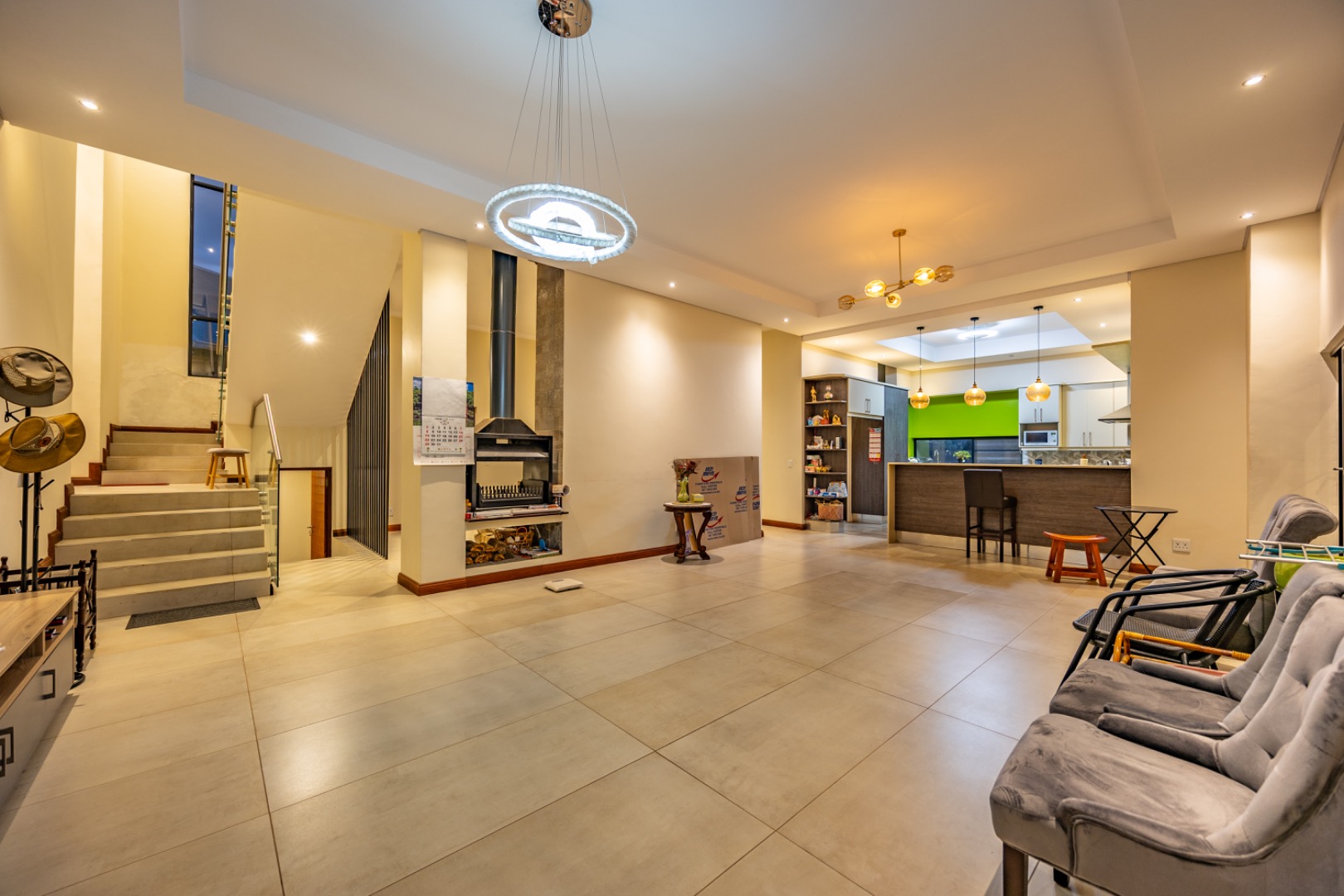 Situated in the prestigious The Hills Game Reserve Estate, this impressive 450m² home offers generous proportions and comfortable family living within one of Pretoria East’s most sought-after lifestyle estates. A welcoming entrance hall leads into spacious open-plan living, dining, and kitchen areas centred around a cozy fireplace and fitted with air conditioning, creating a warm space for both everyday living and entertaining. The ground floor also features a guest bedroom with en-suite bathroom and garden access, a guest toilet, a versatile study or hobby room, a practical mud room, store room, and a charming wine cellar tucked neatly beneath the staircase.