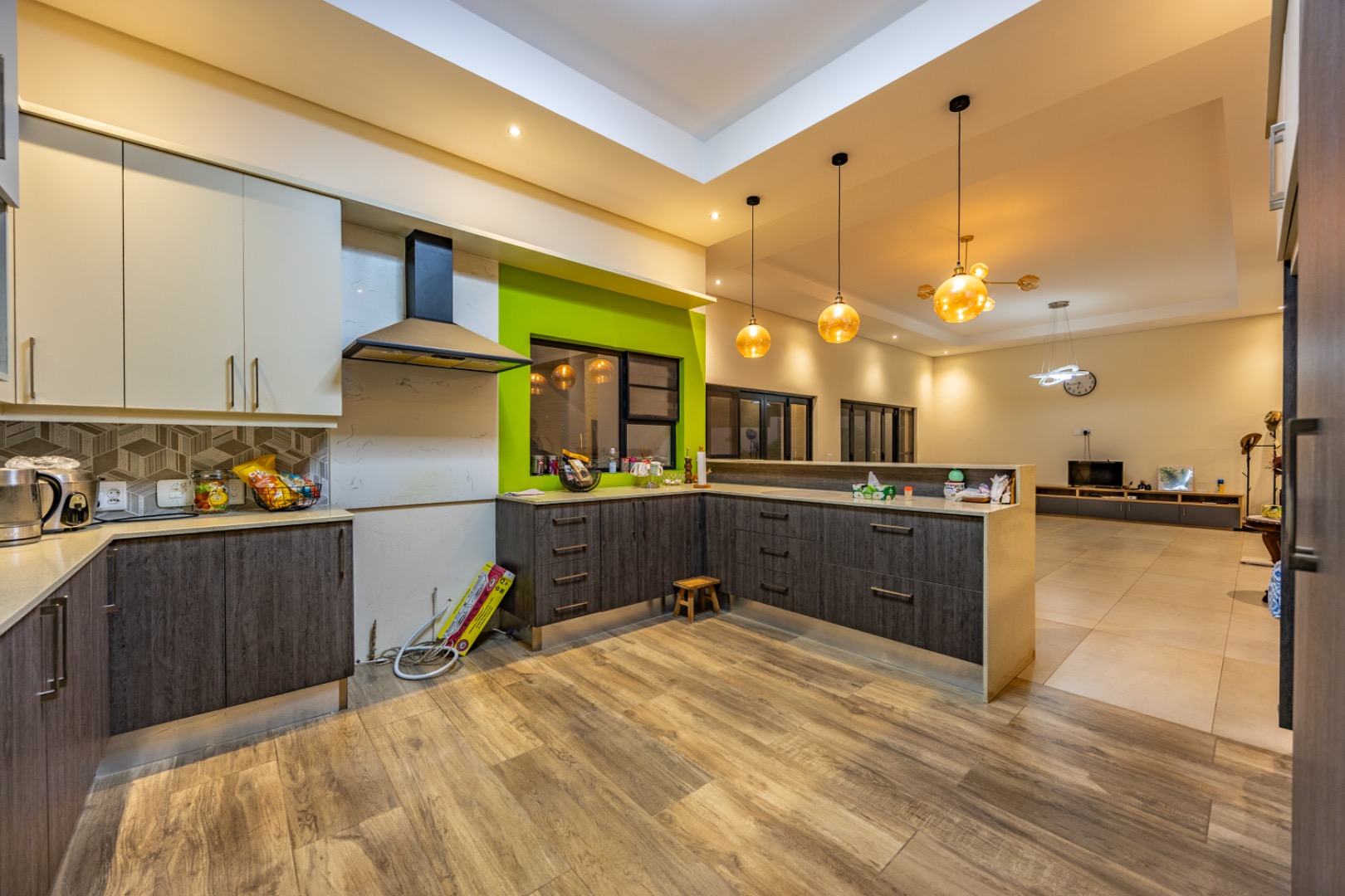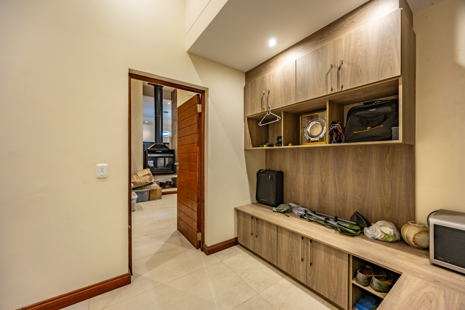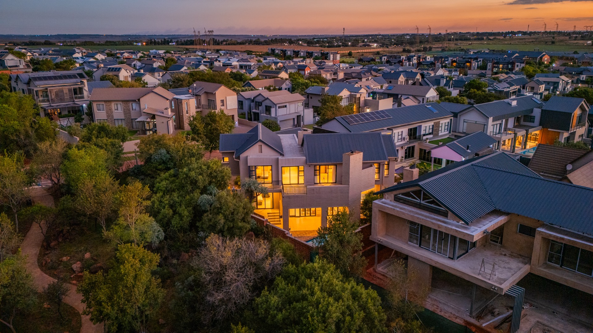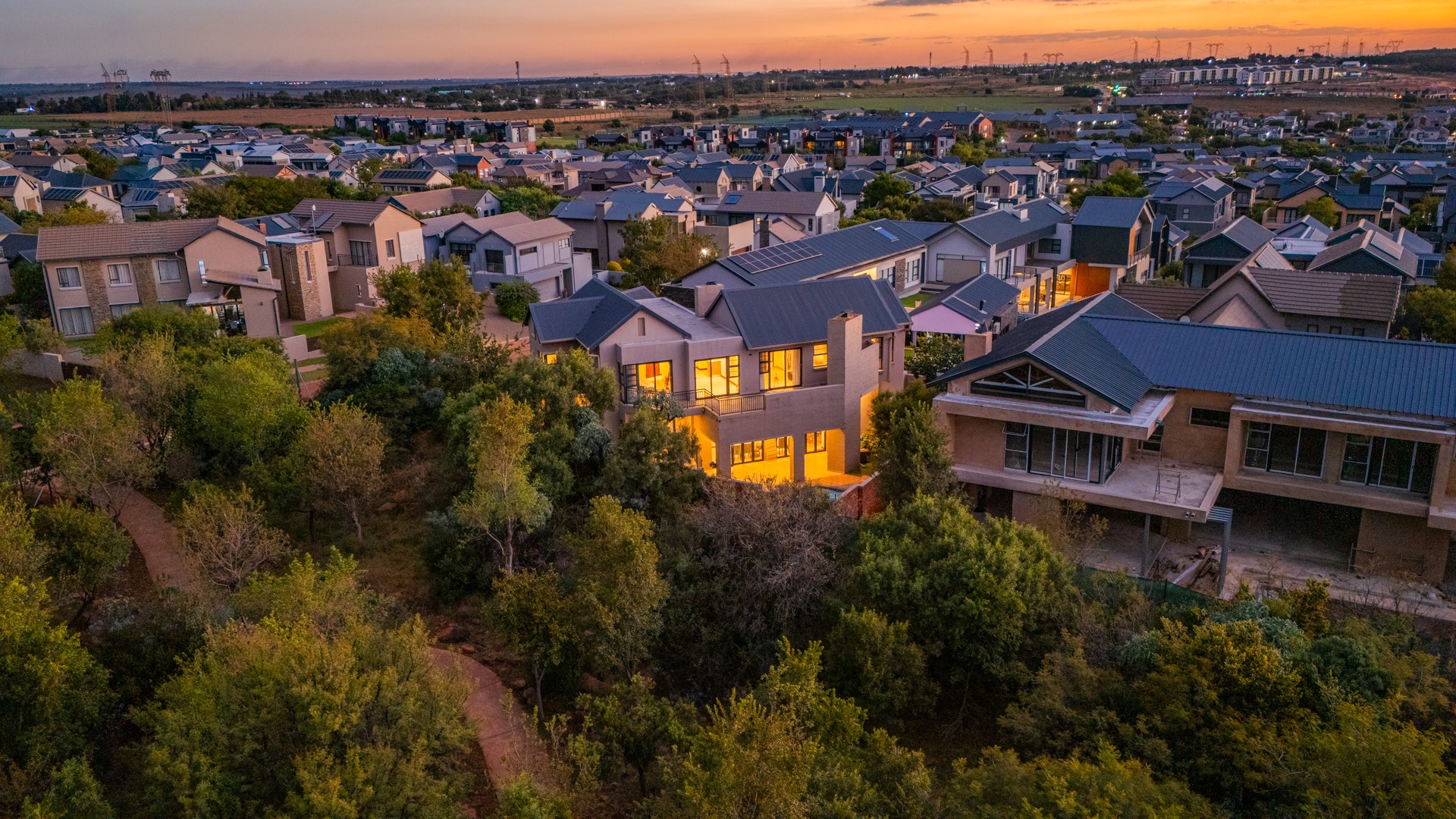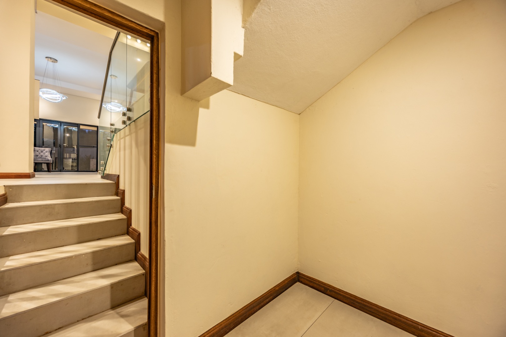 Situated in the prestigious The Hills Game Reserve Estate, this impressive 450m² home offers generous proportions and comfortable family living within one of Pretoria East’s most sought-after lifestyle estates. A welcoming entrance hall leads into spacious open-plan living, dining, and kitchen areas centred around a cozy fireplace and fitted with air conditioning, creating a warm space for both everyday living and entertaining. The ground floor also features a guest bedroom with en-suite bathroom and garden access, a guest toilet, a versatile study or hobby room, a practical mud room, store room, and a charming wine cellar tucked neatly beneath the staircase.