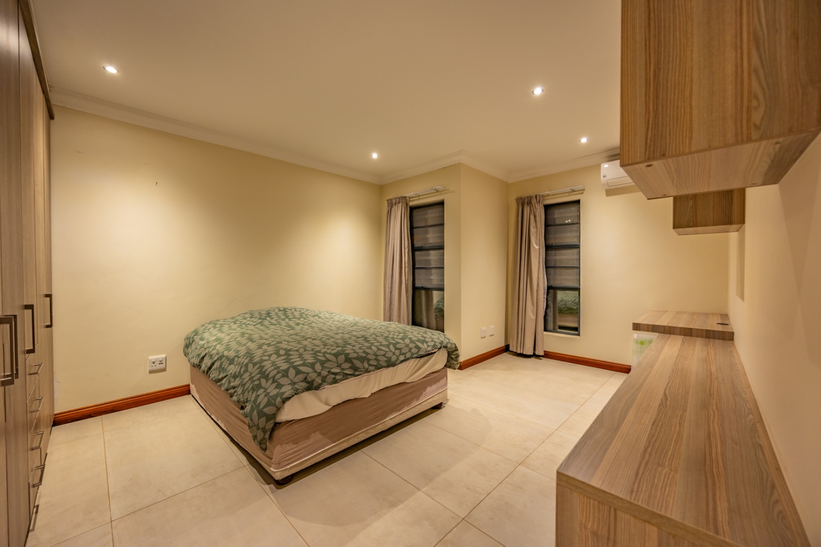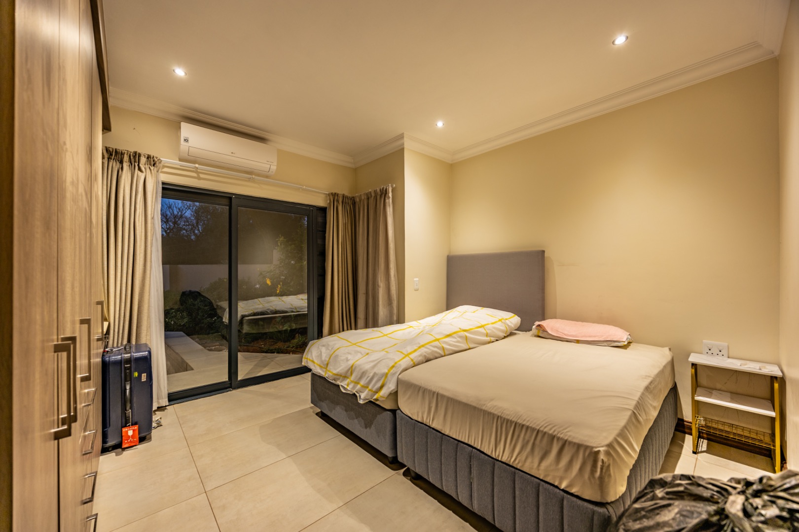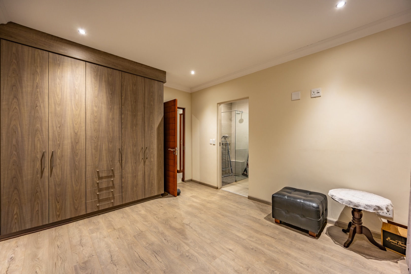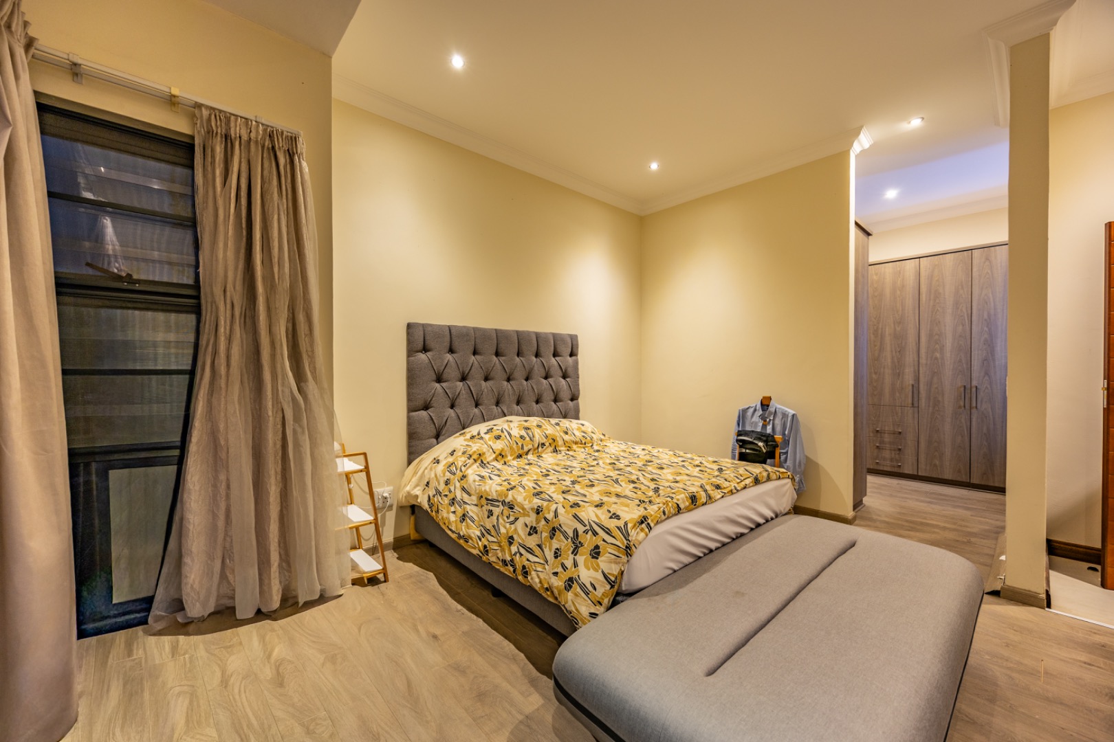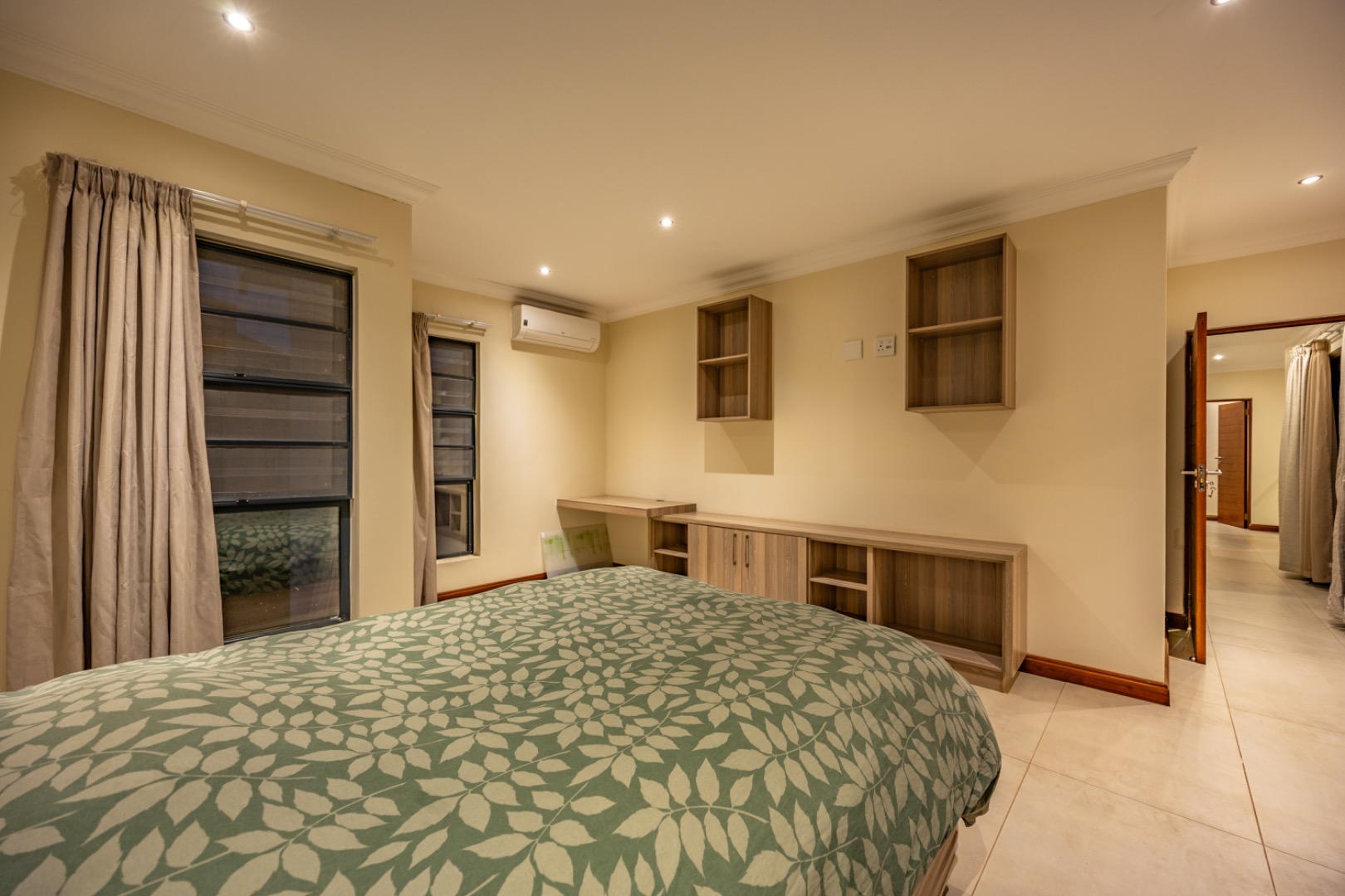 Upstairs, the home continues to offer comfortable accommodation with a relaxed pajama lounge and a tranquil zen garden that adds a peaceful touch to the space. Two well-sized bedrooms provide excellent comfort, including one with a full en-suite bathroom, built-in shelving and cupboards, and air conditioning, while the second bedroom offers built-in cupboards and access to a private balcony. The main bedroom suite serves as a private retreat, complete with air conditioning, a spacious walk-in closet, and a stylish en-suite bathroom with a large shower.