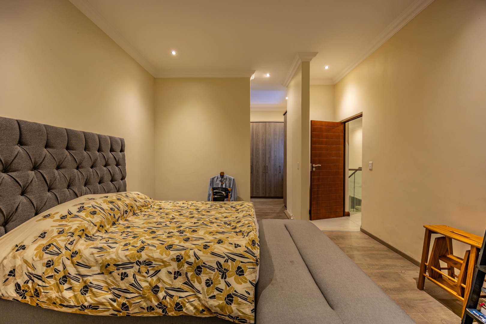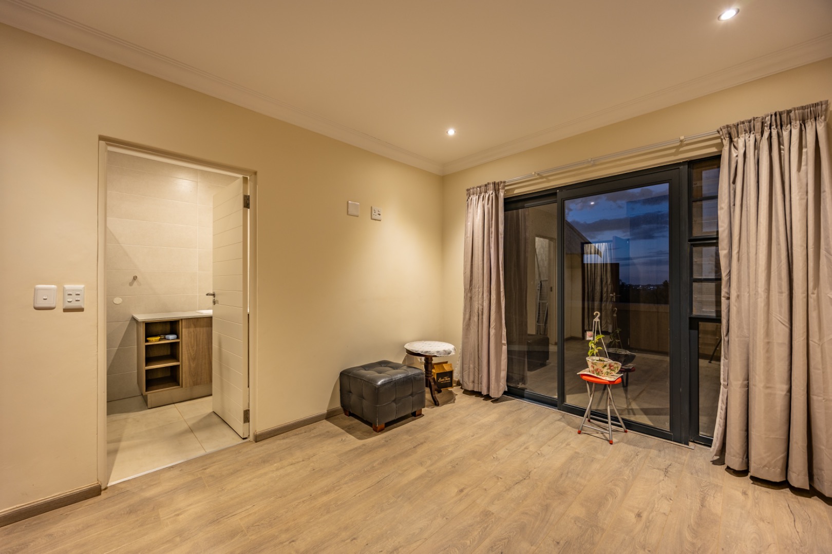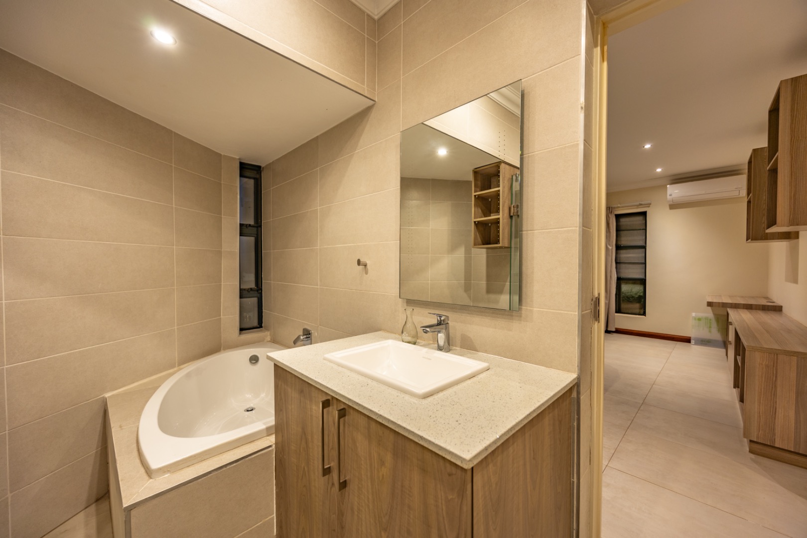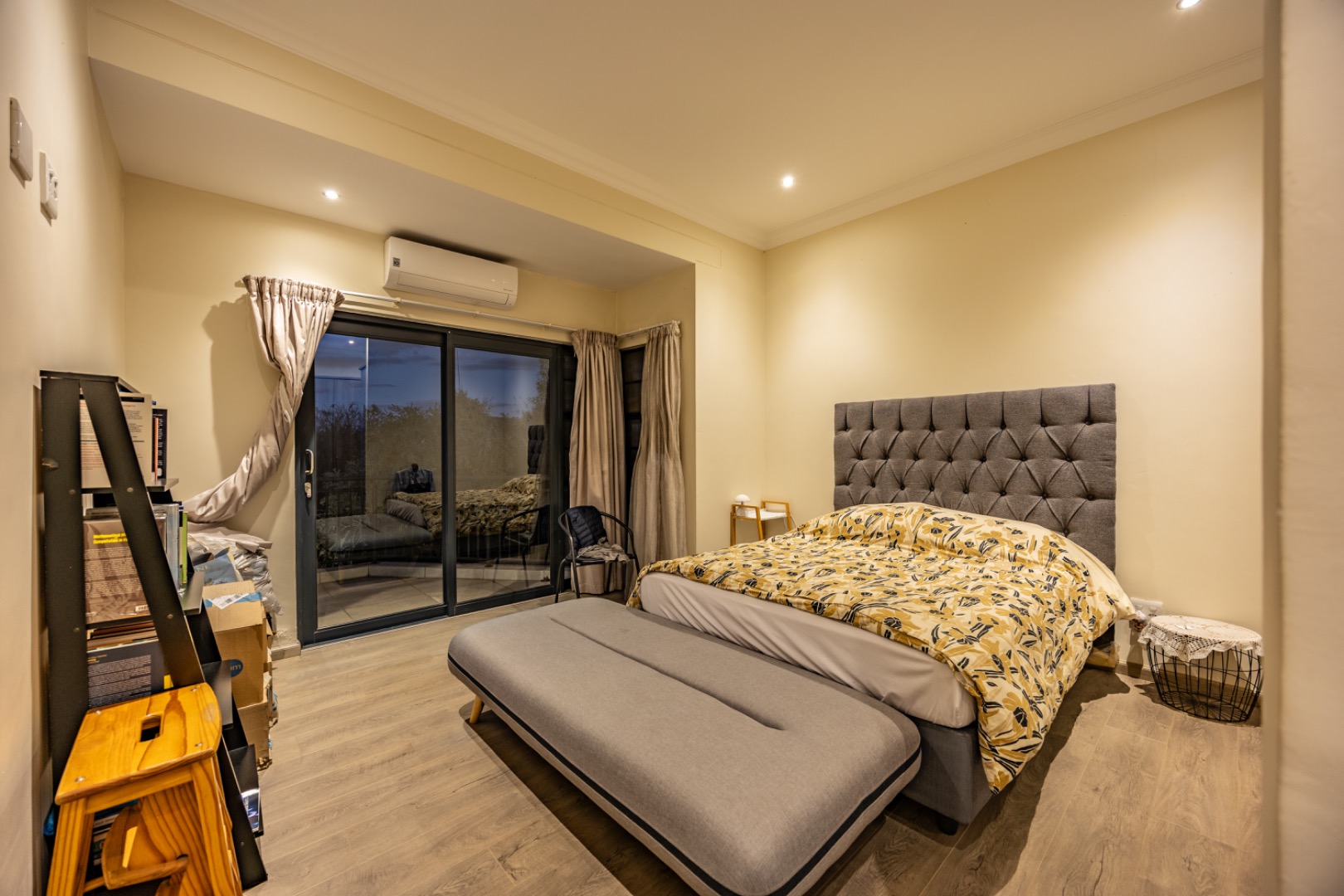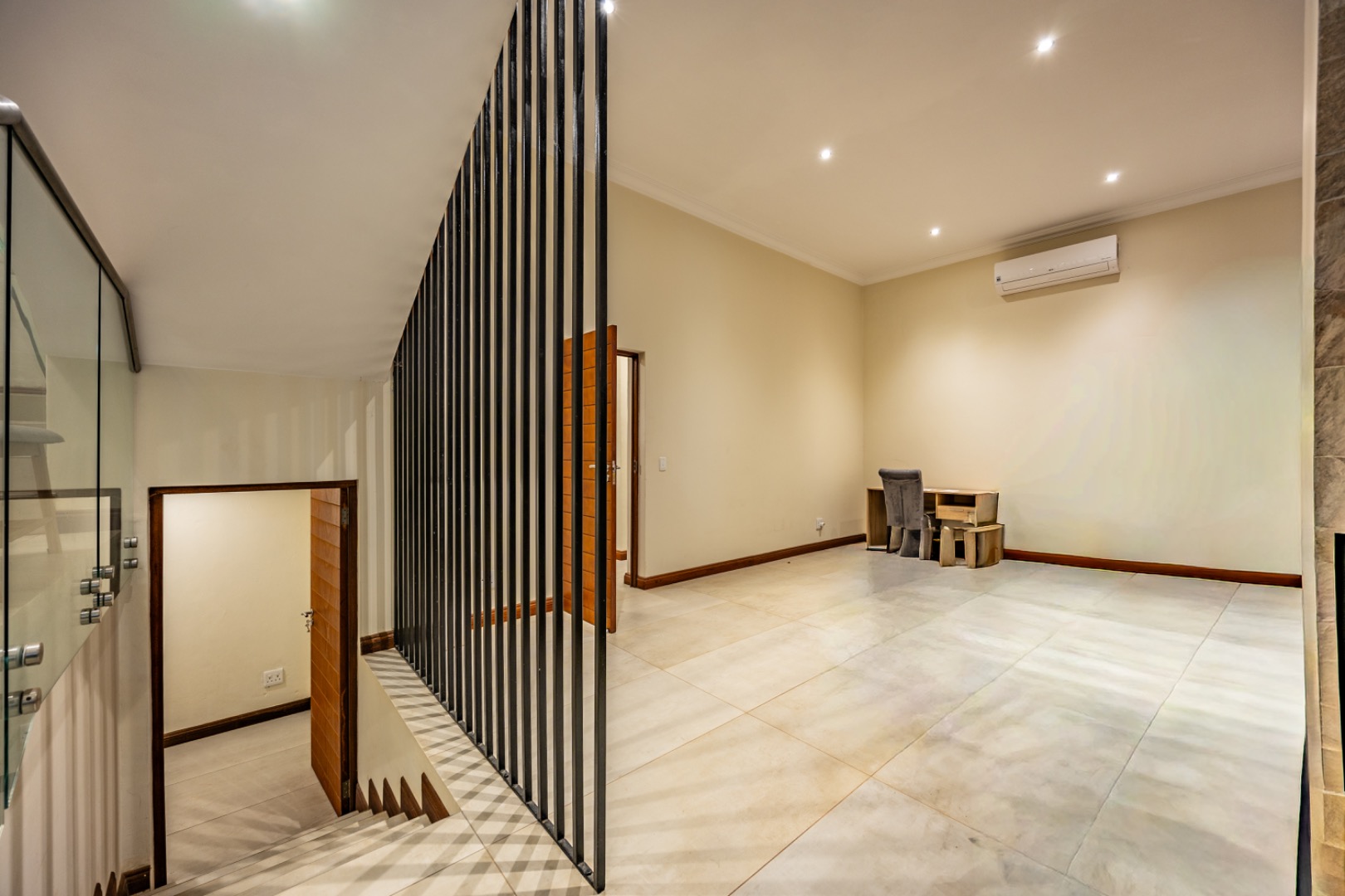 Upstairs, the home continues to offer comfortable accommodation with a relaxed pajama lounge and a tranquil zen garden that adds a peaceful touch to the space. Two well-sized bedrooms provide excellent comfort, including one with a full en-suite bathroom, built-in shelving and cupboards, and air conditioning, while the second bedroom offers built-in cupboards and access to a private balcony. The main bedroom suite serves as a private retreat, complete with air conditioning, a spacious walk-in closet, and a stylish en-suite bathroom with a large shower.
