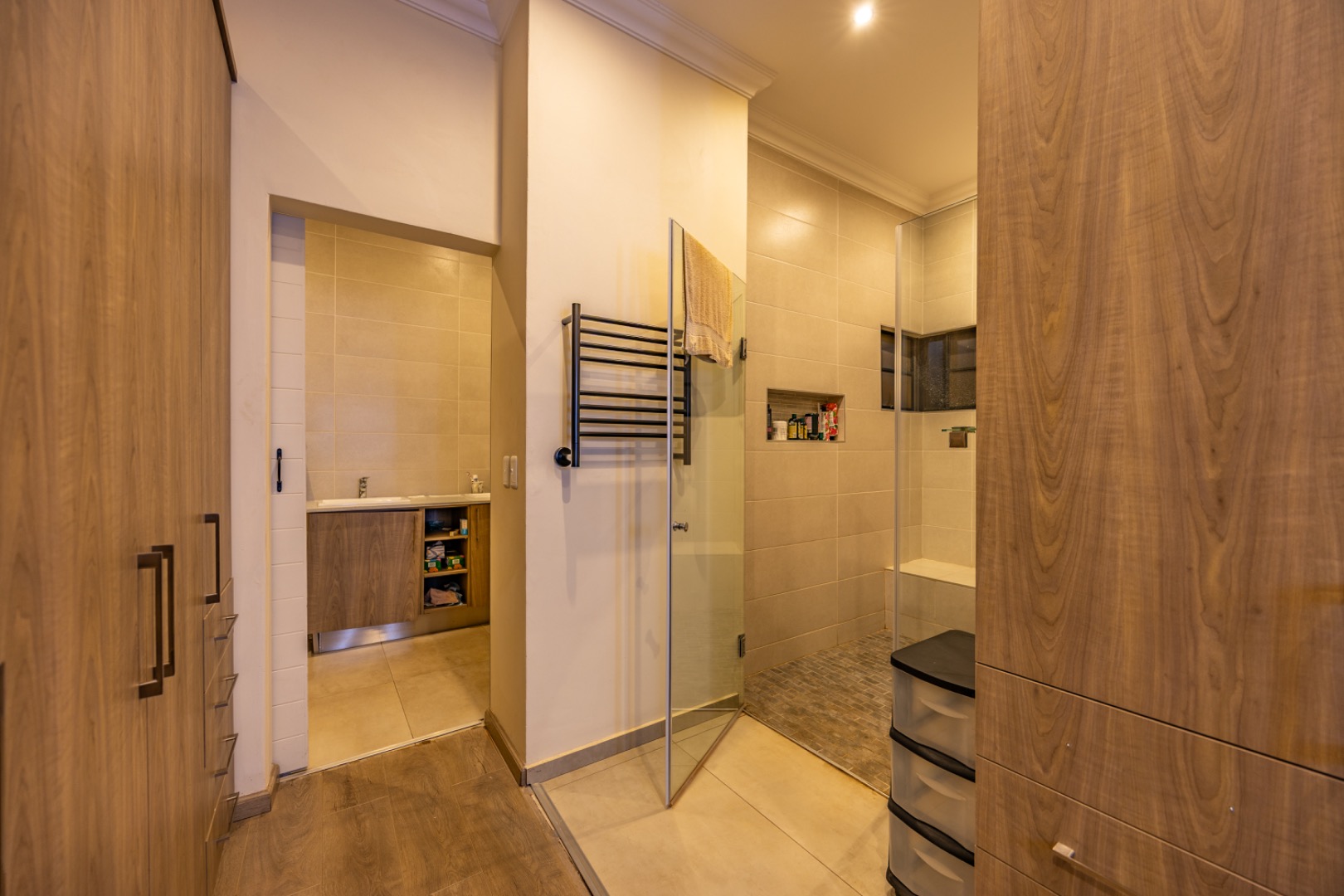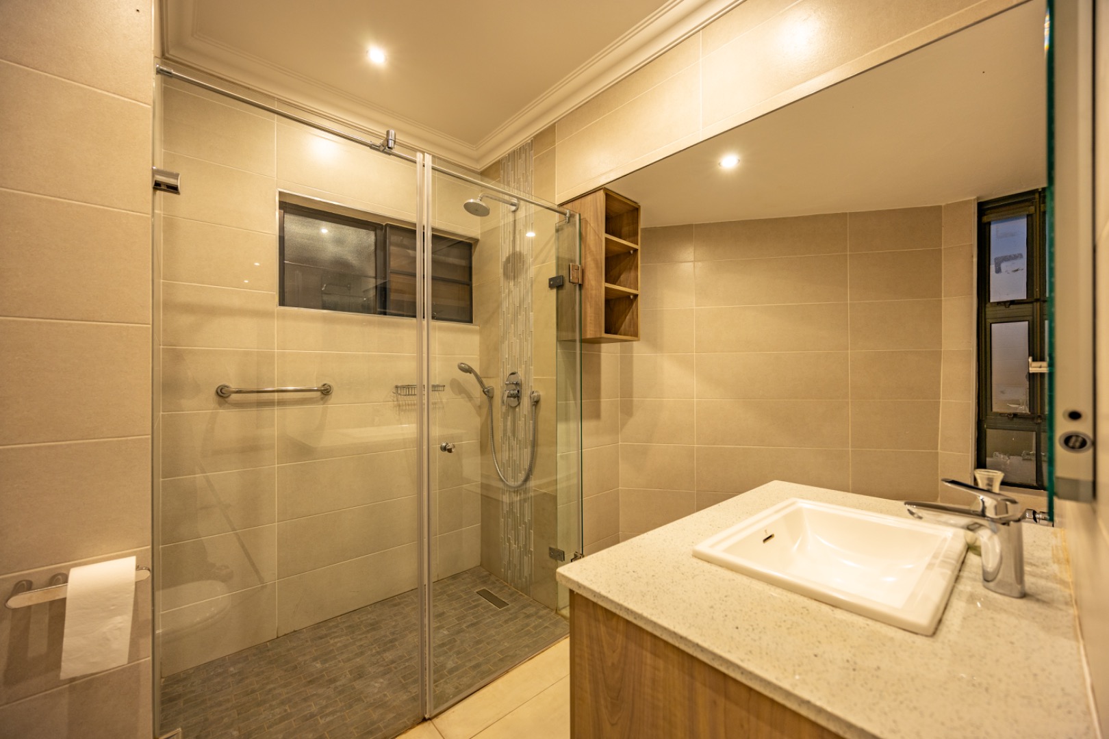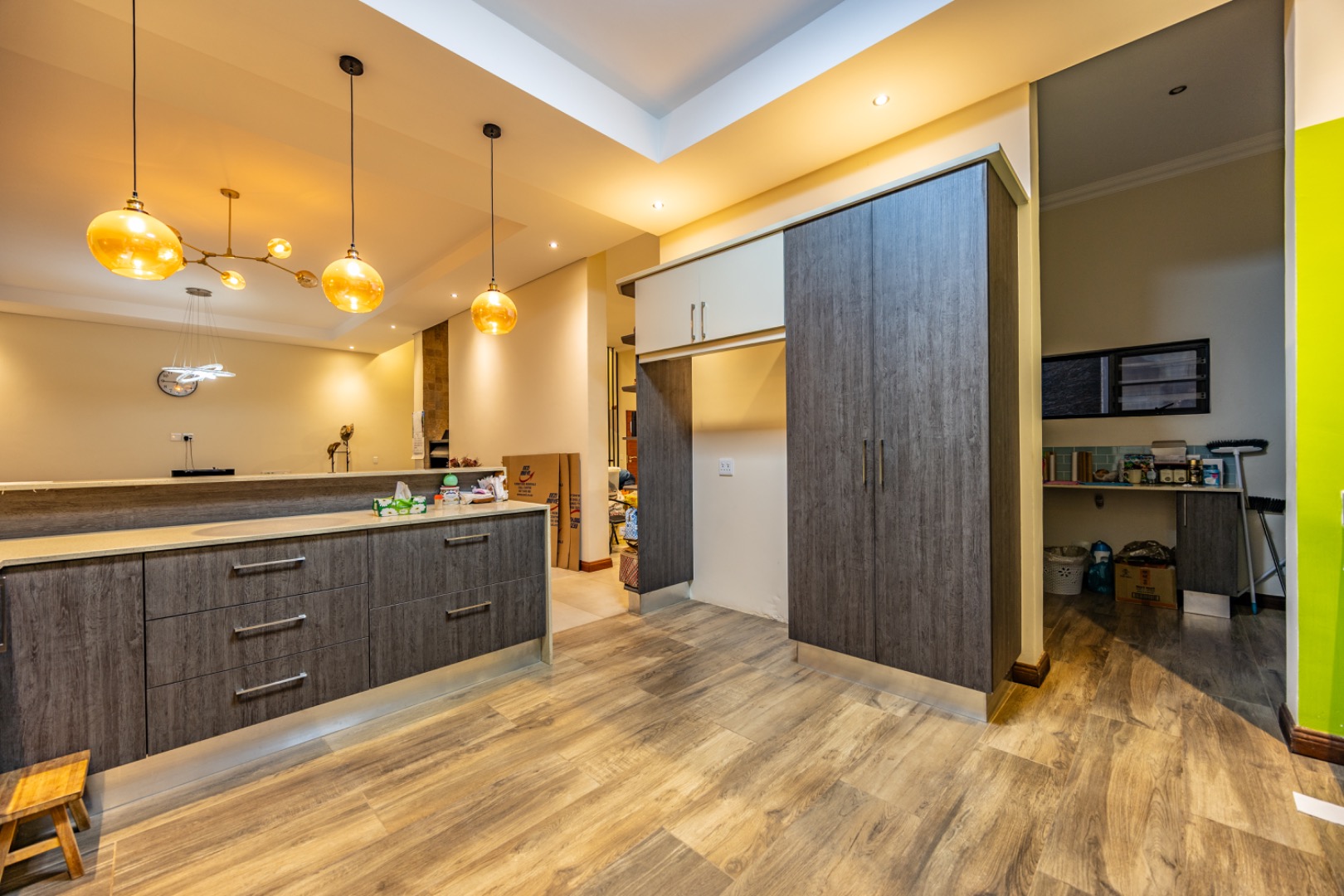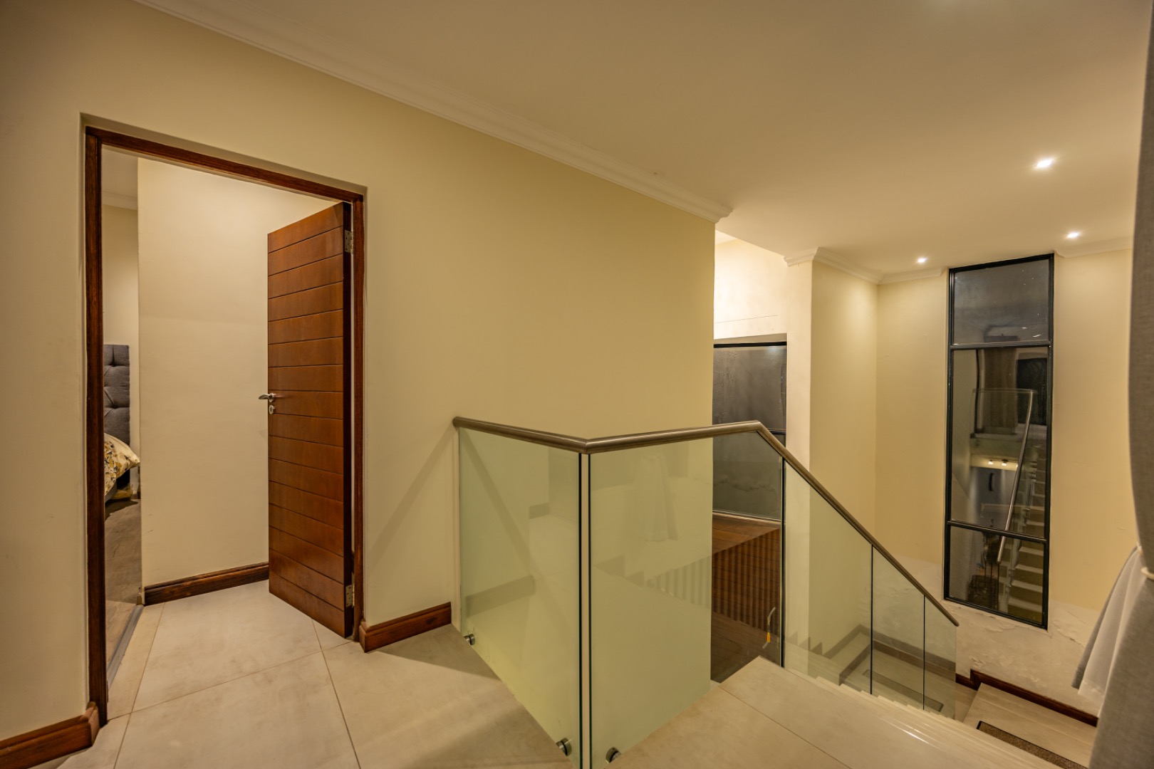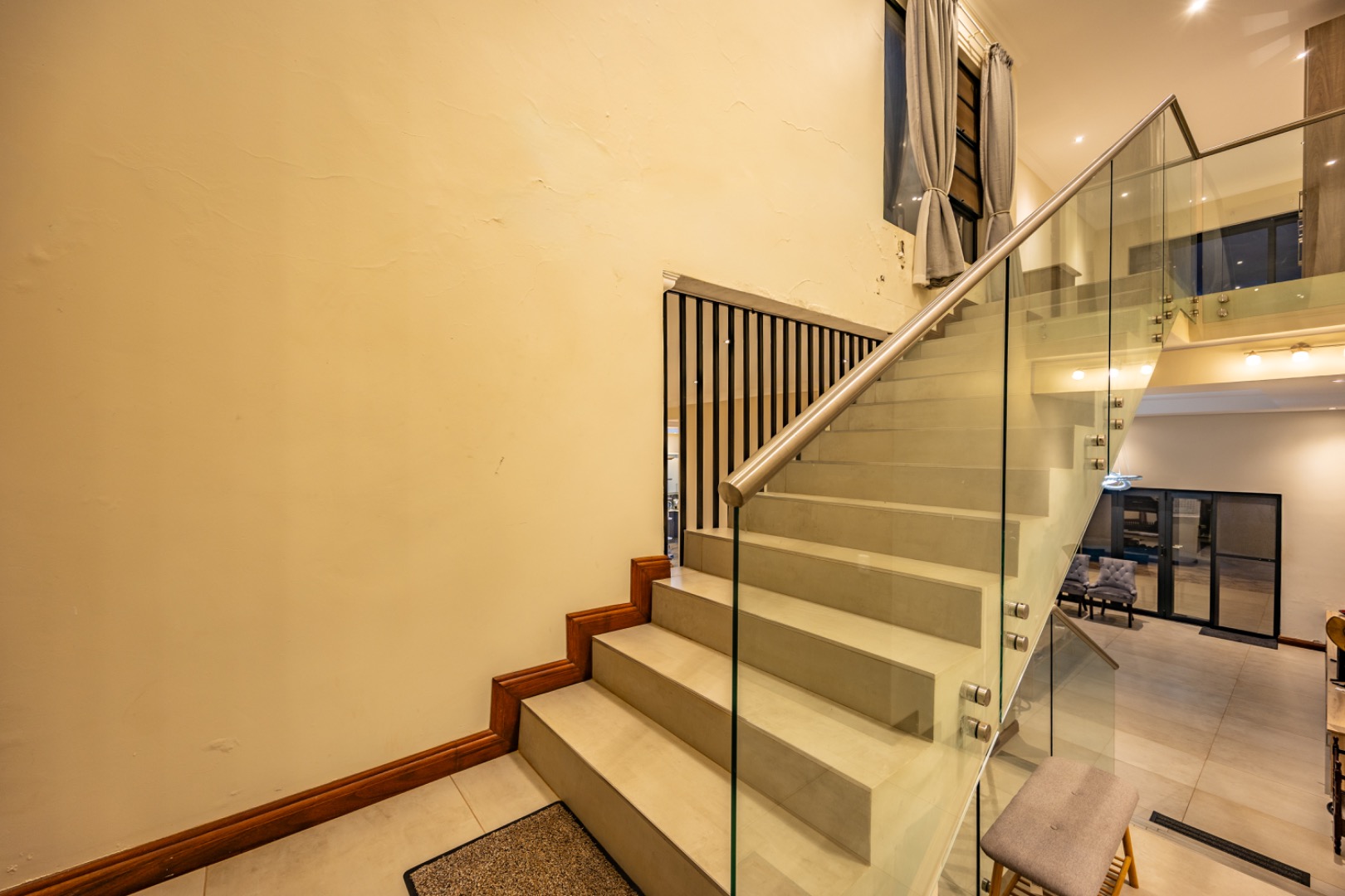 Upstairs, the home continues to offer comfortable accommodation with a relaxed pajama lounge and a tranquil zen garden that adds a peaceful touch to the space. Two well-sized bedrooms provide excellent comfort, including one with a full en-suite bathroom, built-in shelving and cupboards, and air conditioning, while the second bedroom offers built-in cupboards and access to a private balcony. The main bedroom suite serves as a private retreat, complete with air conditioning, a spacious walk-in closet, and a stylish en-suite bathroom with a large shower.