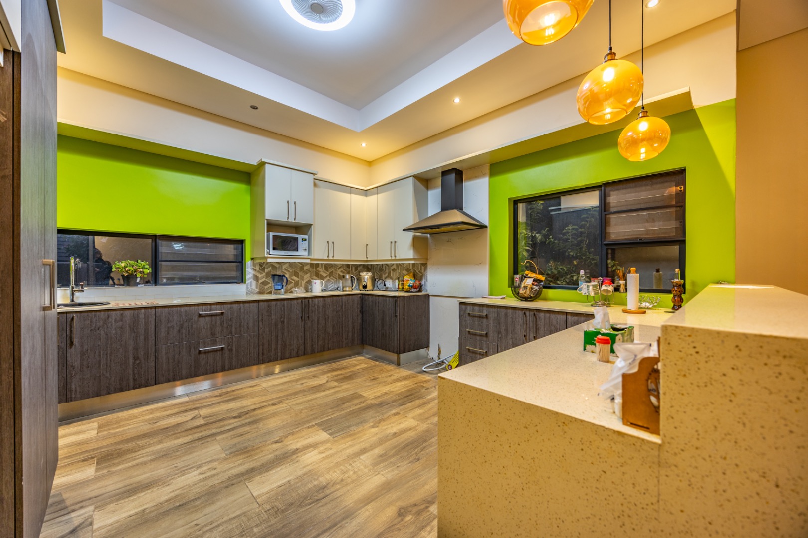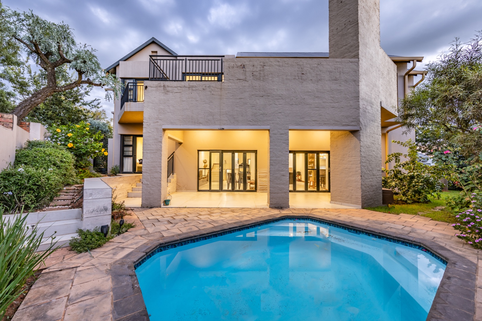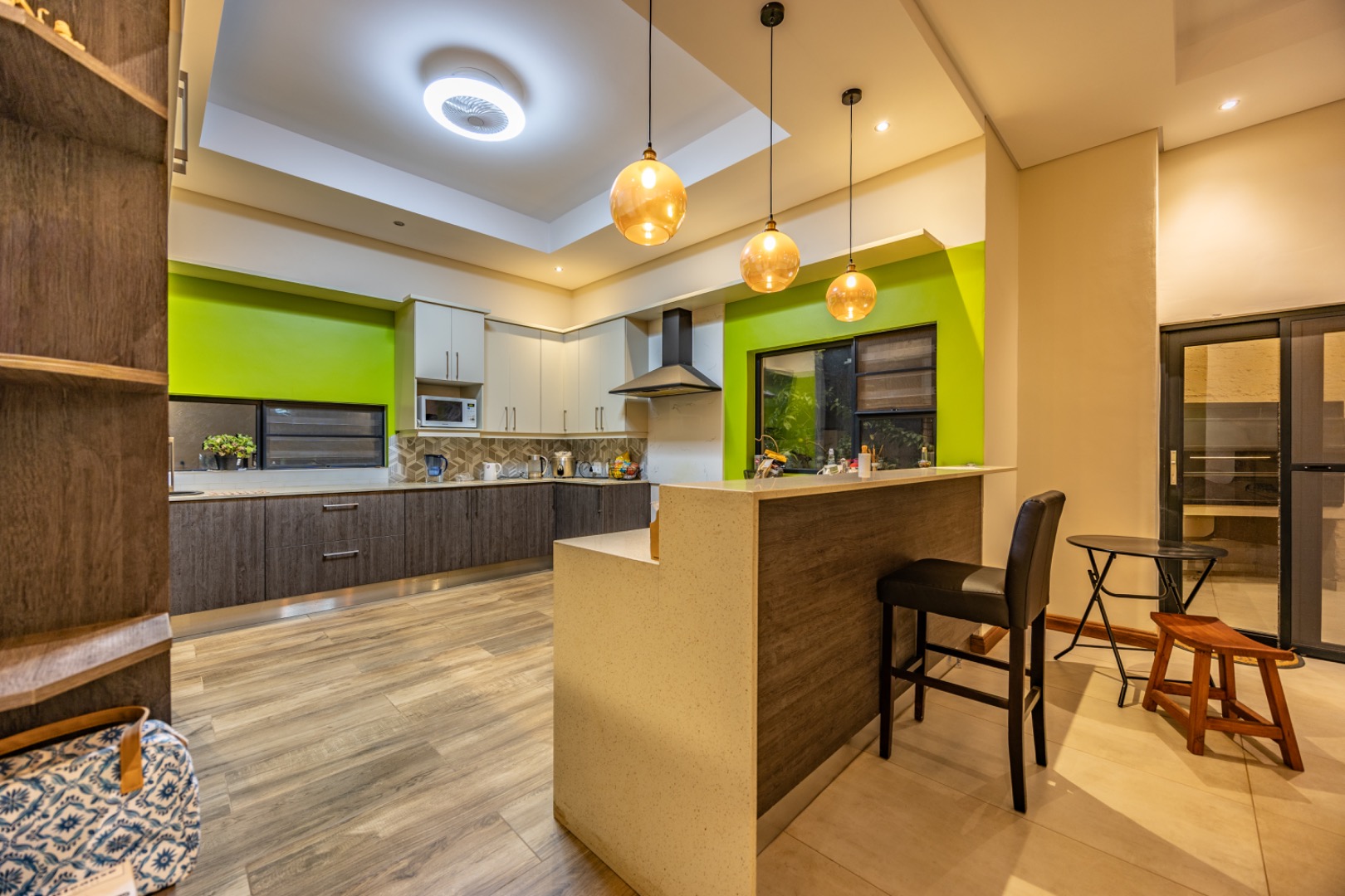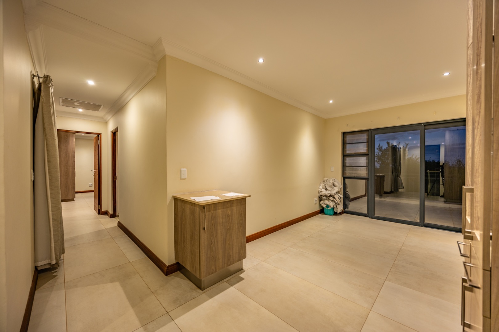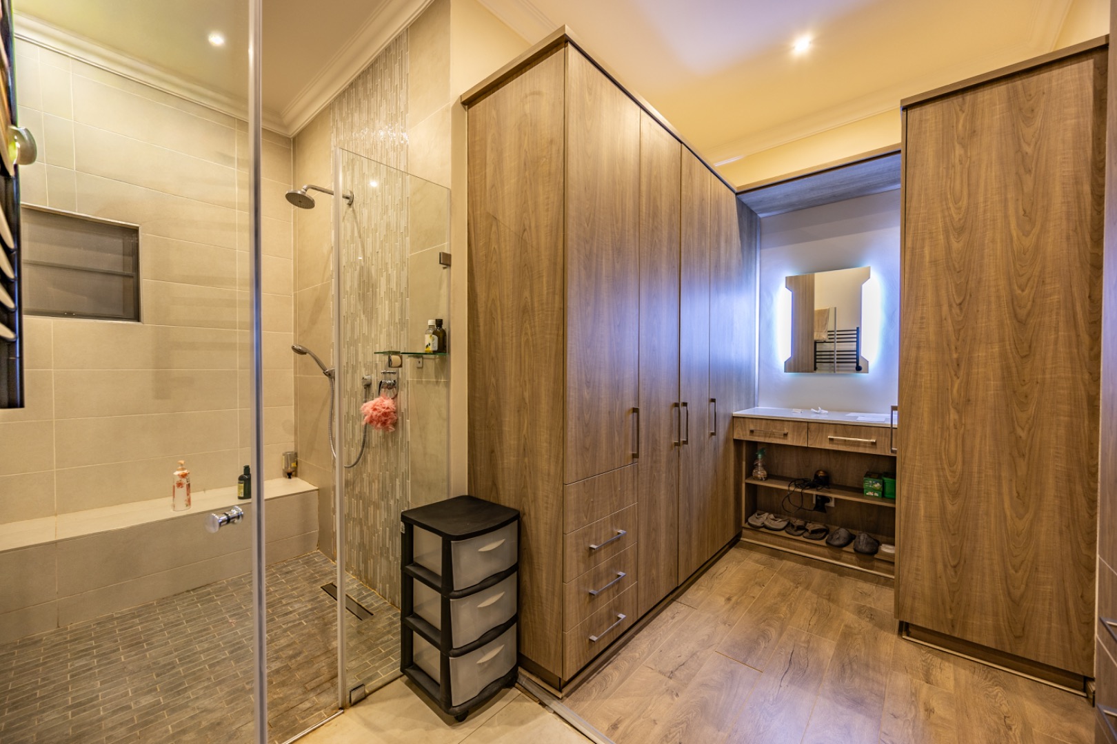 Upstairs, the home continues to offer comfortable accommodation with a relaxed pajama lounge and a tranquil zen garden that adds a peaceful touch to the space. Two well-sized bedrooms provide excellent comfort, including one with a full en-suite bathroom, built-in shelving and cupboards, and air conditioning, while the second bedroom offers built-in cupboards and access to a private balcony. The main bedroom suite serves as a private retreat, complete with air conditioning, a spacious walk-in closet, and a stylish en-suite bathroom with a large shower.