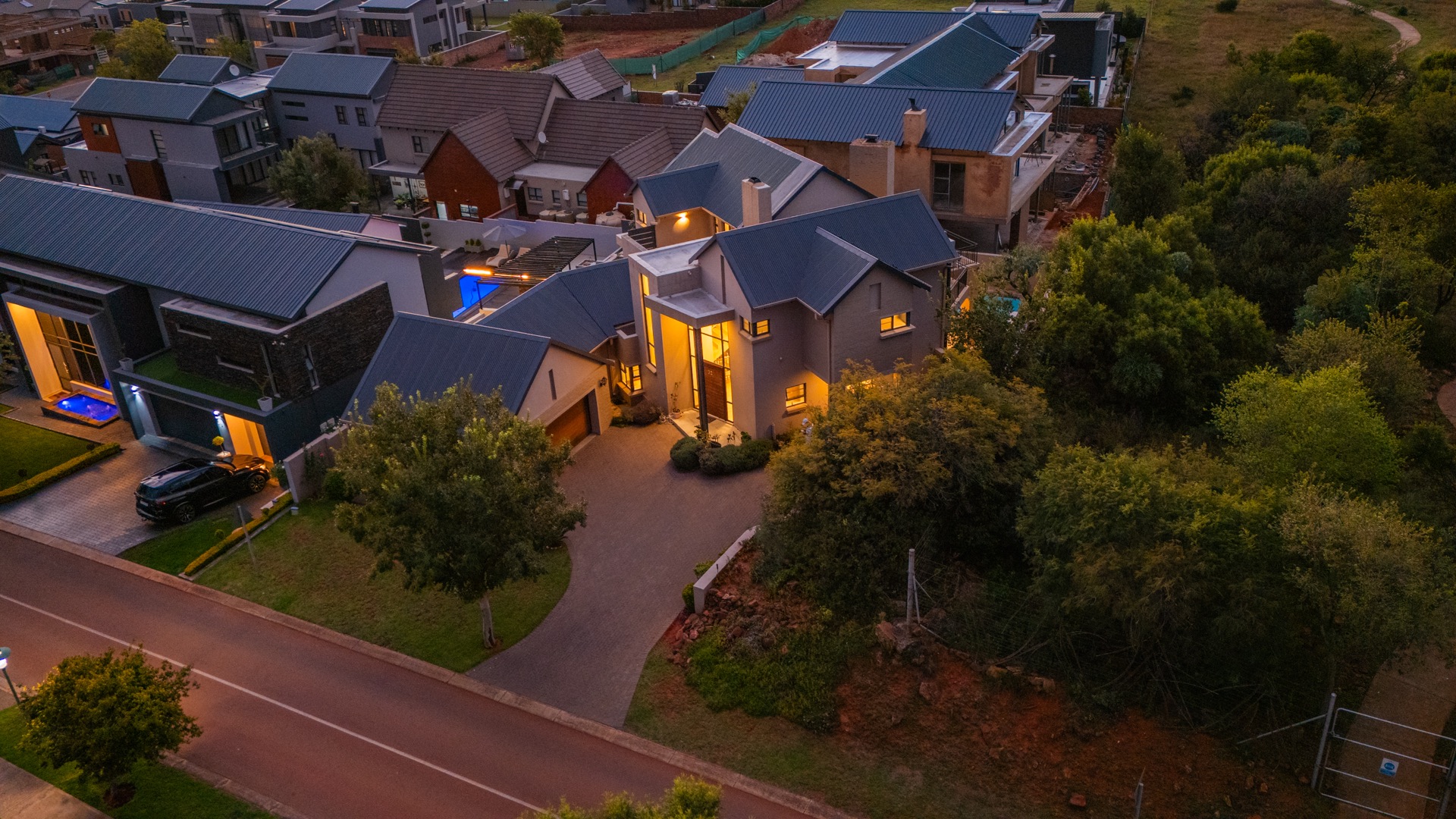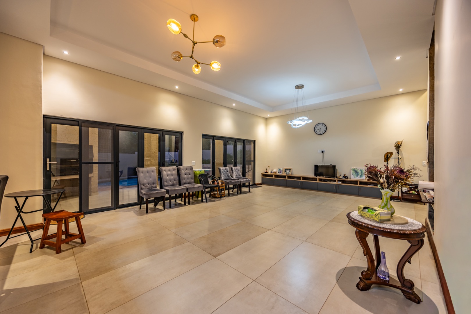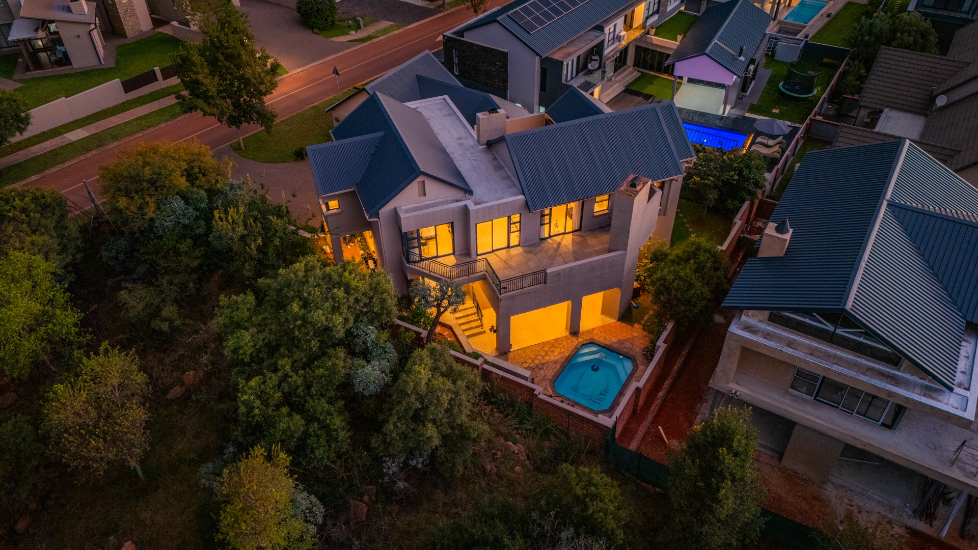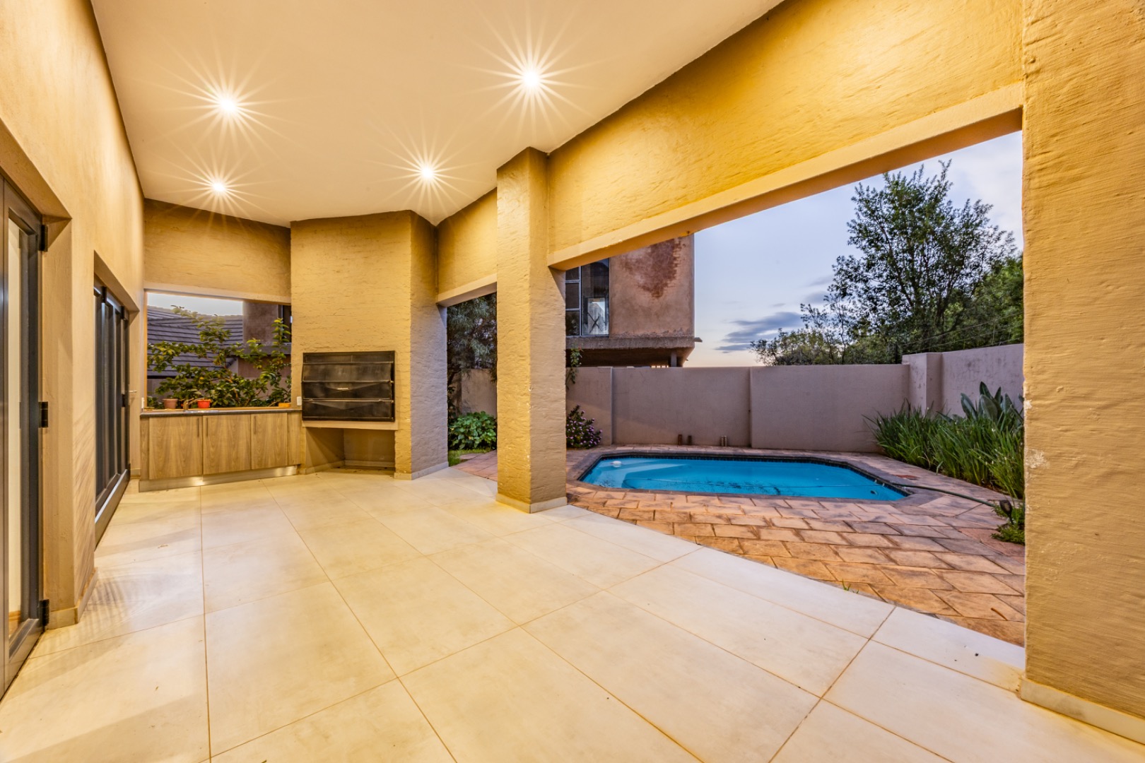 The outdoor area is designed for enjoying the estate lifestyle, featuring a swimming pool, dedicated braai area, landscaped garden with irrigation, a vegetable garden, and a water tank for added practicality. Additional features include staff quarters and a double automated garage, making this a well-equipped home that offers both comfort and space within a secure and highly desirable estate environment.
