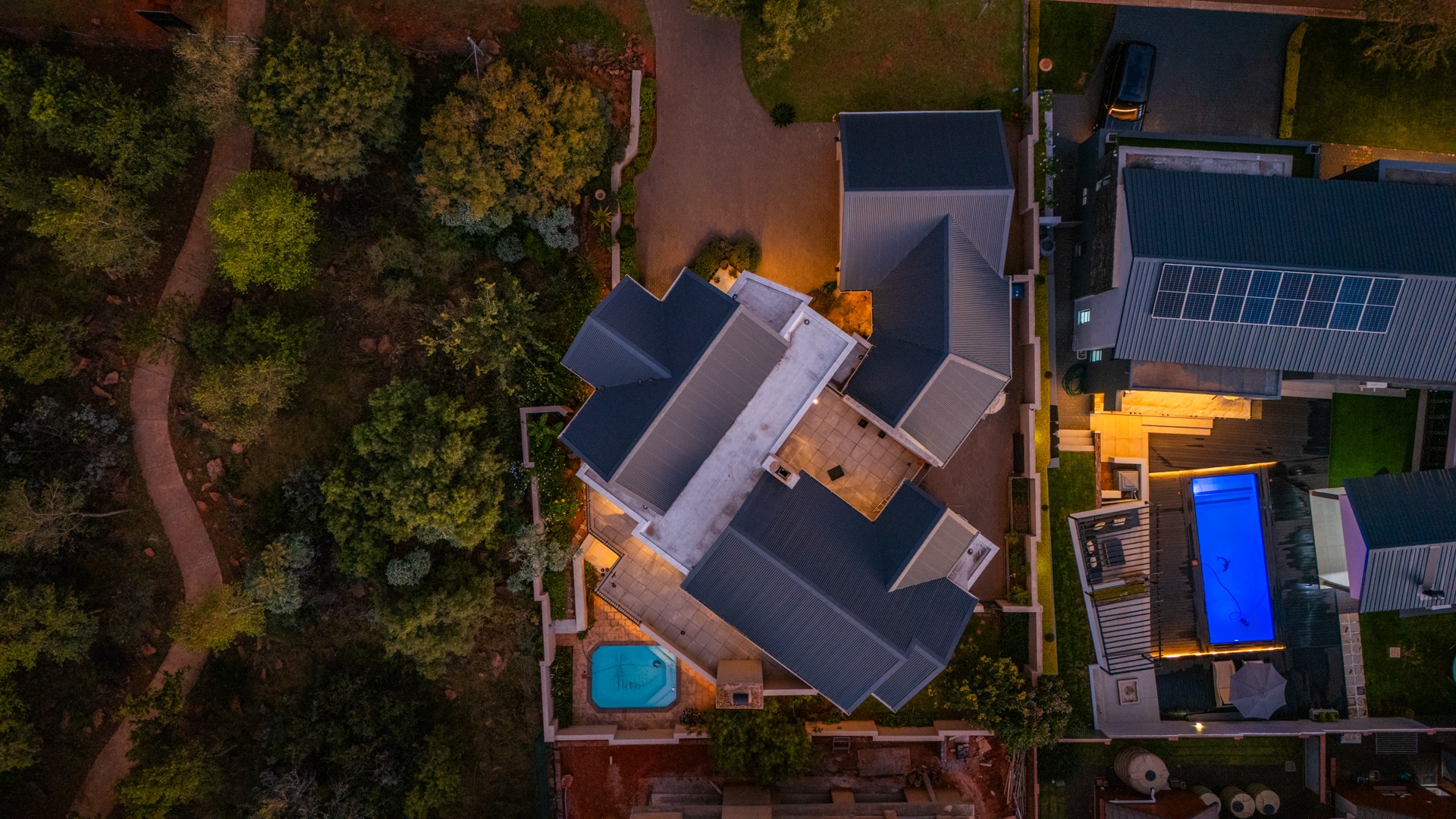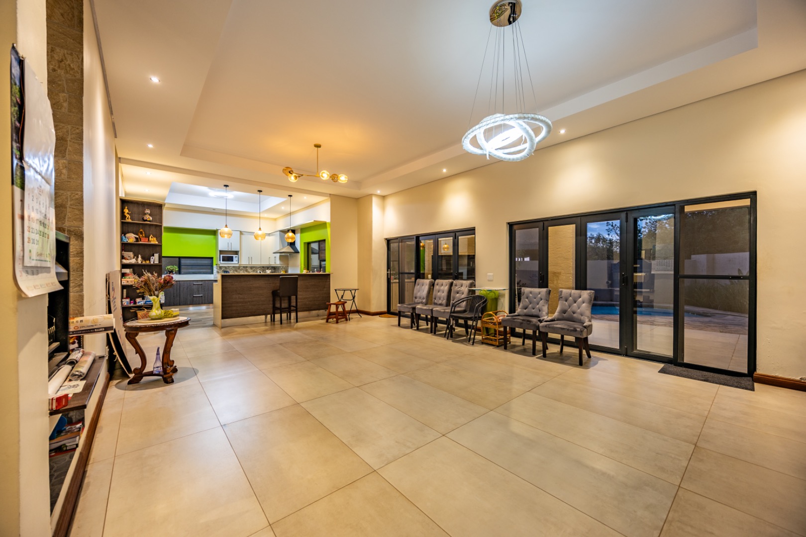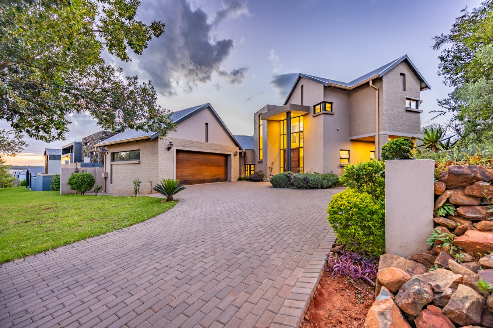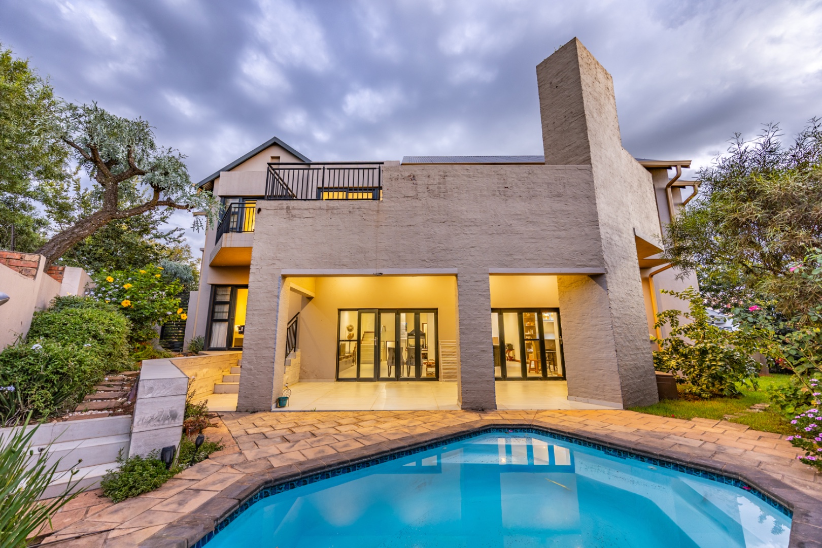 The outdoor area is designed for enjoying the estate lifestyle, featuring a swimming pool, dedicated braai area, landscaped garden with irrigation, a vegetable garden, and a water tank for added practicality. Additional features include staff quarters and a double automated garage, making this a well-equipped home that offers both comfort and space within a secure and highly desirable estate environment.