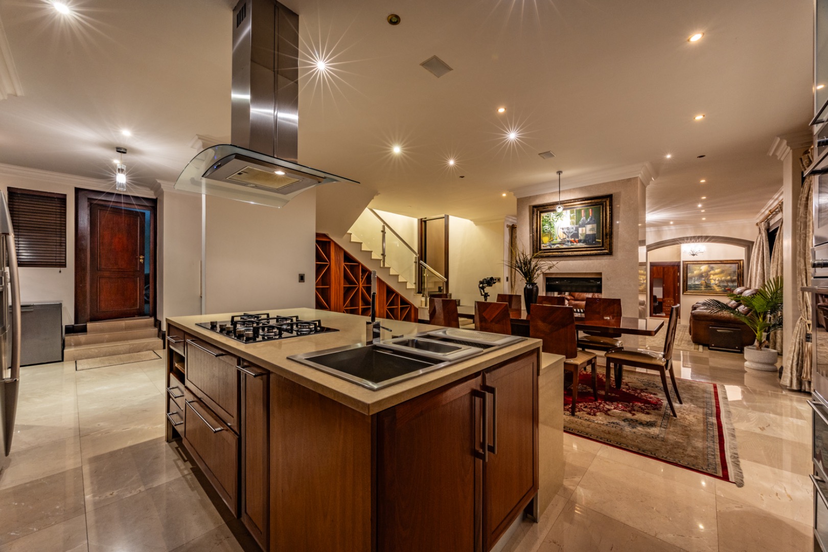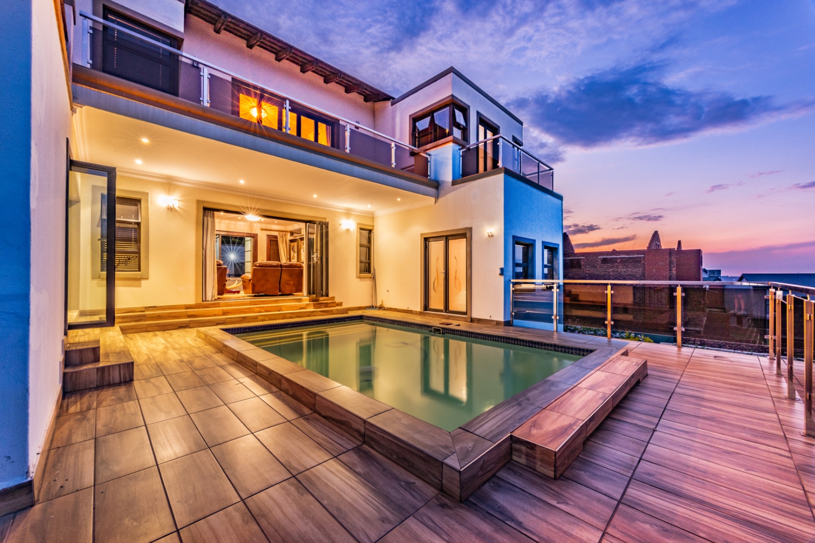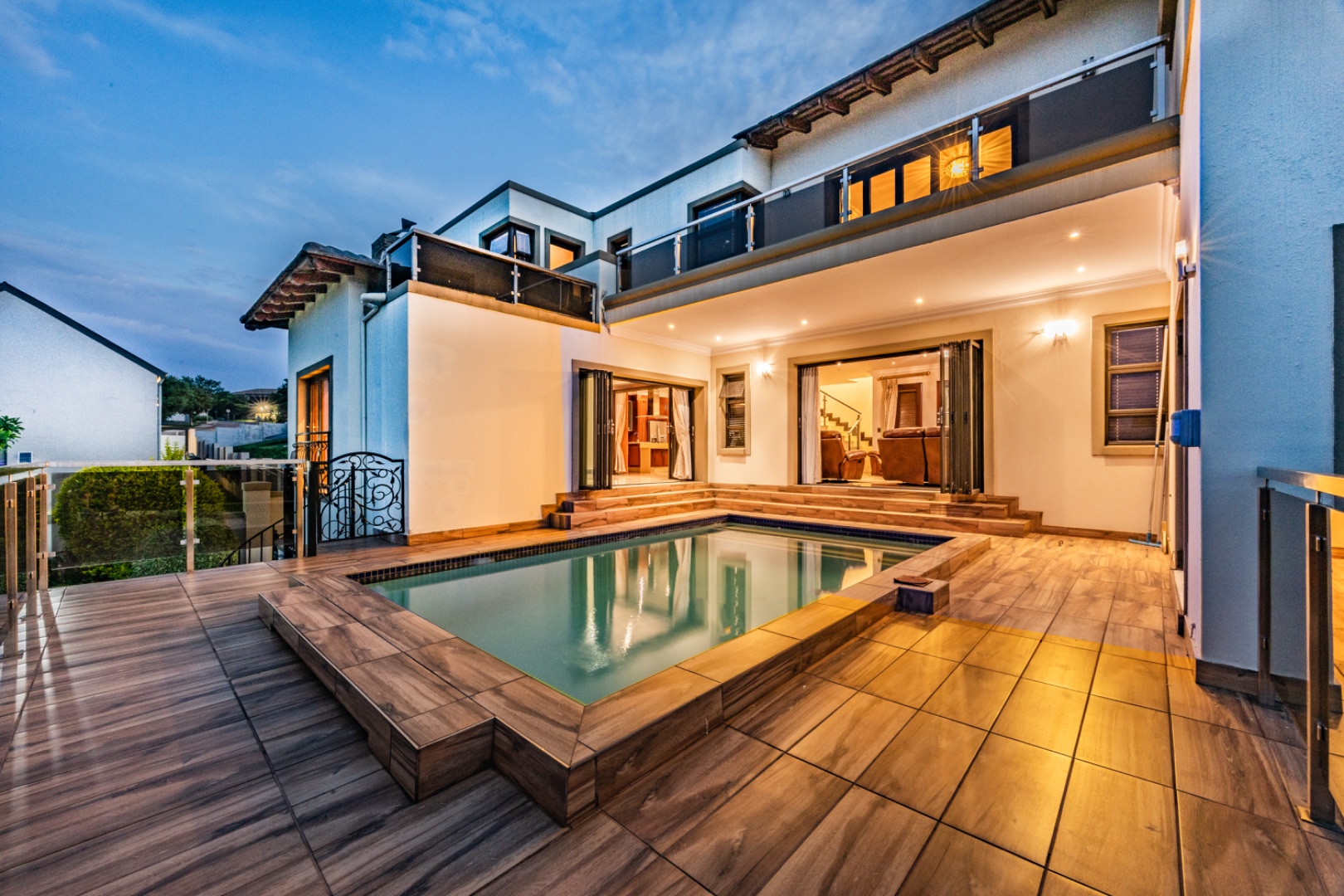 The living areas flow effortlessly to the heated suspended swimming pool with LED lighting and jets, creating a spectacular entertainment space.