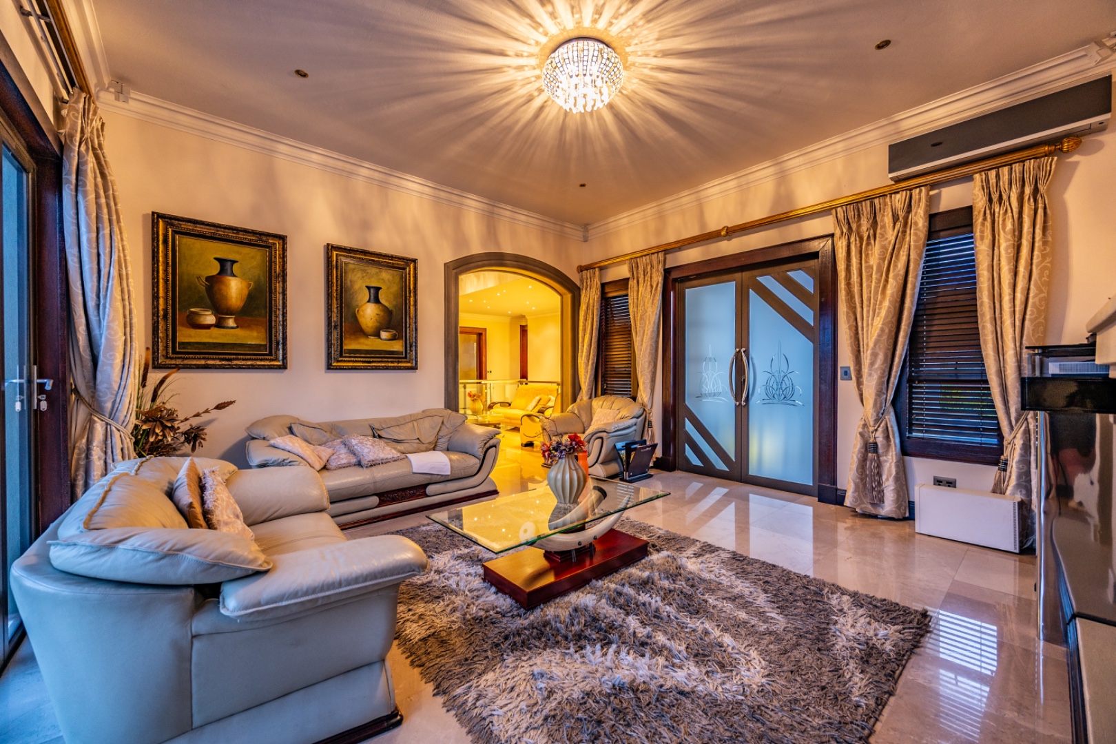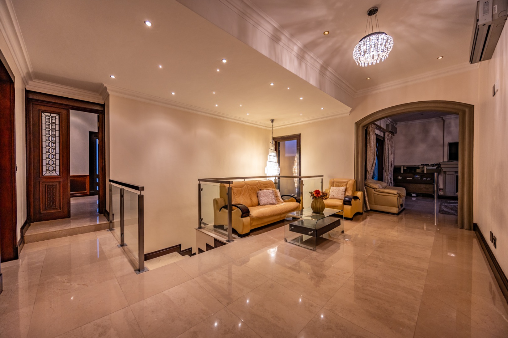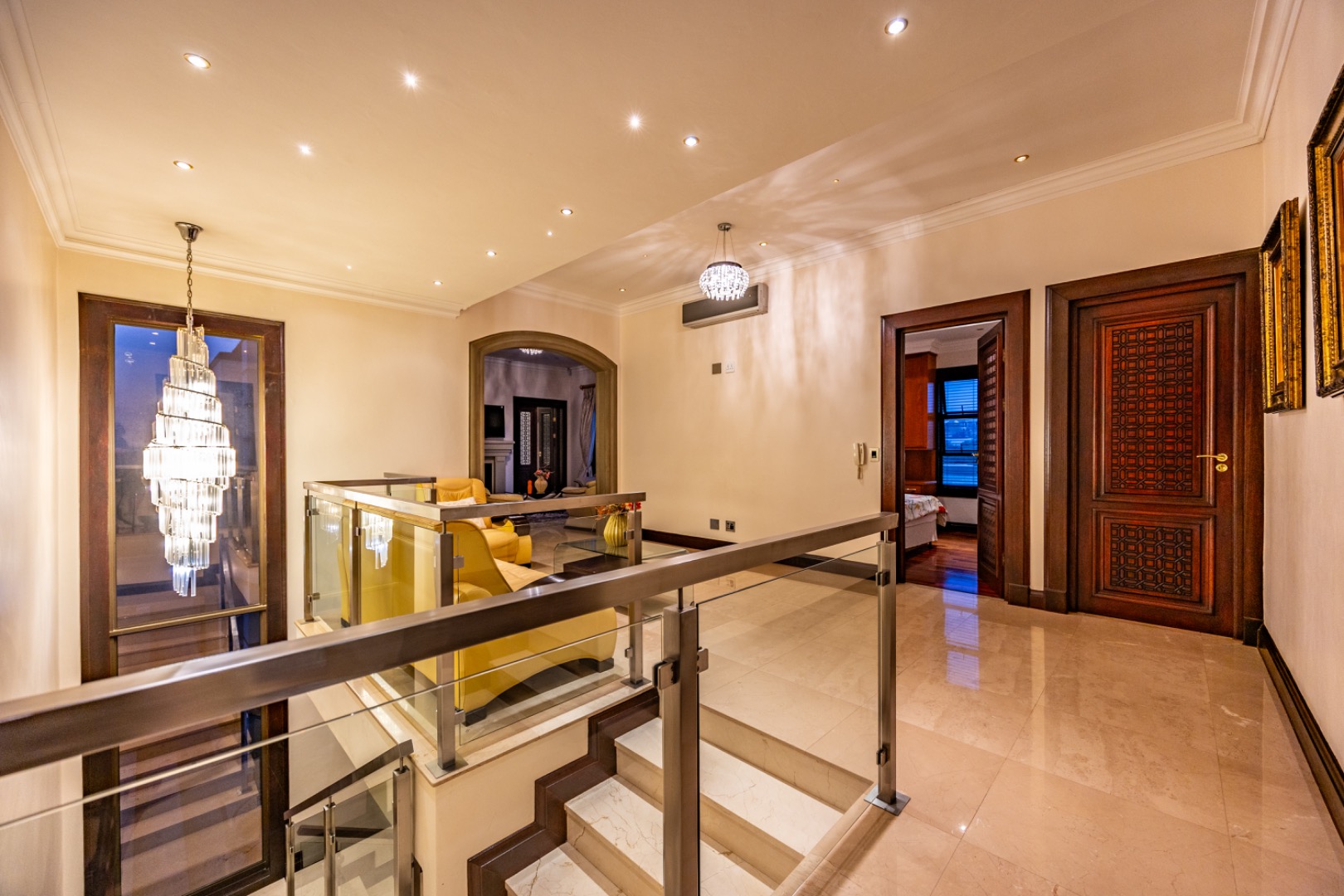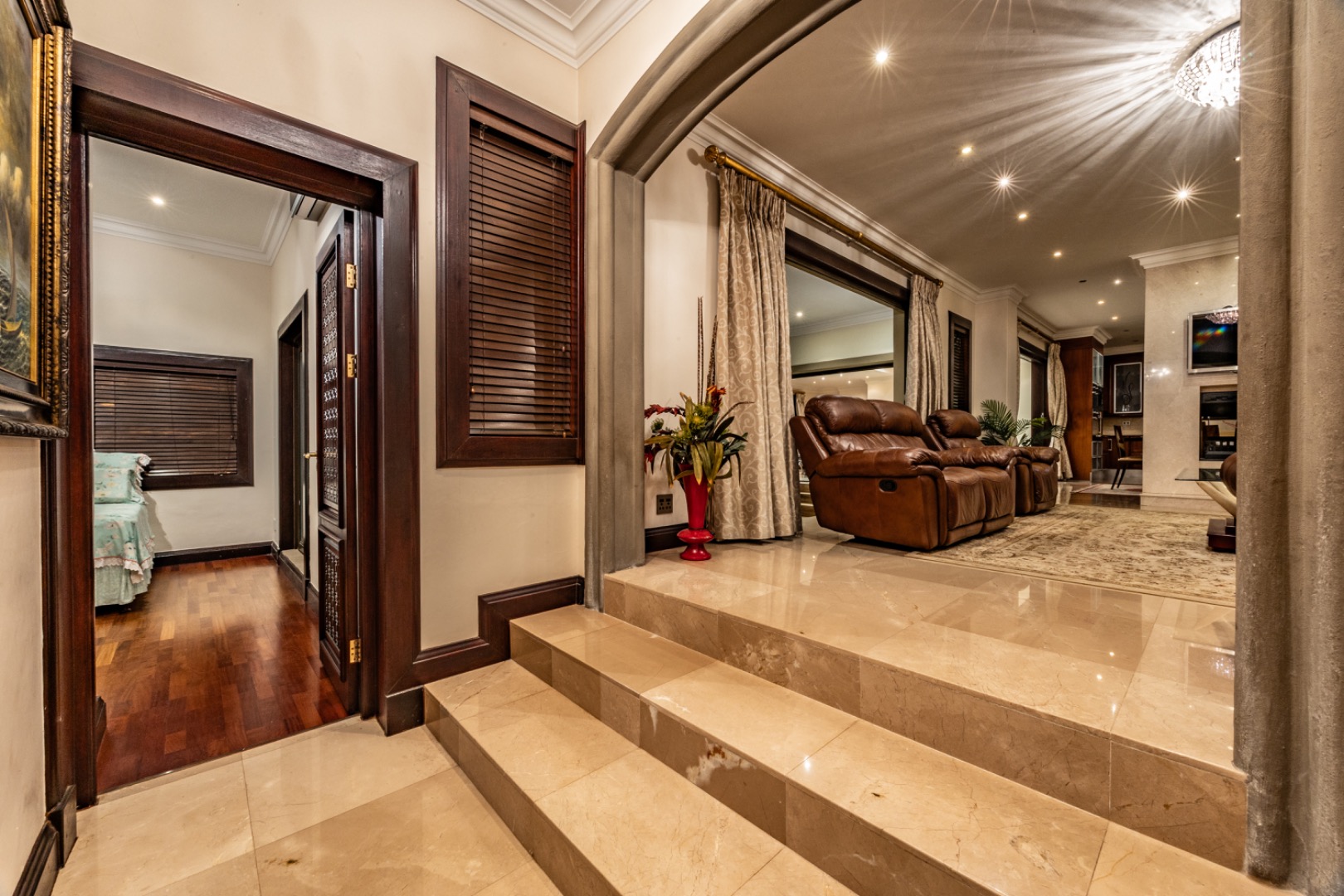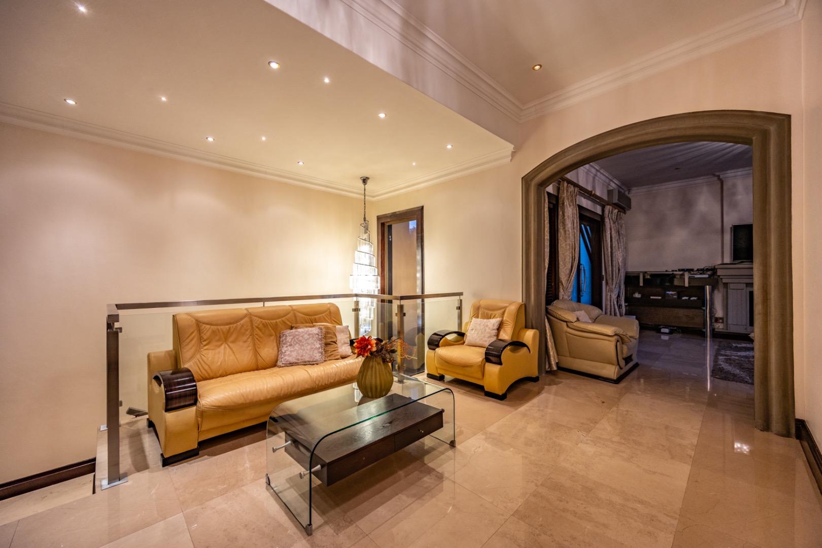 The upper level offers a private family retreat with an elegant arched pyjama lounge opening onto a double balcony.