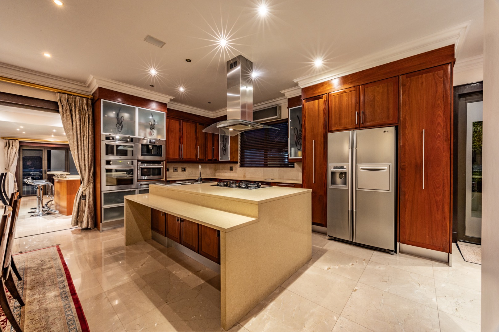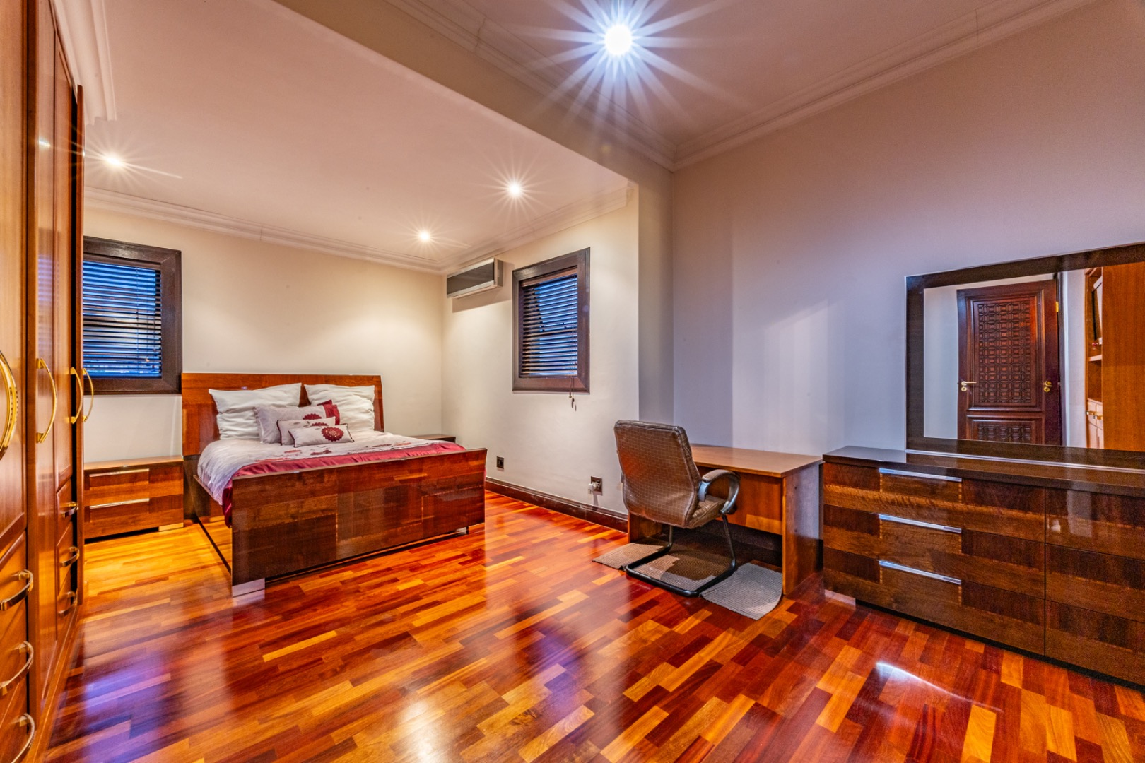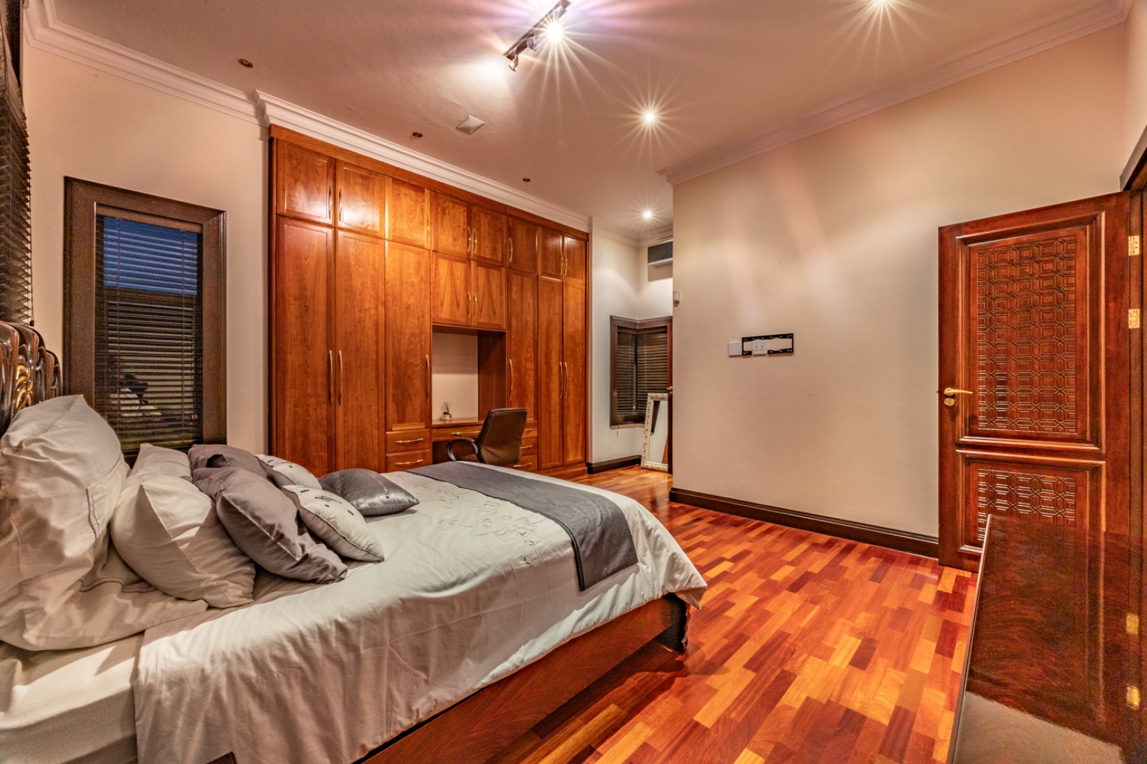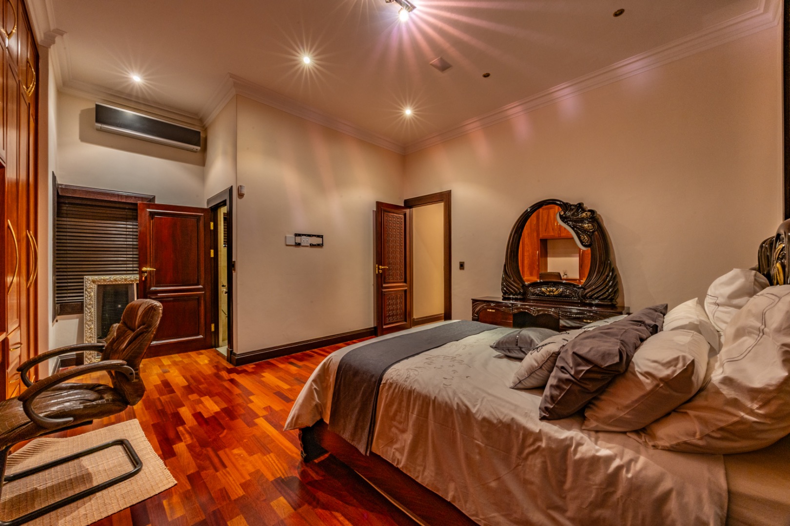 This remarkable home offers 7 spacious bedrooms and 9 bathrooms, with 6 bedrooms featuring private en-suite bathrooms, heated towel rails and high-end sanitary finishes. Wooden flooring in the bedrooms, carved wooden doors and marble finishes throughout the home add warmth and sophistication.